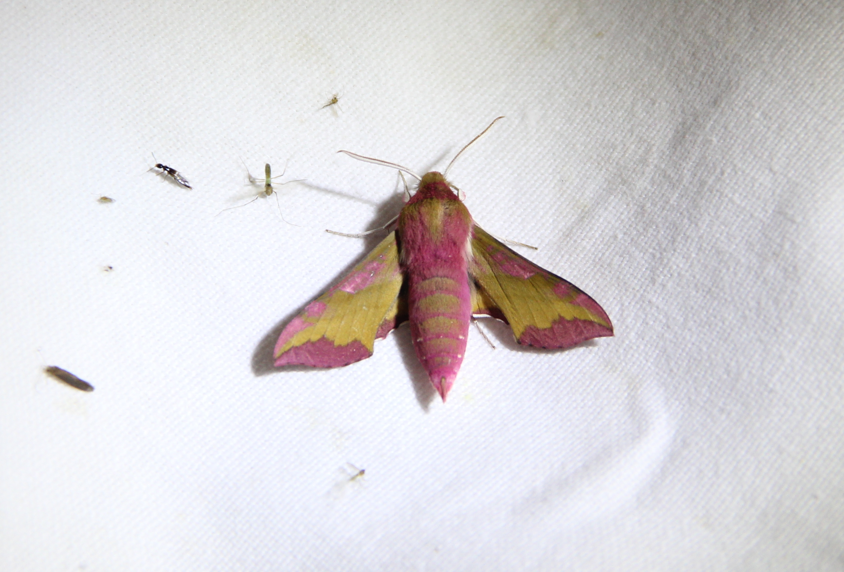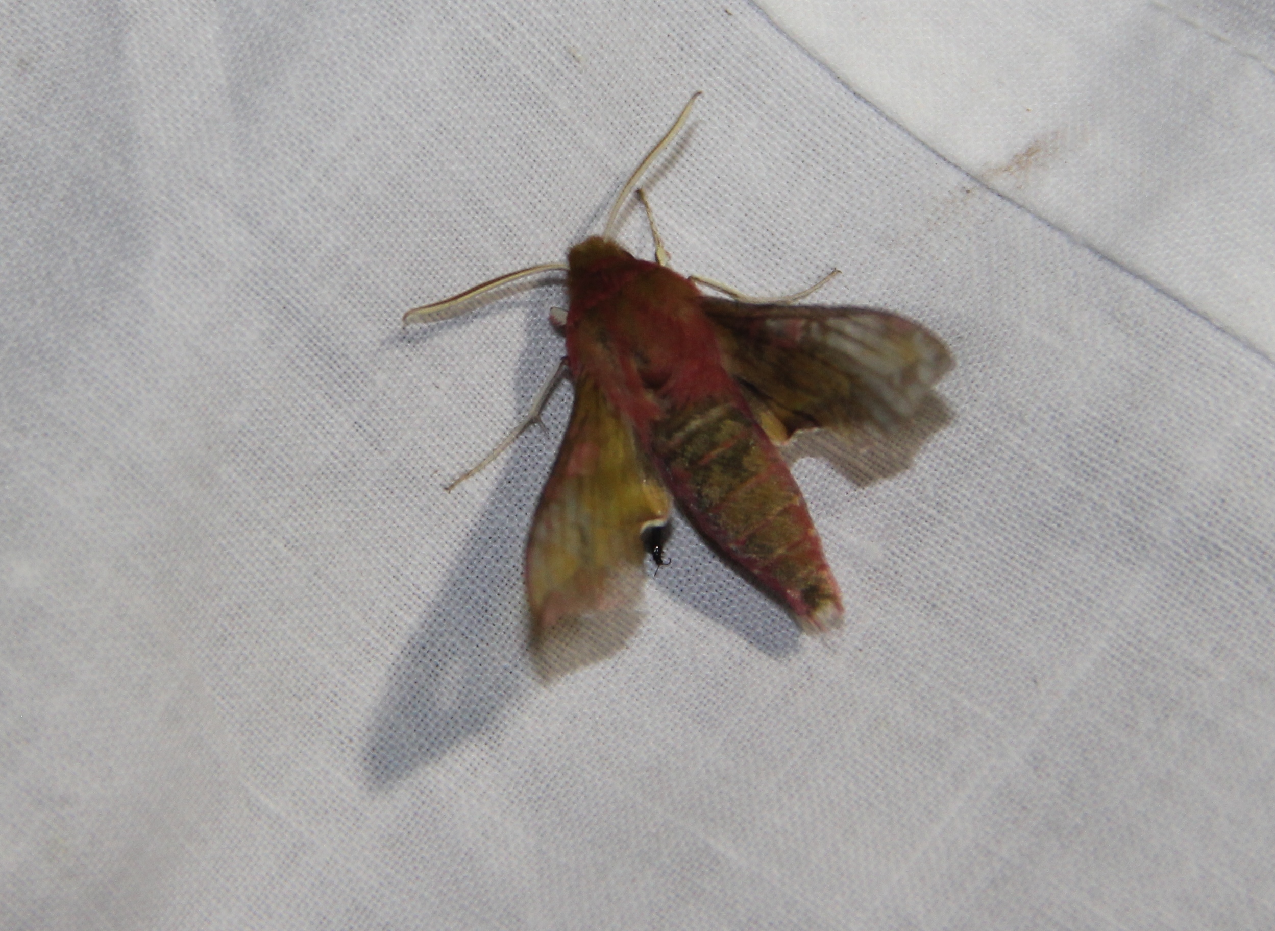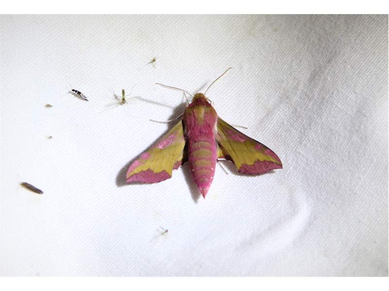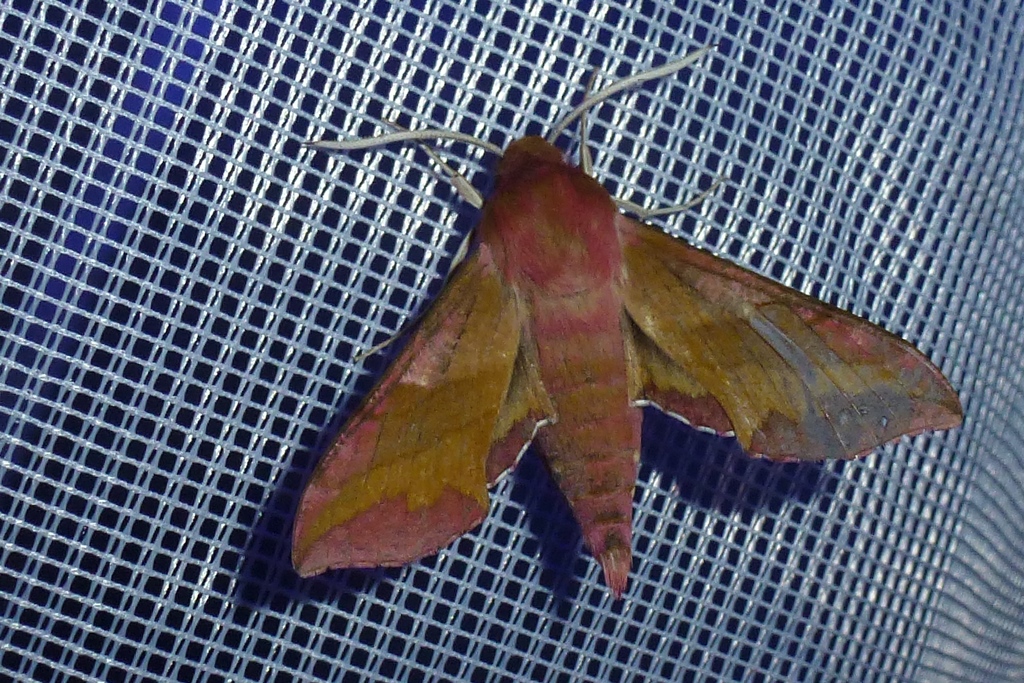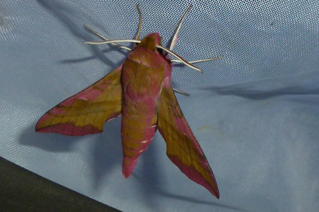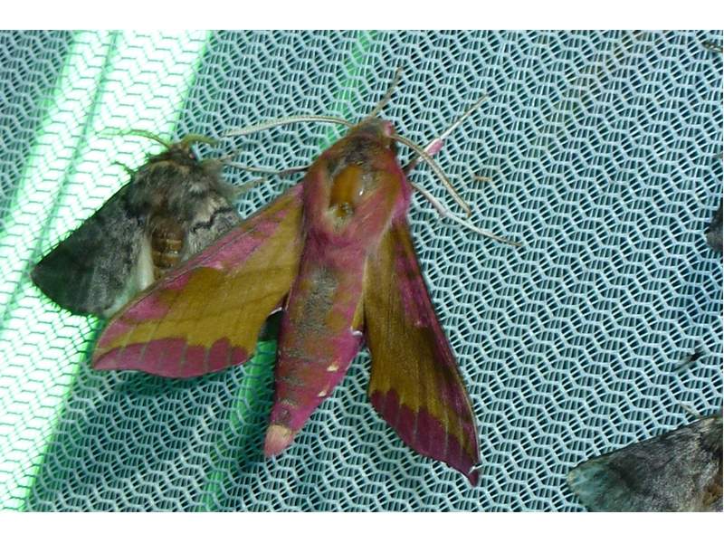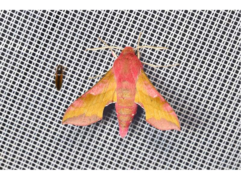 Größenvergleich: D. porcellus (Kleiner Weinschwärmer, unten) und D. elpenor (Mittlerer Weinschwärmer), am Licht - Westlausitz, Pulsnitz, Kahlschlag/Bachtal Hahneflüsschen, 5. Juni 2022
