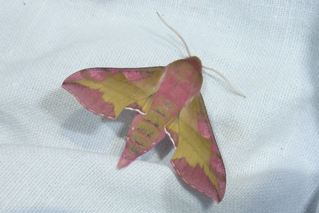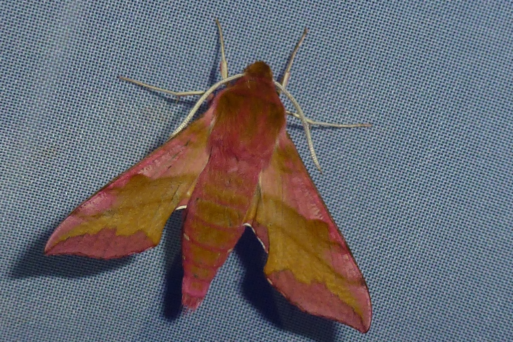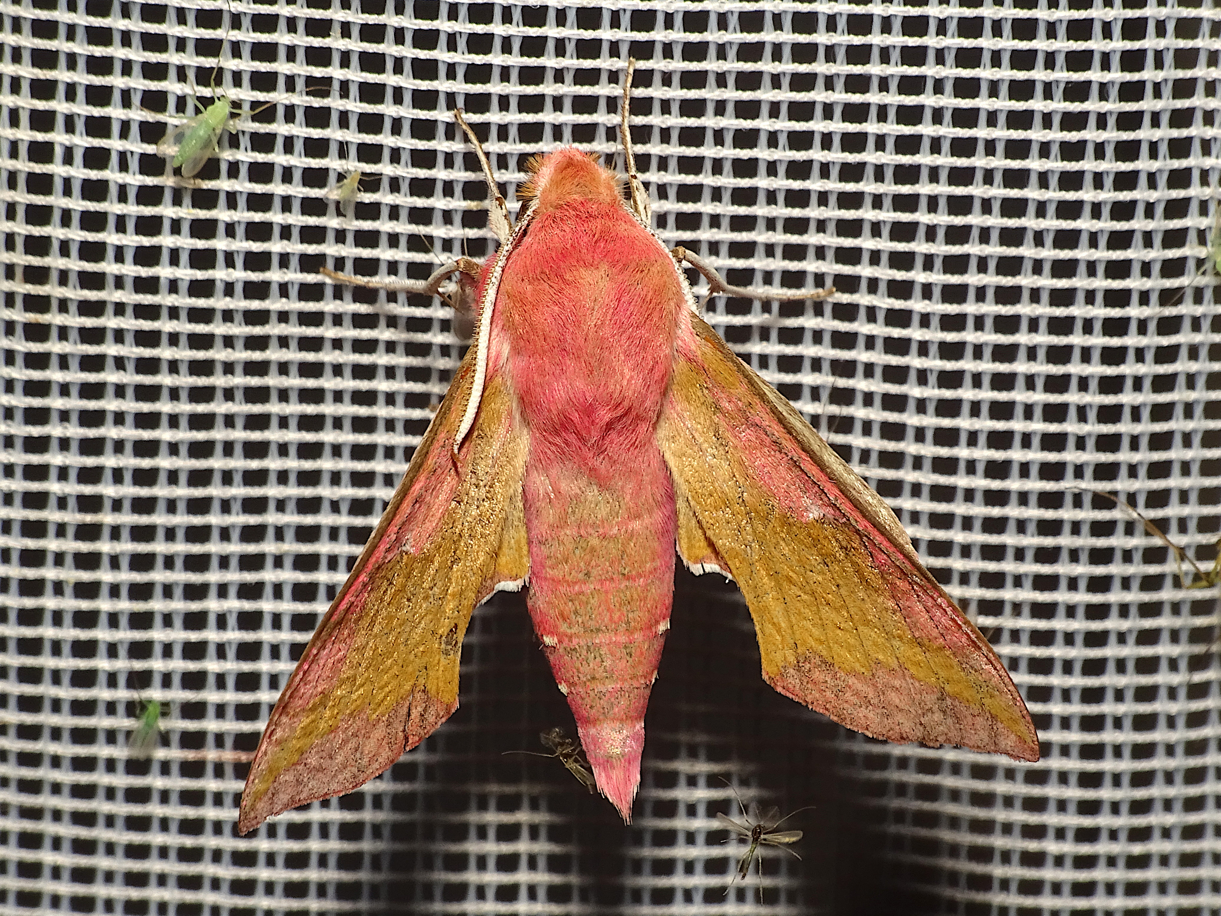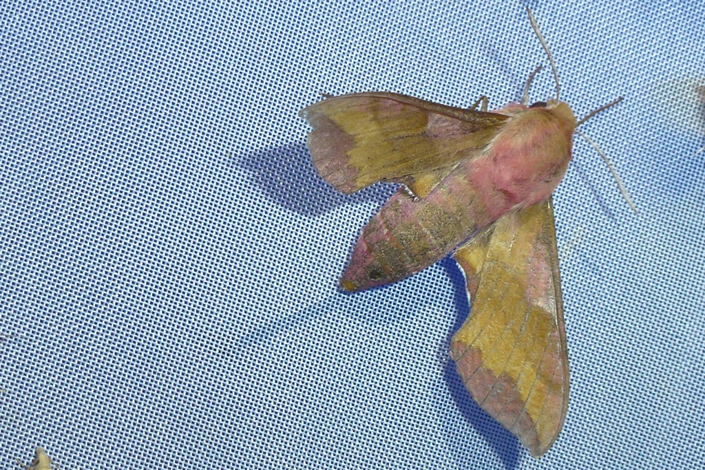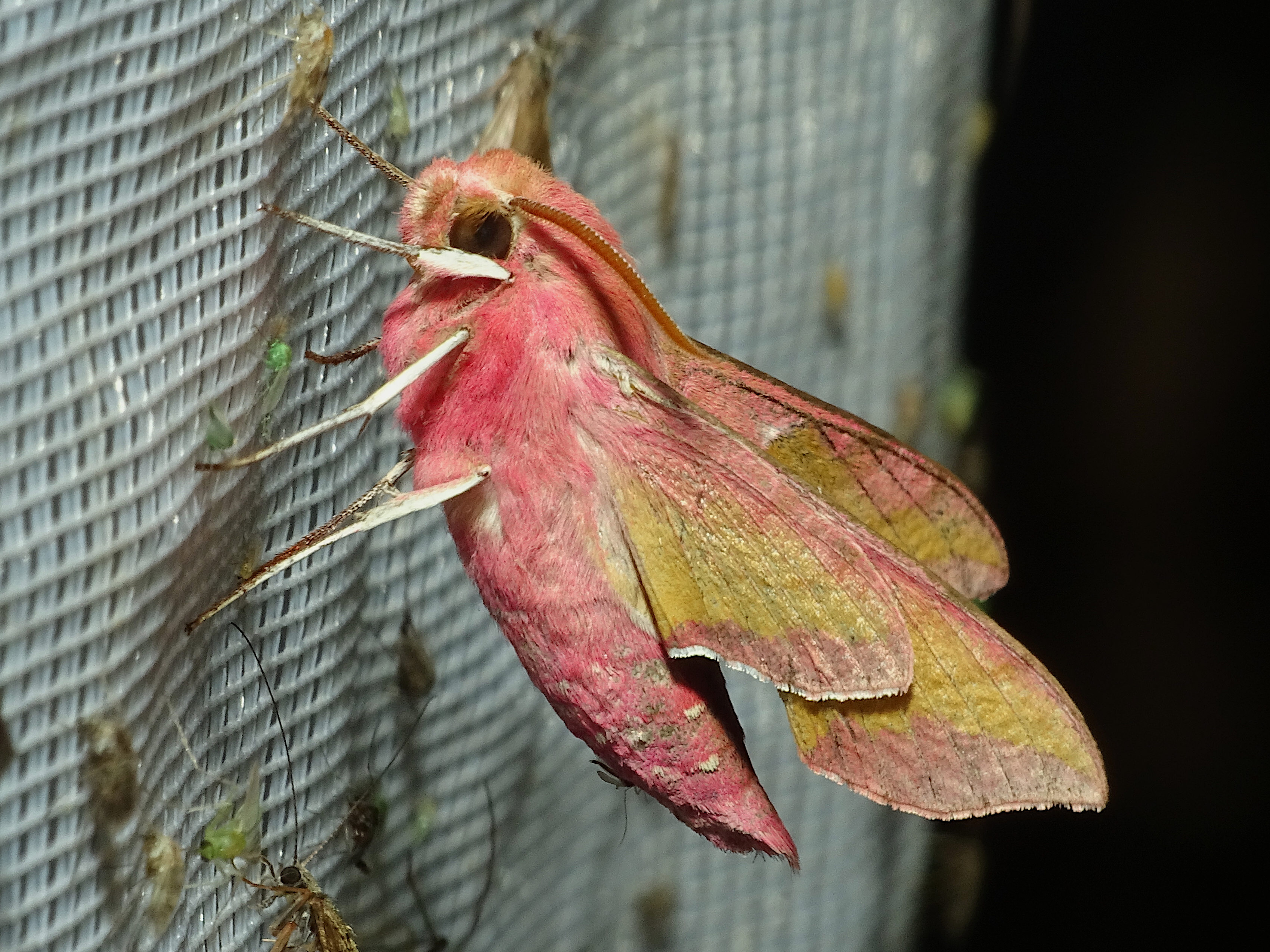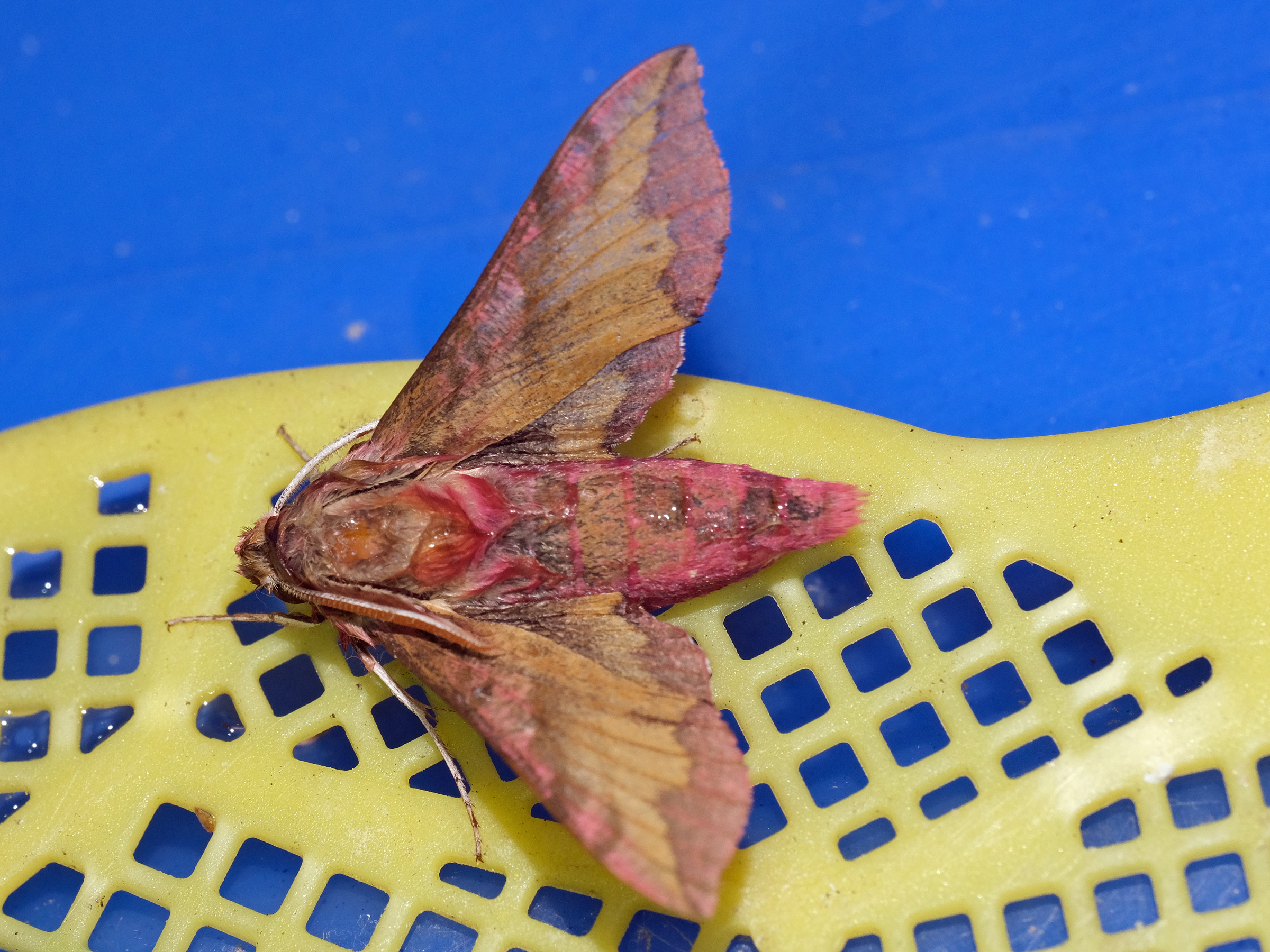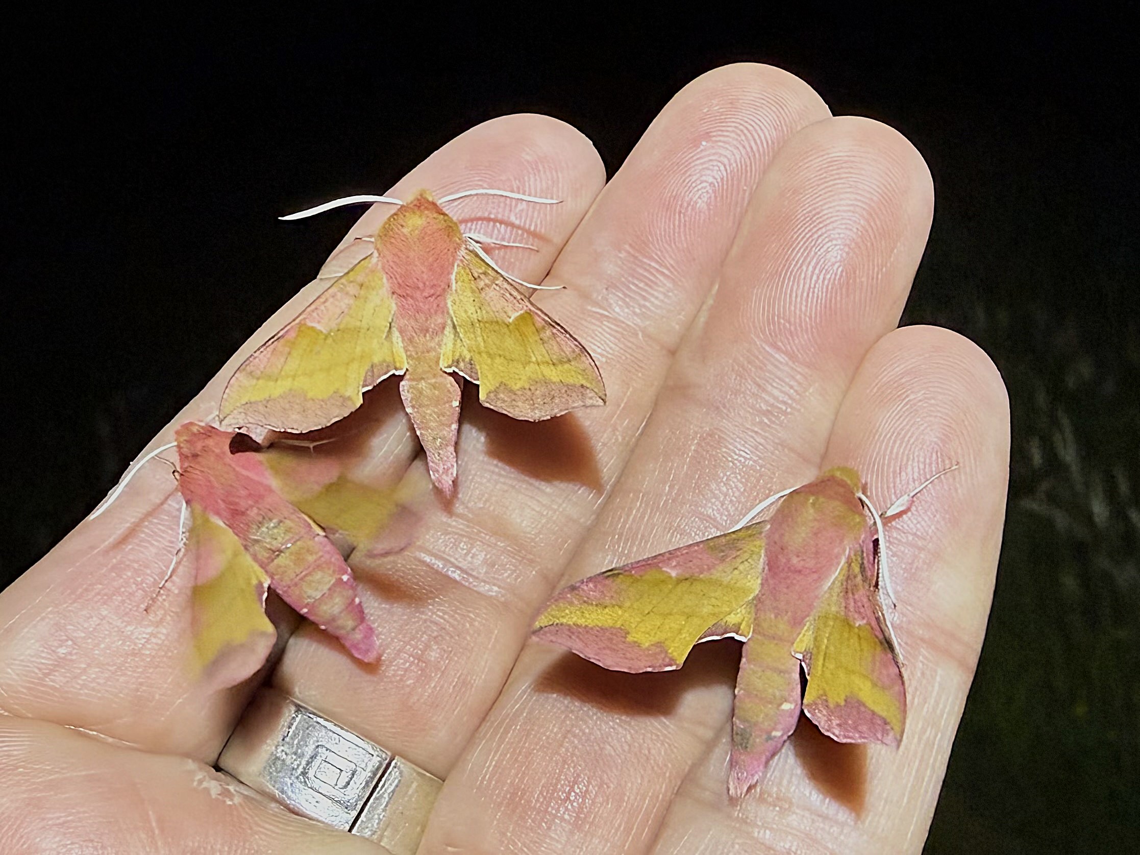 Größenvergleich: D. porcellus (Kleiner Weinschwärmer, unten) und D. elpenor (Mittlerer Weinschwärmer), am Licht - Westlausitz, Pulsnitz, Kahlschlag/Bachtal Hahneflüsschen, 5. Juni 2022