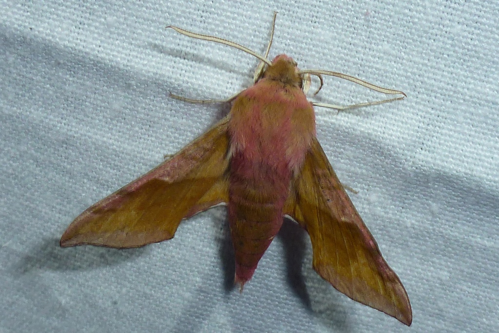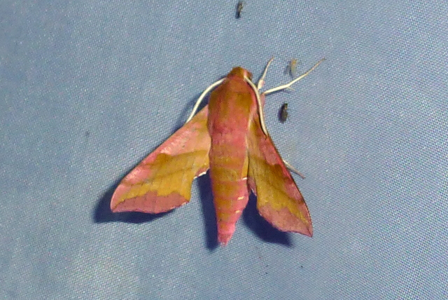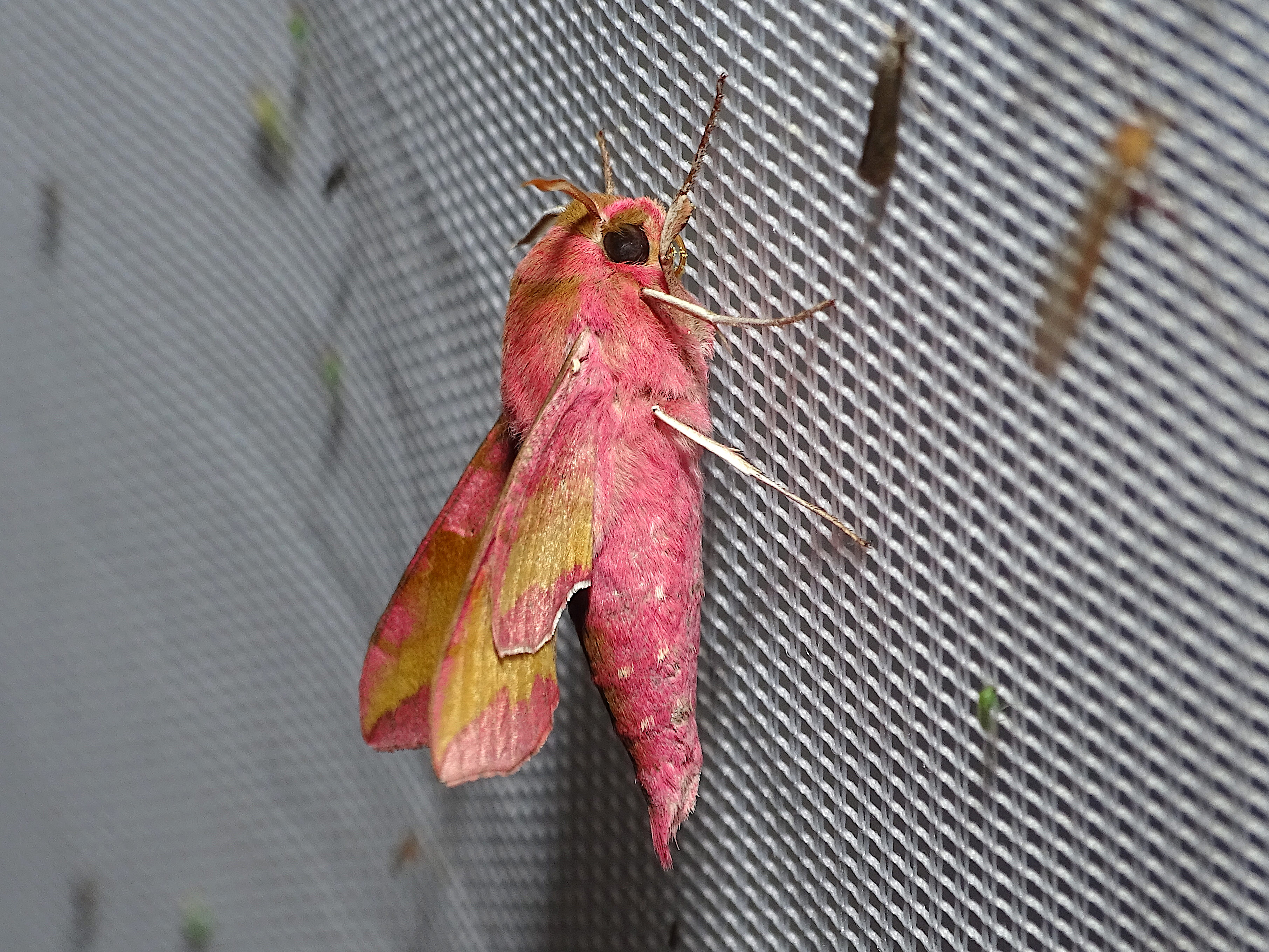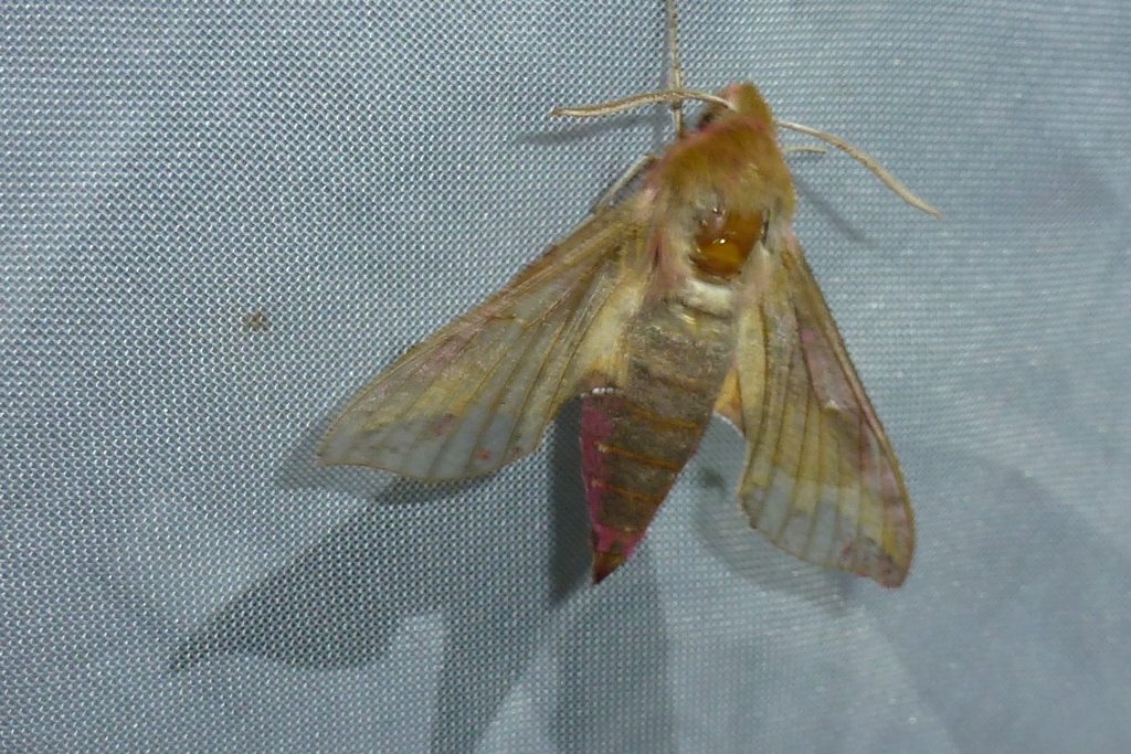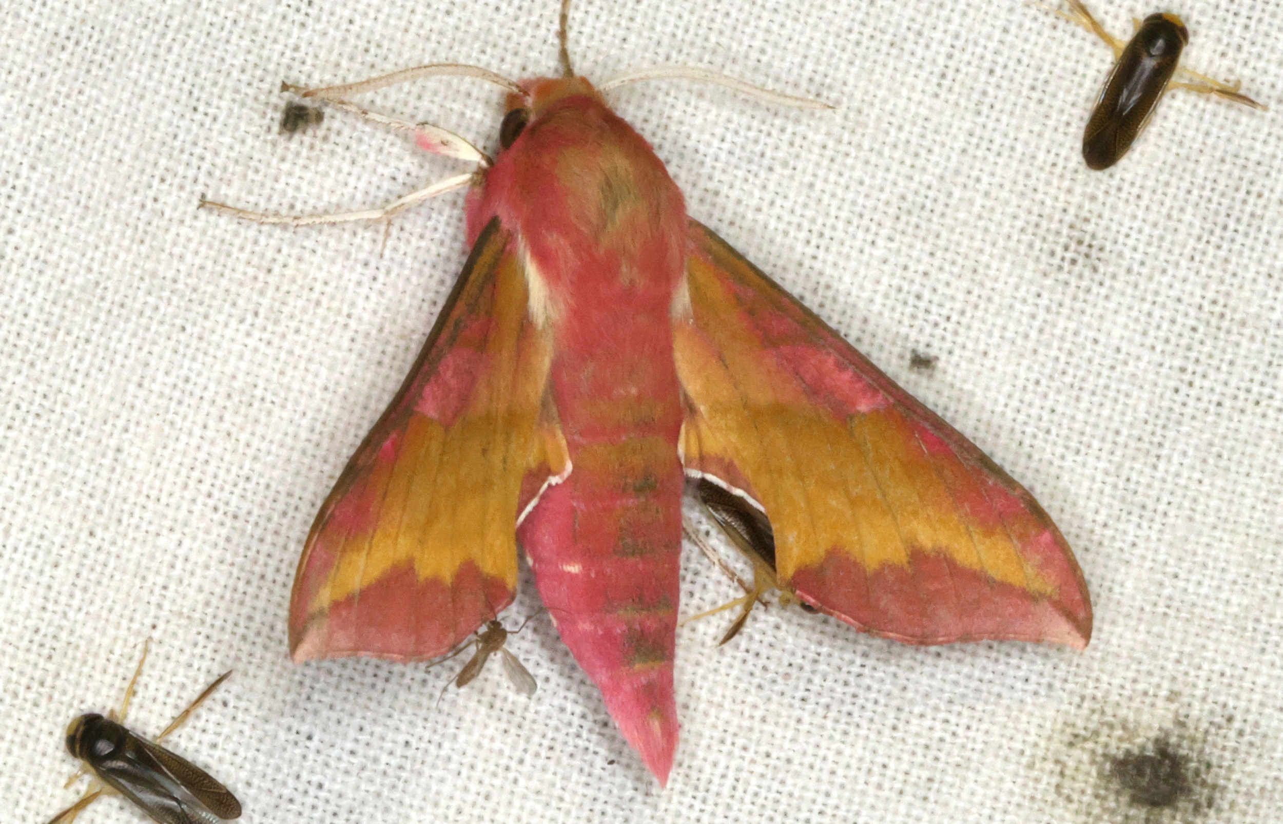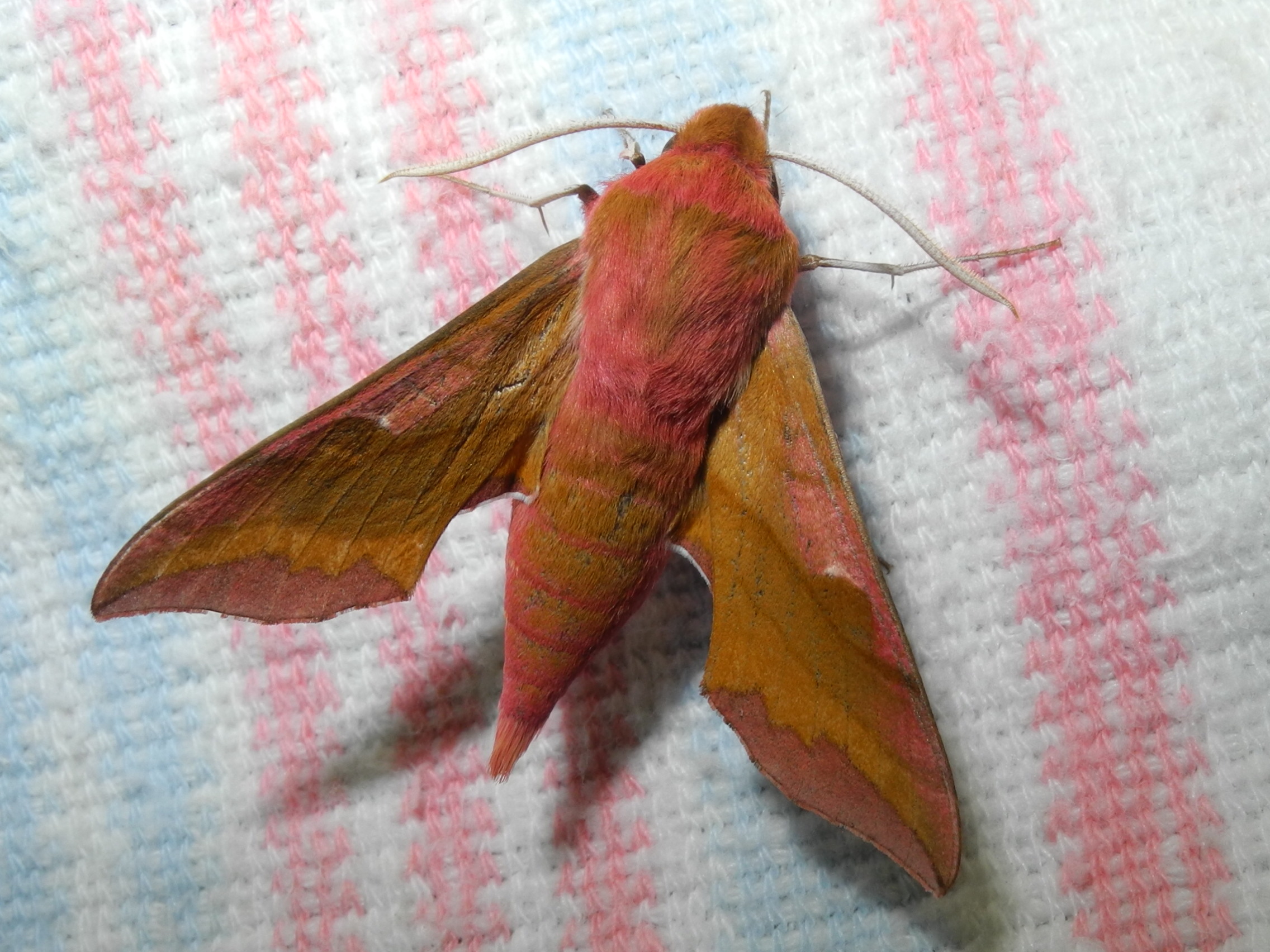 Größenvergleich: D. porcellus (Kleiner Weinschwärmer, unten) und D. elpenor (Mittlerer Weinschwärmer), am Licht - Westlausitz, Pulsnitz, Kahlschlag/Bachtal Hahneflüsschen, 5. Juni 2022