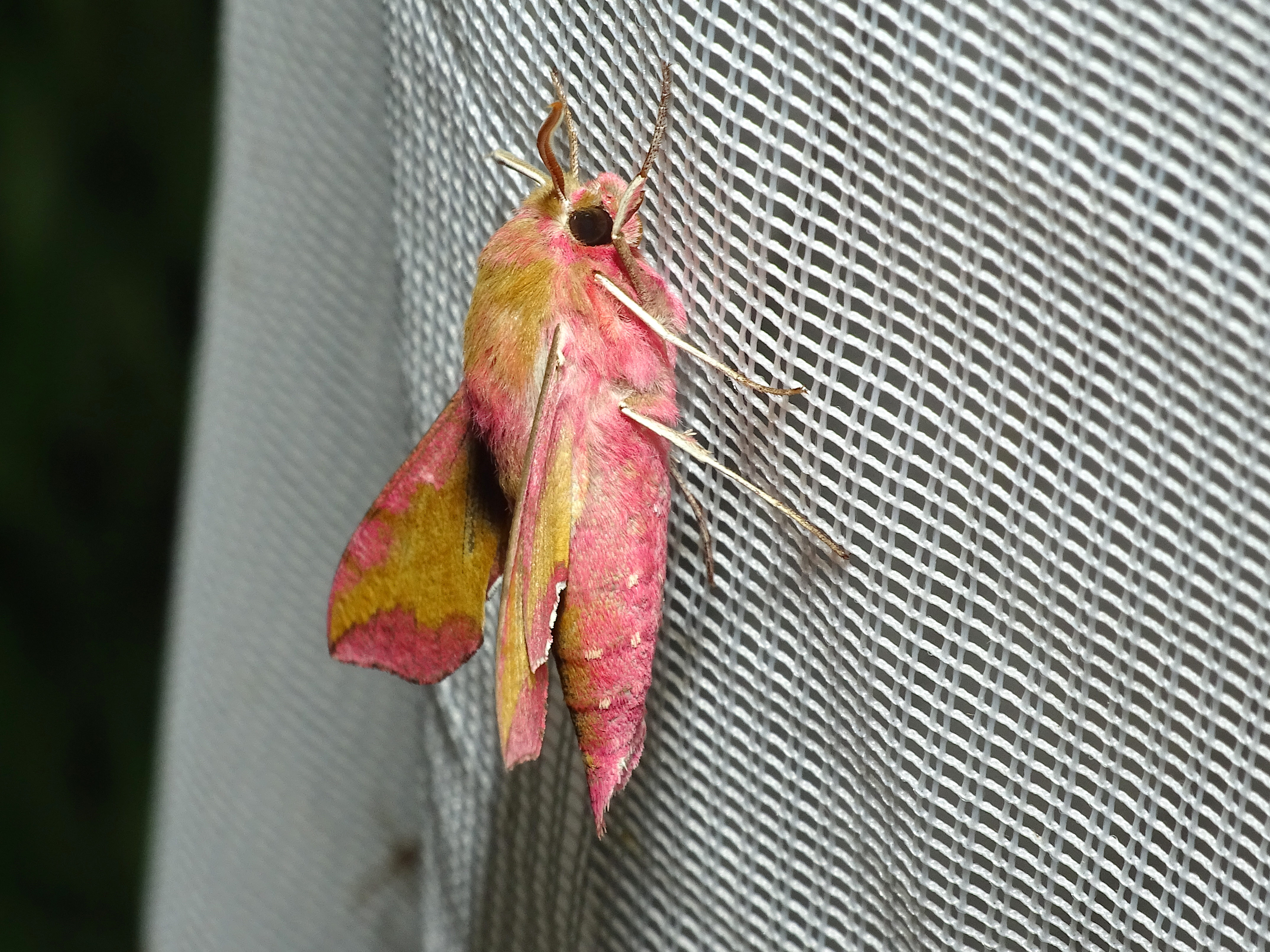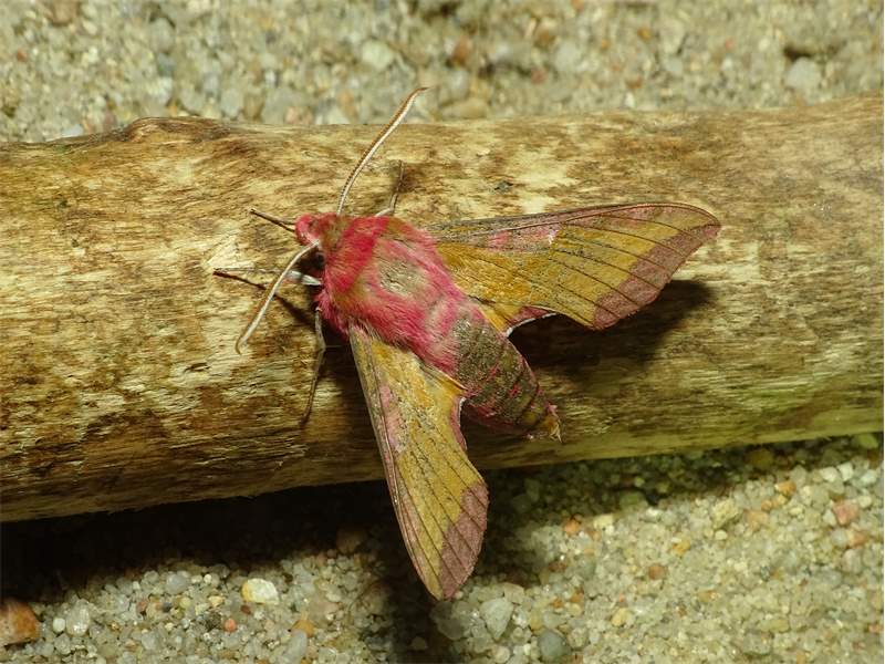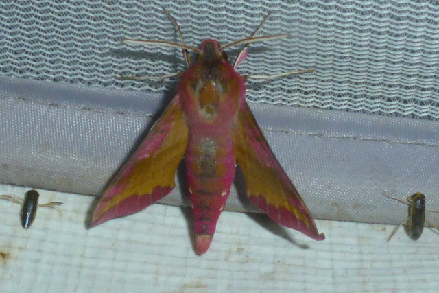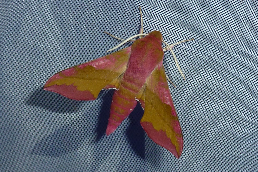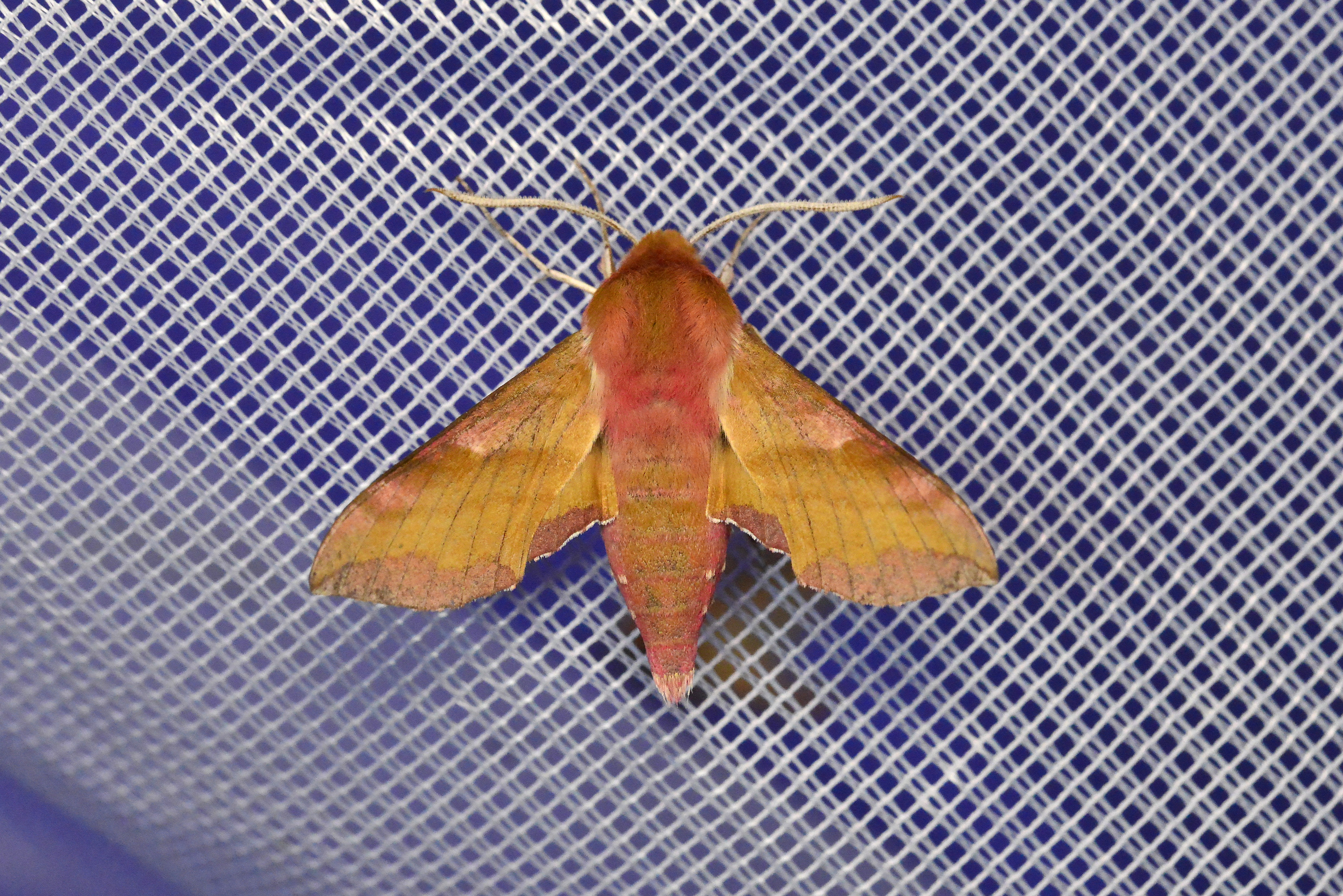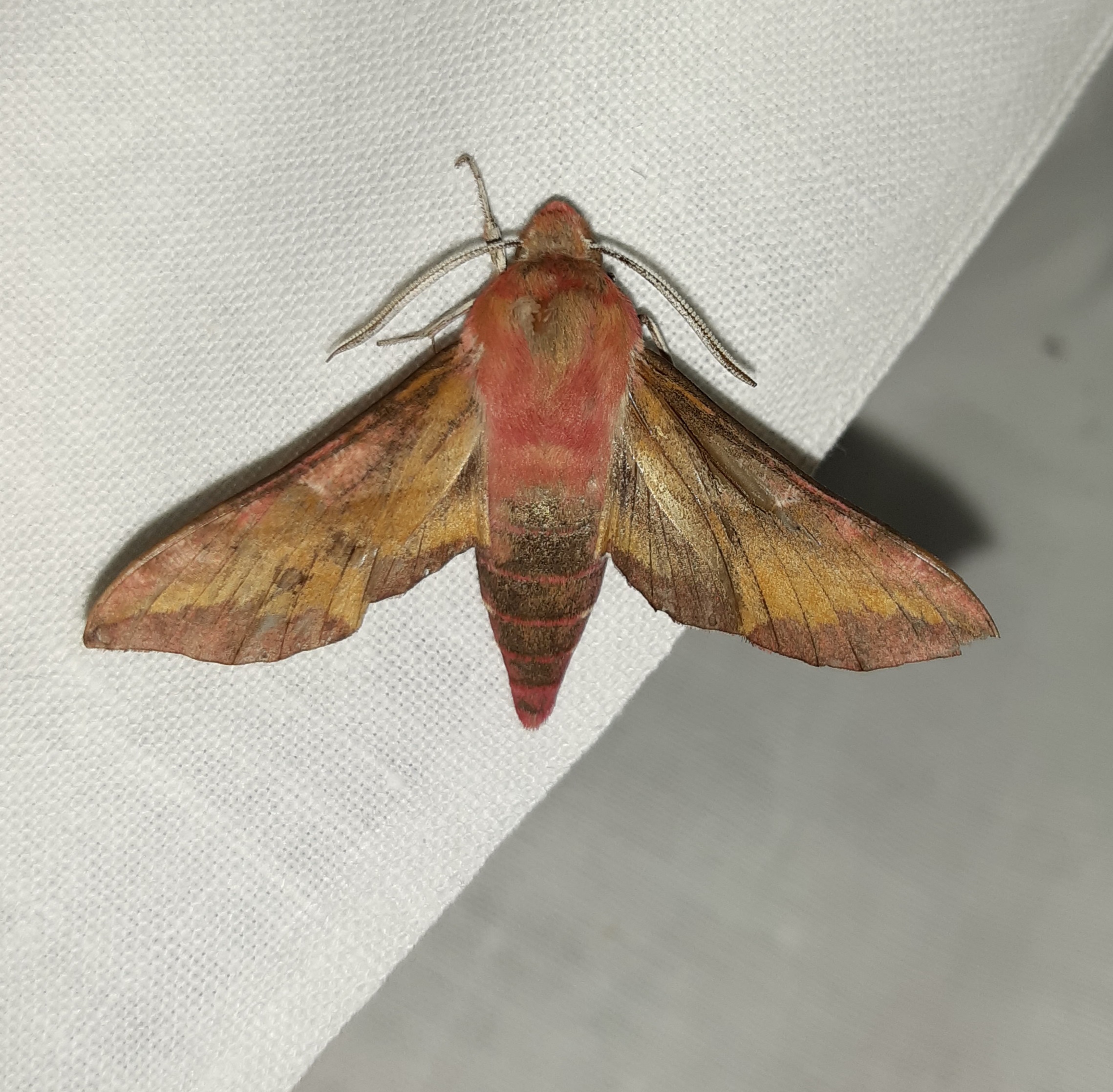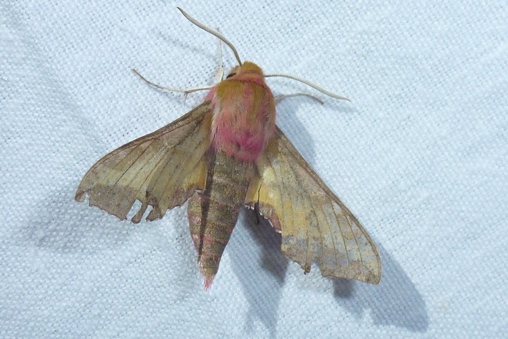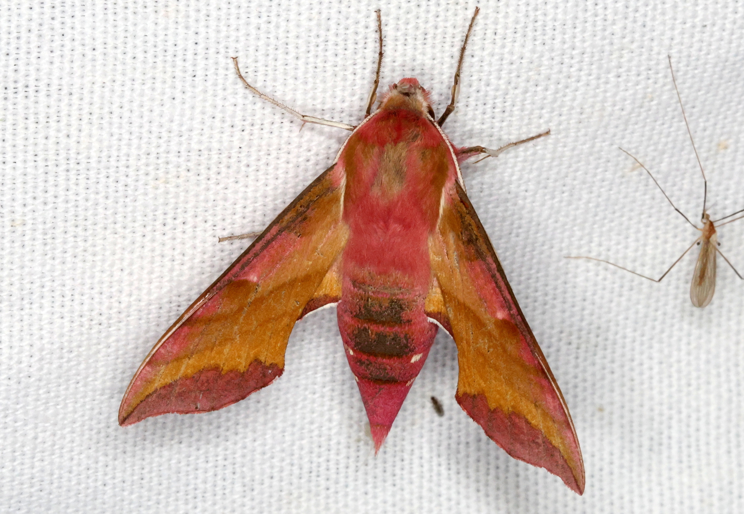 Größenvergleich: D. porcellus (Kleiner Weinschwärmer, unten) und D. elpenor (Mittlerer Weinschwärmer), am Licht - Westlausitz, Pulsnitz, Kahlschlag/Bachtal Hahneflüsschen, 5. Juni 2022
