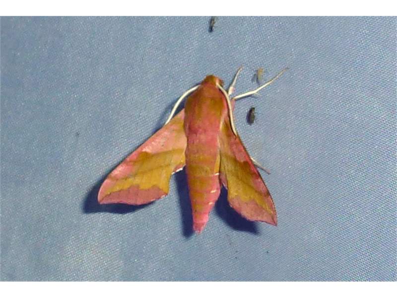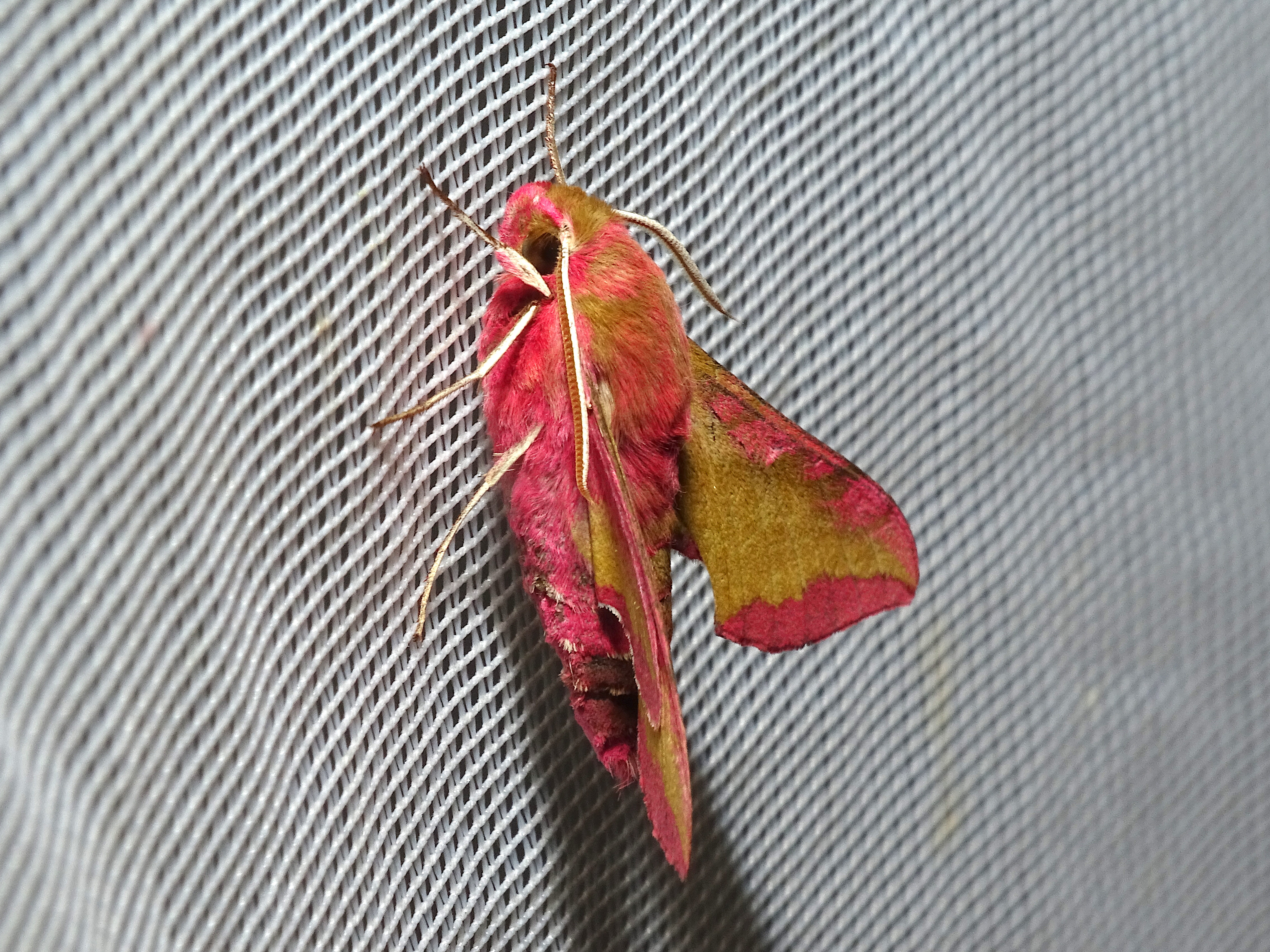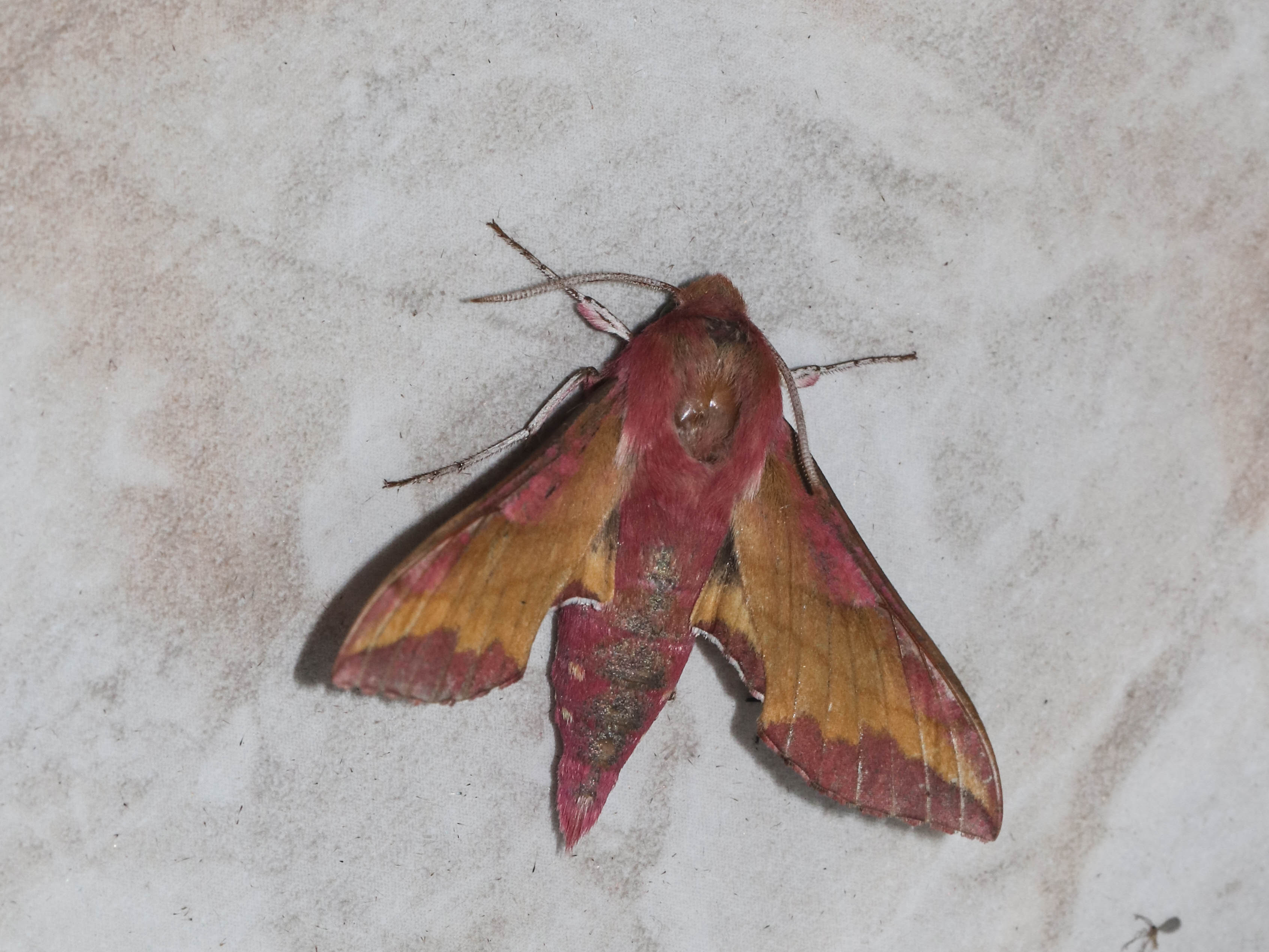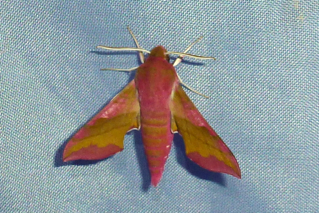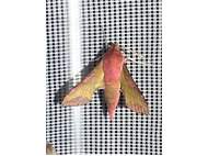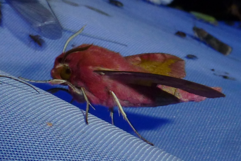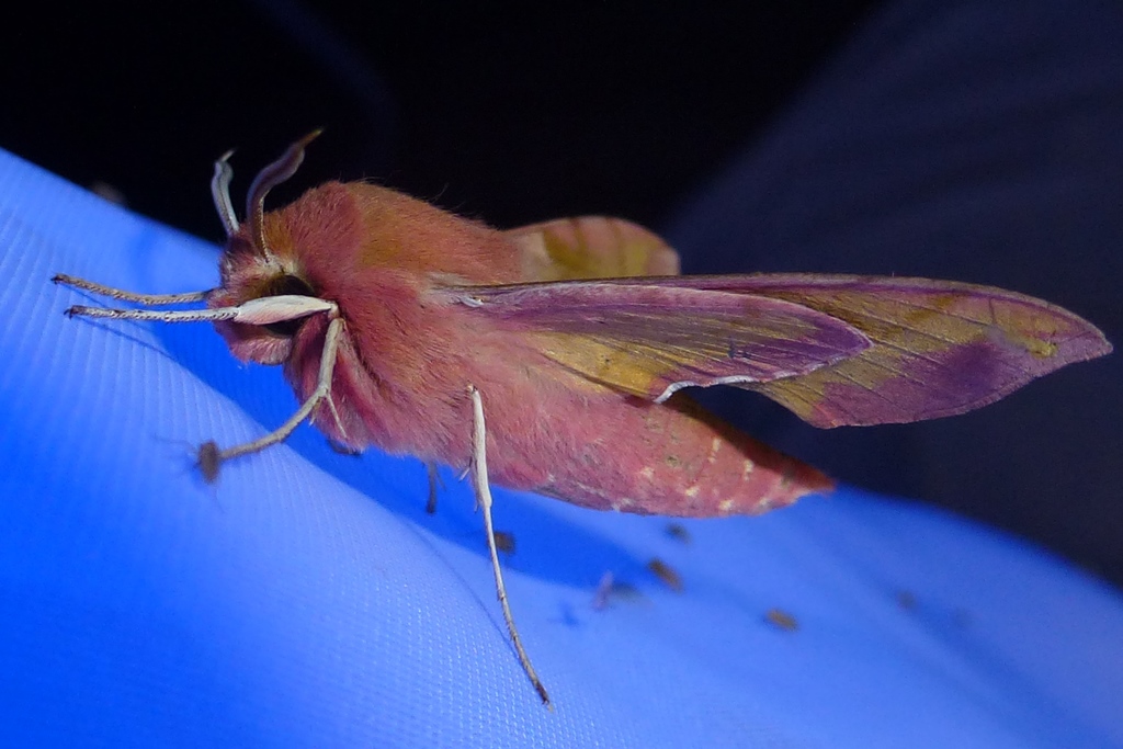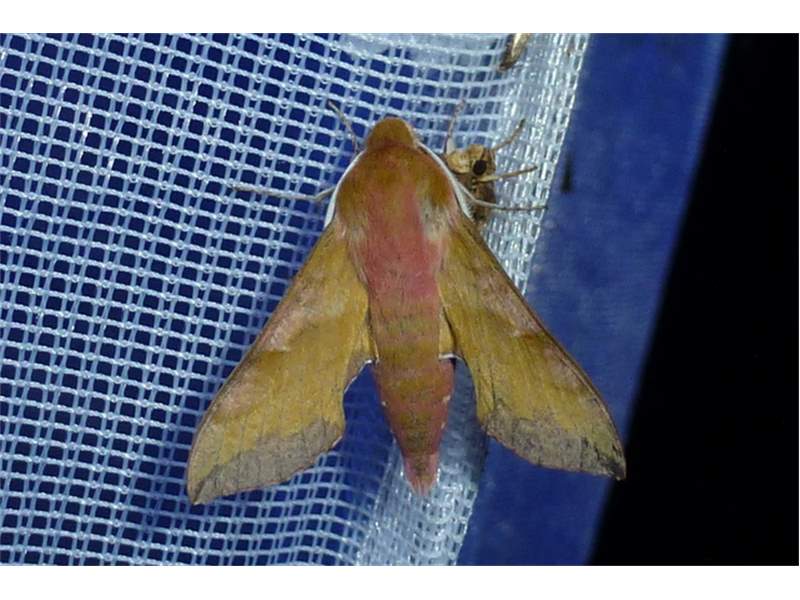 Größenvergleich: D. porcellus (Kleiner Weinschwärmer, unten) und D. elpenor (Mittlerer Weinschwärmer), am Licht - Westlausitz, Pulsnitz, Kahlschlag/Bachtal Hahneflüsschen, 5. Juni 2022