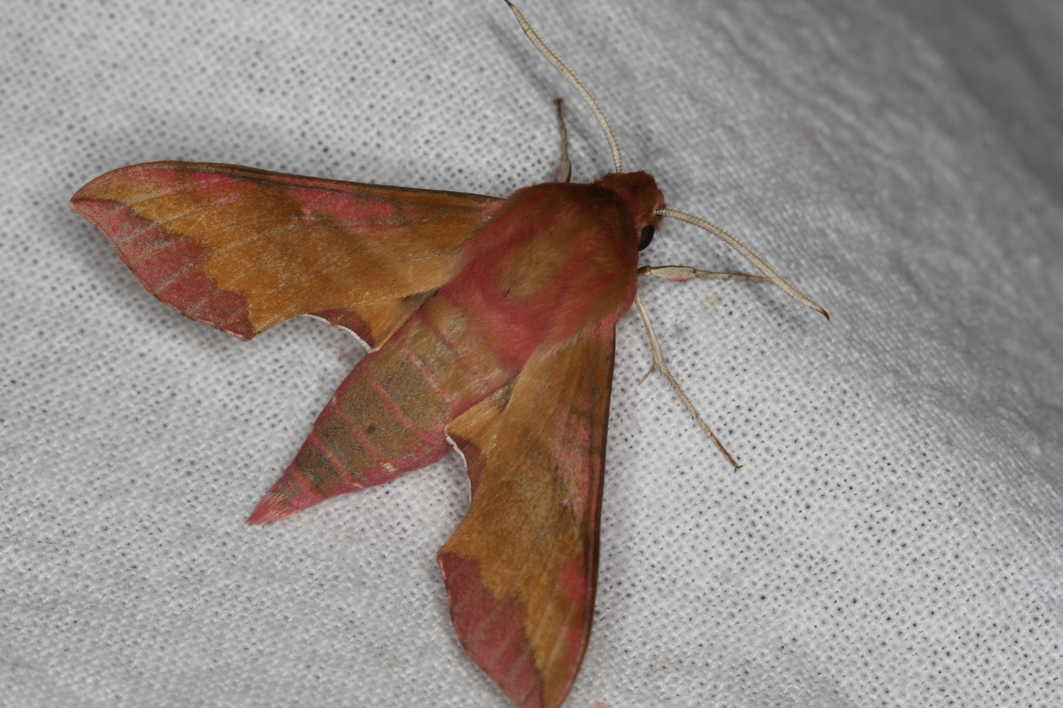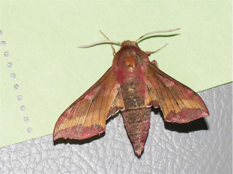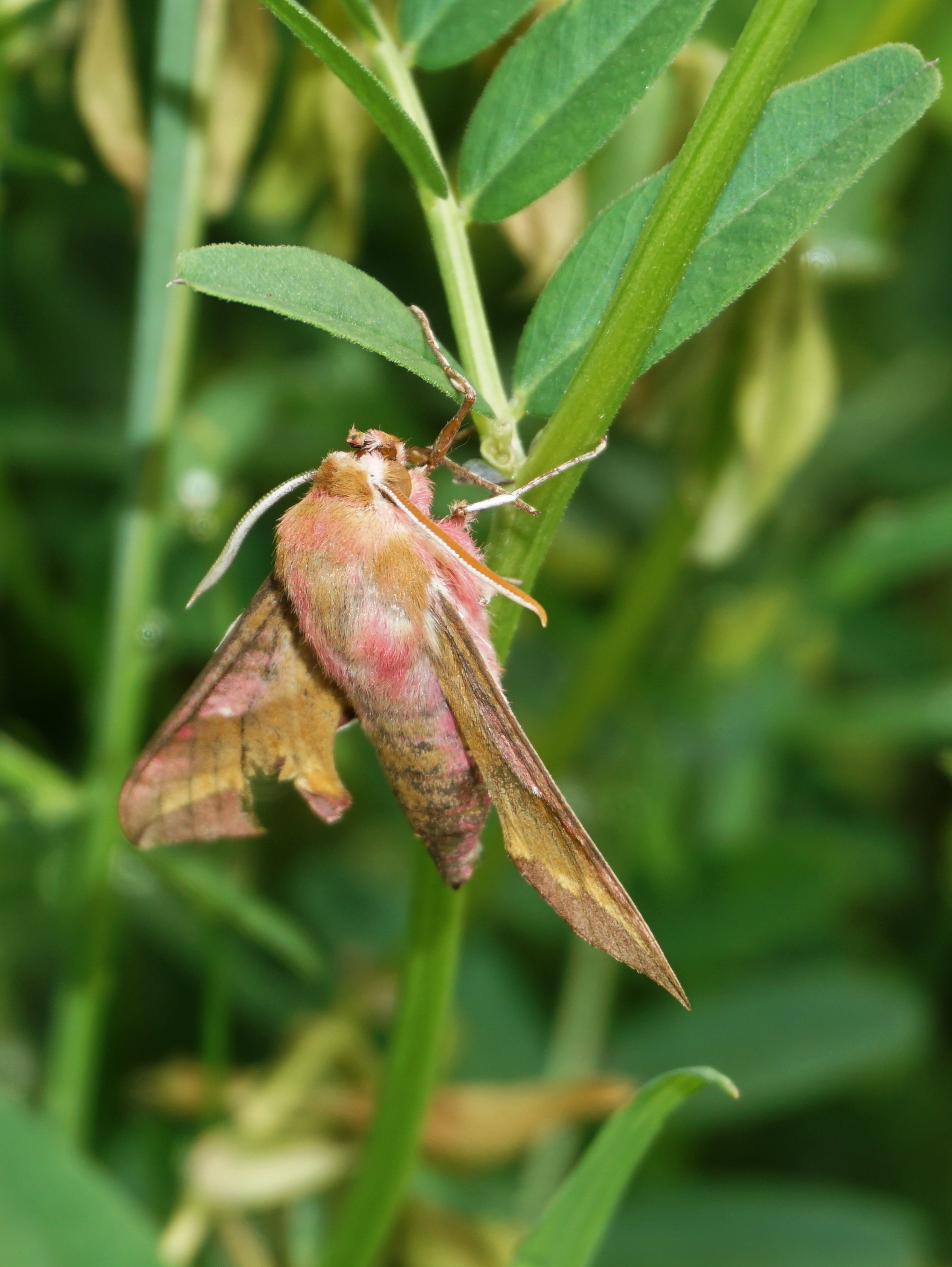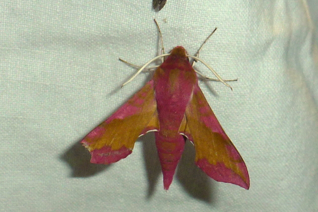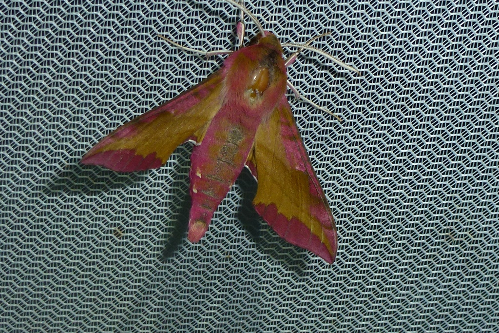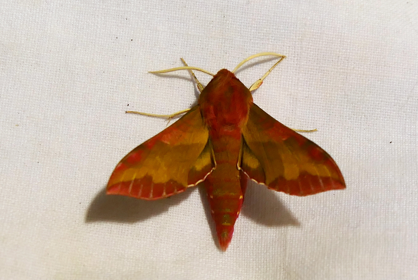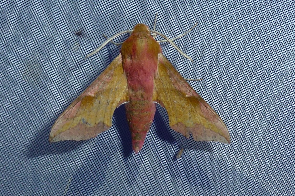 Größenvergleich: D. porcellus (Kleiner Weinschwärmer, unten) und D. elpenor (Mittlerer Weinschwärmer), am Licht - Westlausitz, Pulsnitz, Kahlschlag/Bachtal Hahneflüsschen, 5. Juni 2022