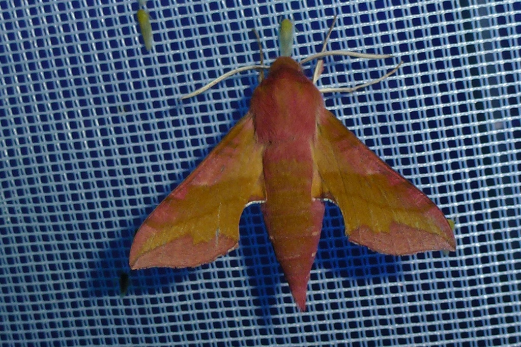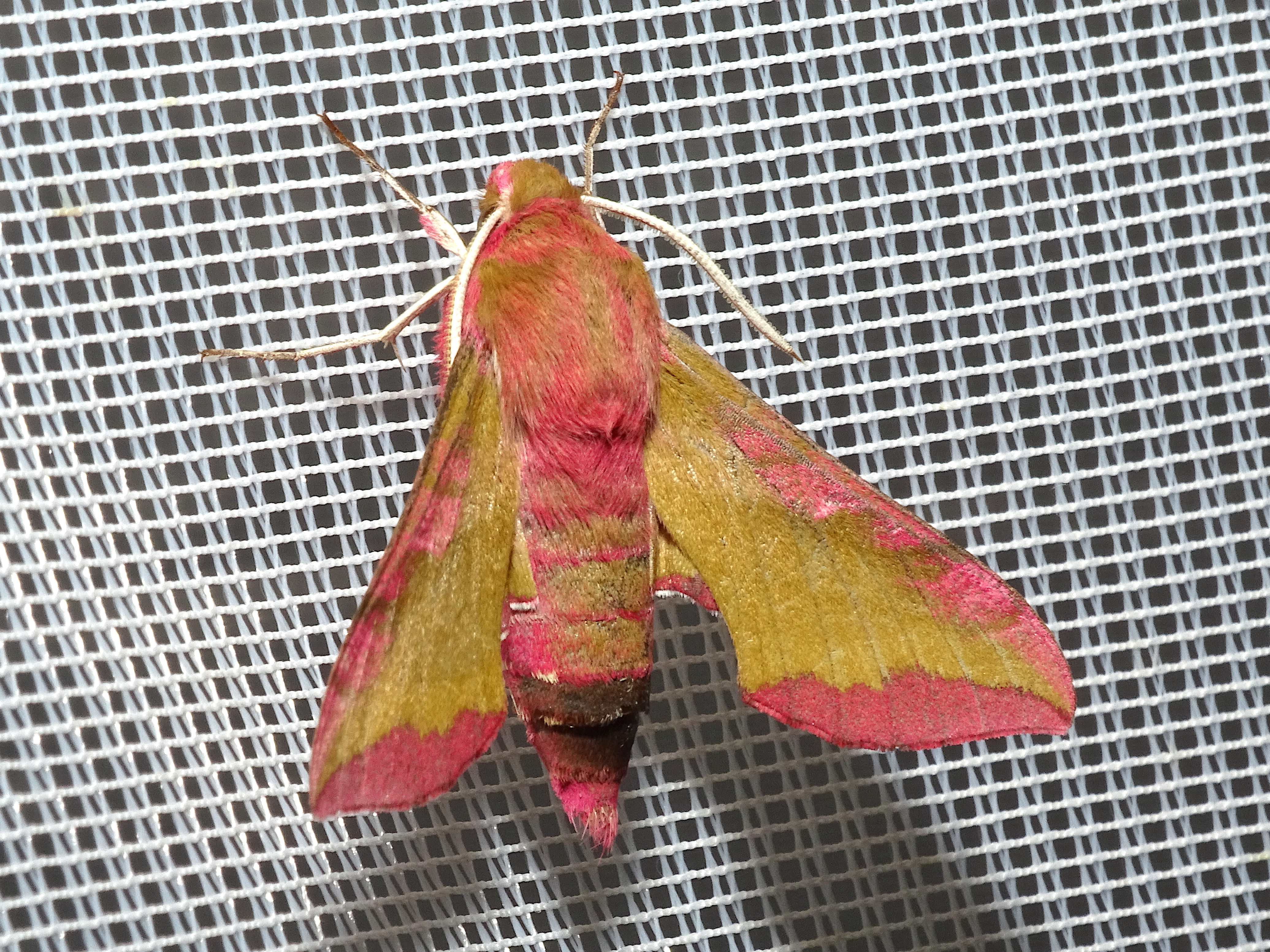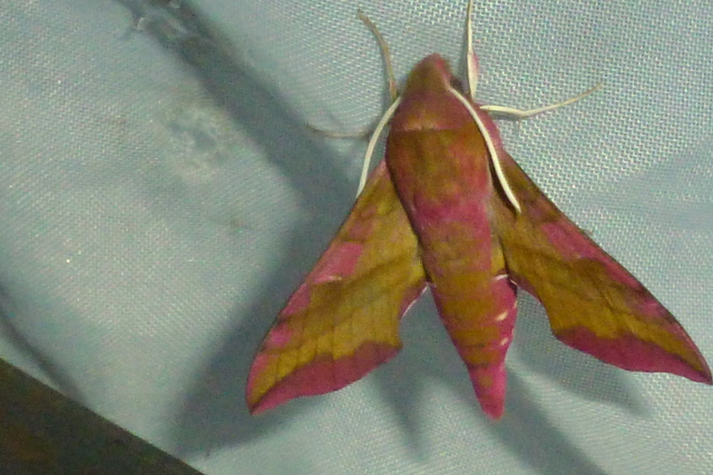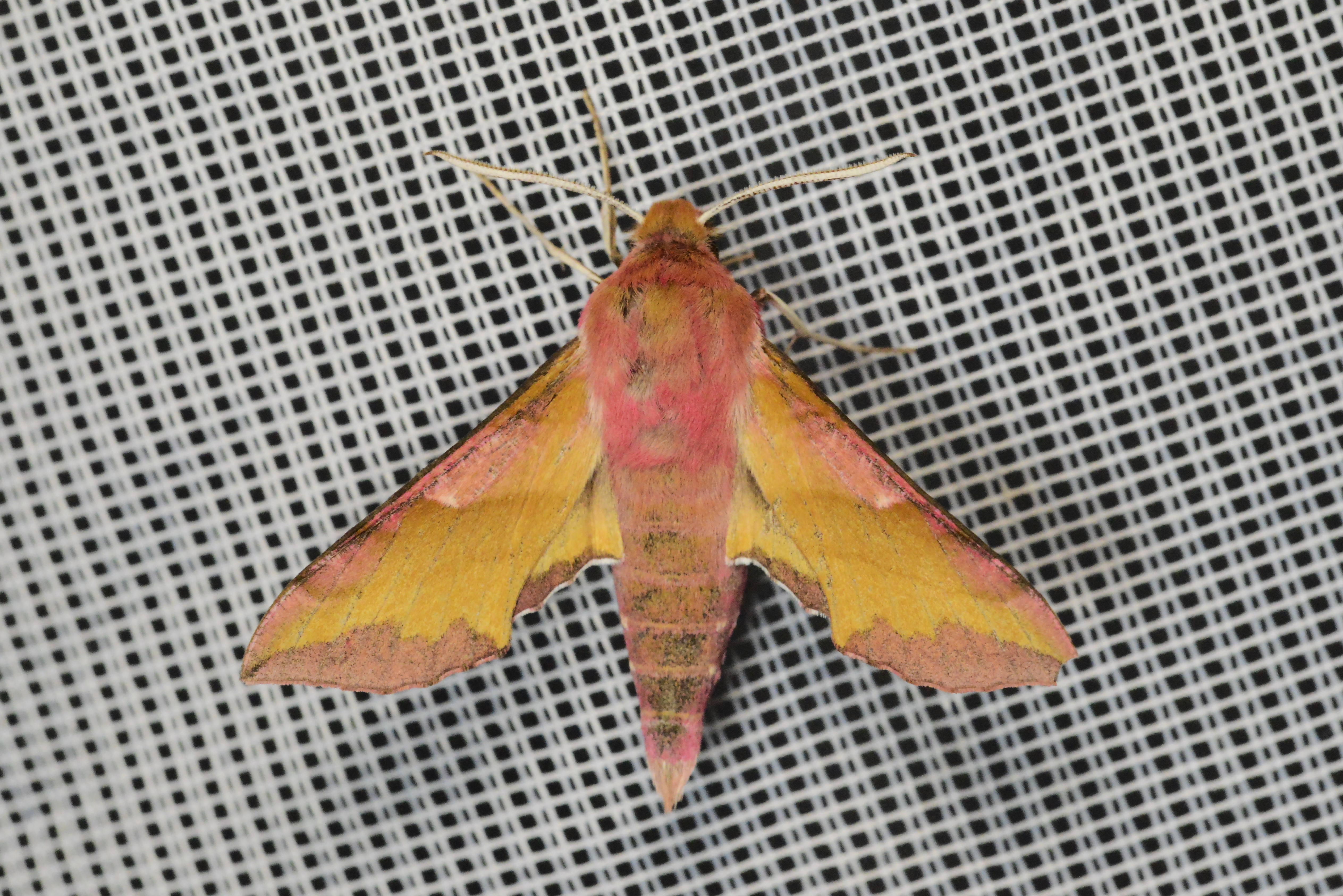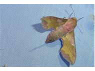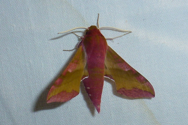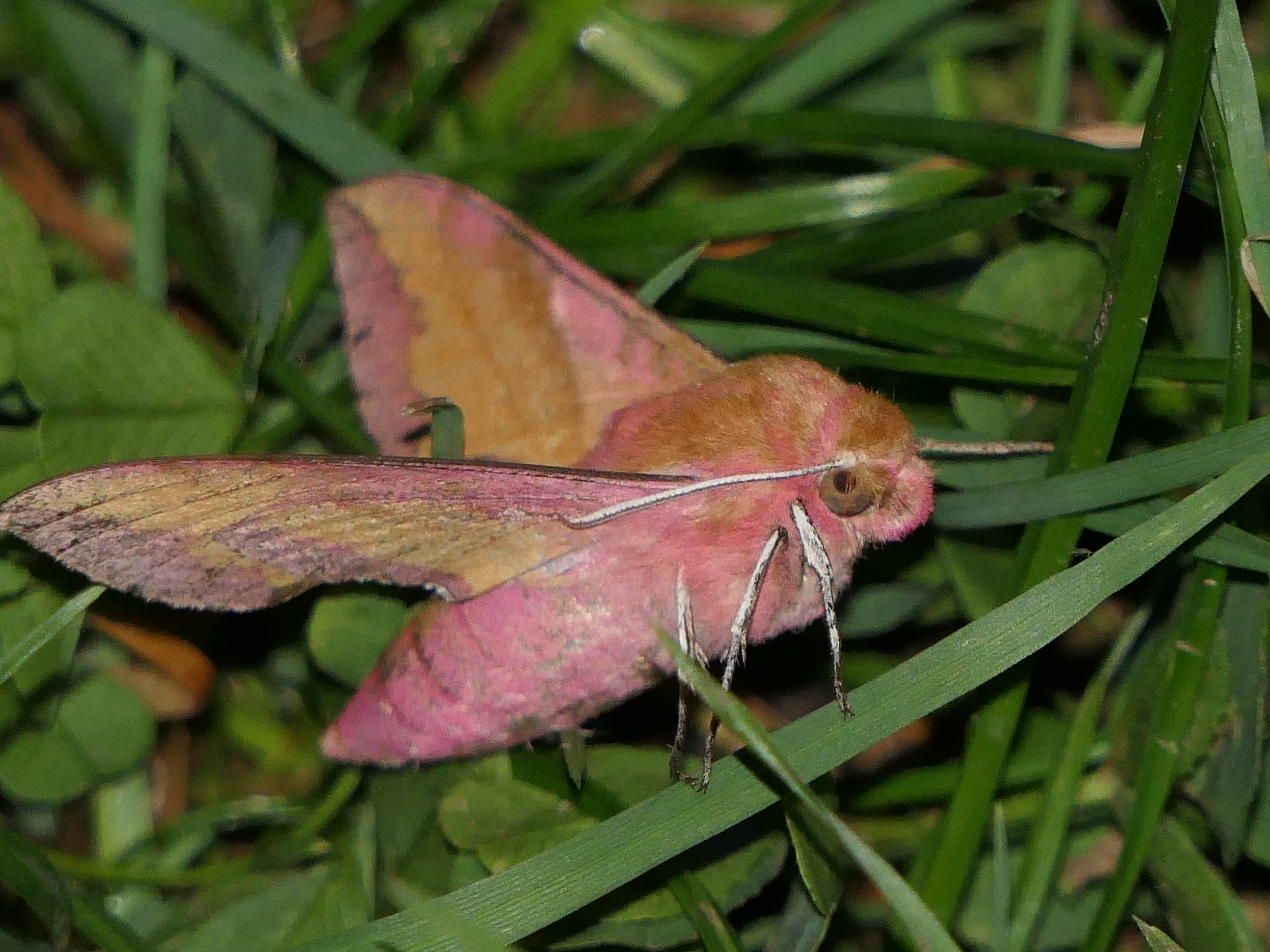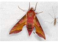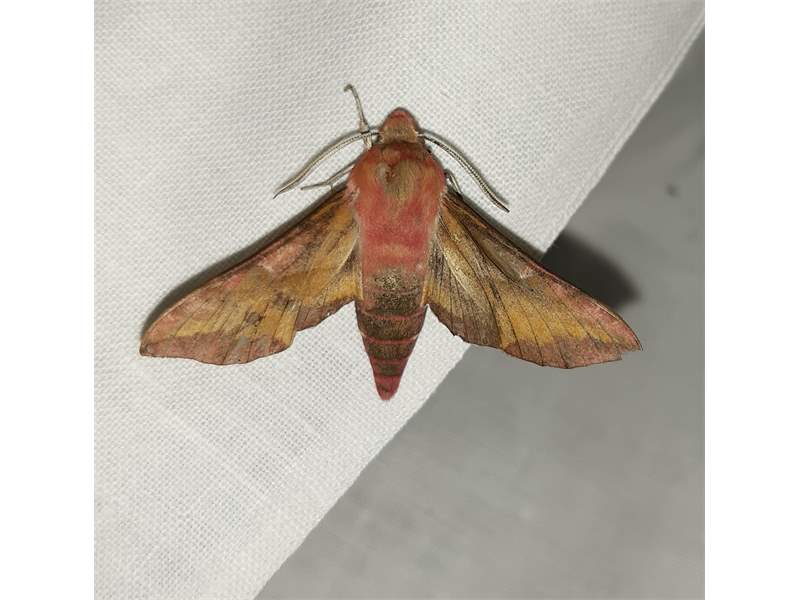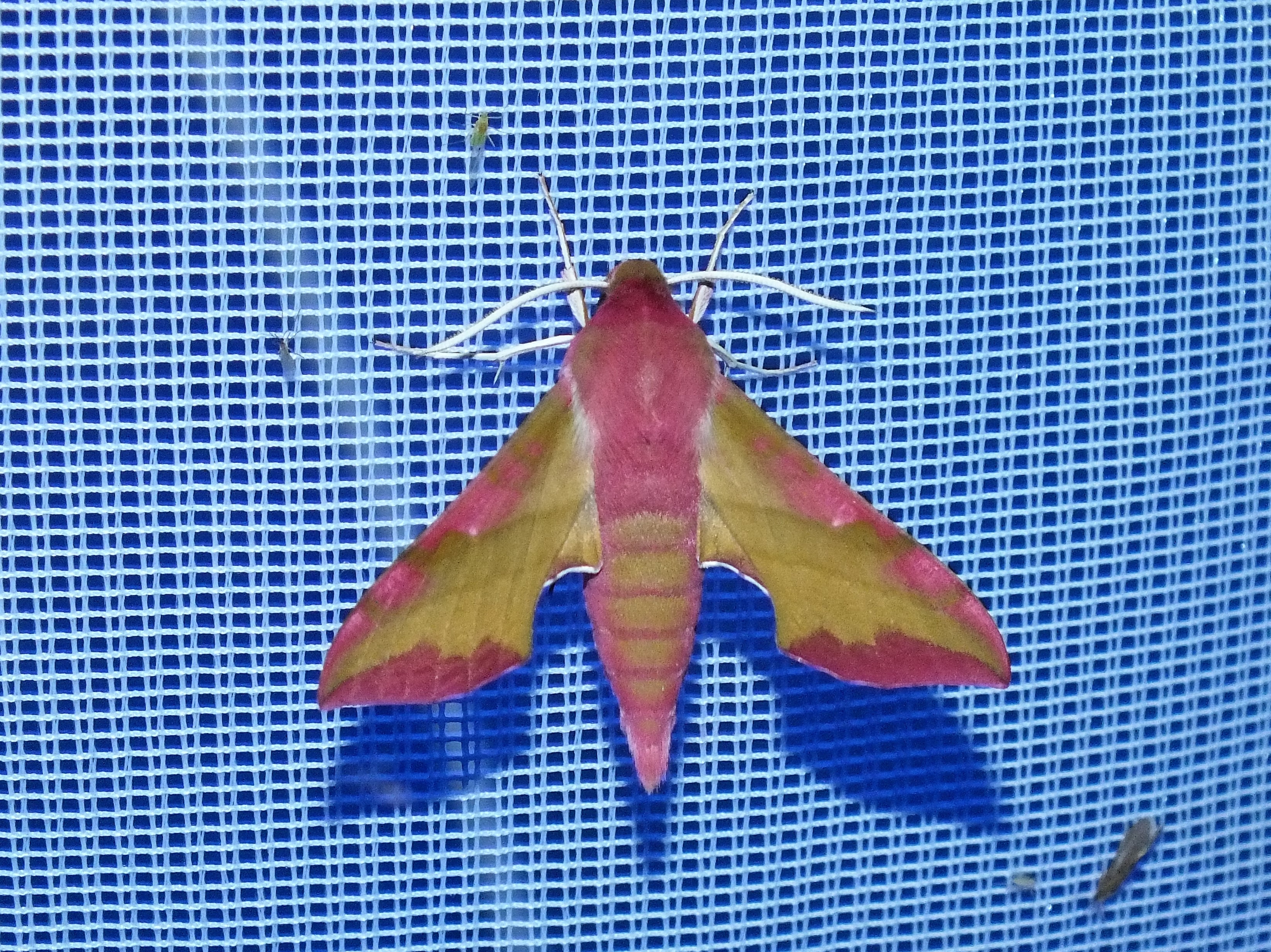 Größenvergleich: D. porcellus (Kleiner Weinschwärmer, unten) und D. elpenor (Mittlerer Weinschwärmer), am Licht - Westlausitz, Pulsnitz, Kahlschlag/Bachtal Hahneflüsschen, 5. Juni 2022