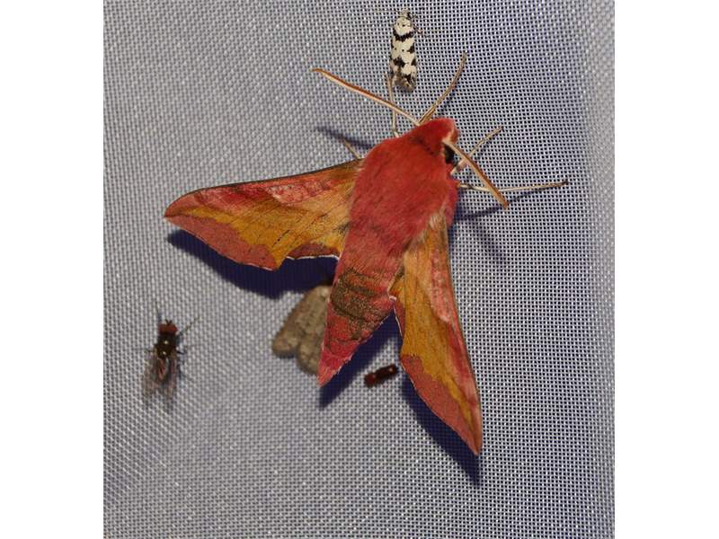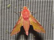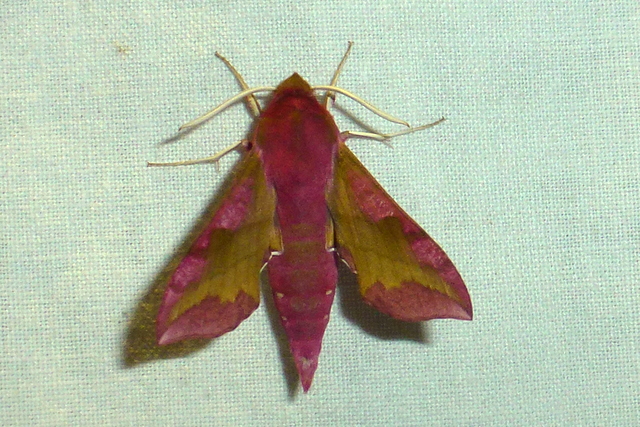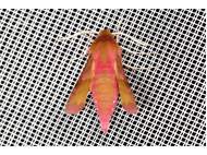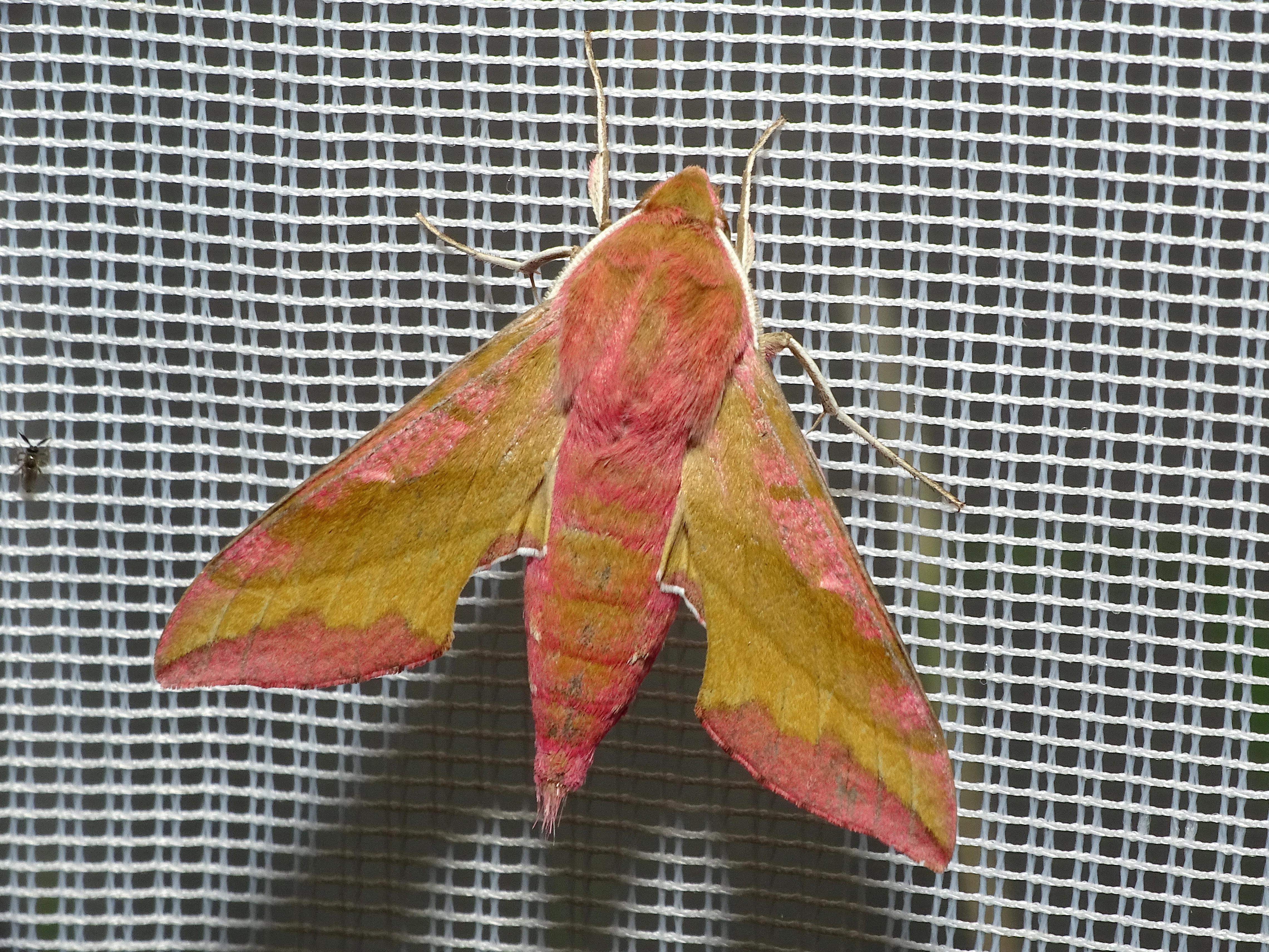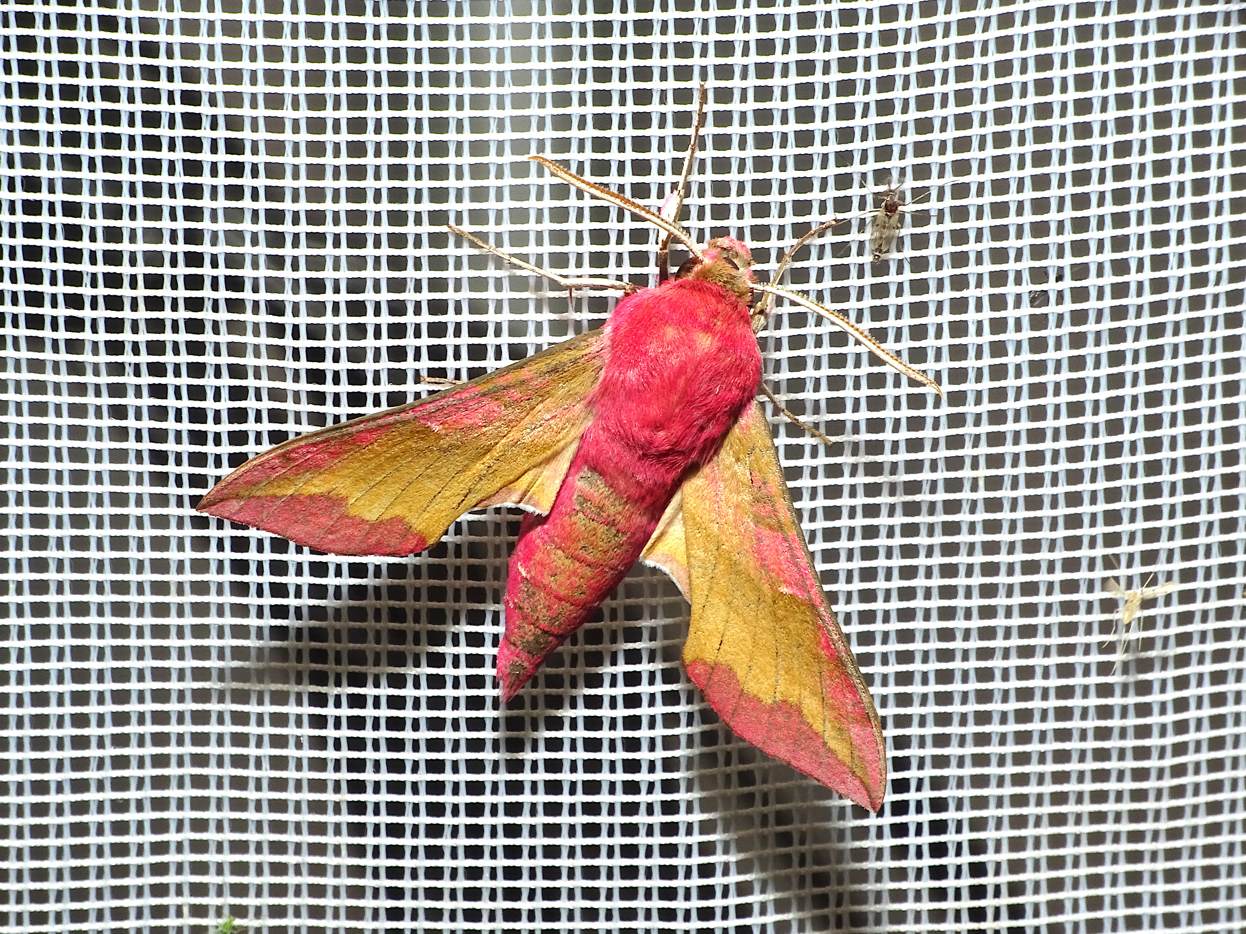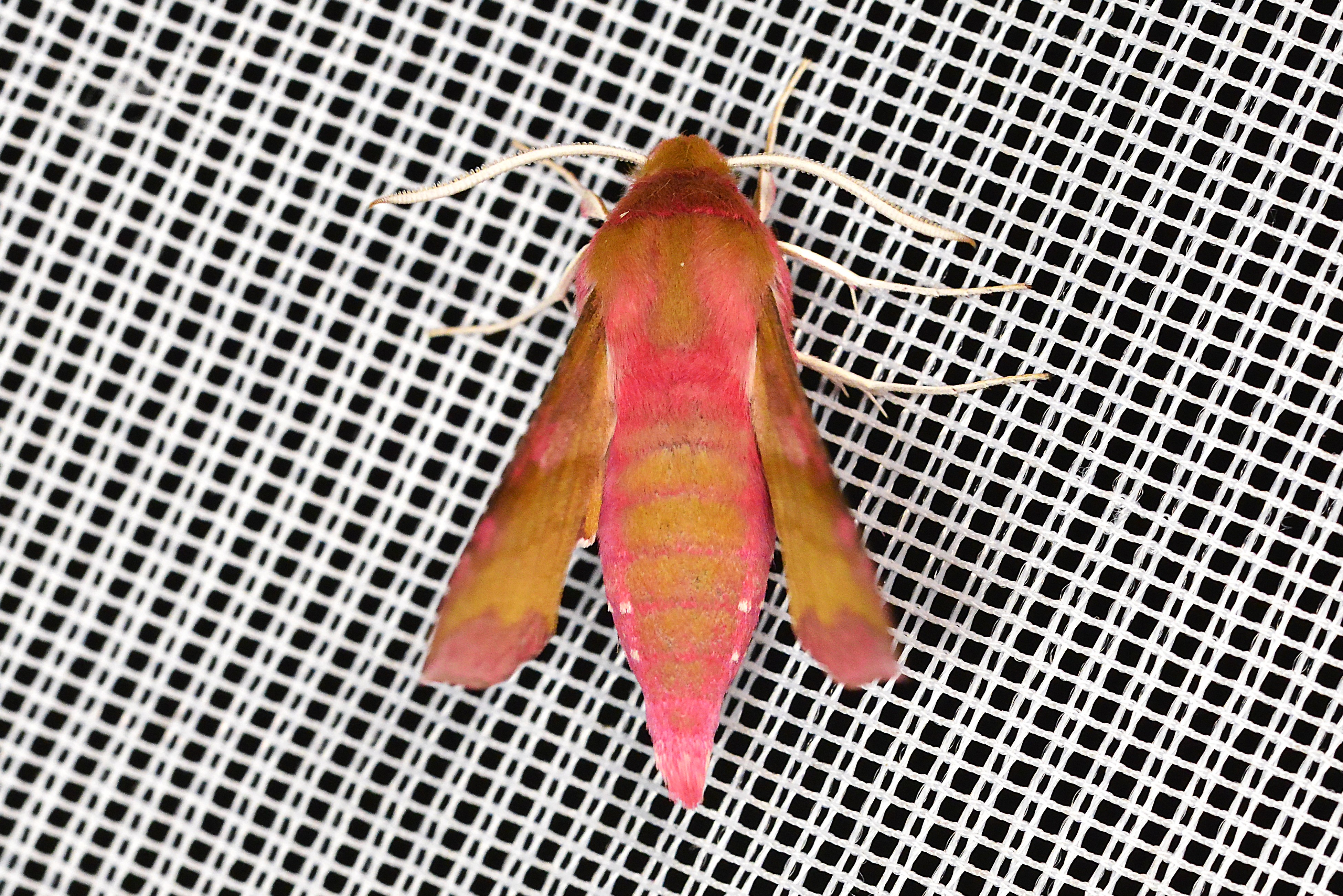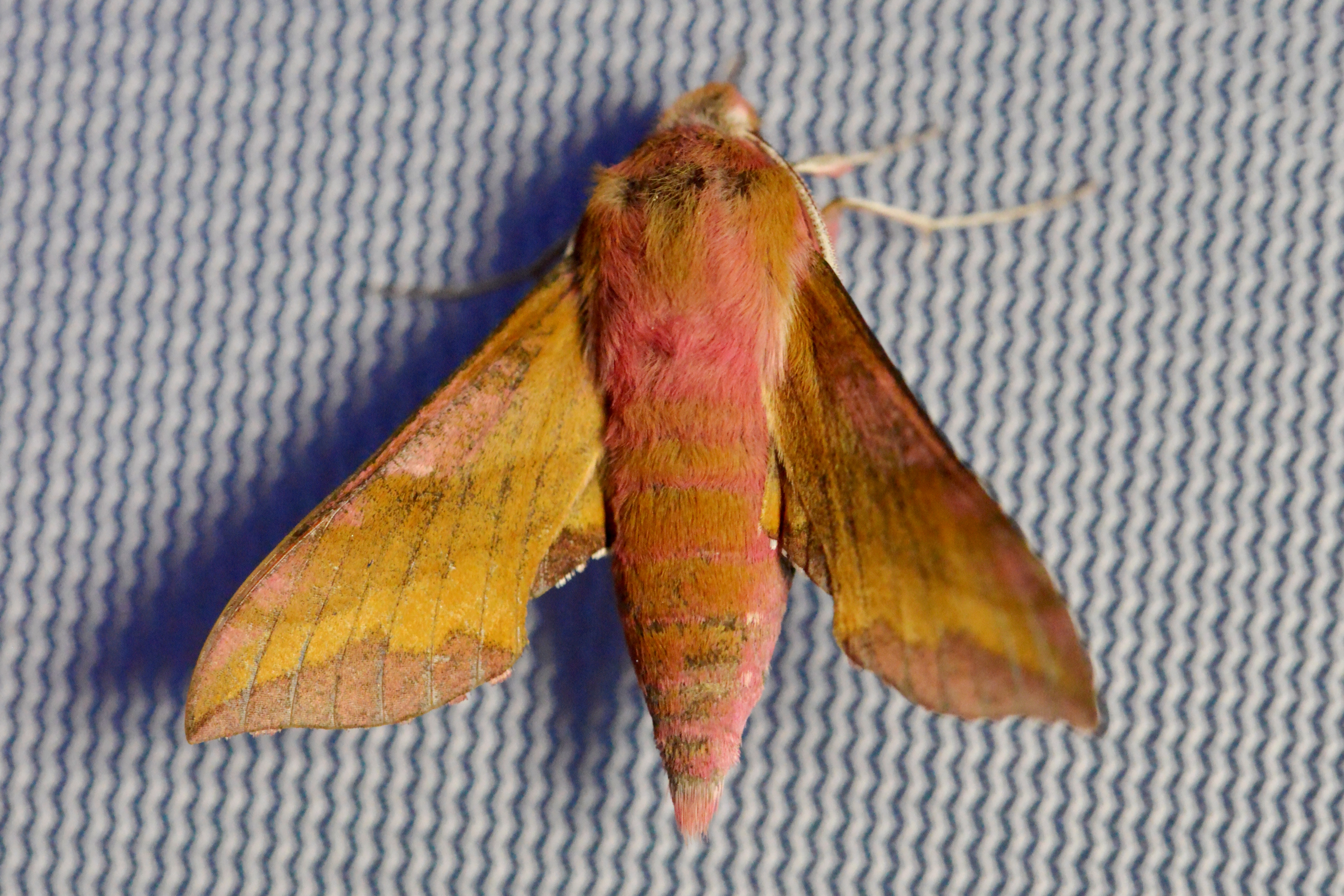 Größenvergleich: D. porcellus (Kleiner Weinschwärmer, unten) und D. elpenor (Mittlerer Weinschwärmer), am Licht - Westlausitz, Pulsnitz, Kahlschlag/Bachtal Hahneflüsschen, 5. Juni 2022