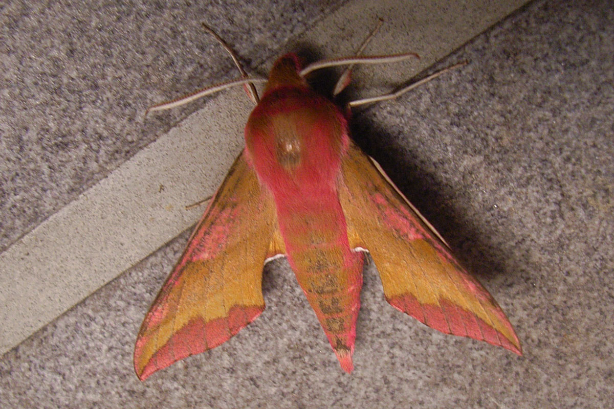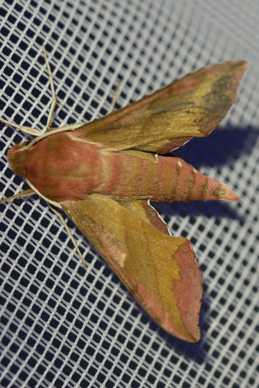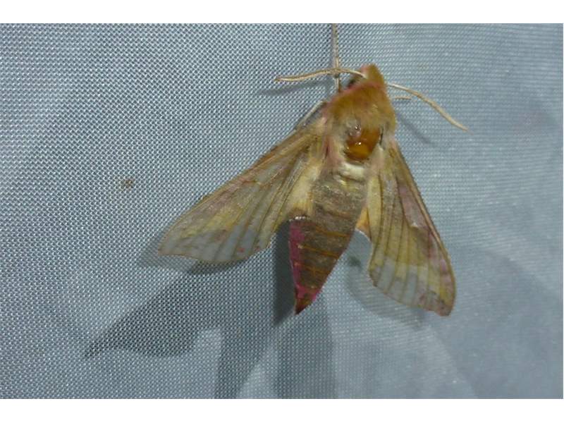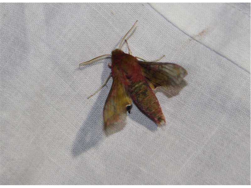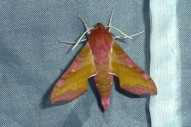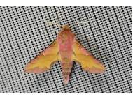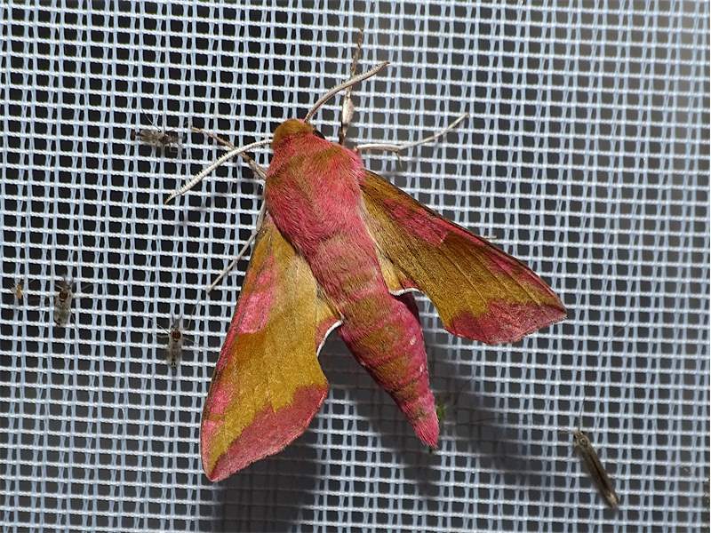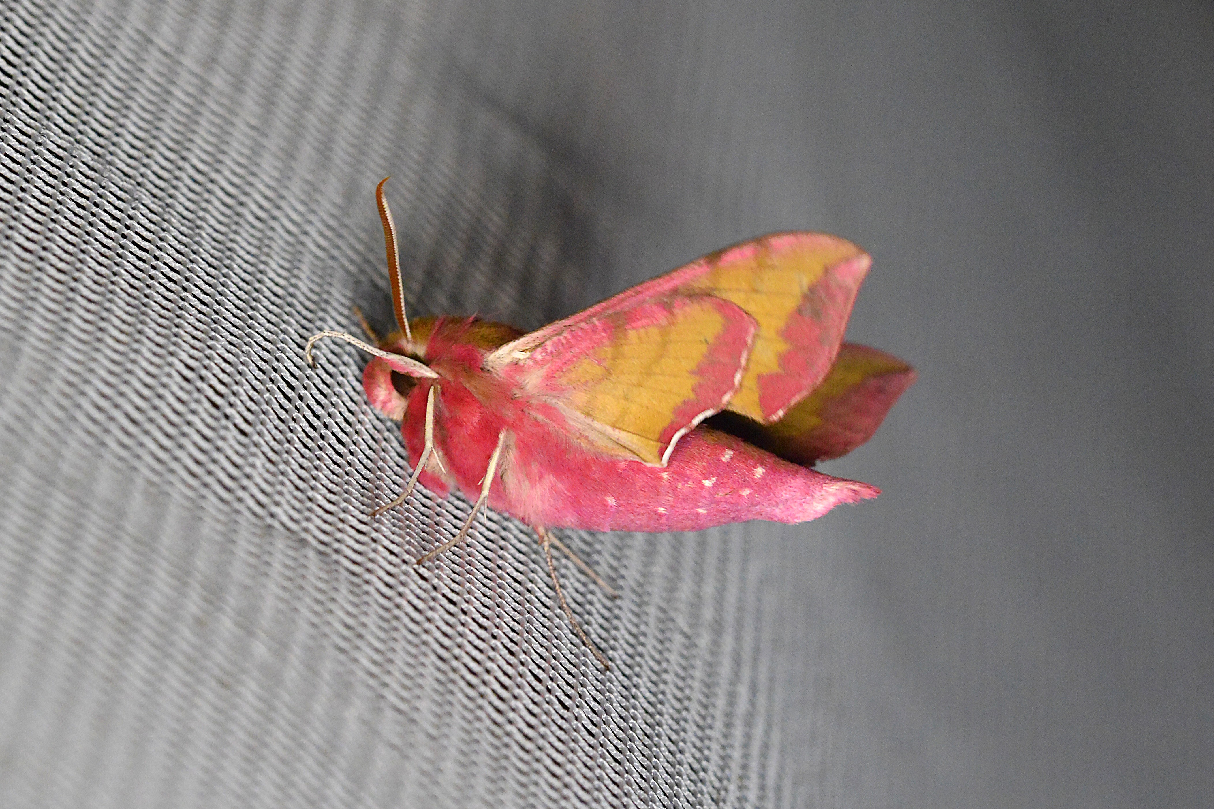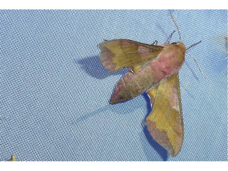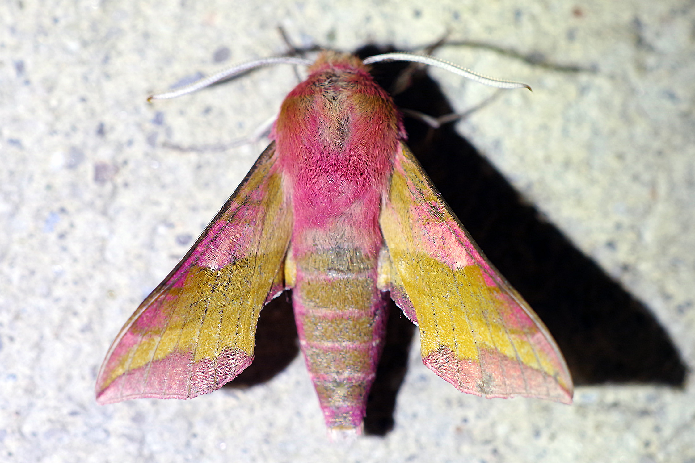 Größenvergleich: D. porcellus (Kleiner Weinschwärmer, unten) und D. elpenor (Mittlerer Weinschwärmer), am Licht - Westlausitz, Pulsnitz, Kahlschlag/Bachtal Hahneflüsschen, 5. Juni 2022