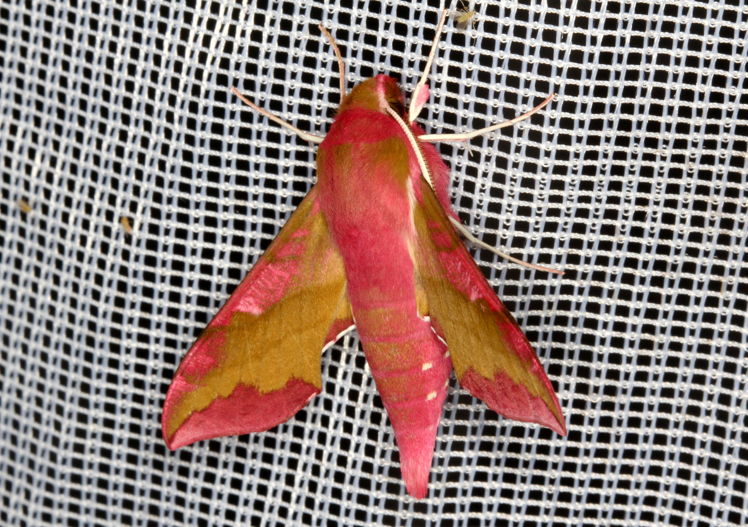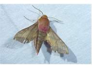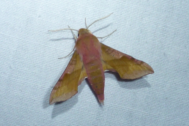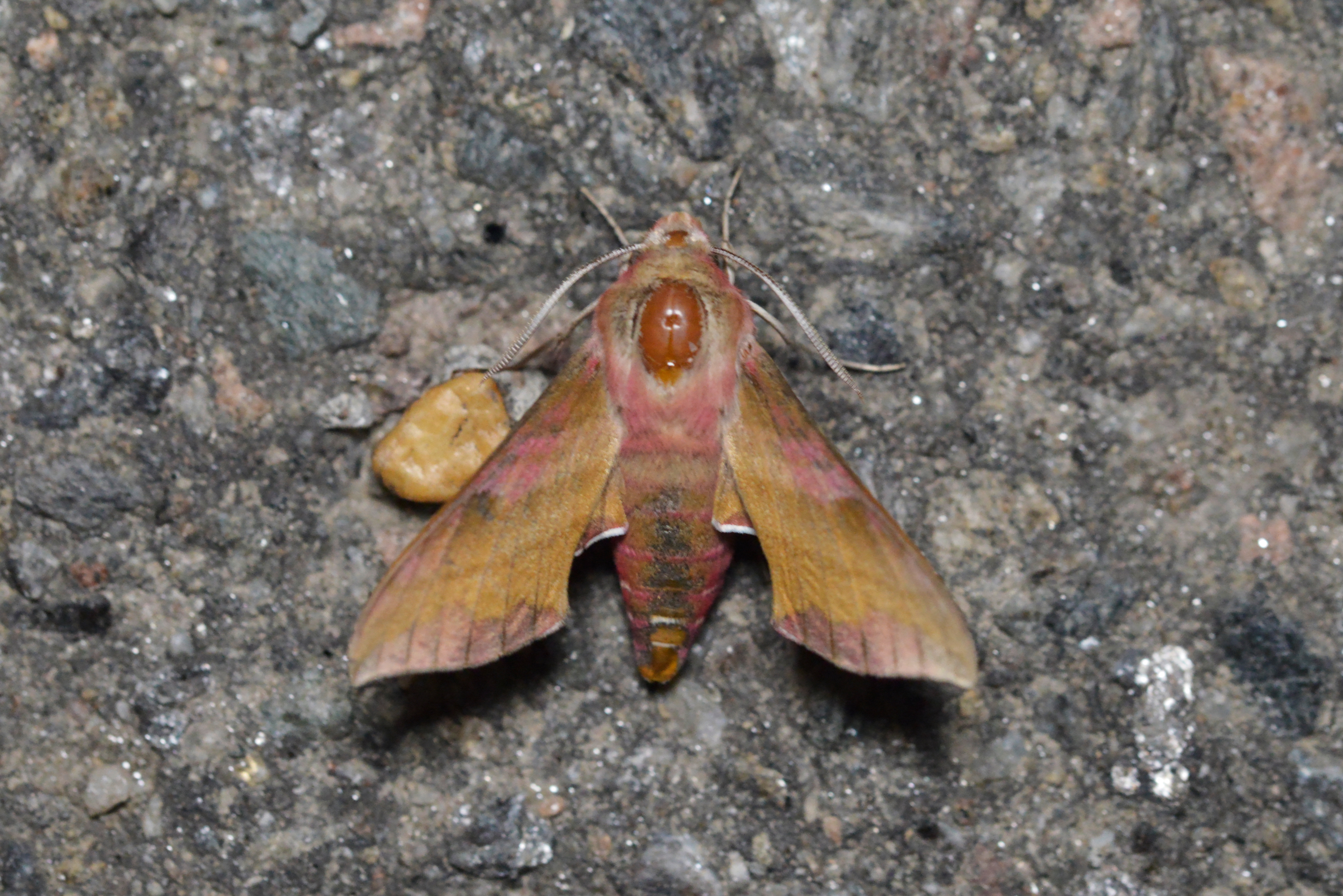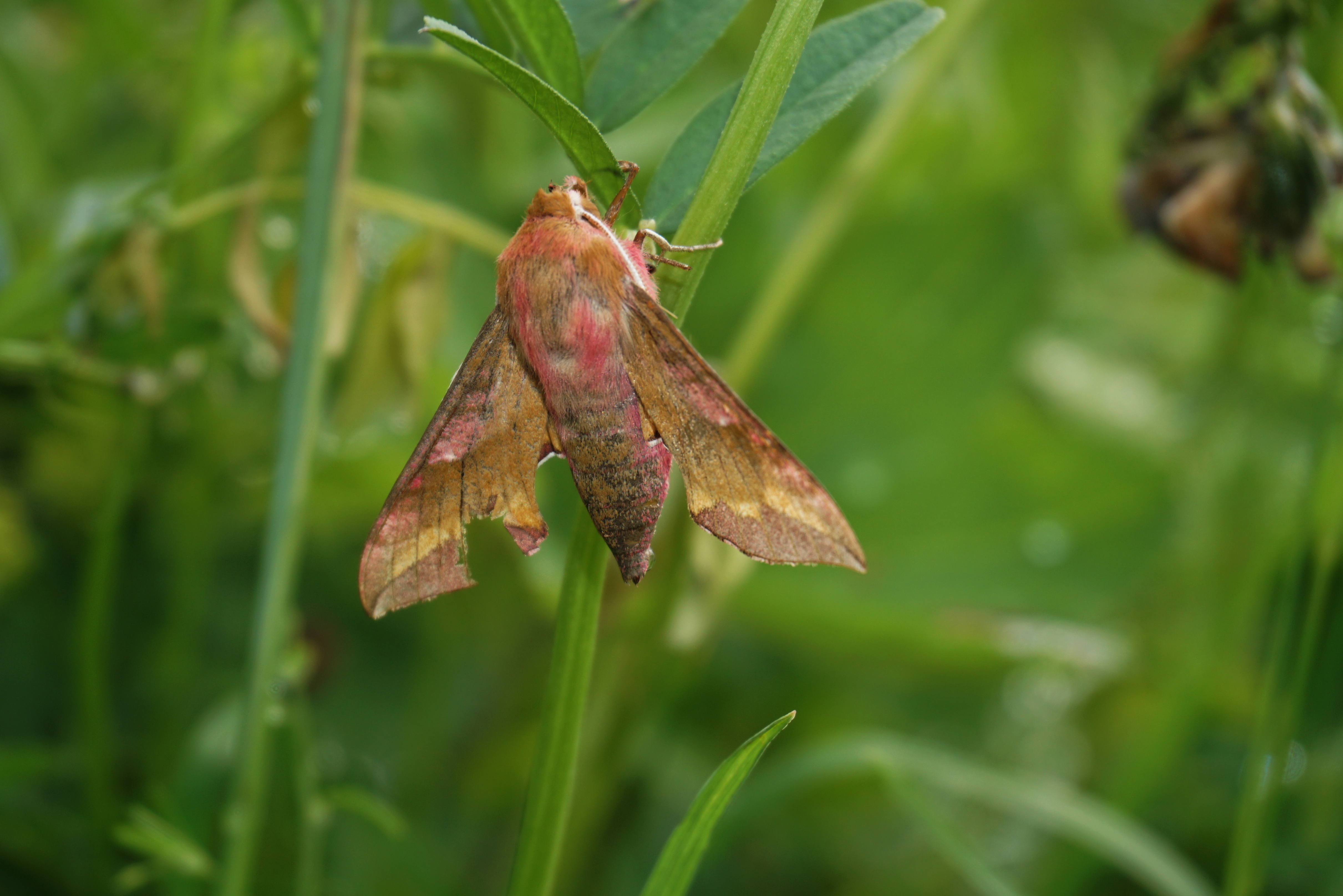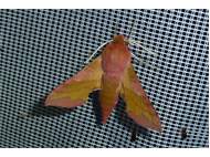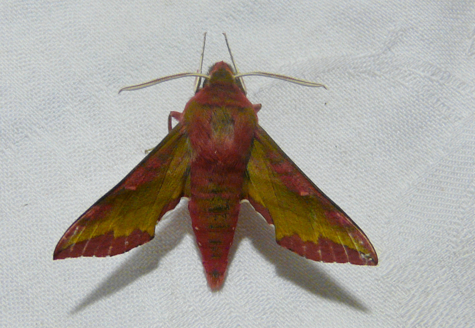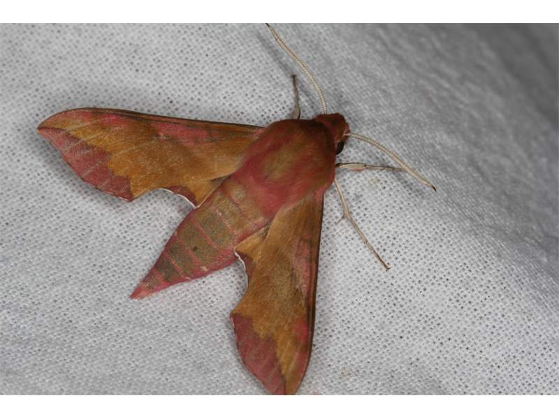 Größenvergleich: D. porcellus (Kleiner Weinschwärmer, unten) und D. elpenor (Mittlerer Weinschwärmer), am Licht - Westlausitz, Pulsnitz, Kahlschlag/Bachtal Hahneflüsschen, 5. Juni 2022