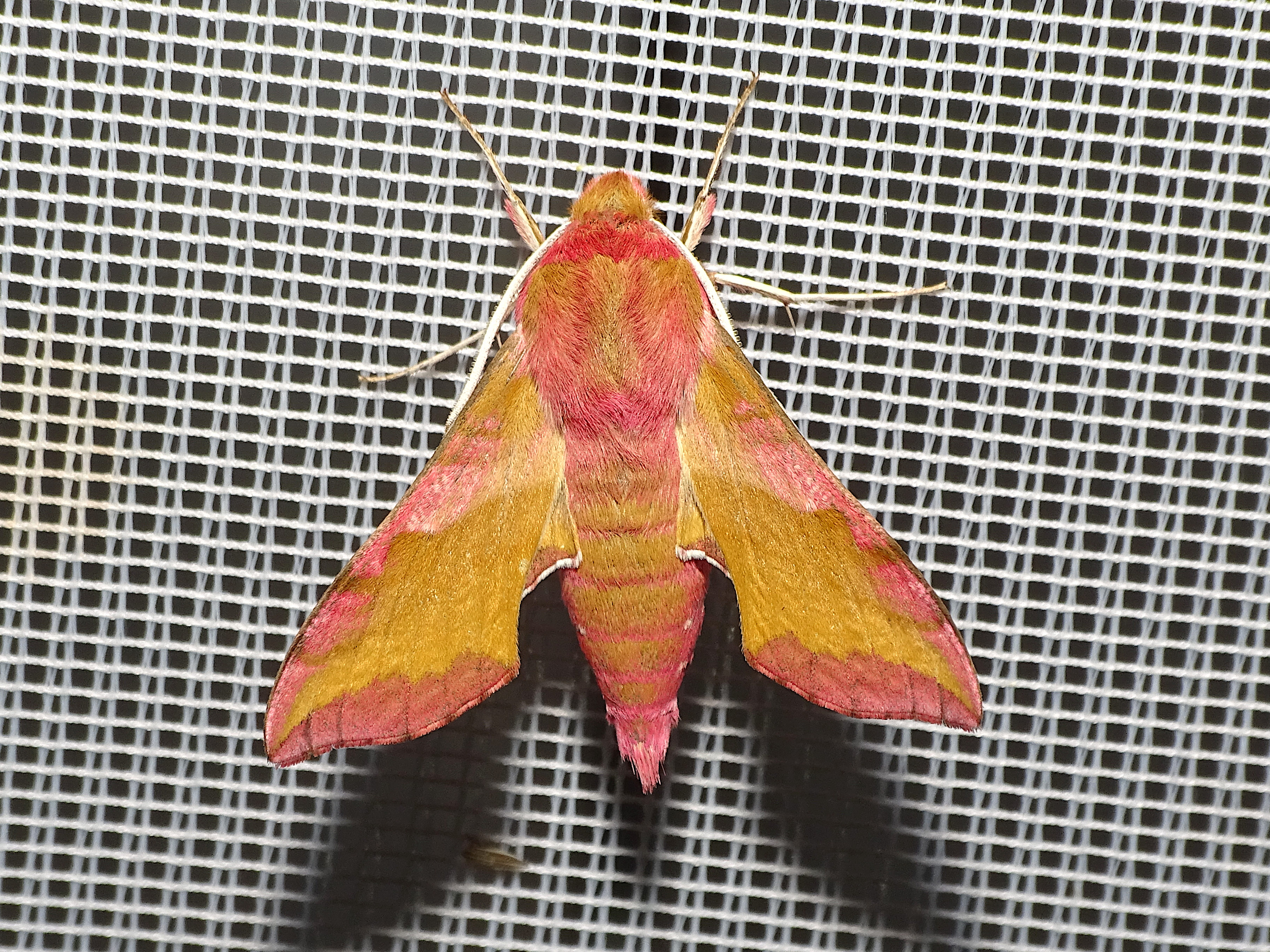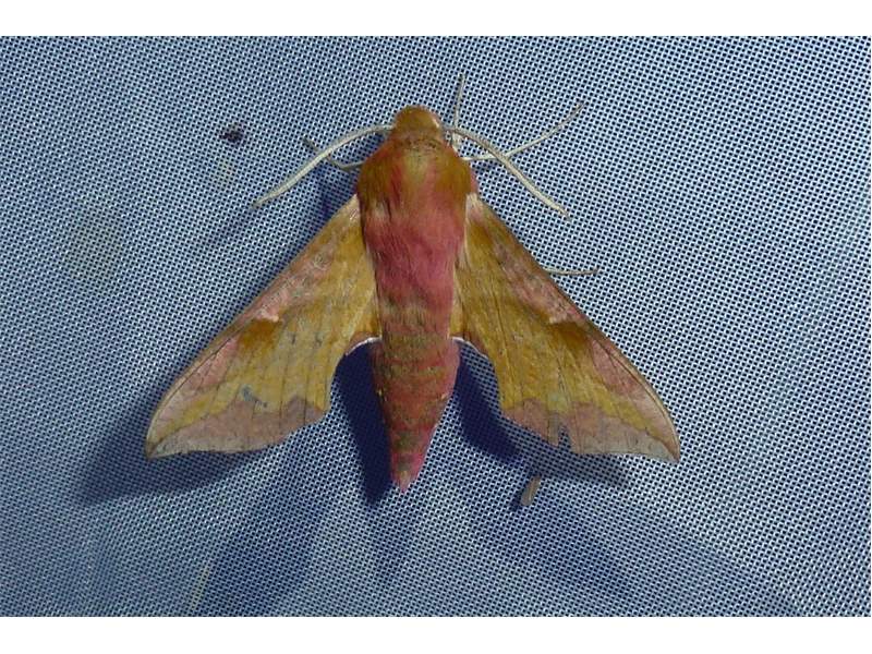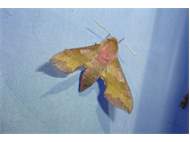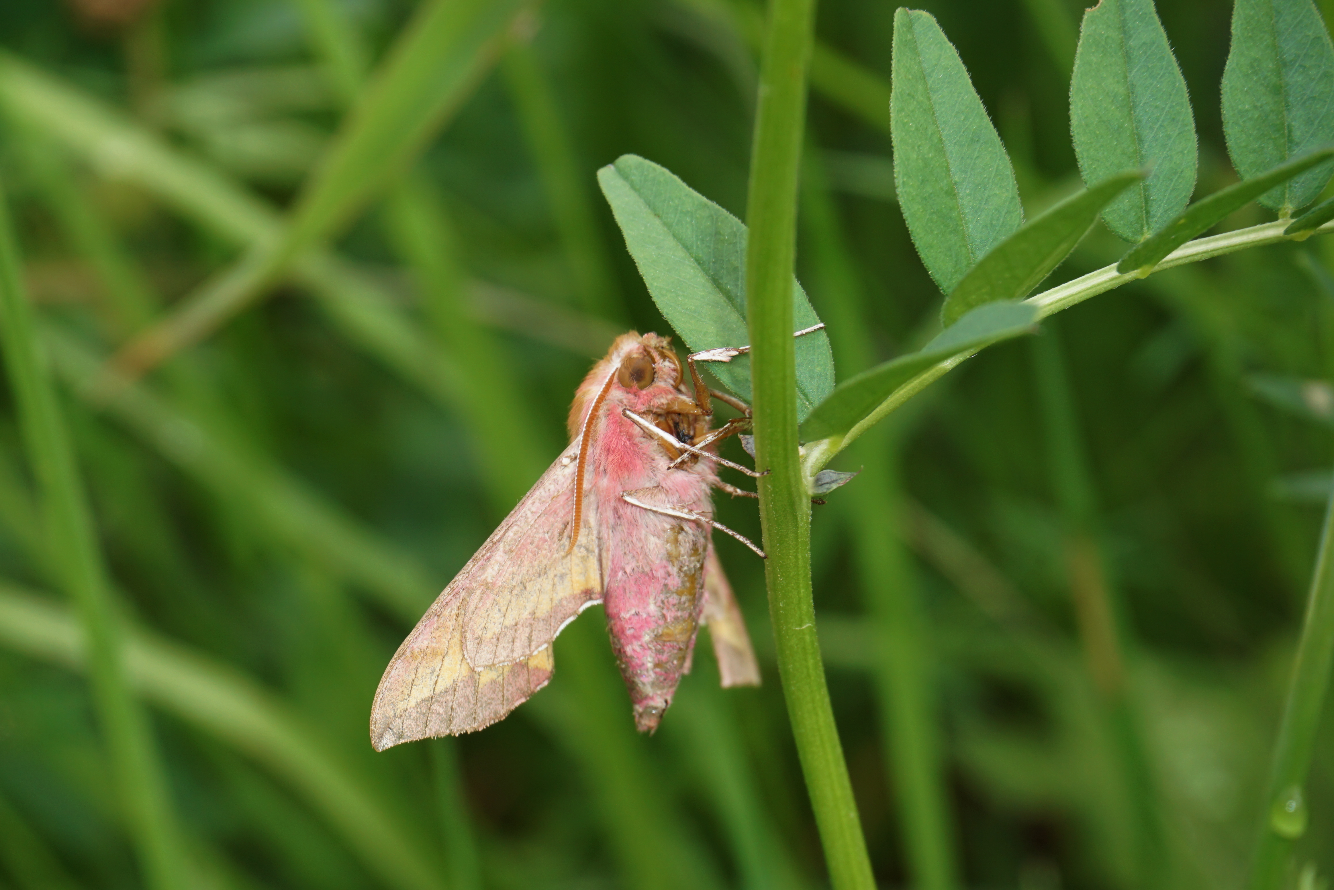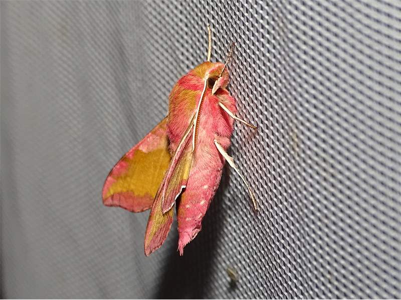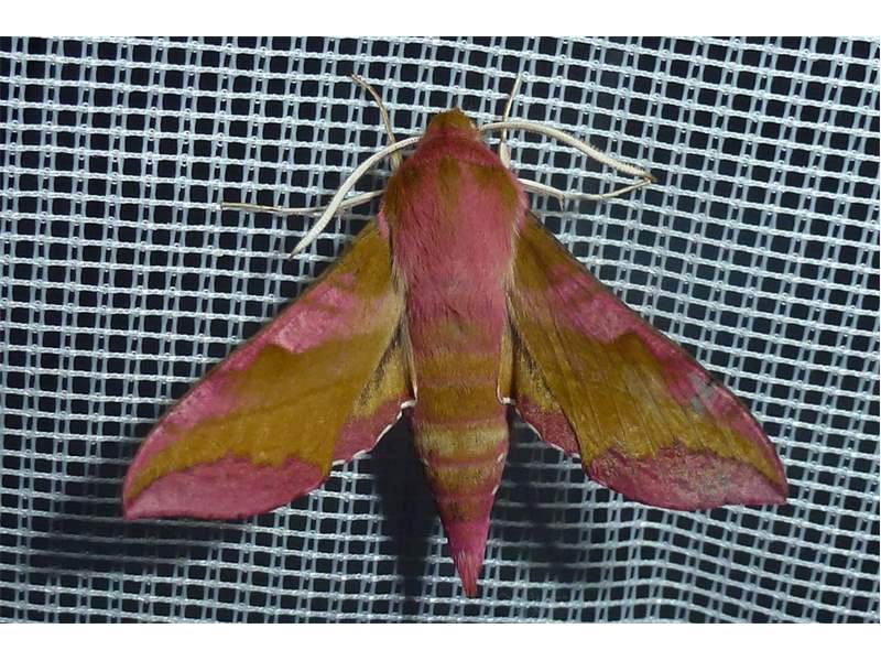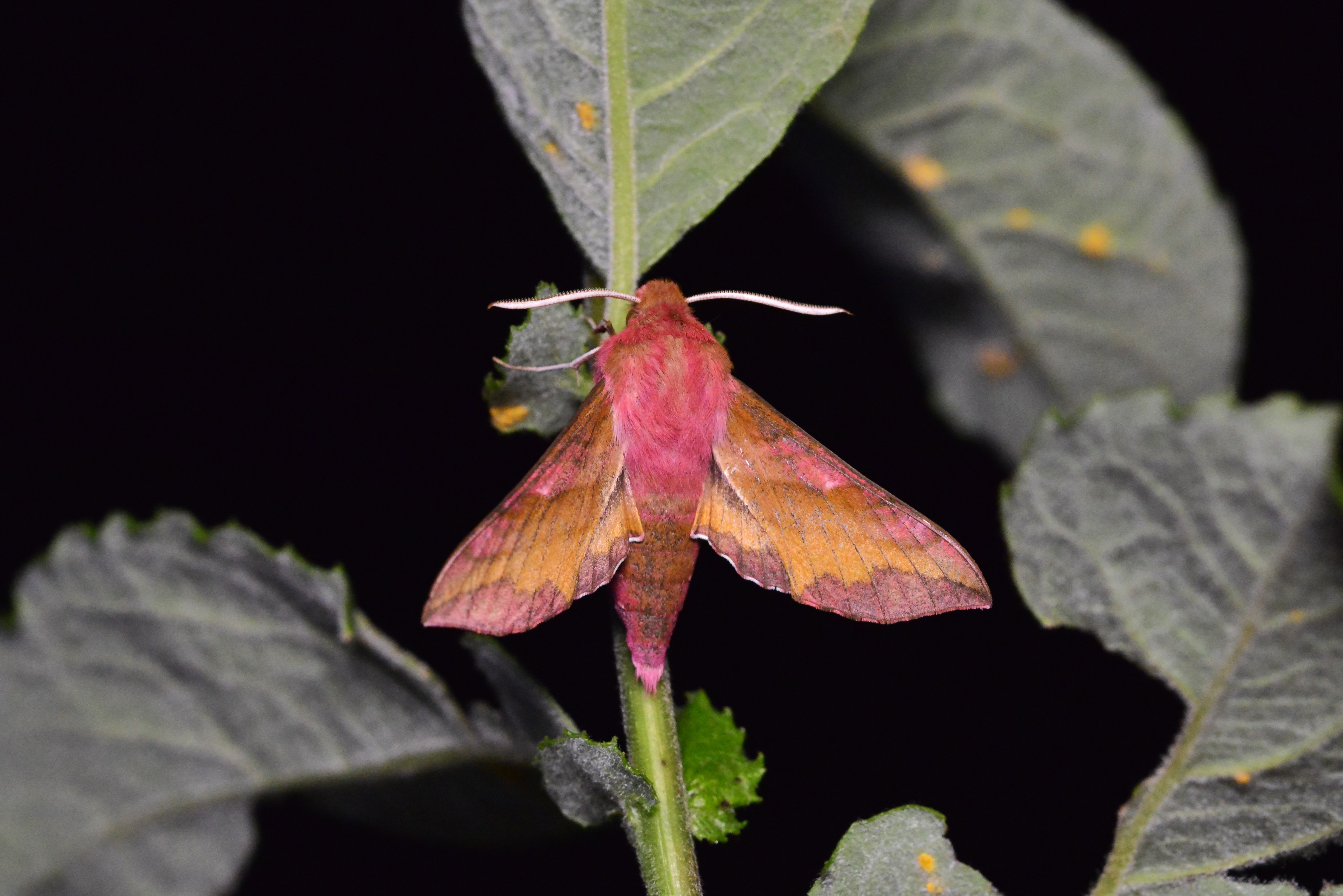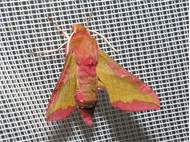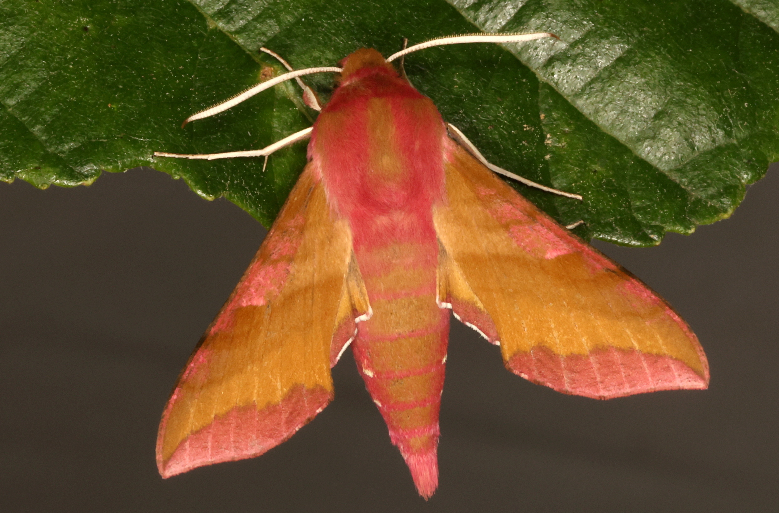 Größenvergleich: D. porcellus (Kleiner Weinschwärmer, unten) und D. elpenor (Mittlerer Weinschwärmer), am Licht - Westlausitz, Pulsnitz, Kahlschlag/Bachtal Hahneflüsschen, 5. Juni 2022