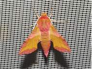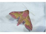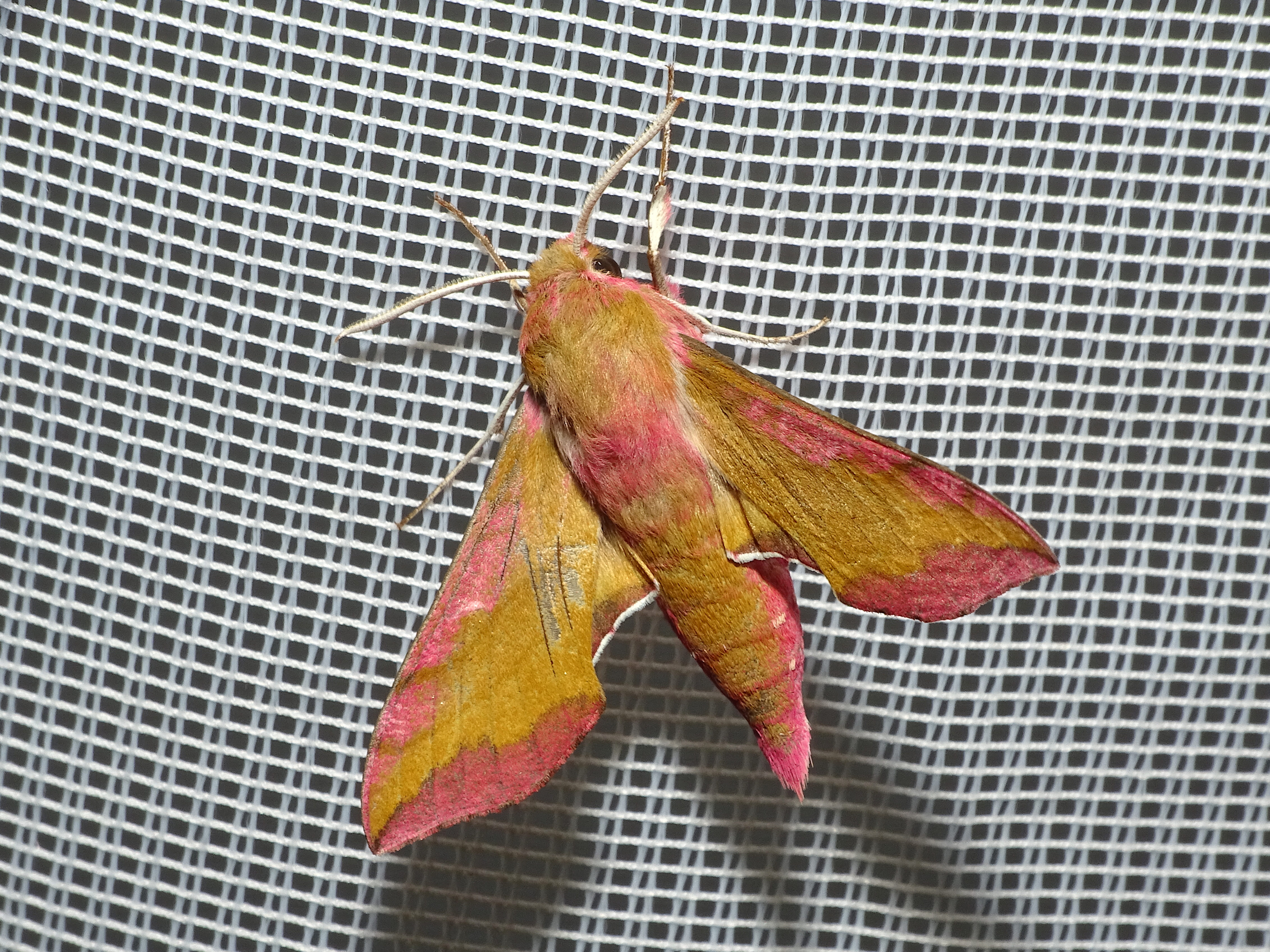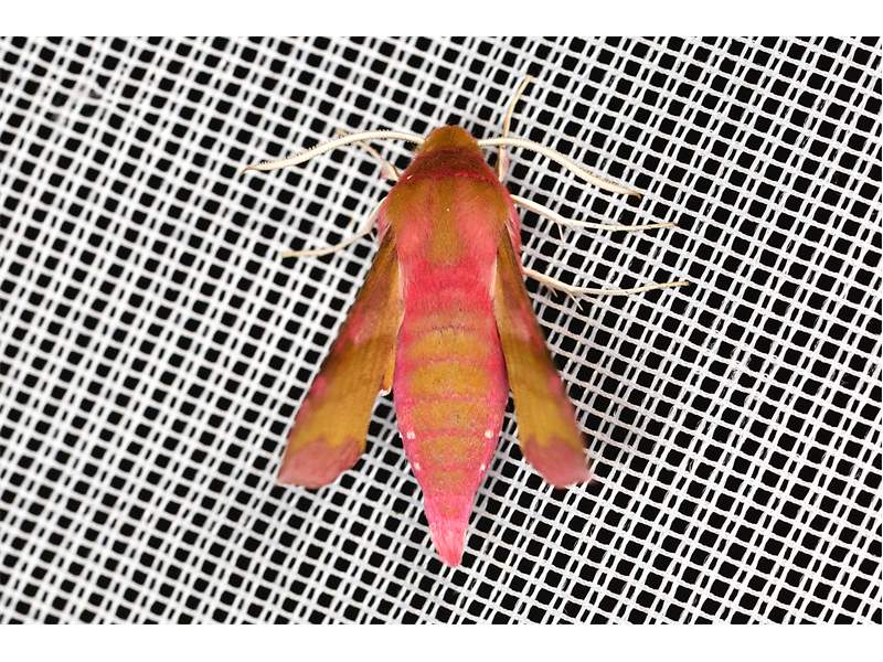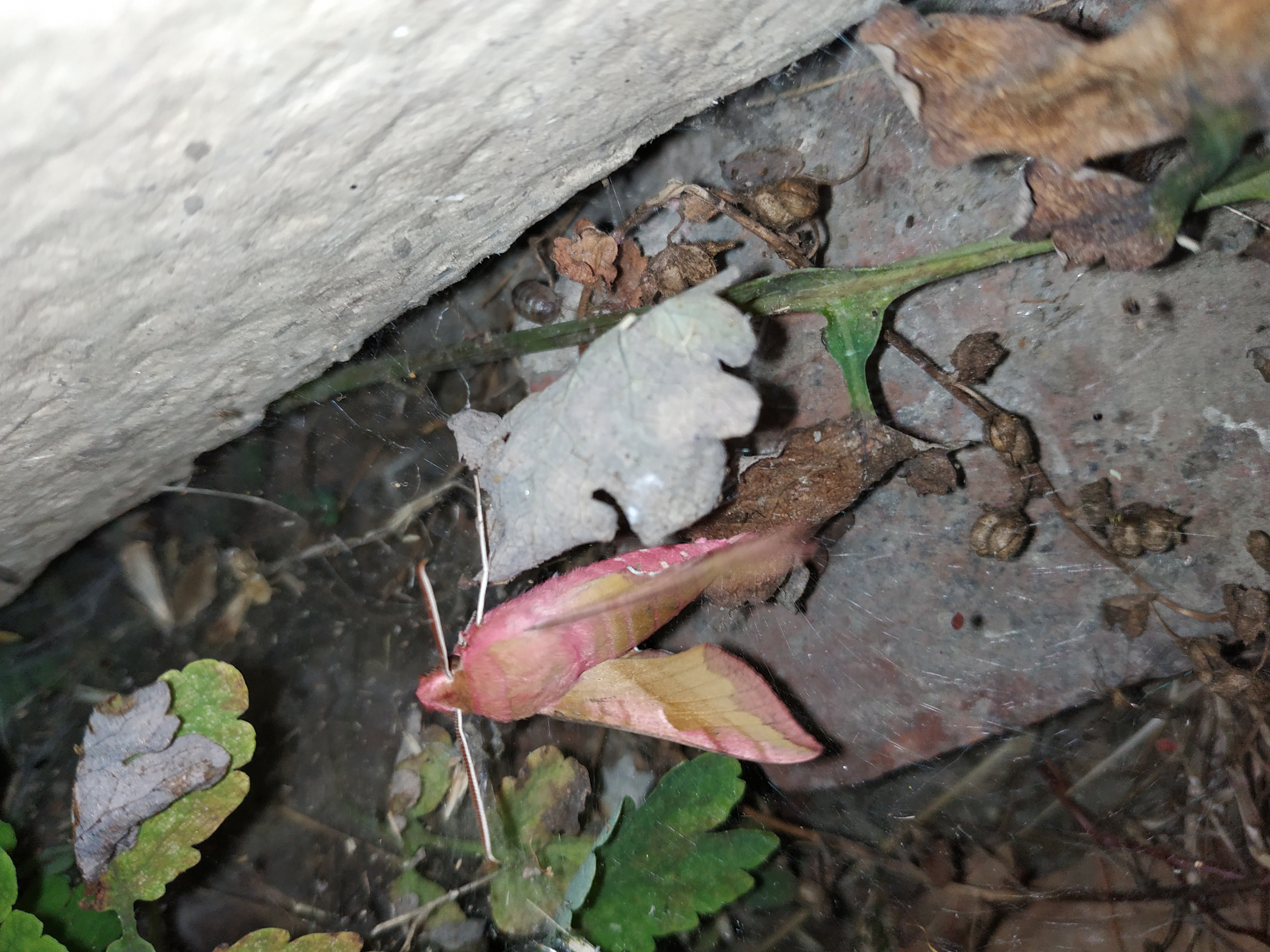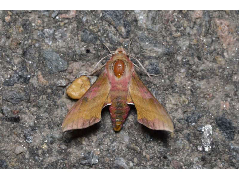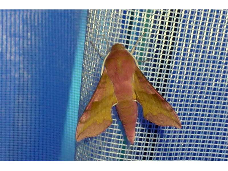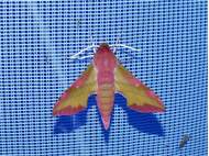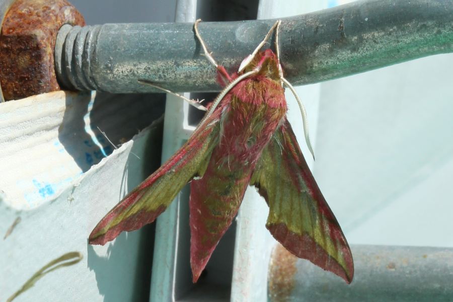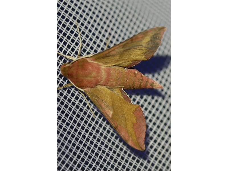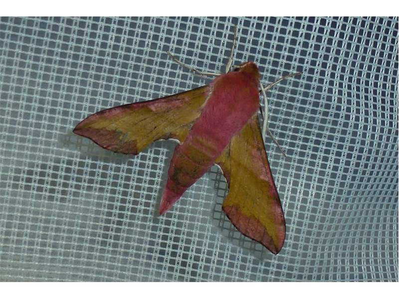 Größenvergleich: D. porcellus (Kleiner Weinschwärmer, unten) und D. elpenor (Mittlerer Weinschwärmer), am Licht - Westlausitz, Pulsnitz, Kahlschlag/Bachtal Hahneflüsschen, 5. Juni 2022