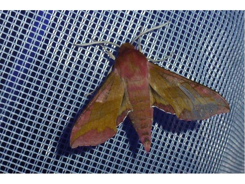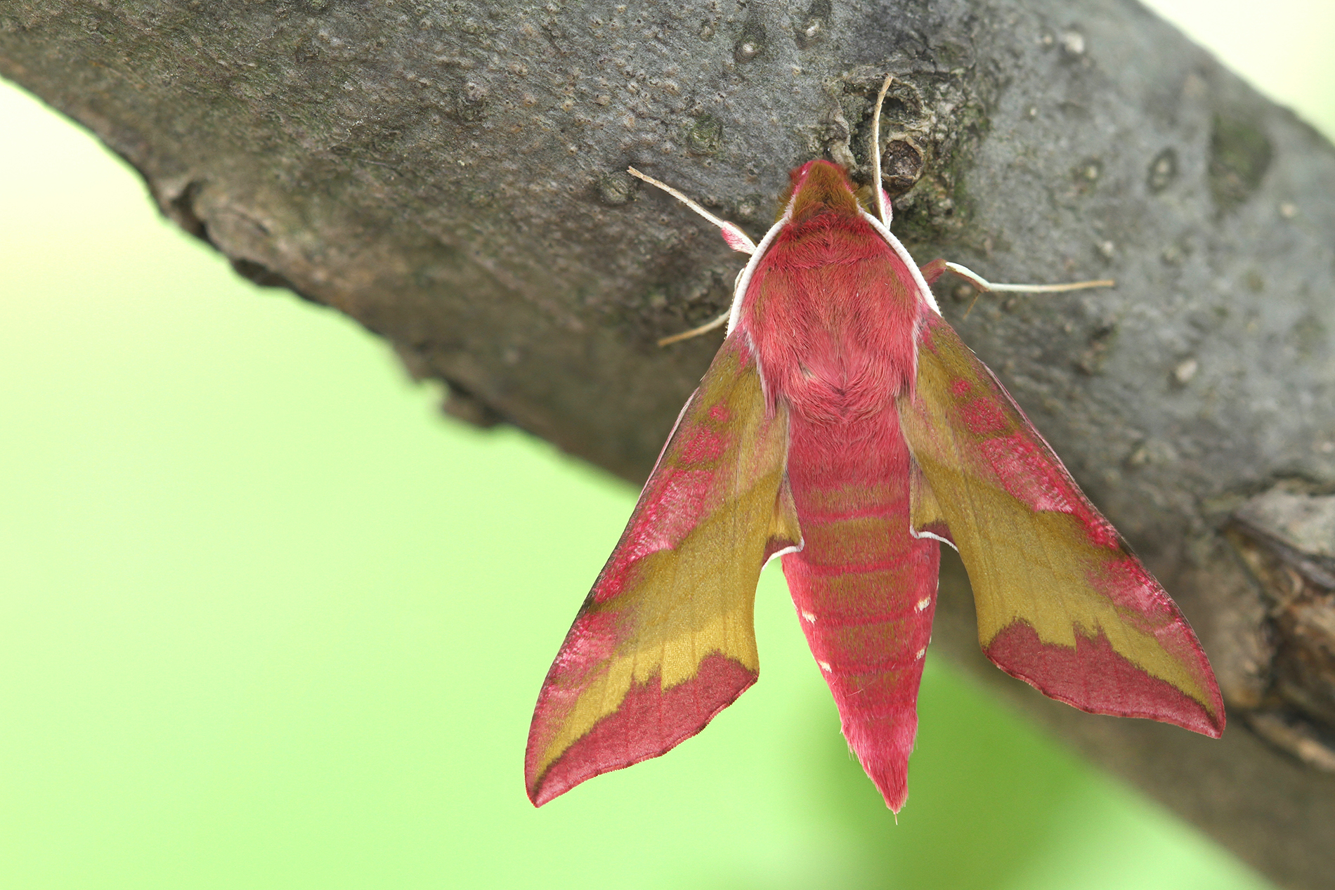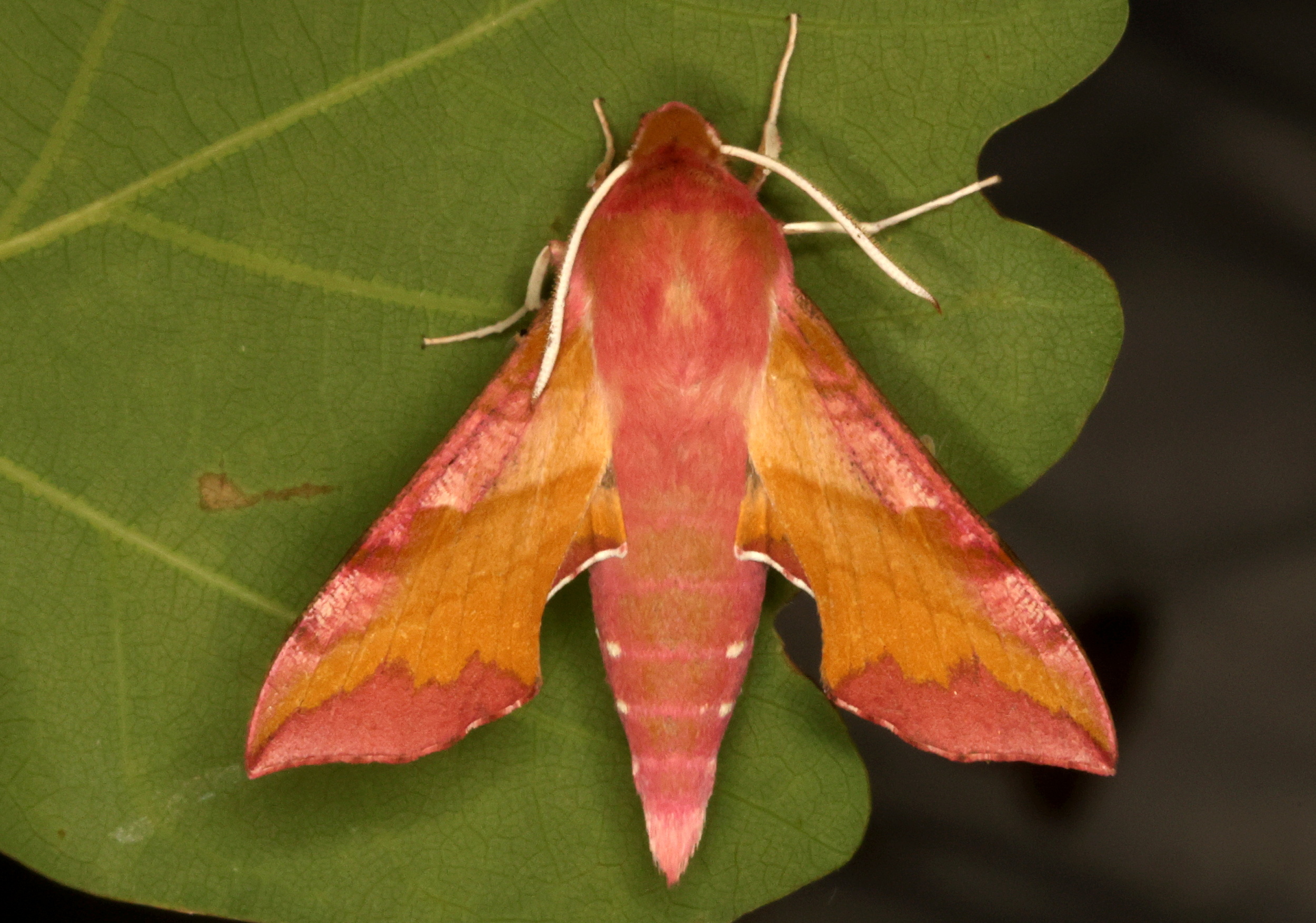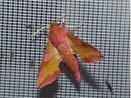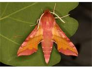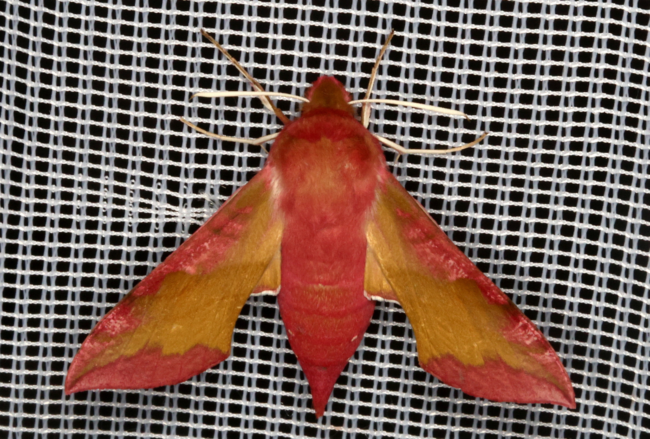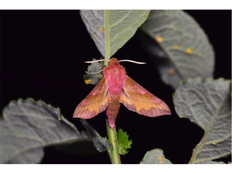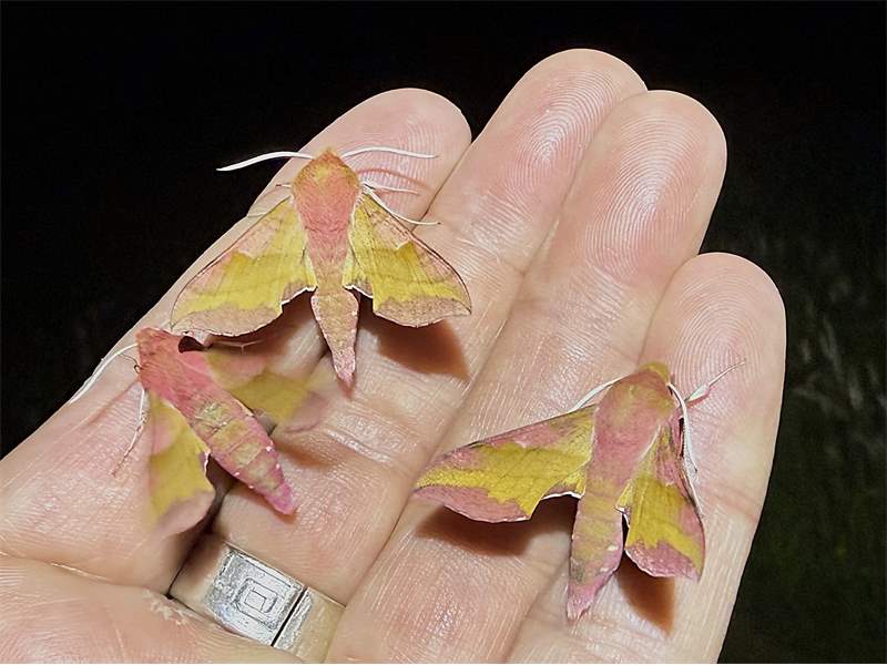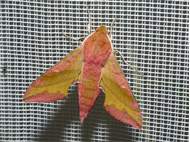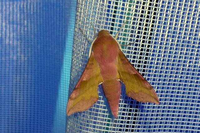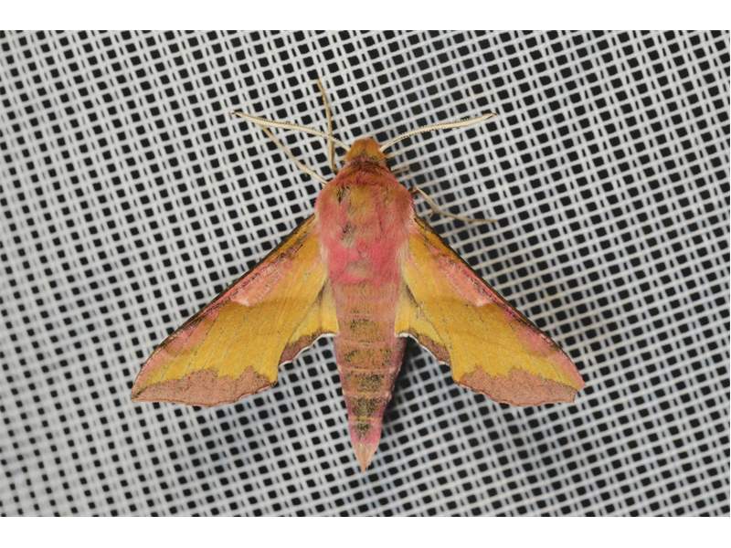 Größenvergleich: D. porcellus (Kleiner Weinschwärmer, unten) und D. elpenor (Mittlerer Weinschwärmer), am Licht - Westlausitz, Pulsnitz, Kahlschlag/Bachtal Hahneflüsschen, 5. Juni 2022