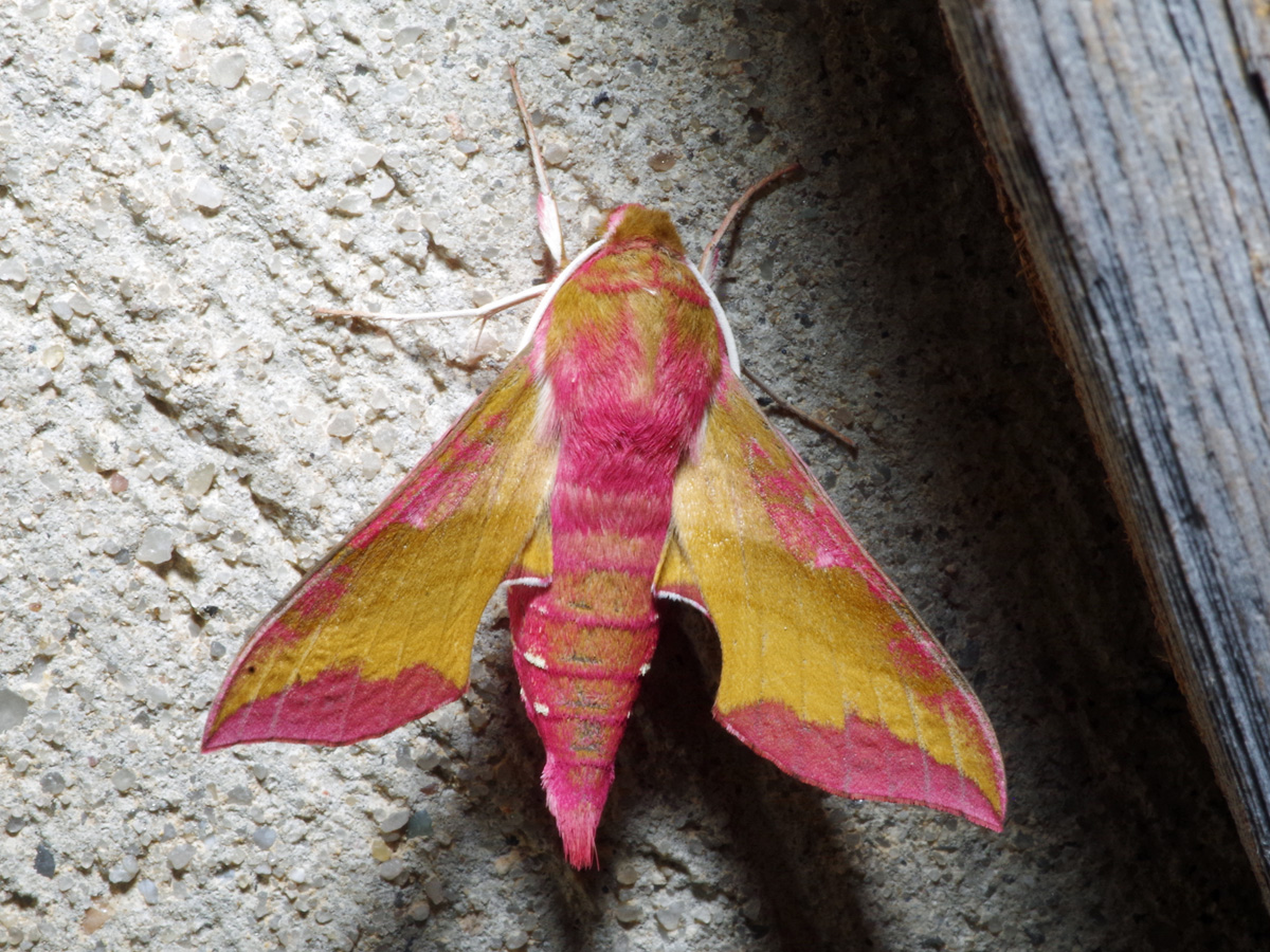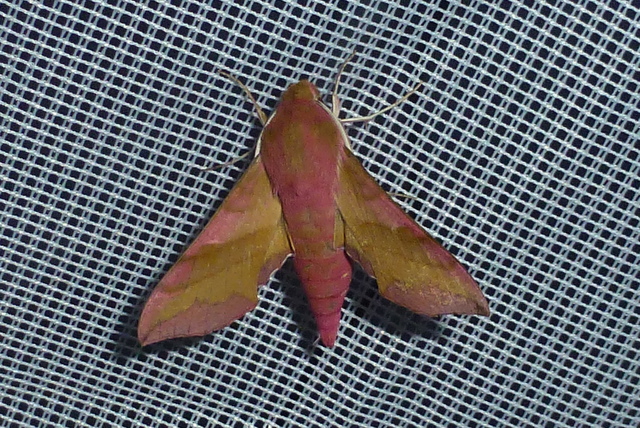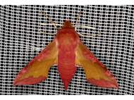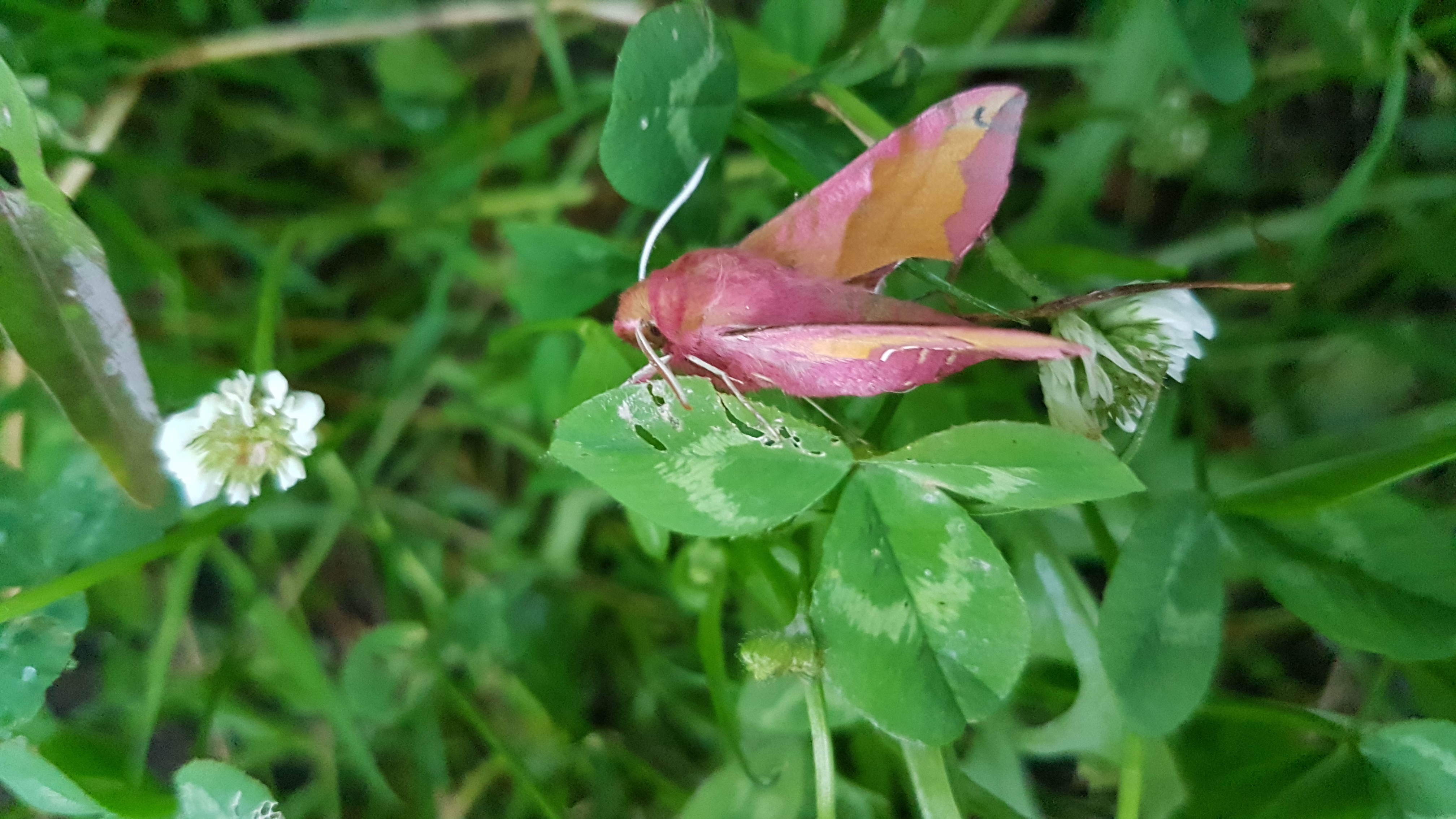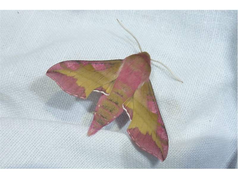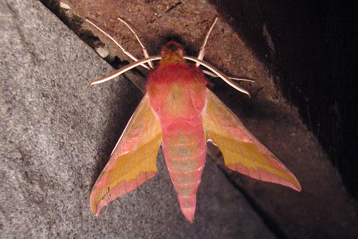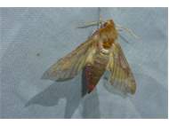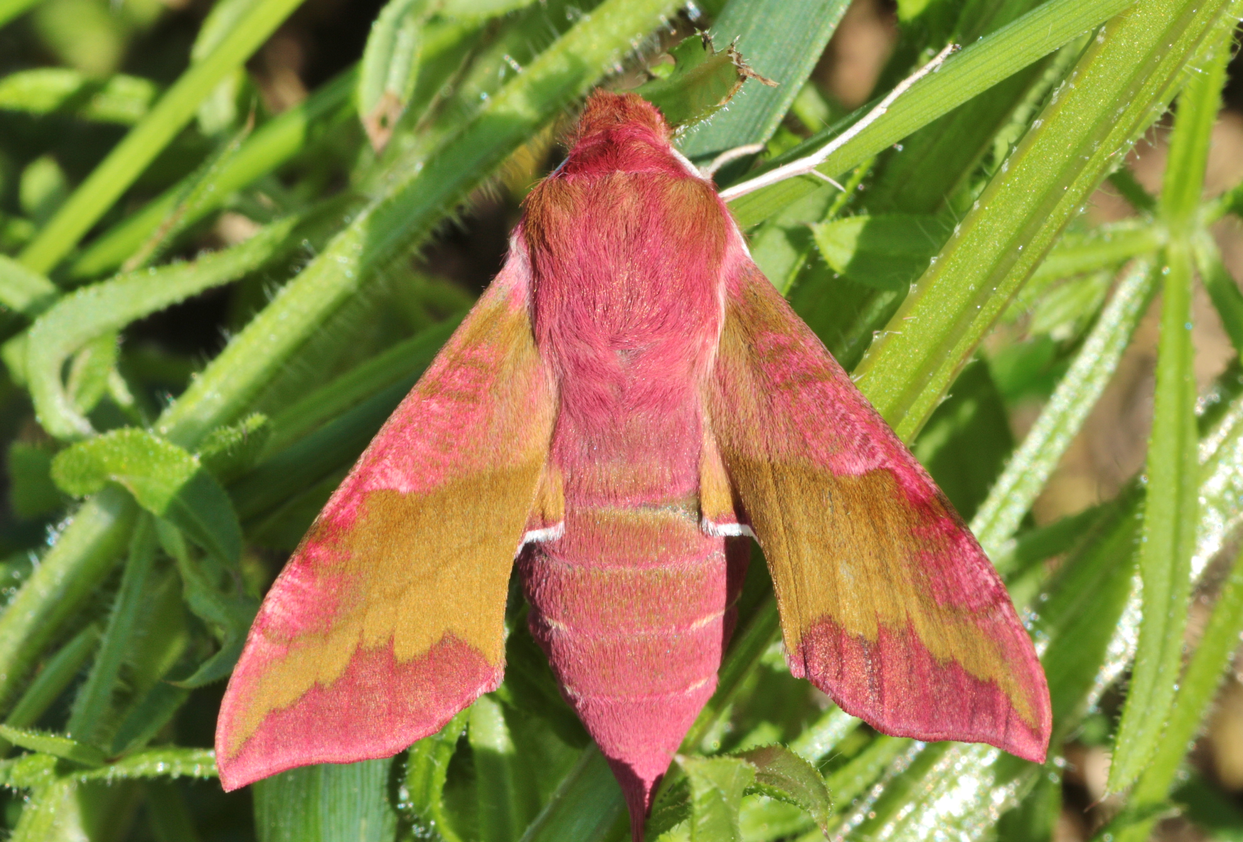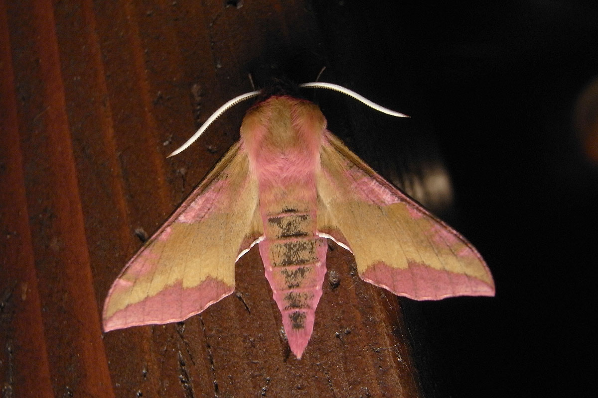 Größenvergleich: D. porcellus (Kleiner Weinschwärmer, unten) und D. elpenor (Mittlerer Weinschwärmer), am Licht - Westlausitz, Pulsnitz, Kahlschlag/Bachtal Hahneflüsschen, 5. Juni 2022
