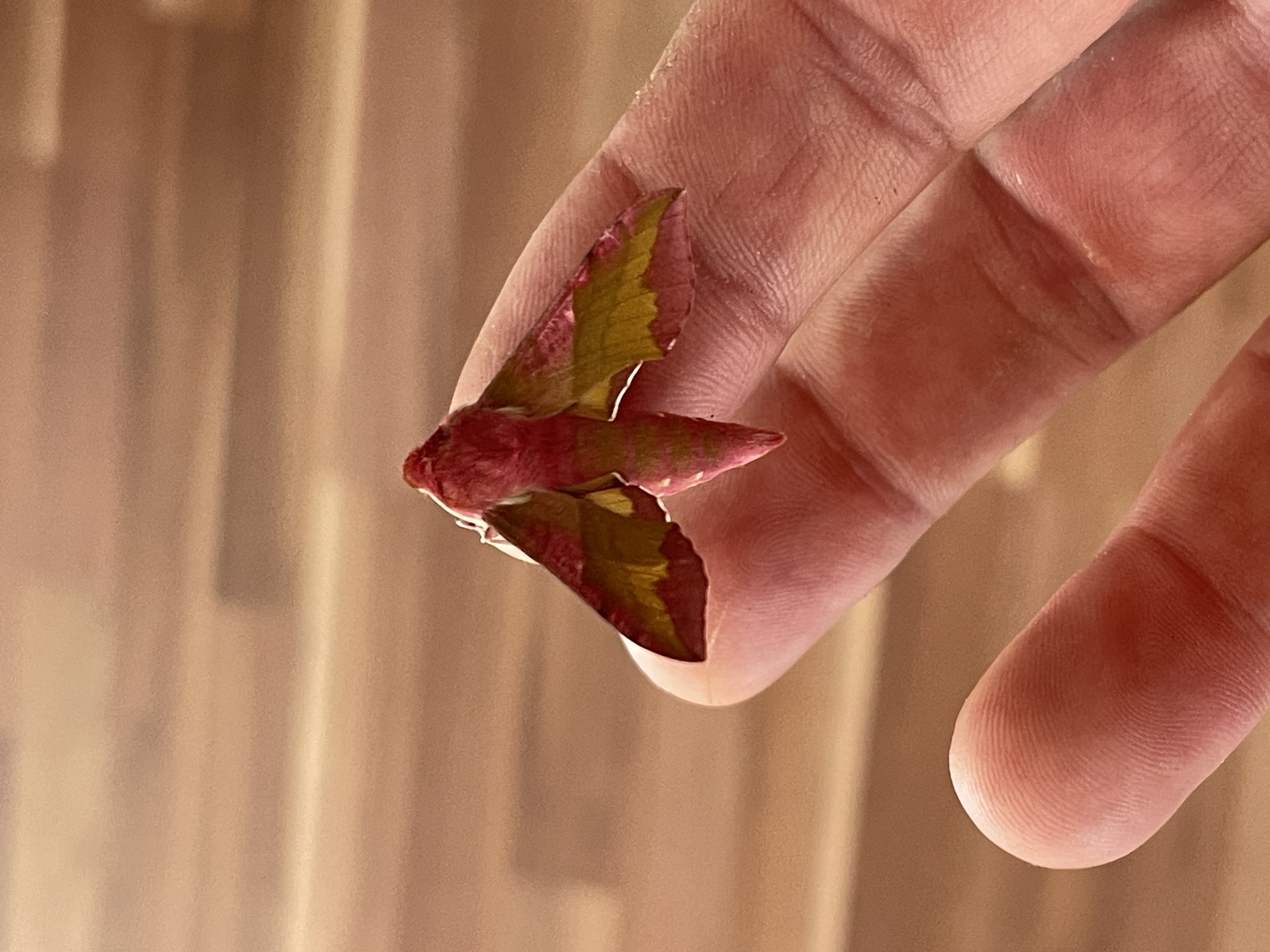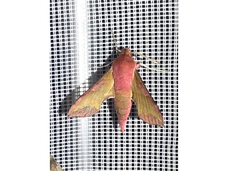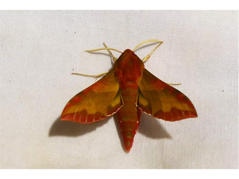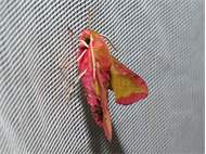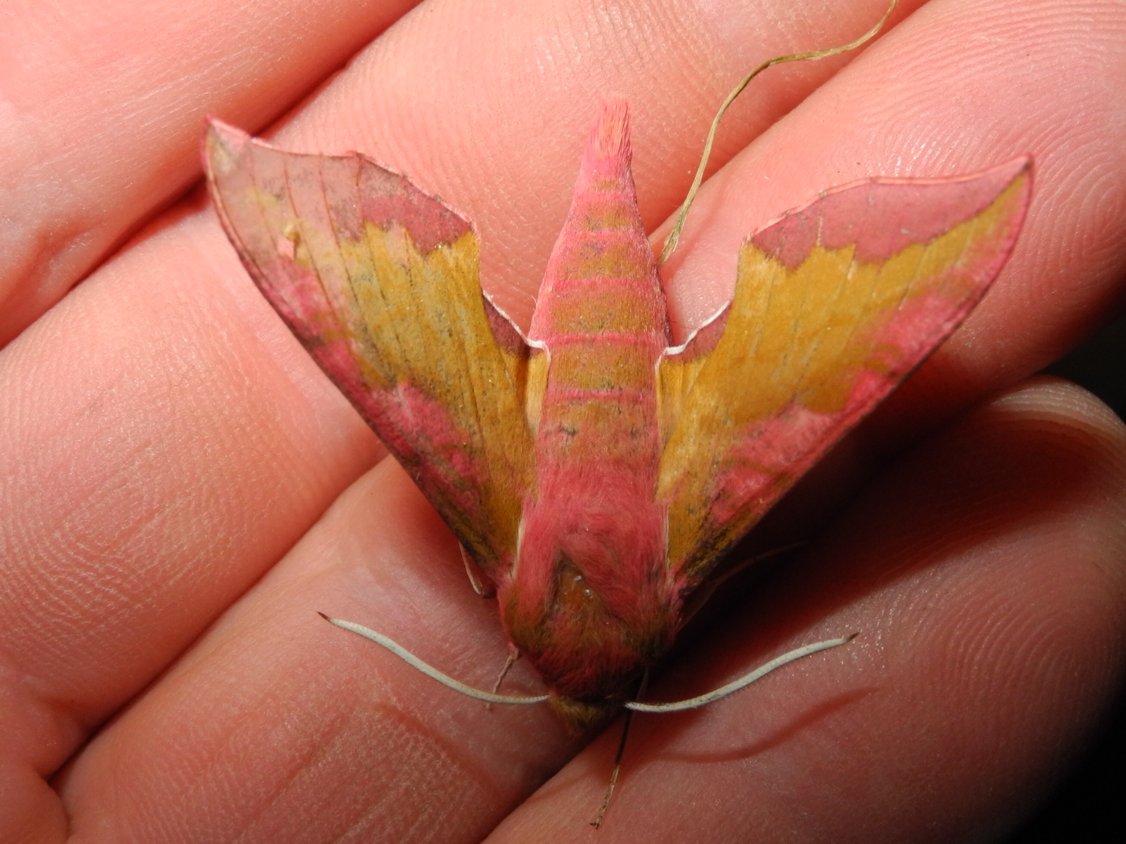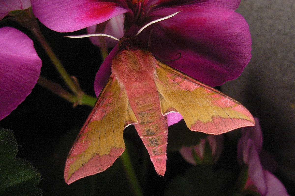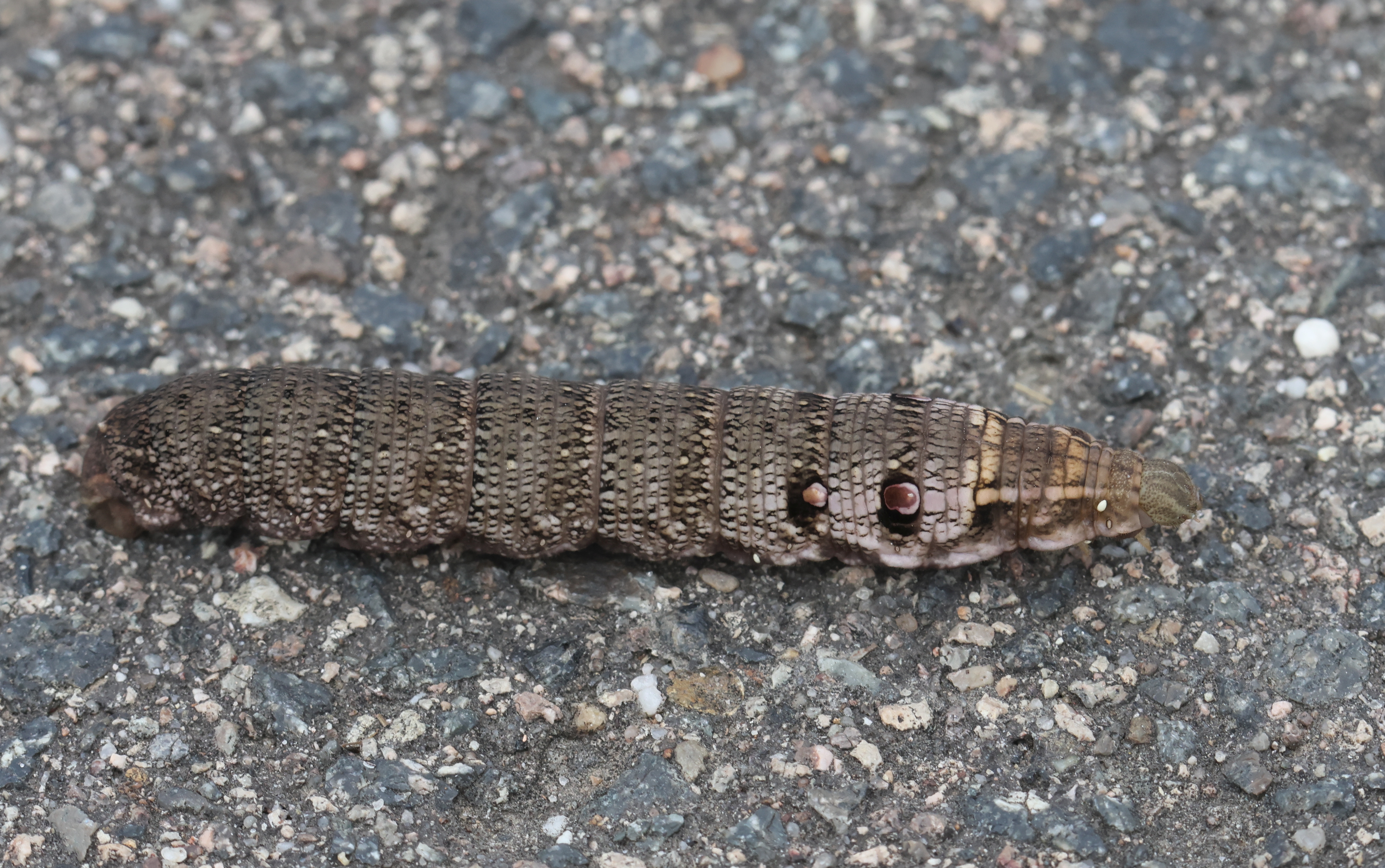 Größenvergleich: D. porcellus (Kleiner Weinschwärmer, unten) und D. elpenor (Mittlerer Weinschwärmer), am Licht - Westlausitz, Pulsnitz, Kahlschlag/Bachtal Hahneflüsschen, 5. Juni 2022