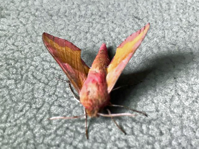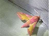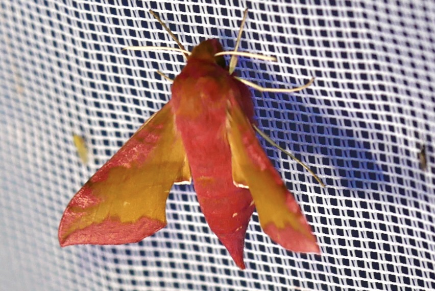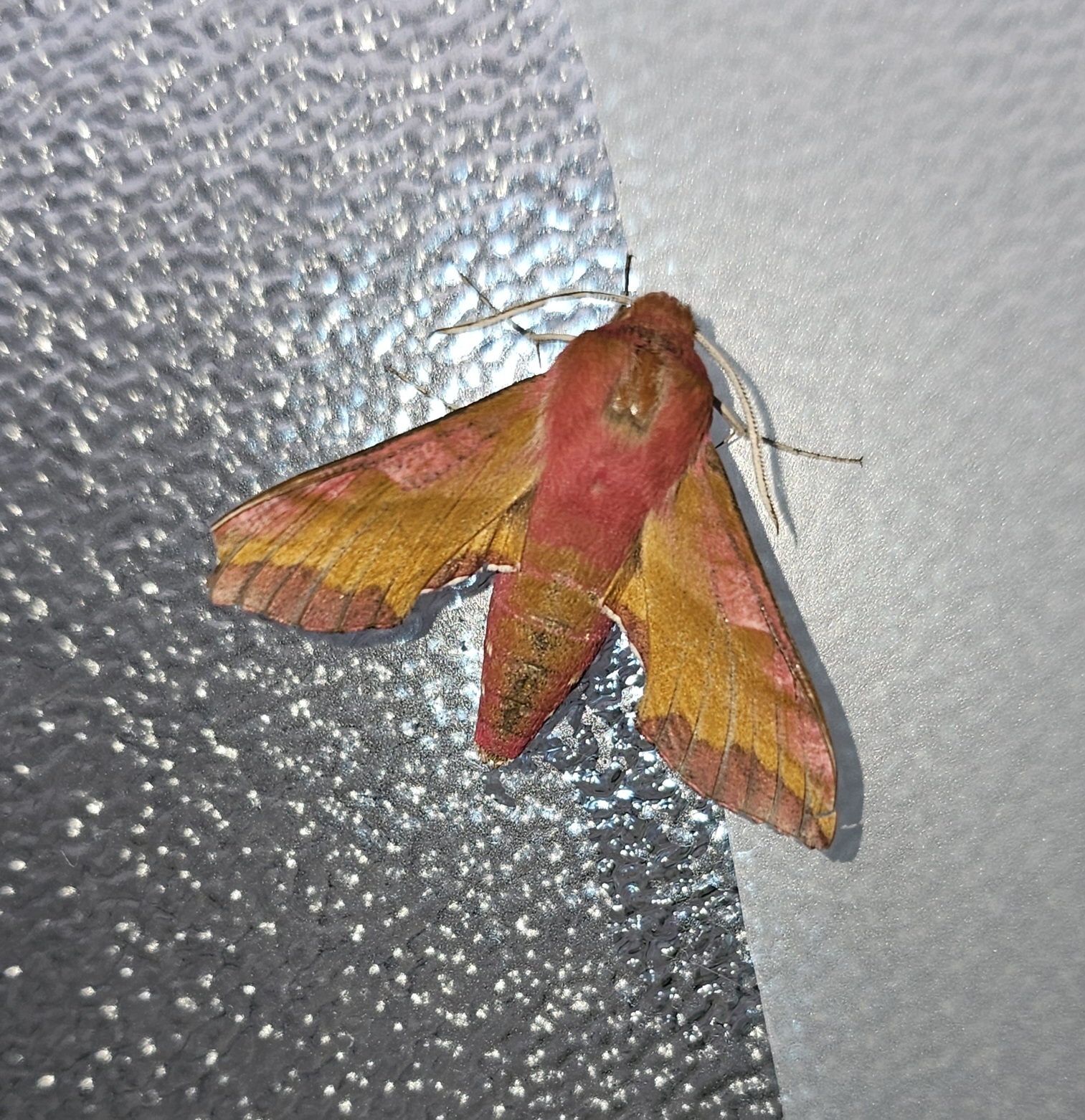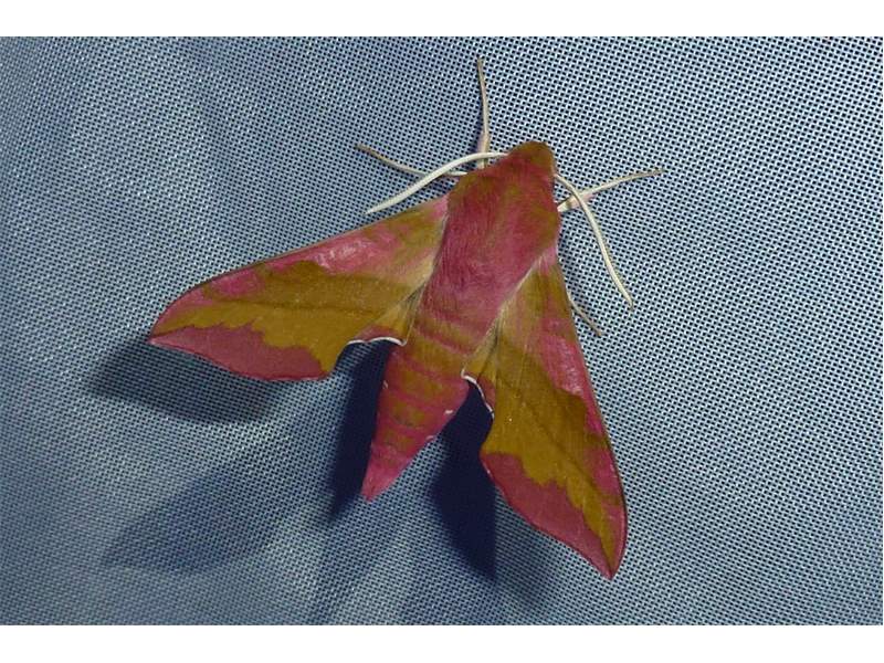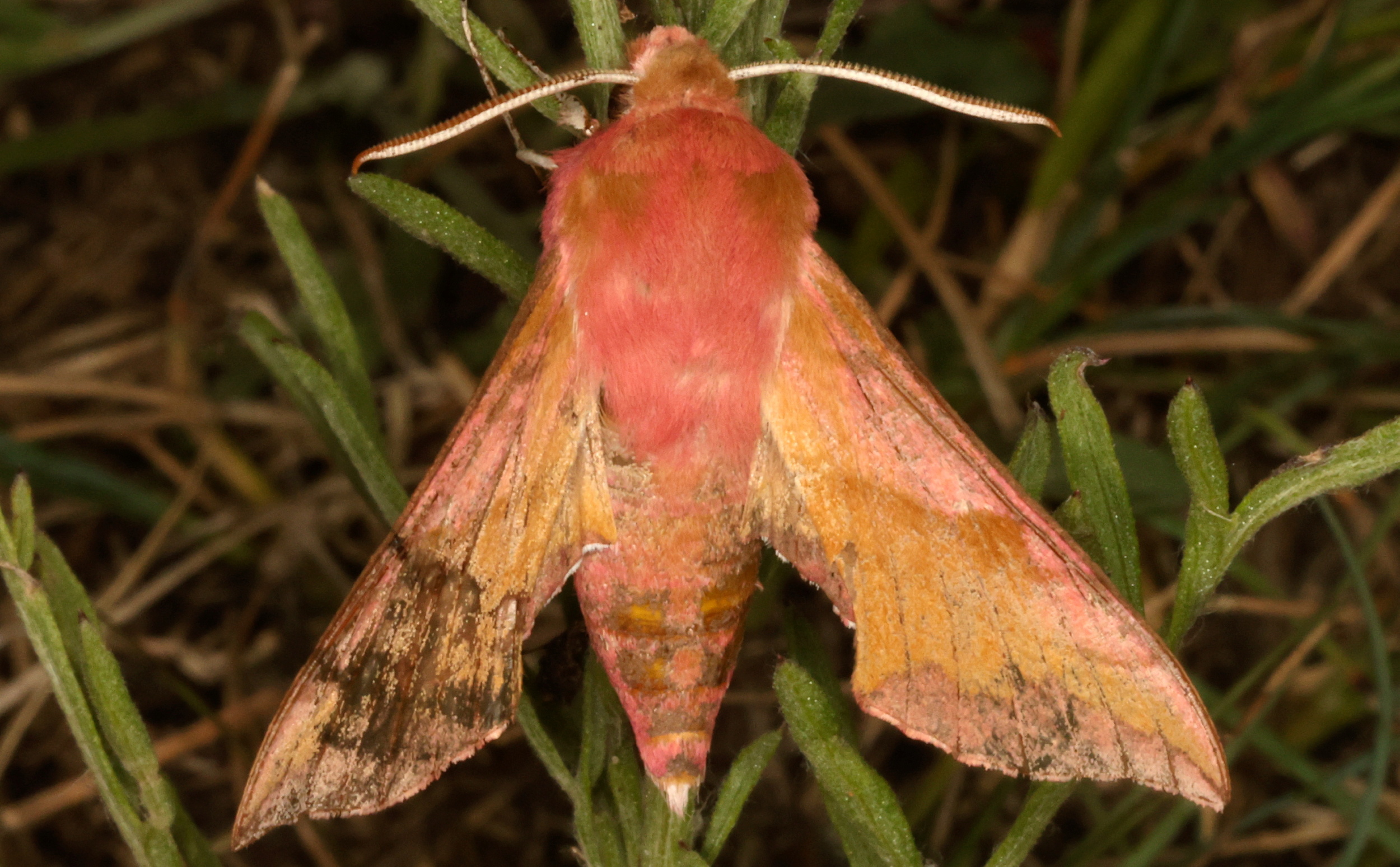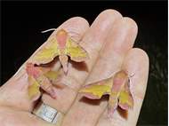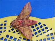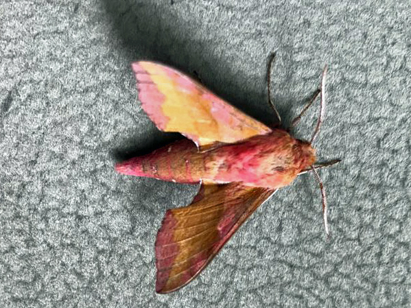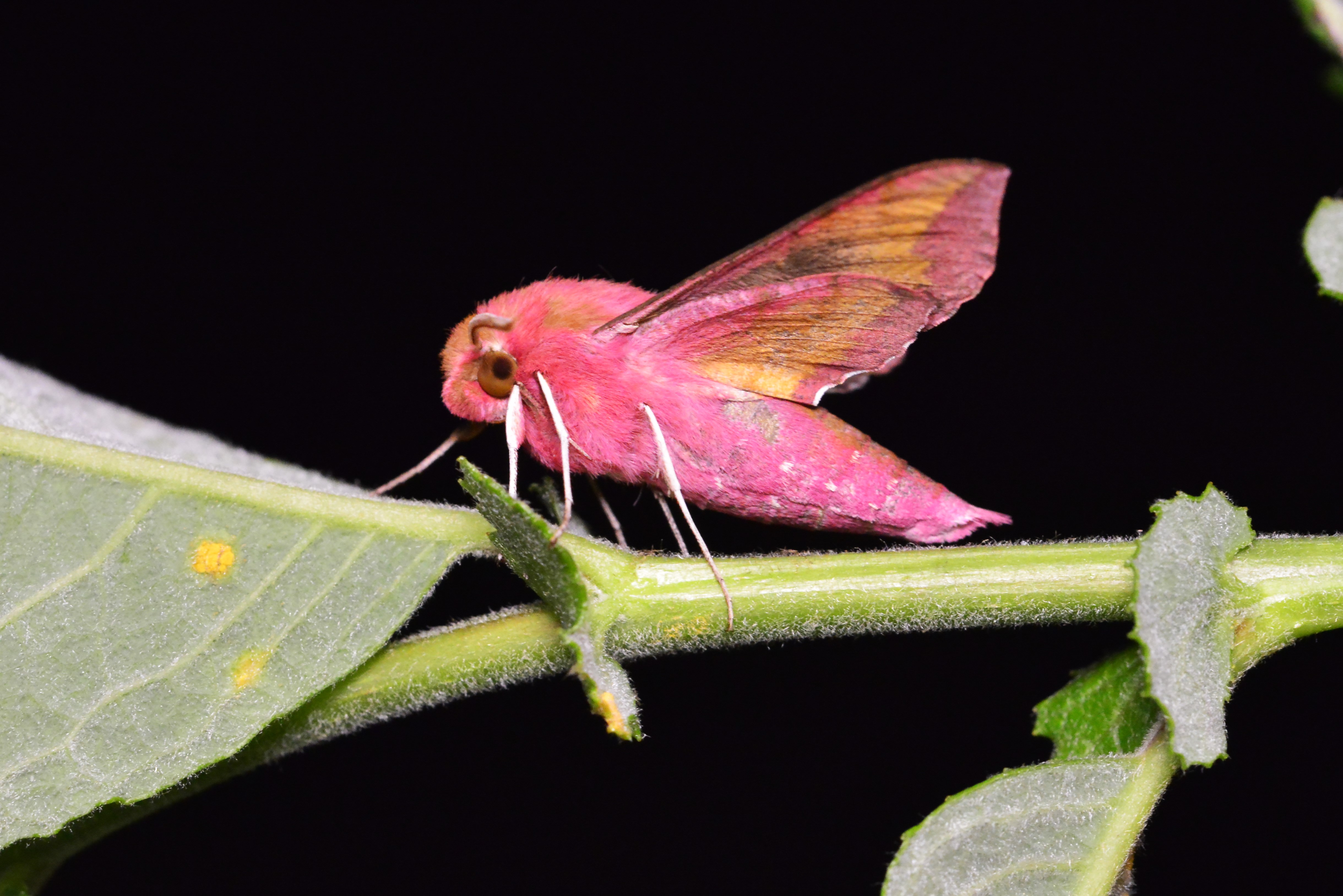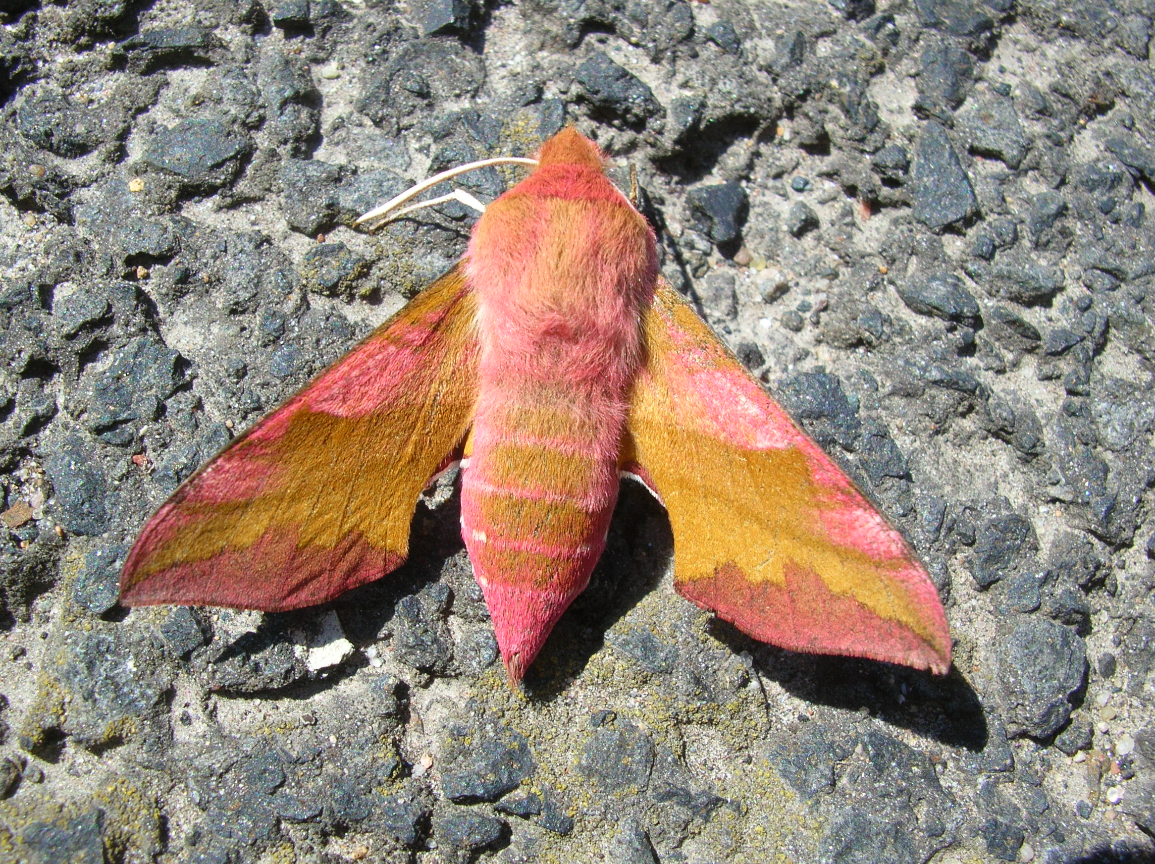 Größenvergleich: D. porcellus (Kleiner Weinschwärmer, unten) und D. elpenor (Mittlerer Weinschwärmer), am Licht - Westlausitz, Pulsnitz, Kahlschlag/Bachtal Hahneflüsschen, 5. Juni 2022