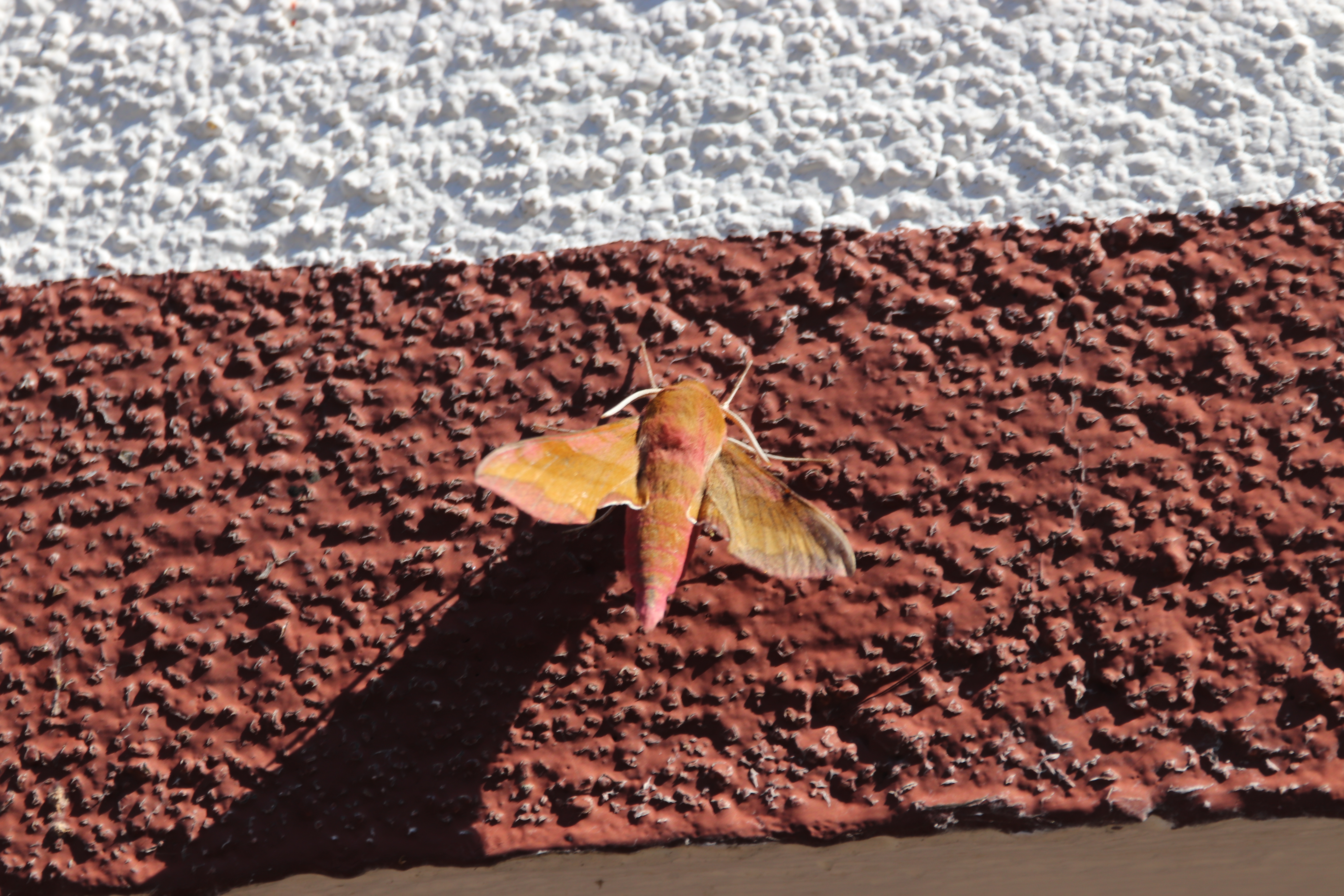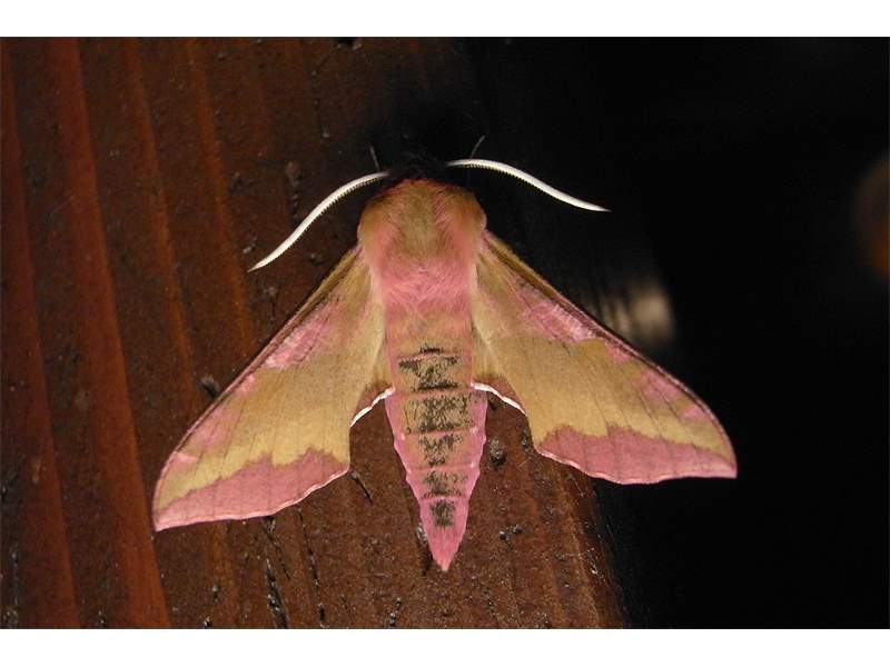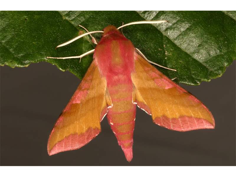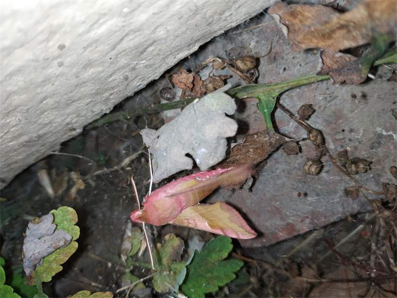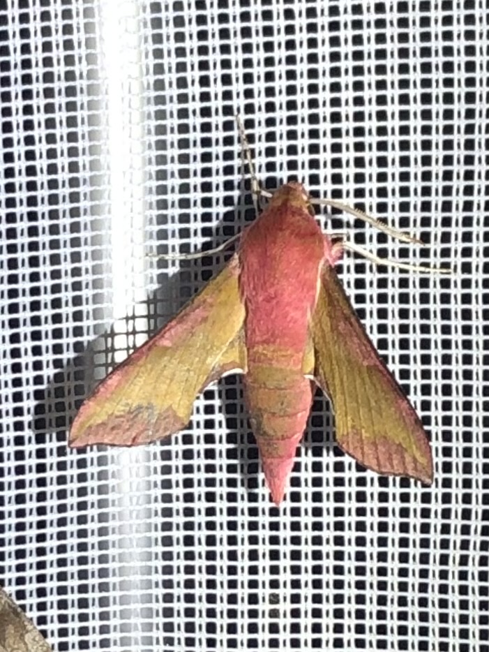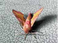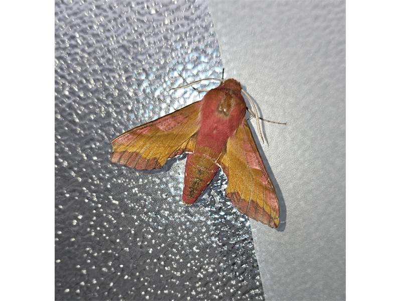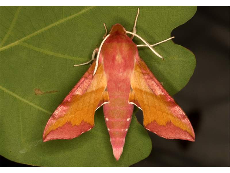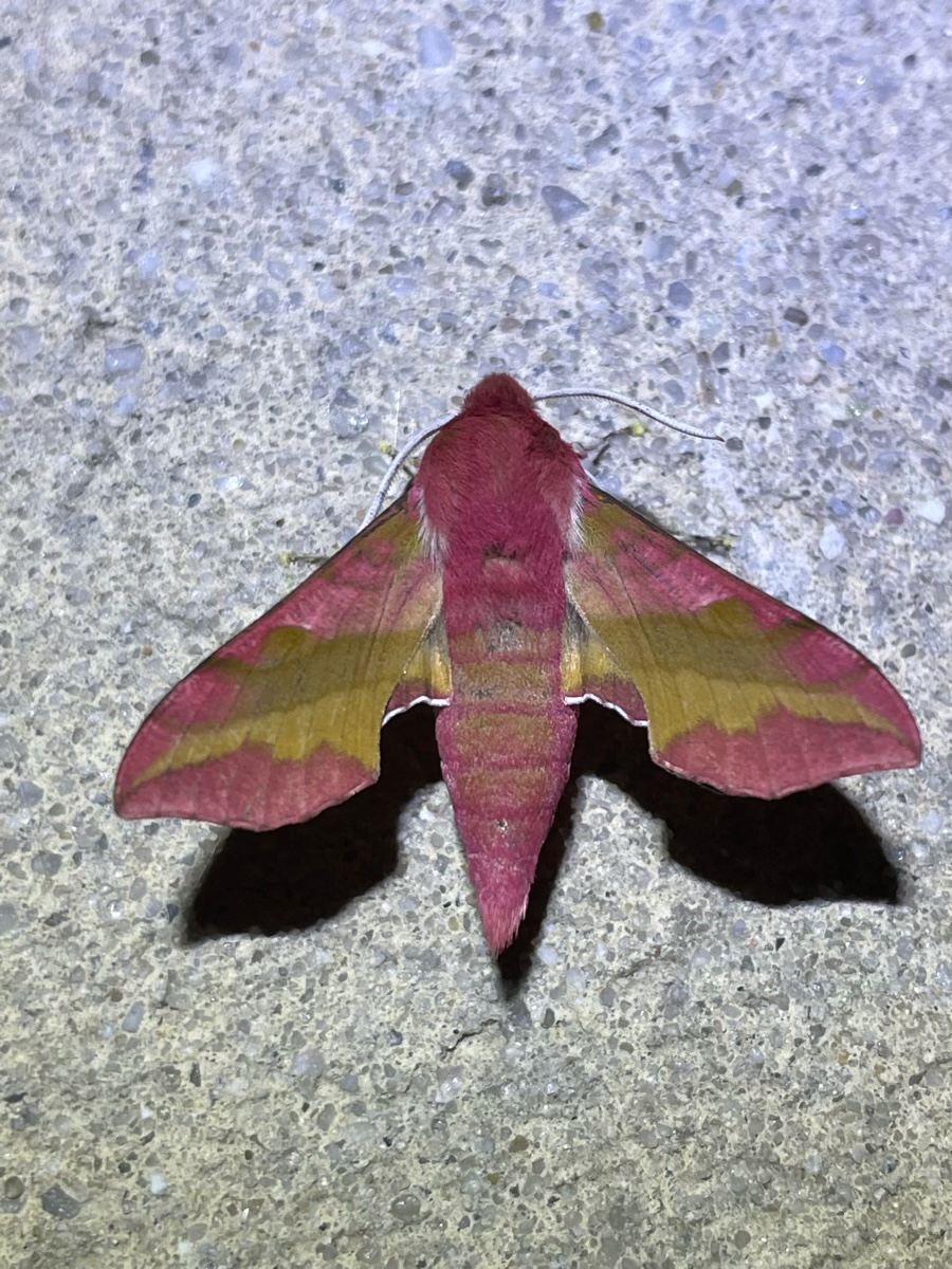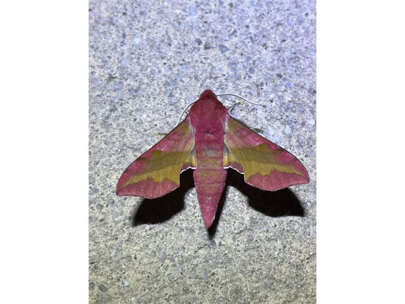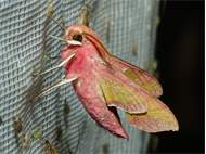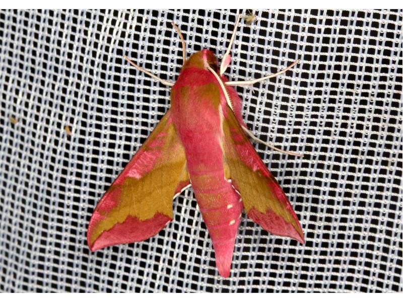 Größenvergleich: D. porcellus (Kleiner Weinschwärmer, unten) und D. elpenor (Mittlerer Weinschwärmer), am Licht - Westlausitz, Pulsnitz, Kahlschlag/Bachtal Hahneflüsschen, 5. Juni 2022