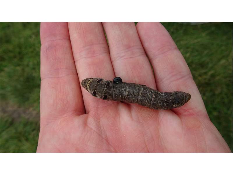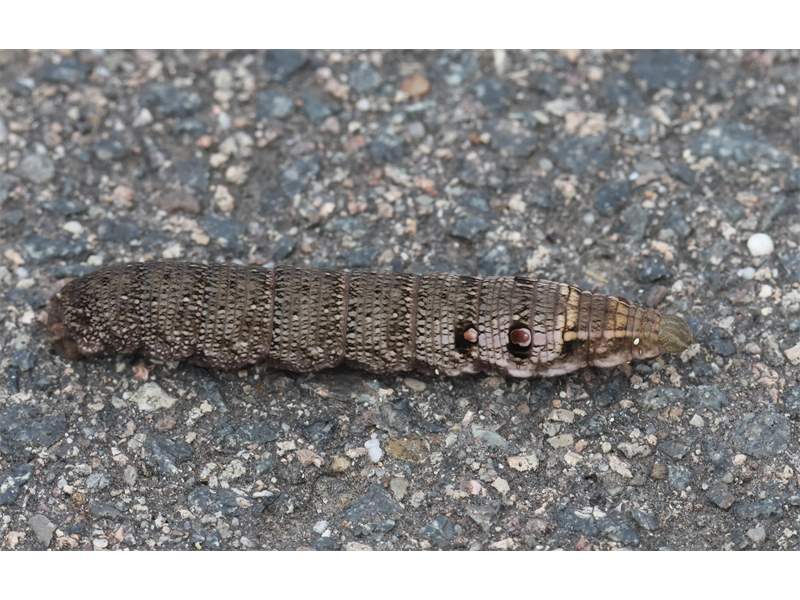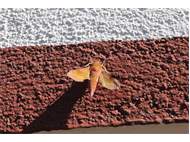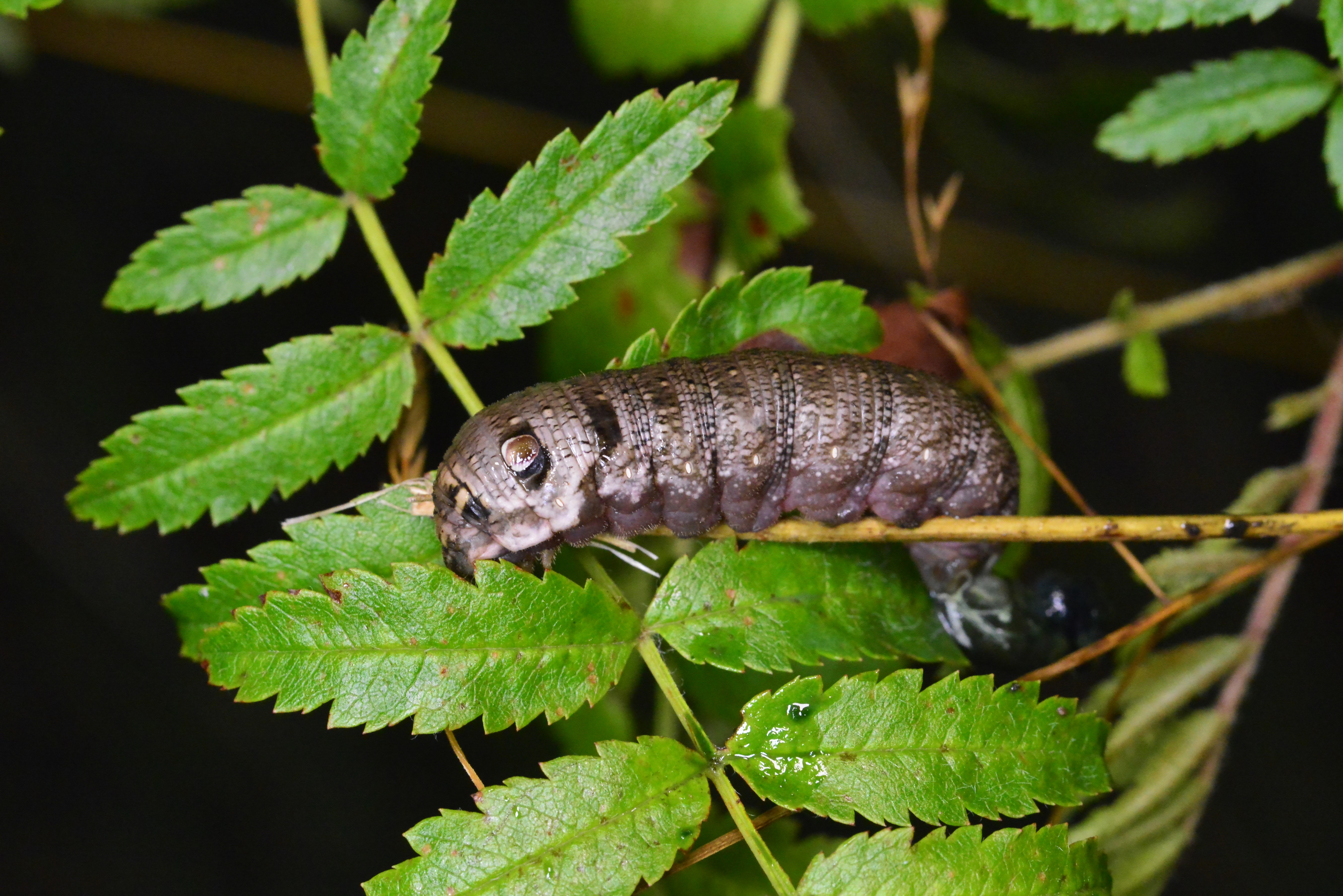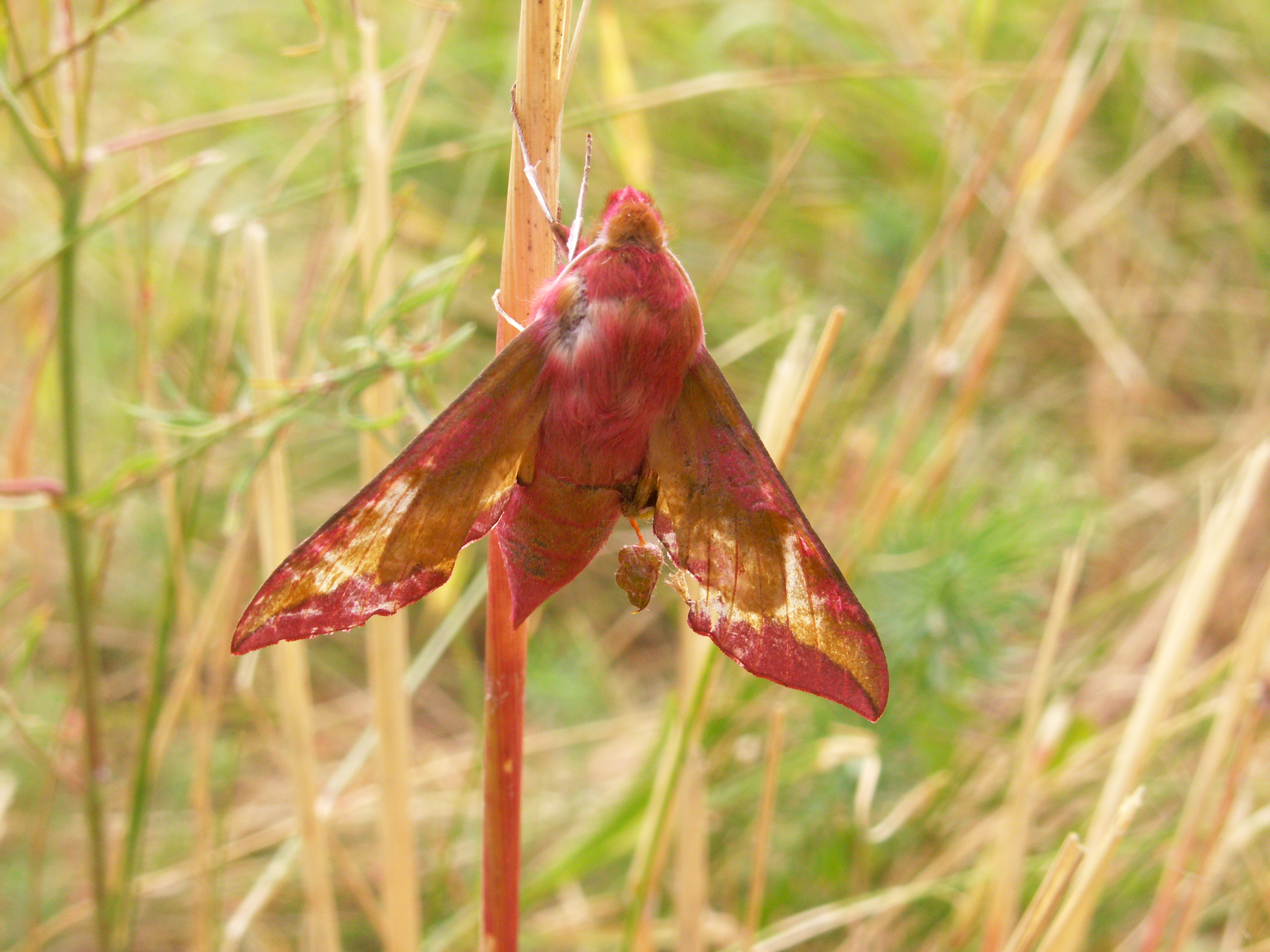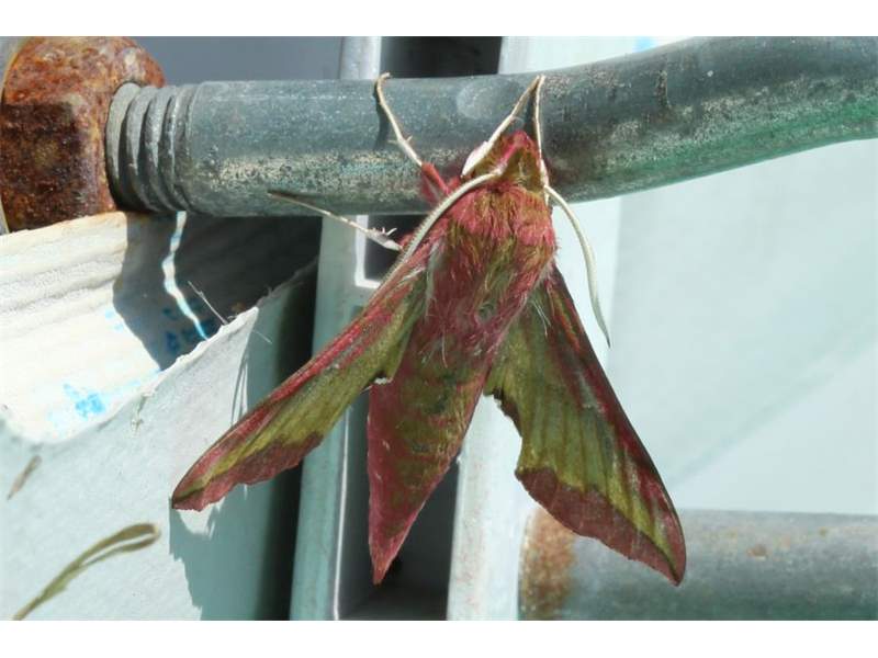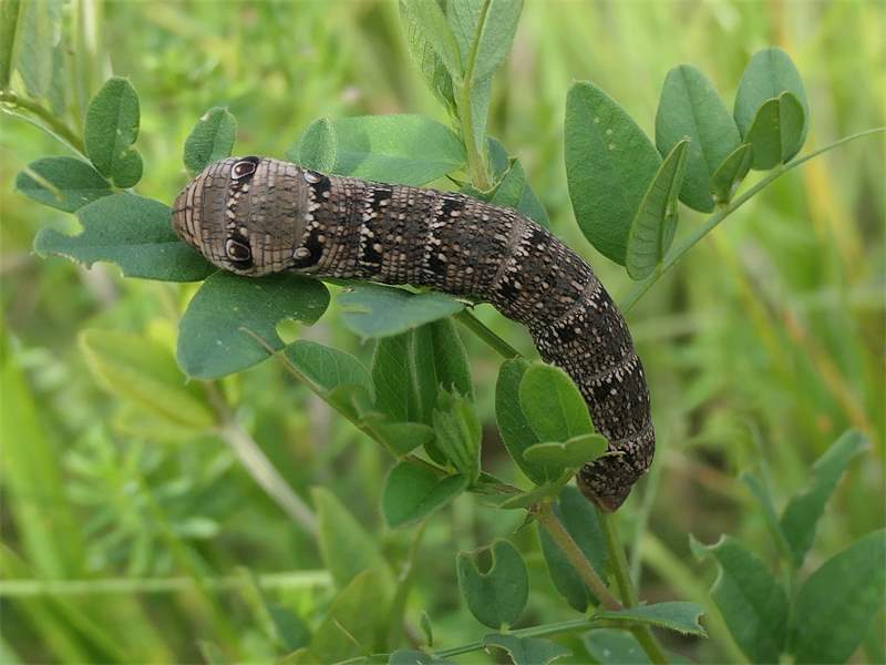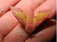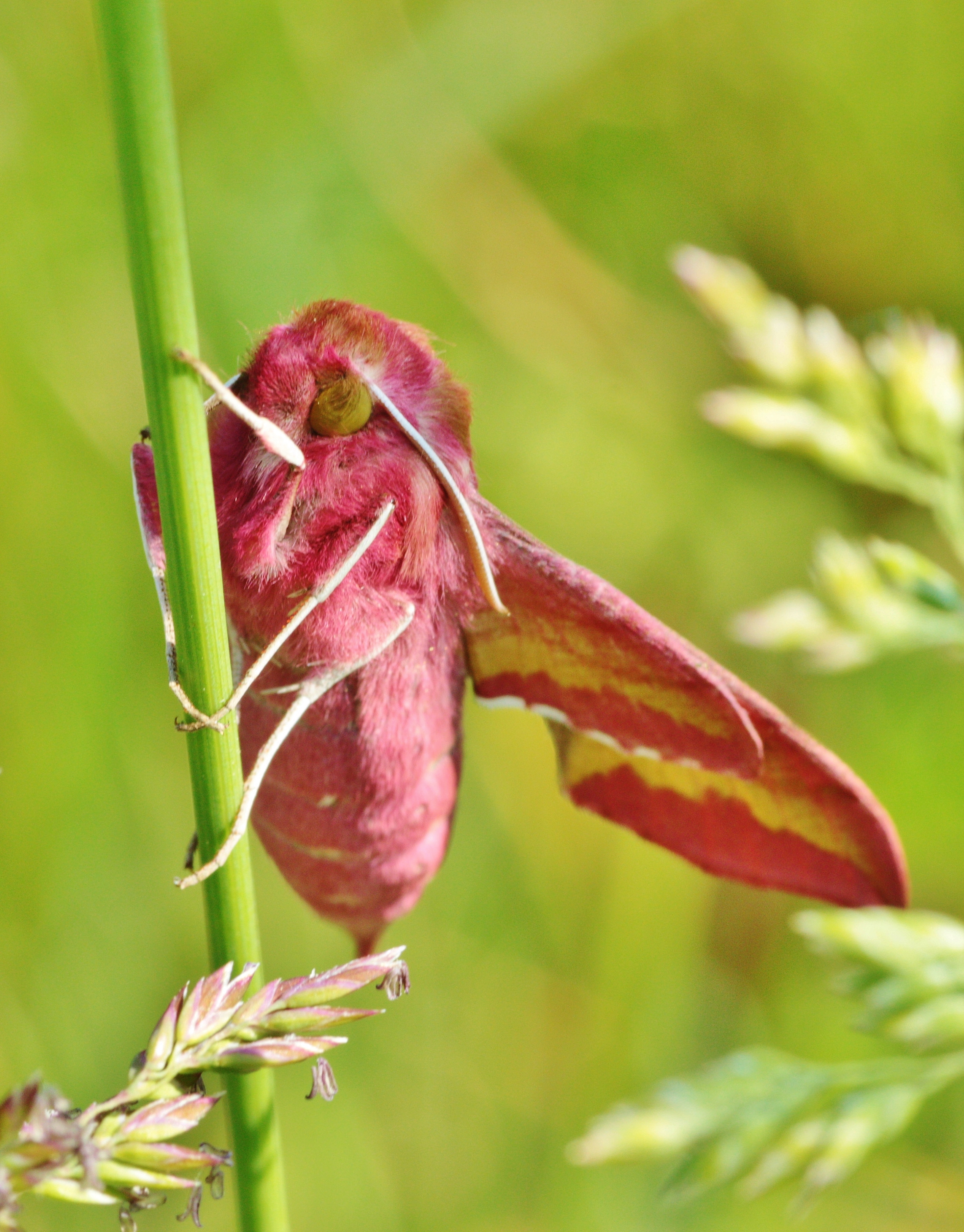 Größenvergleich: D. porcellus (Kleiner Weinschwärmer, unten) und D. elpenor (Mittlerer Weinschwärmer), am Licht - Westlausitz, Pulsnitz, Kahlschlag/Bachtal Hahneflüsschen, 5. Juni 2022