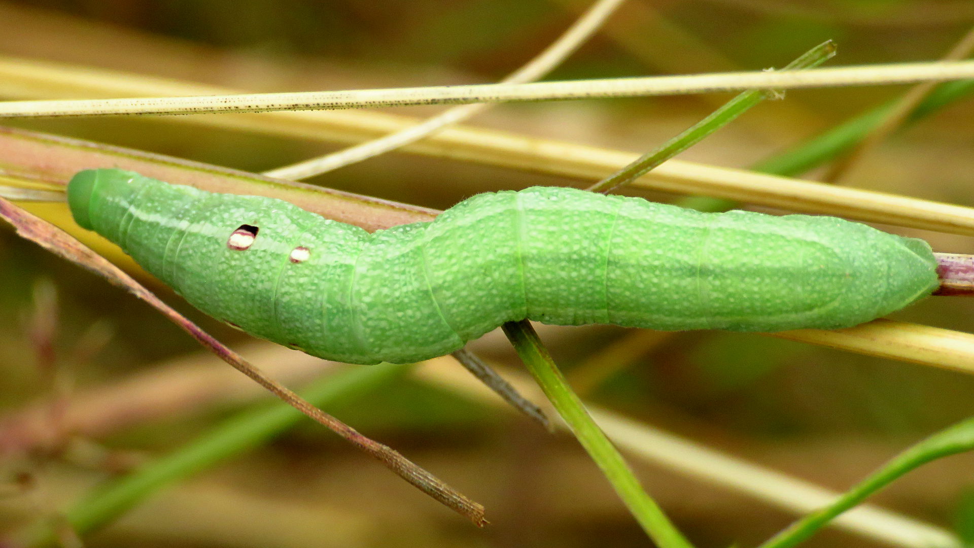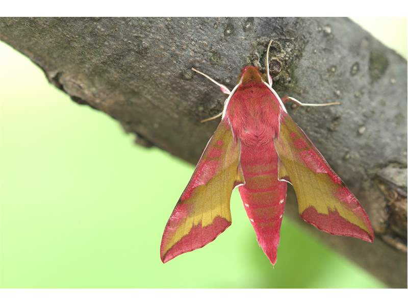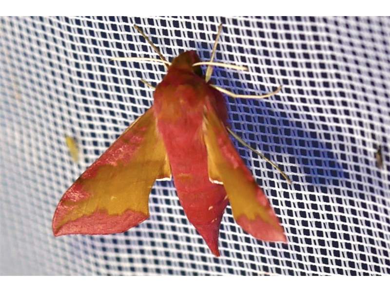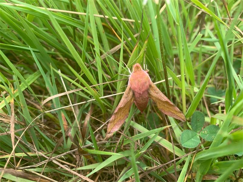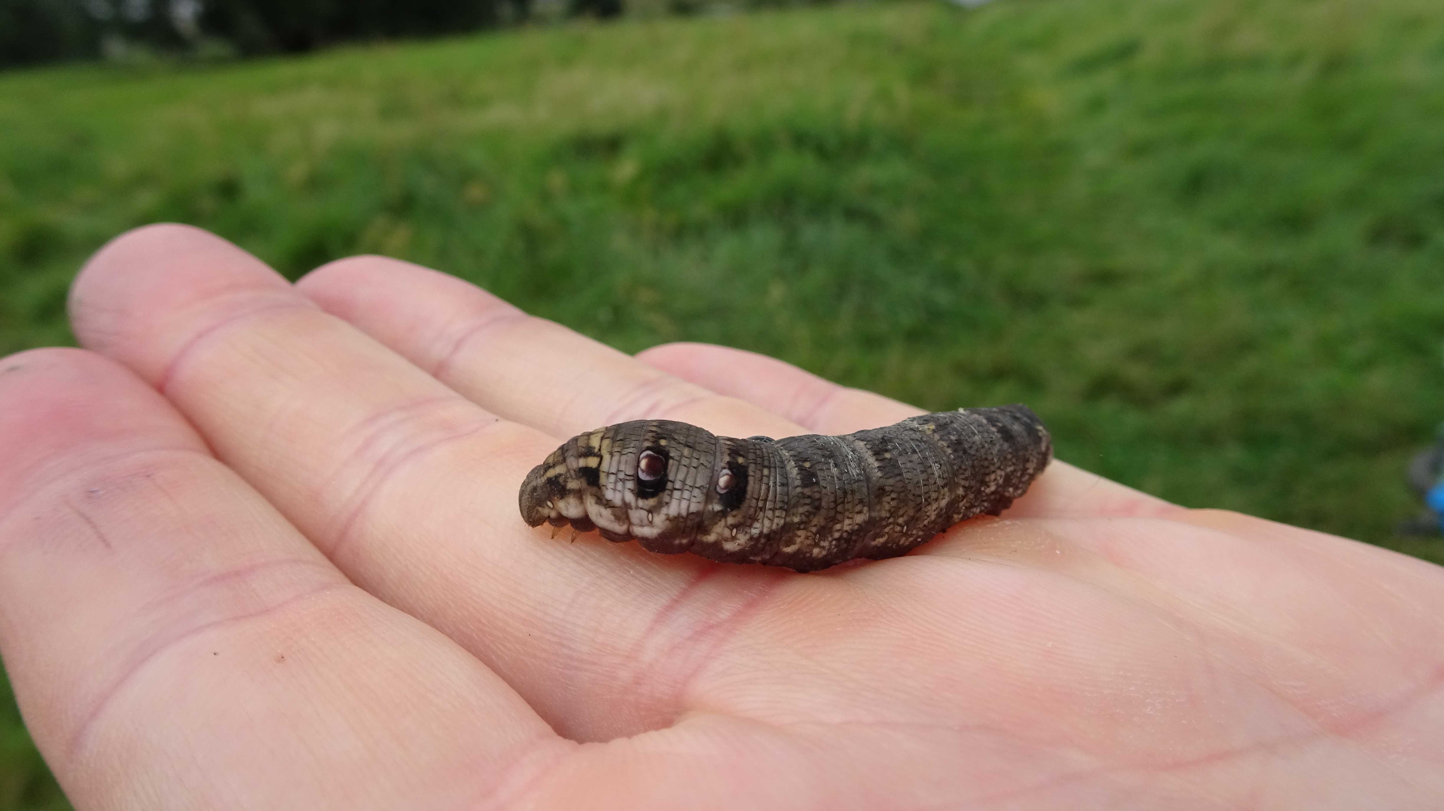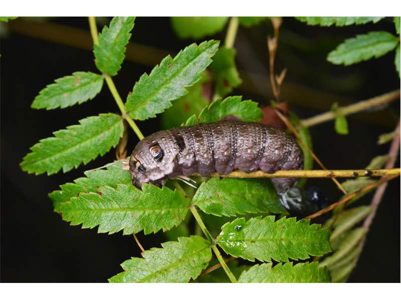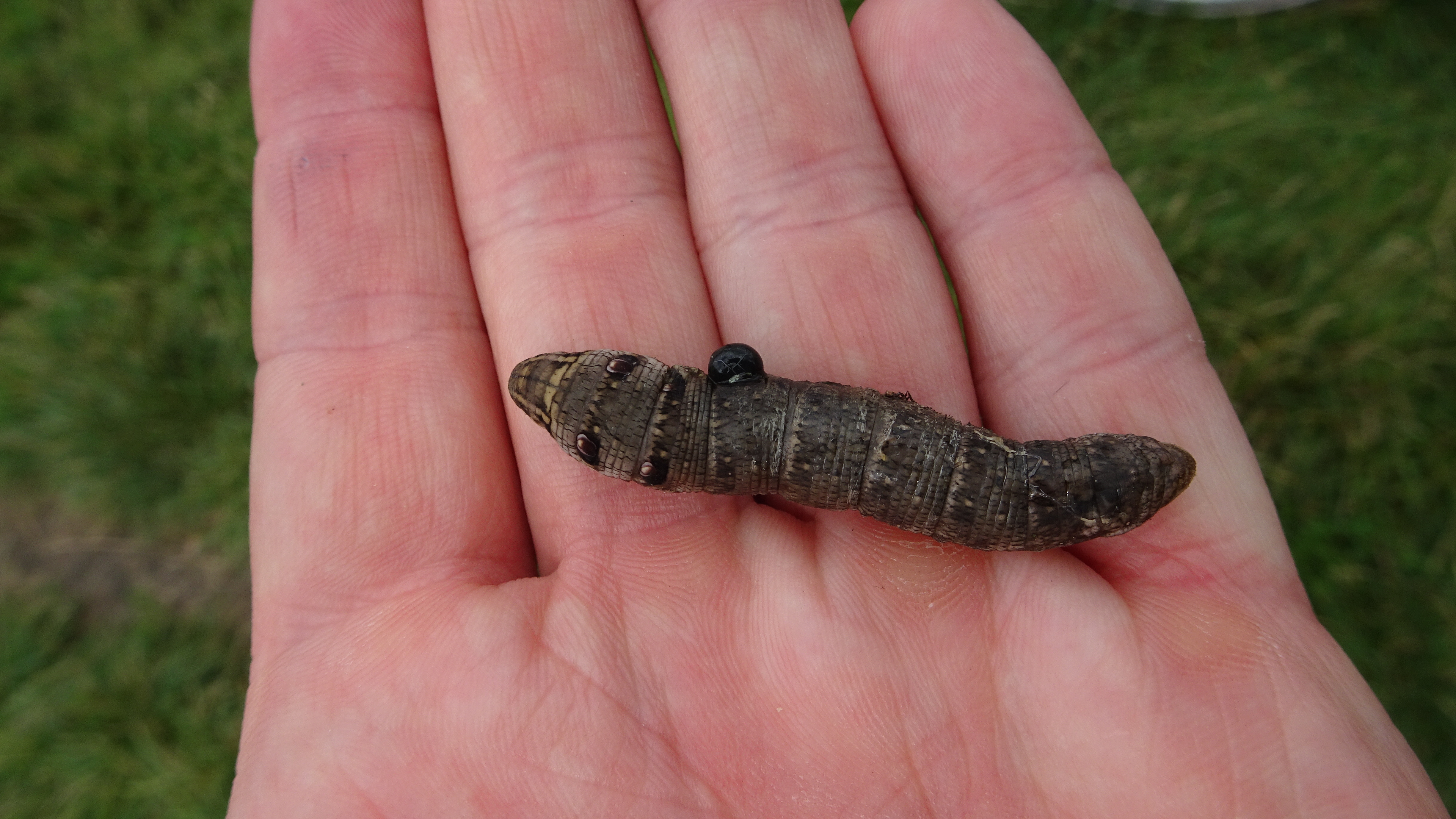 Größenvergleich: D. porcellus (Kleiner Weinschwärmer, unten) und D. elpenor (Mittlerer Weinschwärmer), am Licht - Westlausitz, Pulsnitz, Kahlschlag/Bachtal Hahneflüsschen, 5. Juni 2022