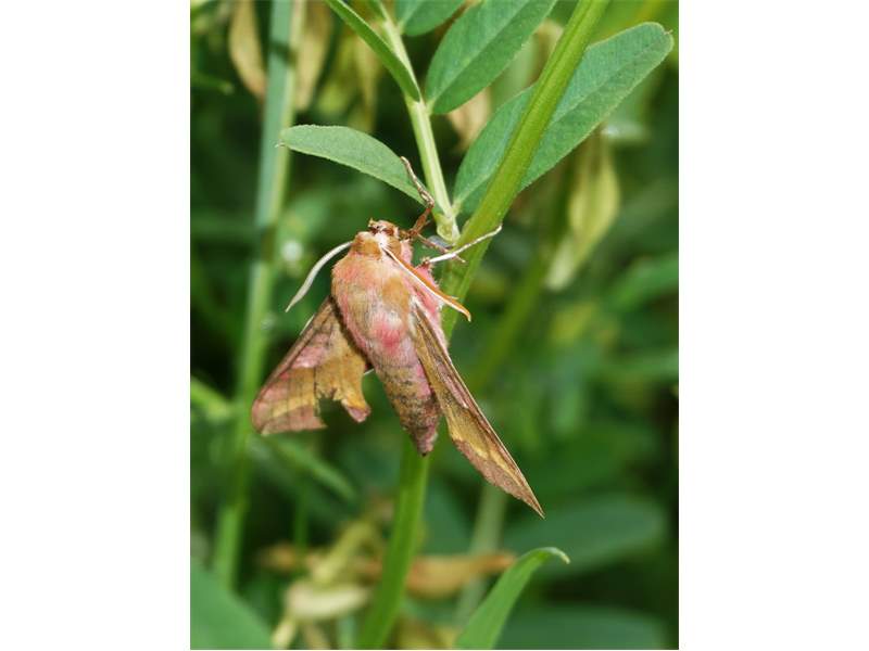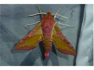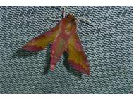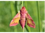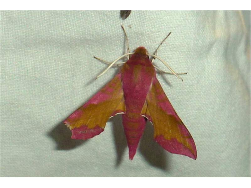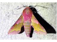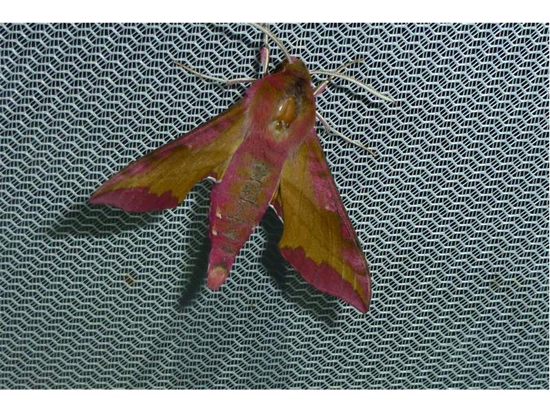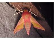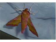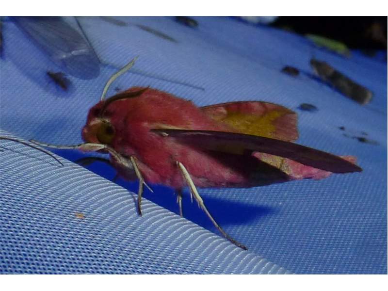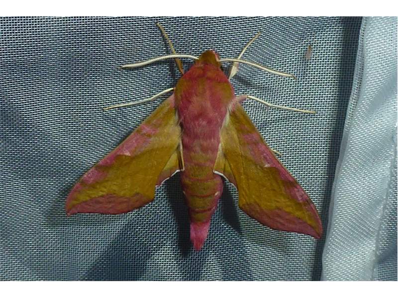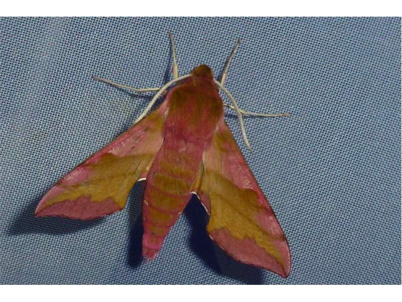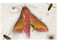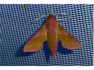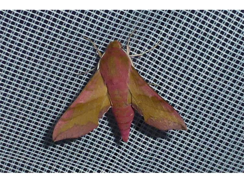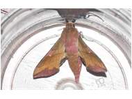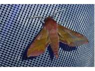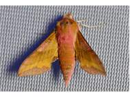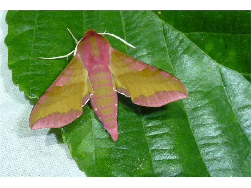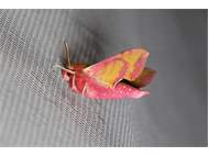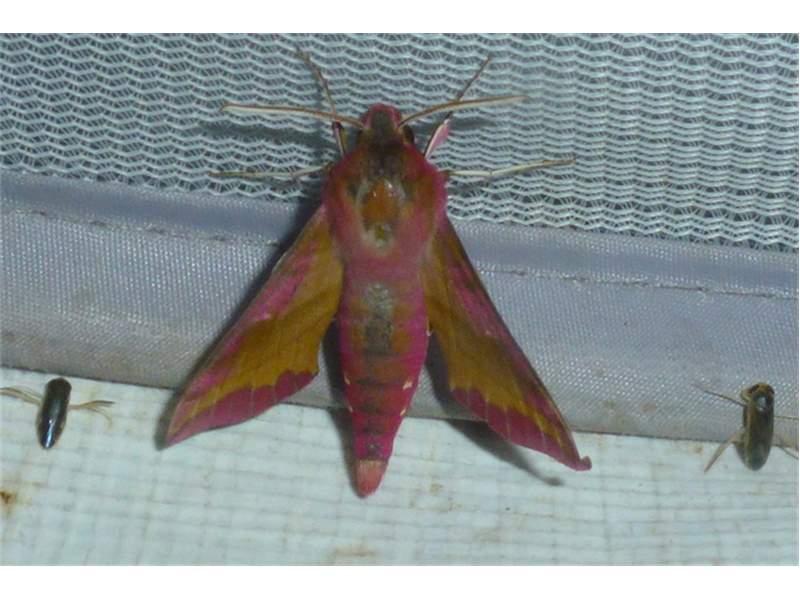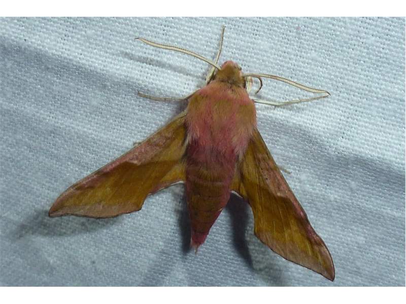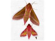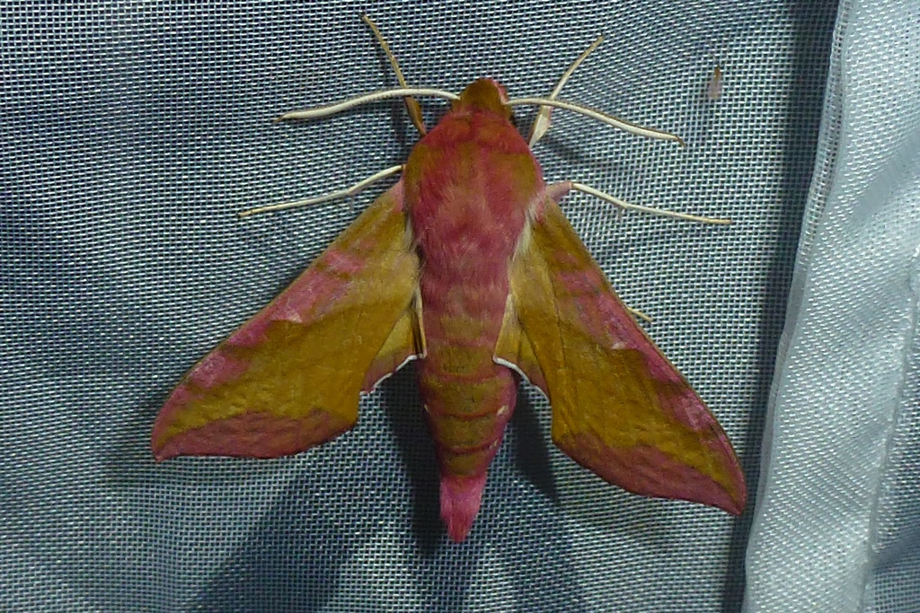 Größenvergleich: D. porcellus (Kleiner Weinschwärmer, unten) und D. elpenor (Mittlerer Weinschwärmer), am Licht - Westlausitz, Pulsnitz, Kahlschlag/Bachtal Hahneflüsschen, 5. Juni 2022 (© Gert Schulze)( Bild vergrößern)