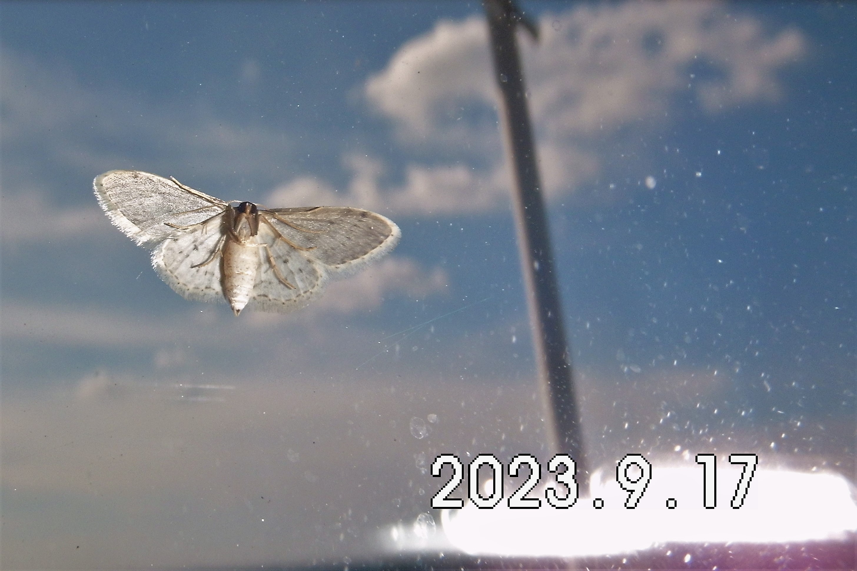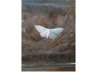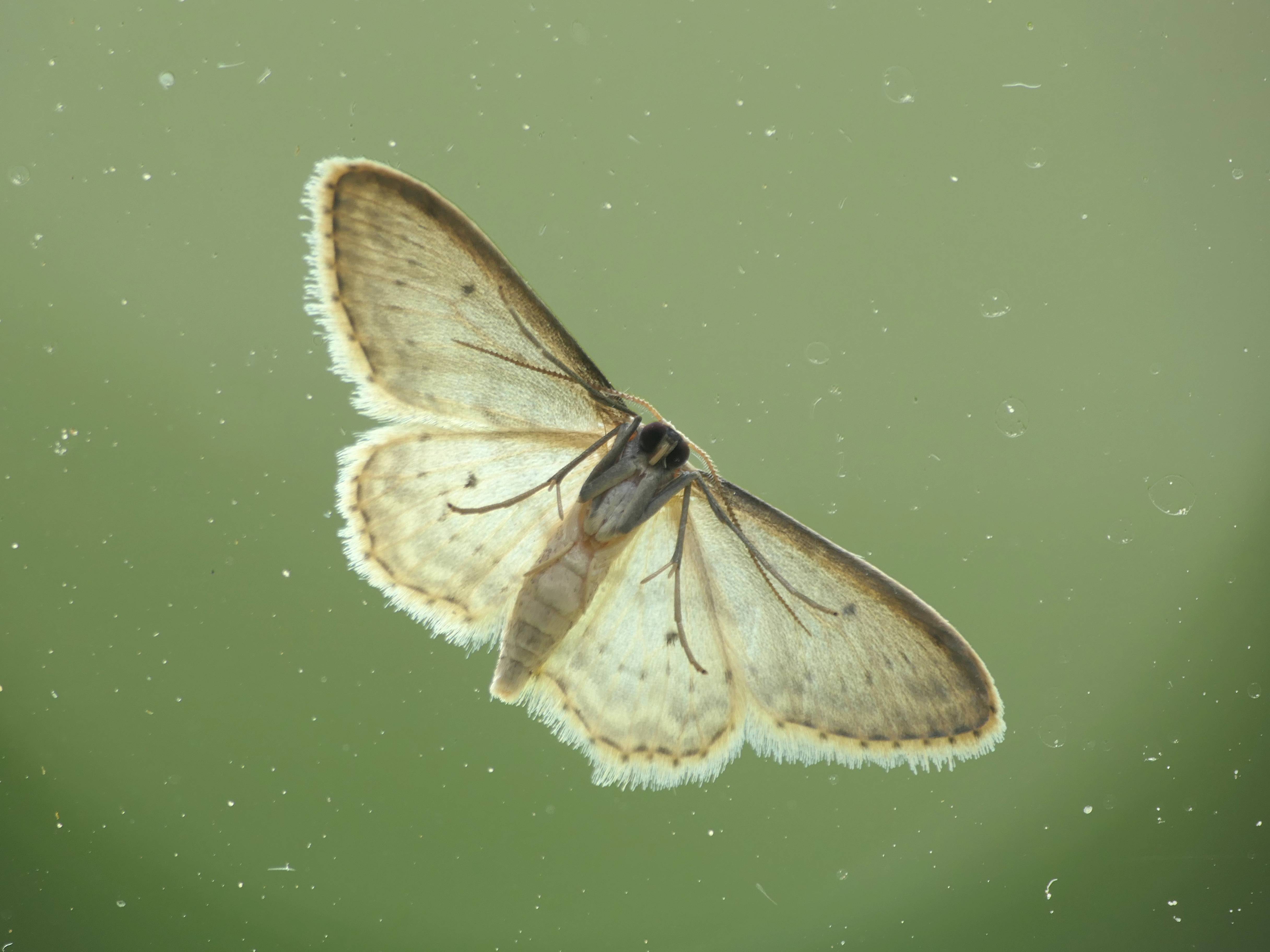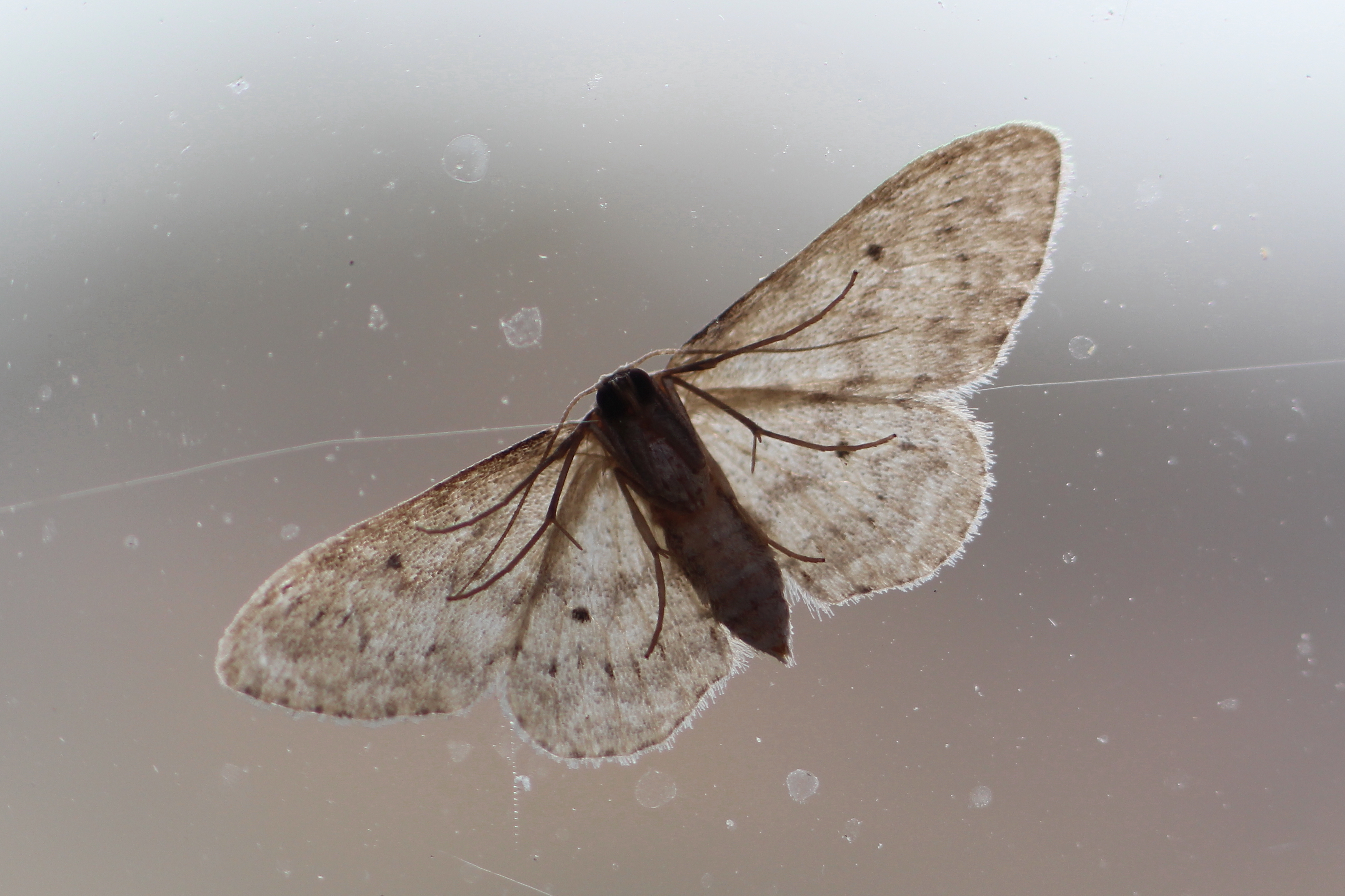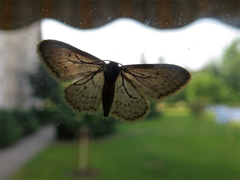 Idaea seriata an einem Fenster der Wohnung, Juni 2013 (Flügelunterseite im Gegenlicht), Leipzig