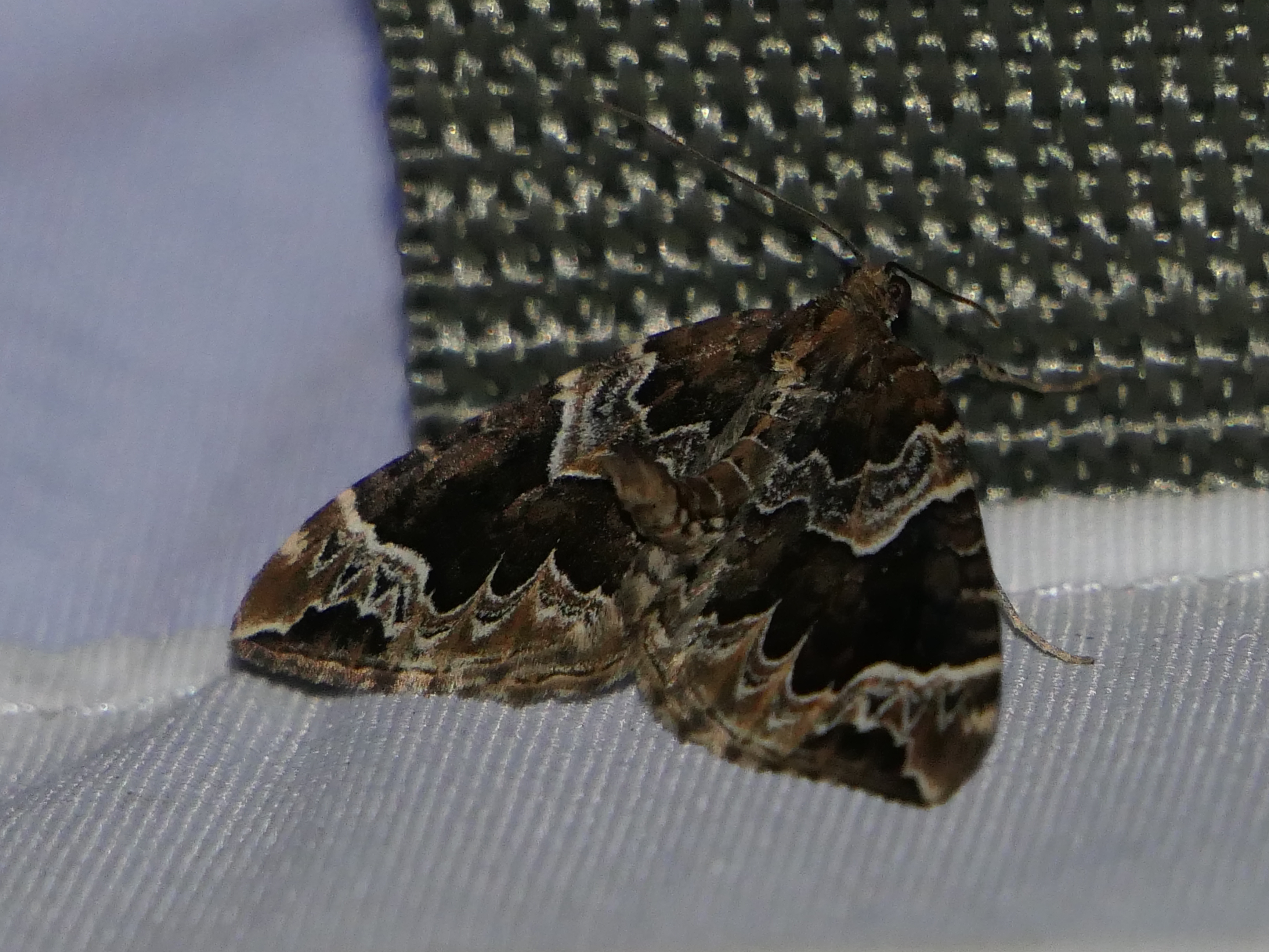 Dunkelbrauner Haarbüschelspanner am Licht, Juli 2016, Chemnitz