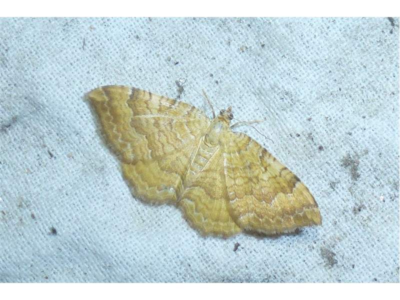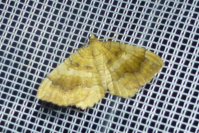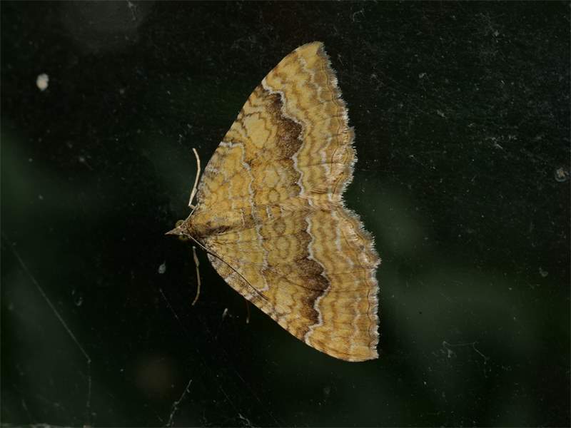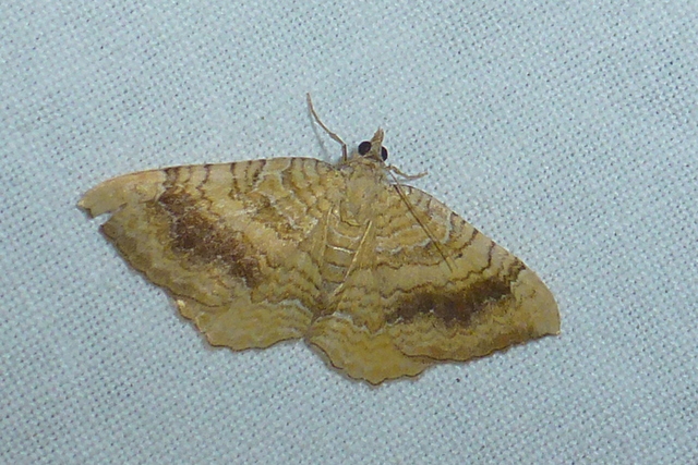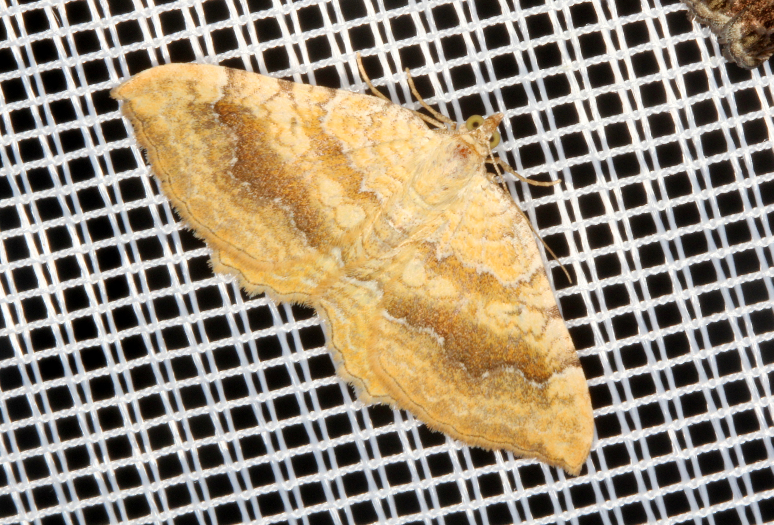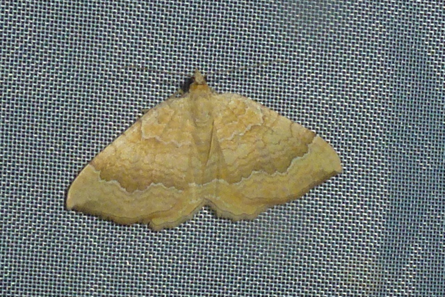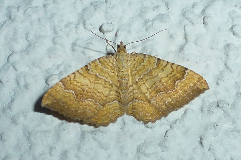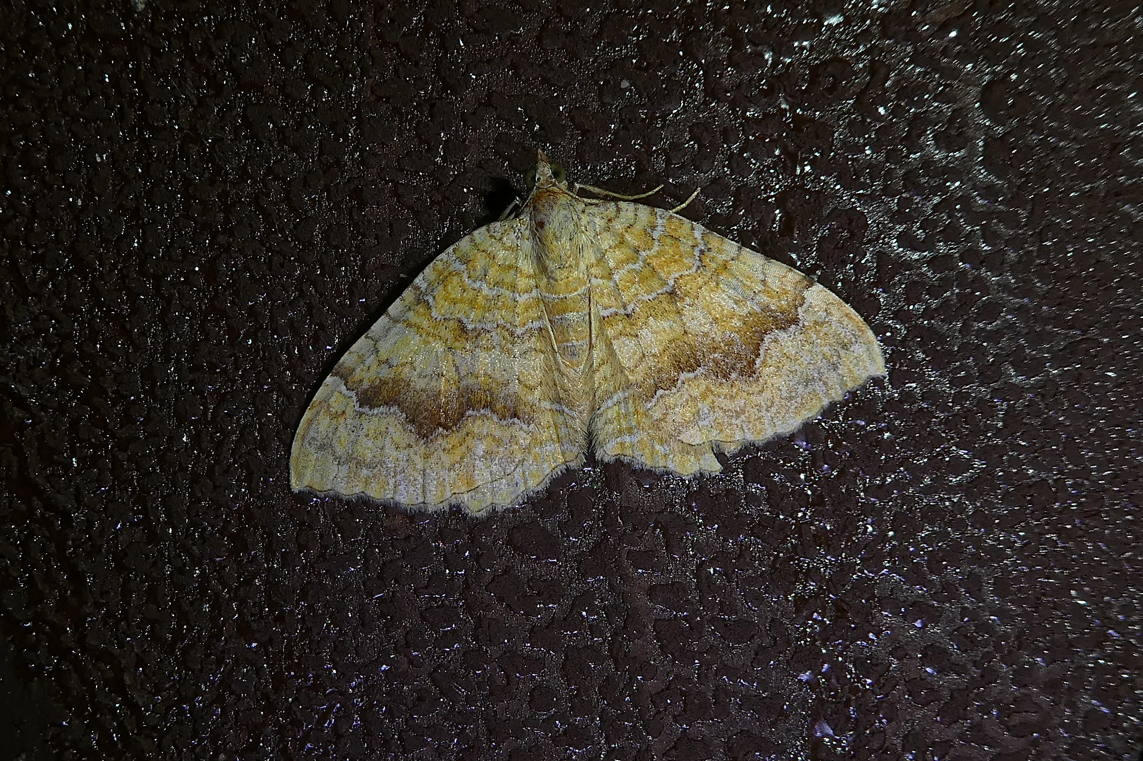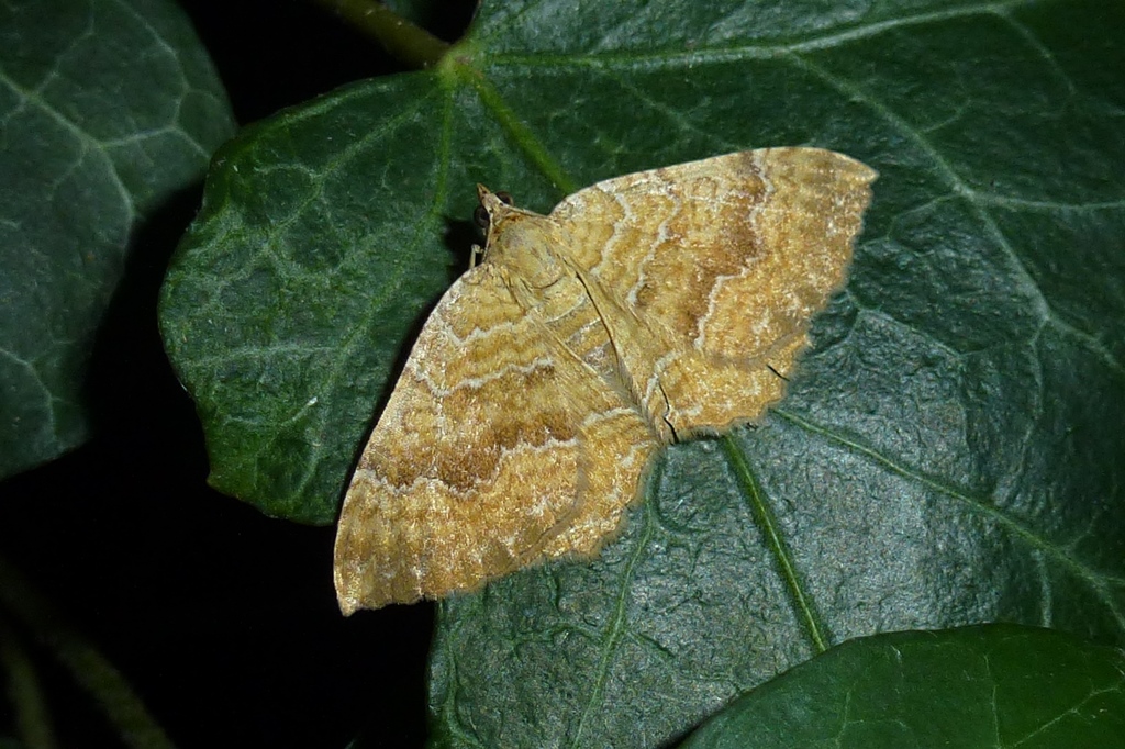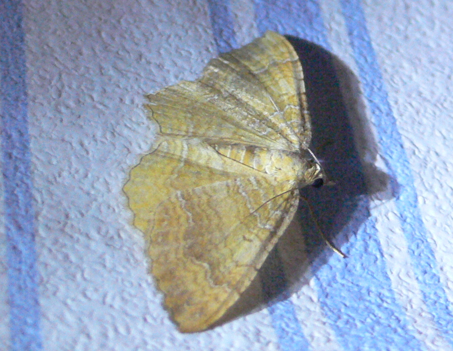 Ockergelbe Blattspanner, oder Löwenzahnspanner oder Brennnesselspanner (Camptogramma bilineata (Linnaeus, 1758)), am Licht, Radeberg, August 2013.