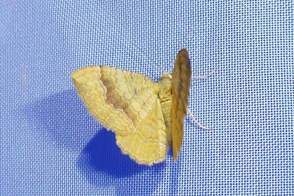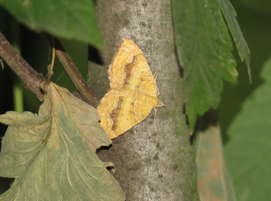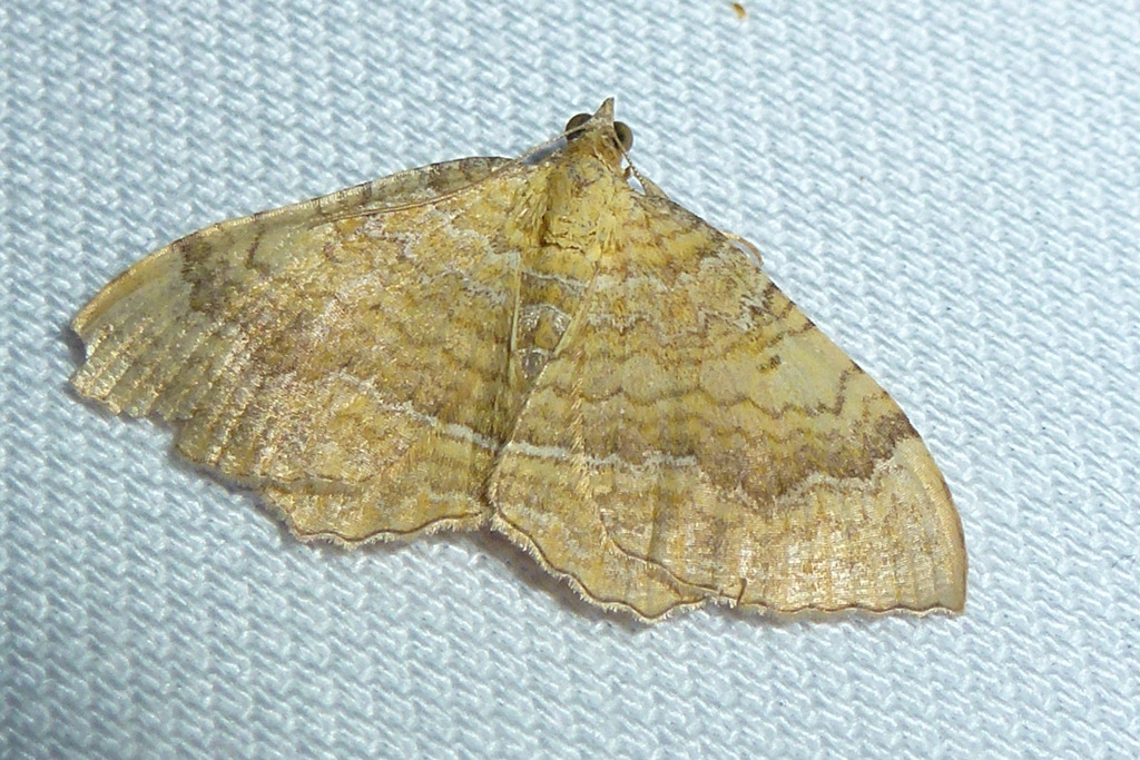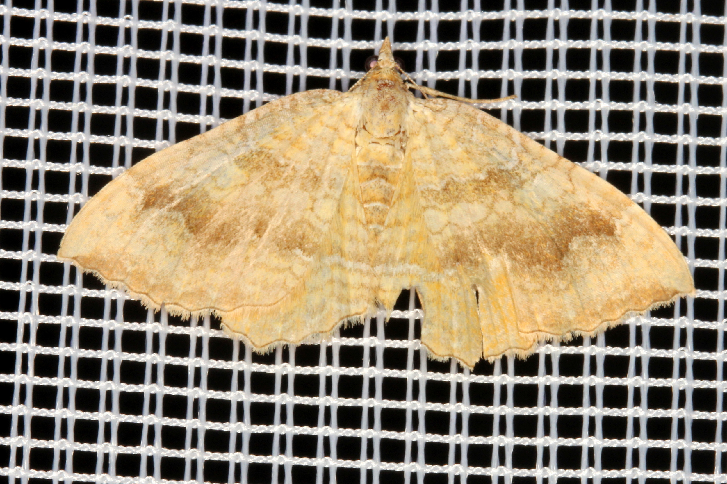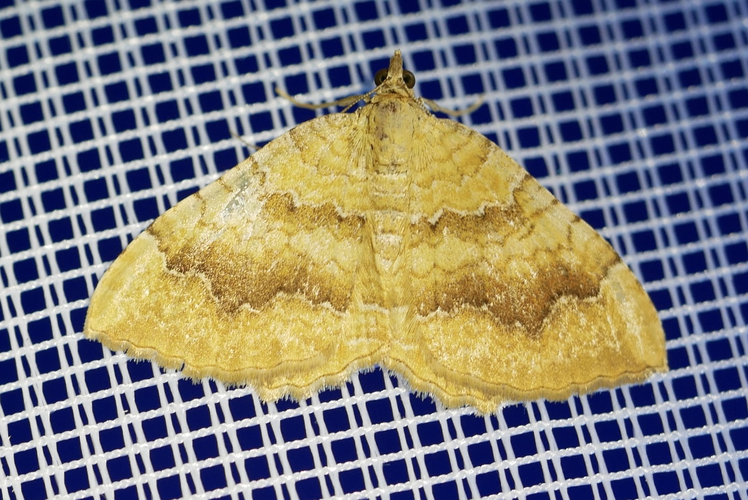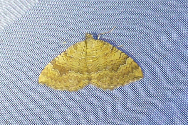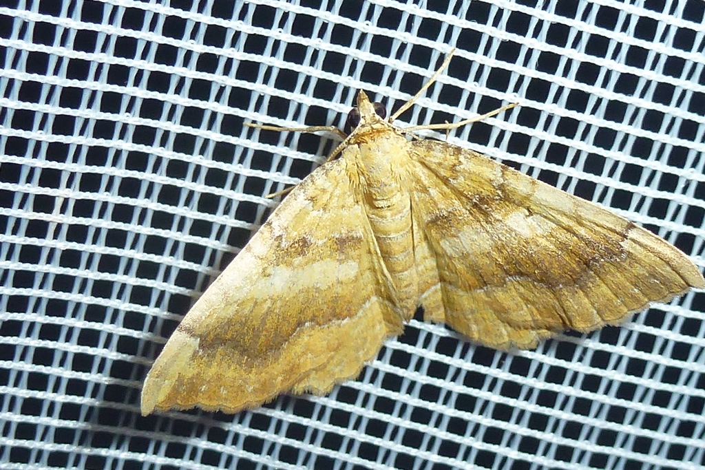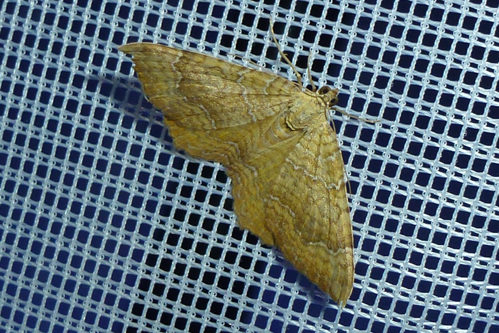 Ockergelbe Blattspanner, oder Löwenzahnspanner oder Brennnesselspanner (Camptogramma bilineata (Linnaeus, 1758)), am Licht, Radeberg, August 2013.
