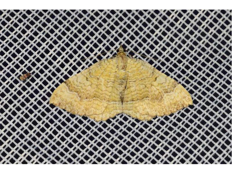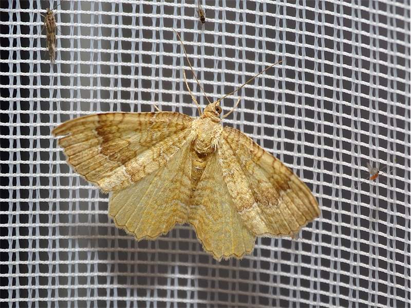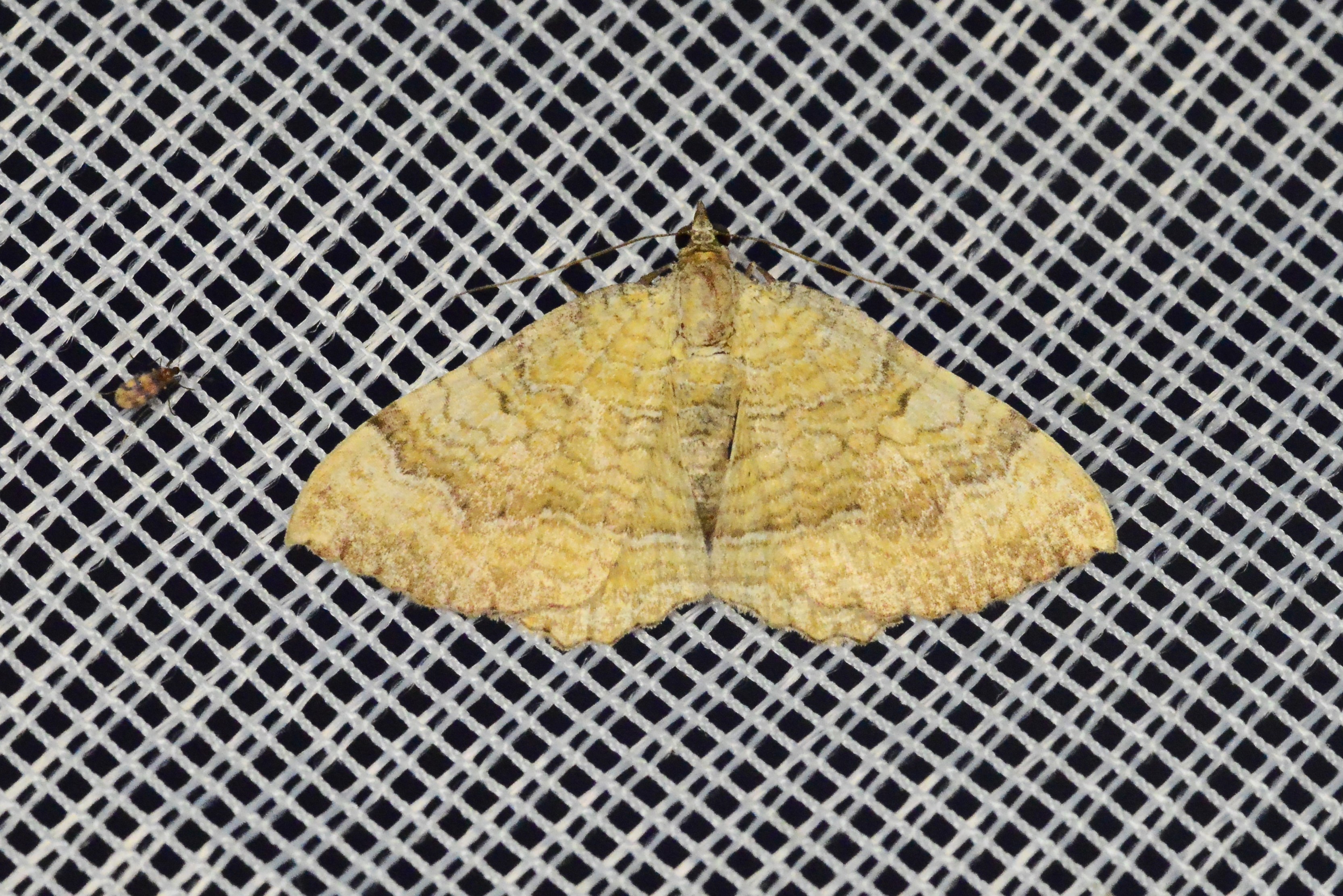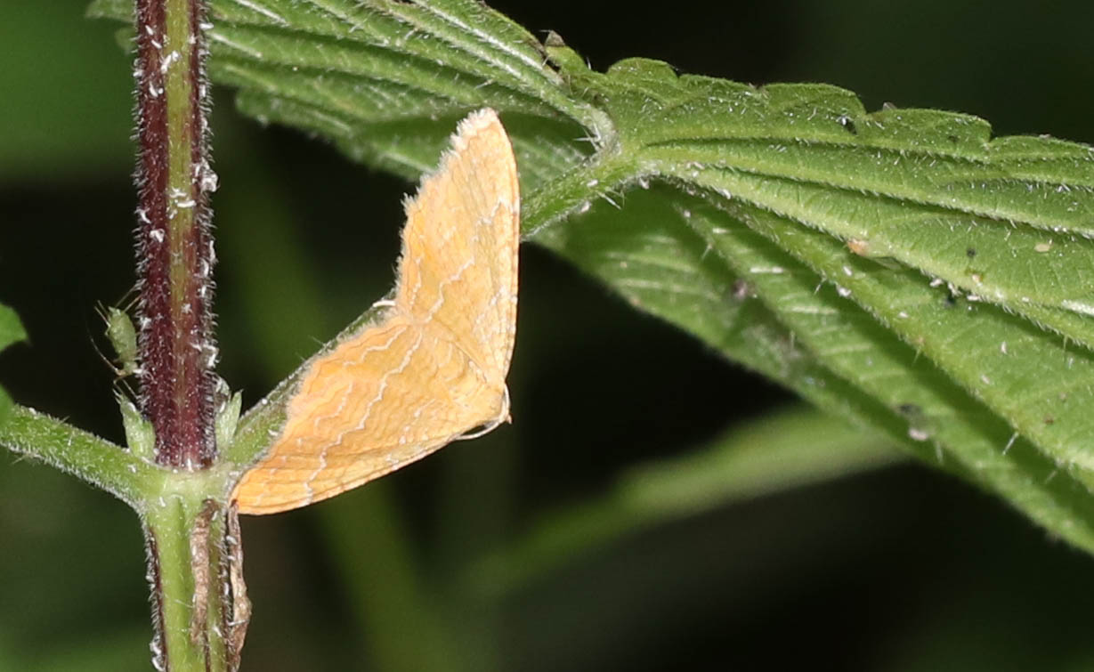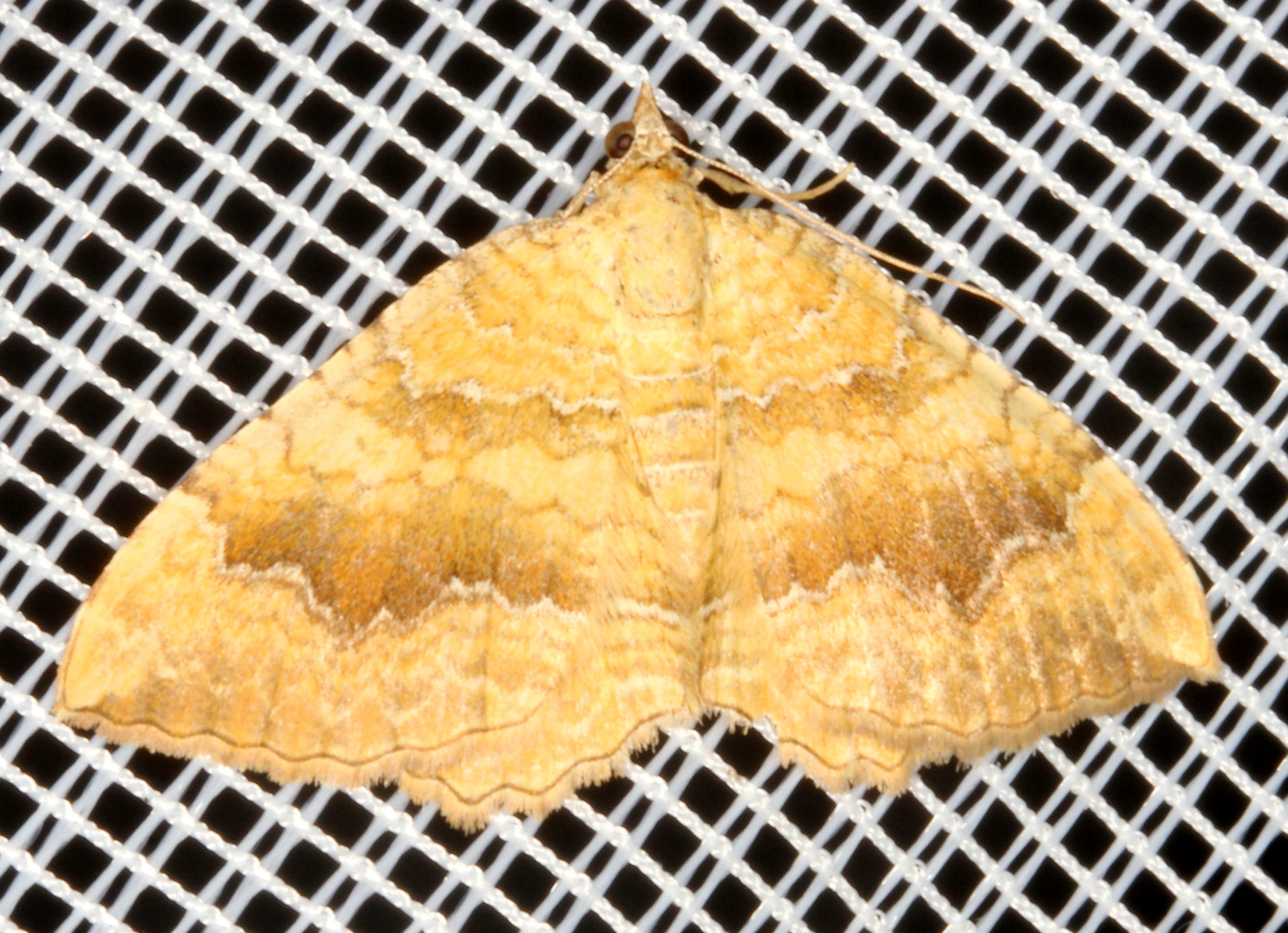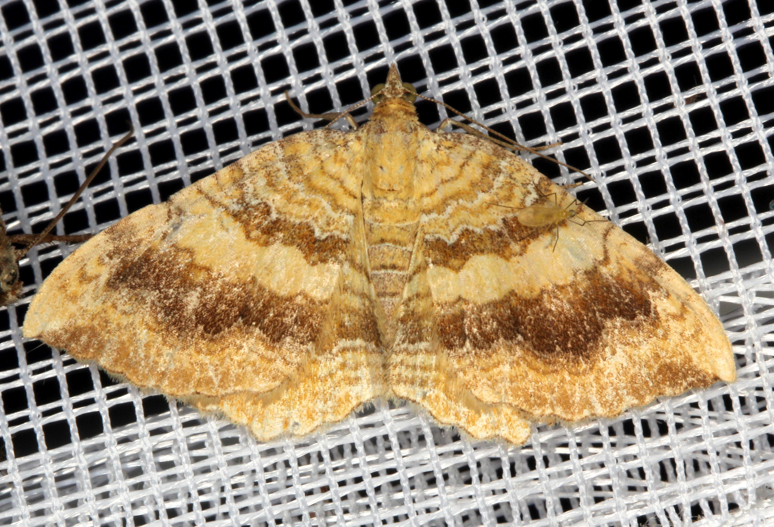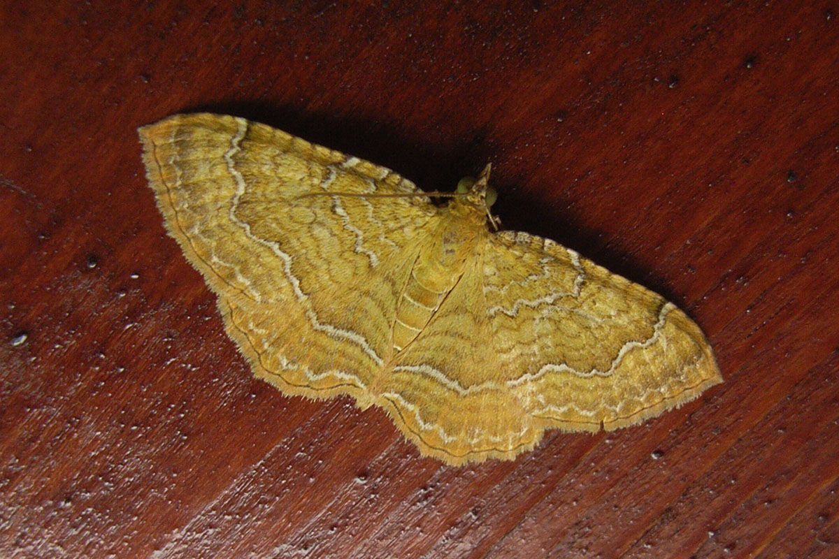 Ockergelbe Blattspanner, oder Löwenzahnspanner oder Brennnesselspanner (Camptogramma bilineata (Linnaeus, 1758)), am Licht, Radeberg, August 2013.