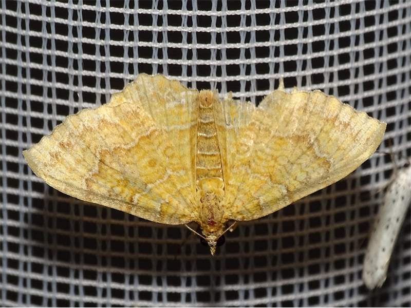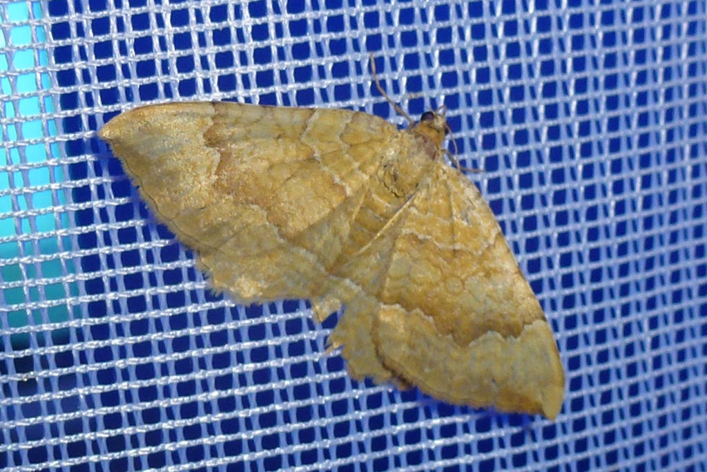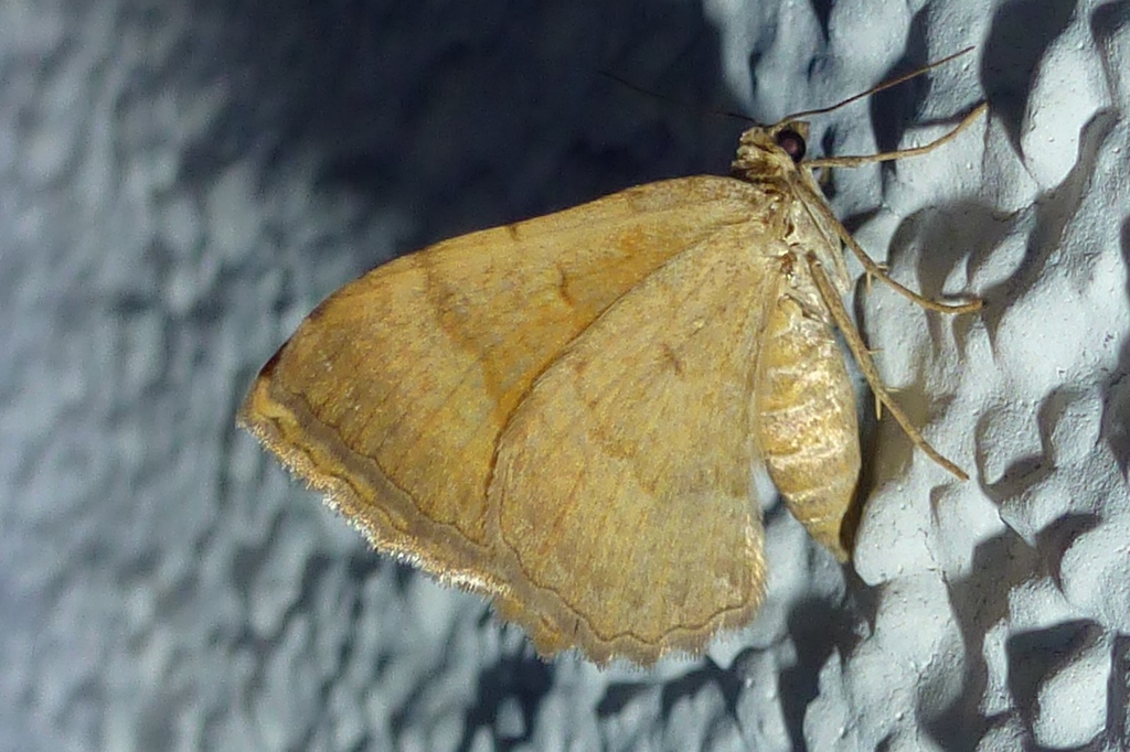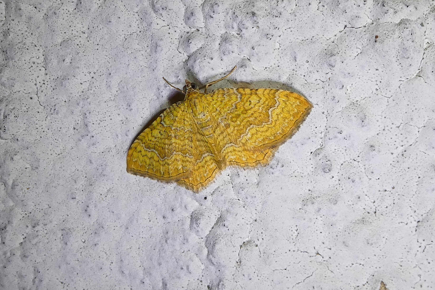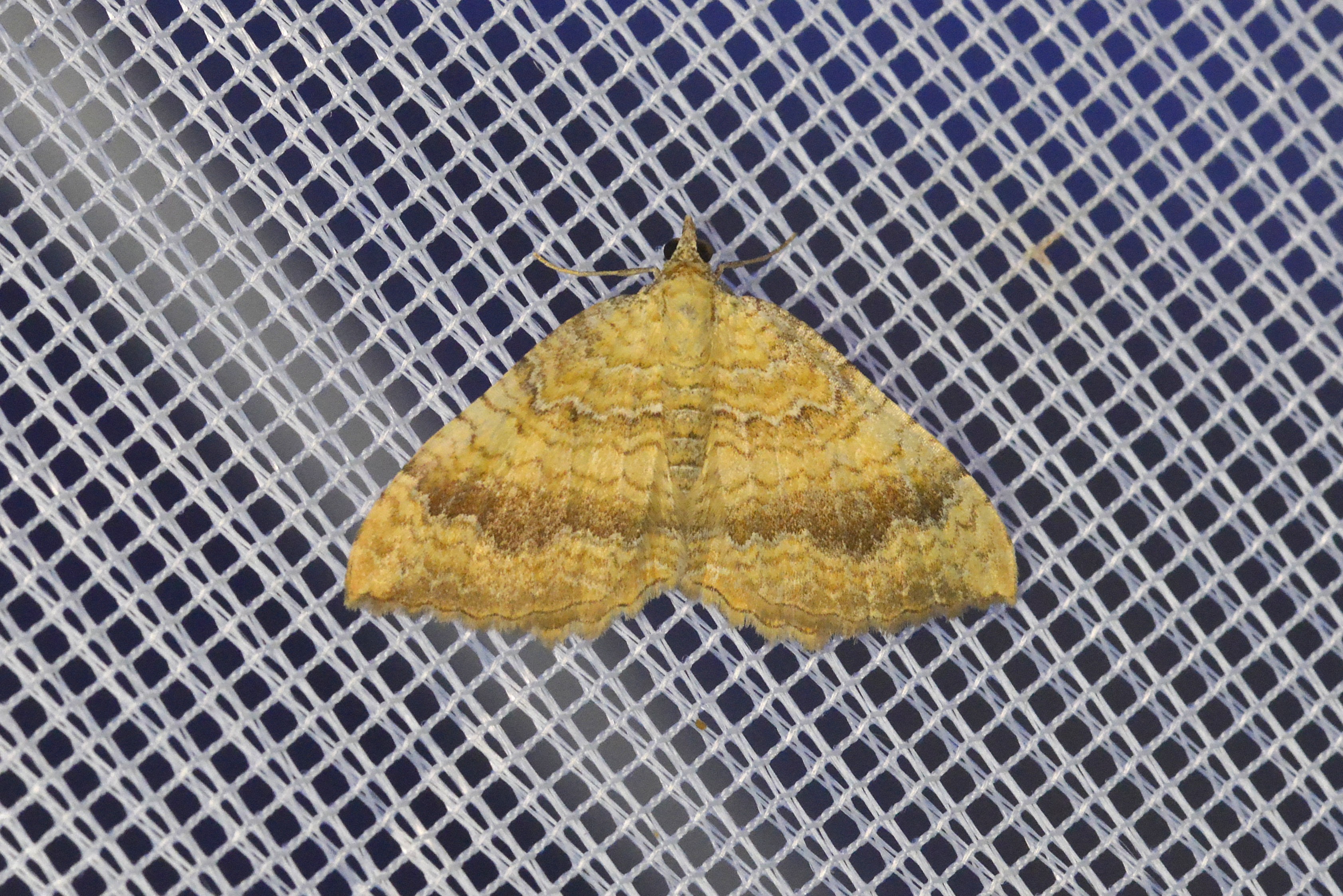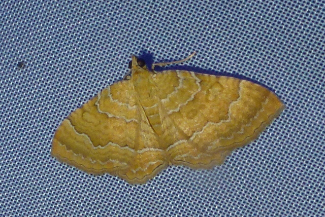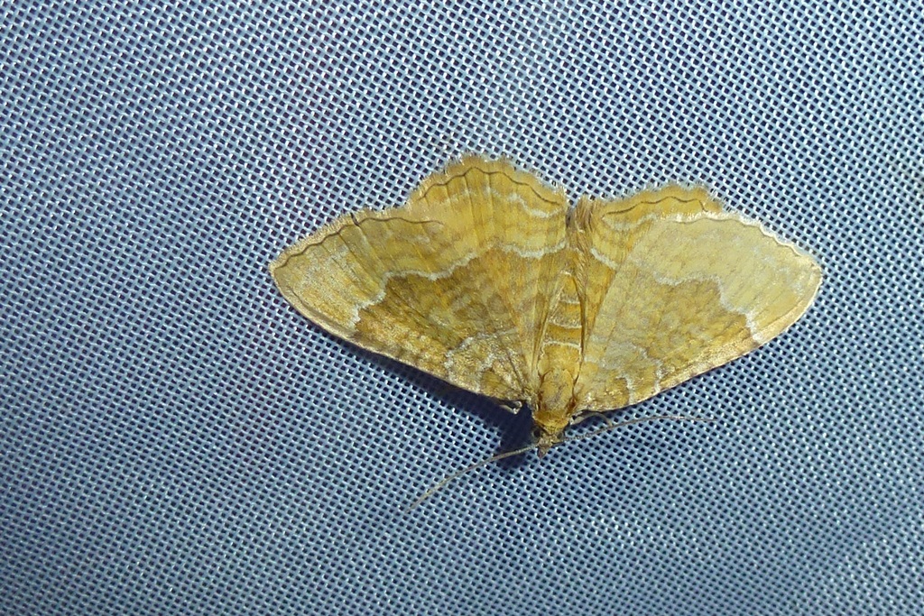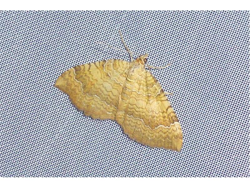 Ockergelbe Blattspanner, oder Löwenzahnspanner oder Brennnesselspanner (Camptogramma bilineata (Linnaeus, 1758)), am Licht, Radeberg, August 2013.