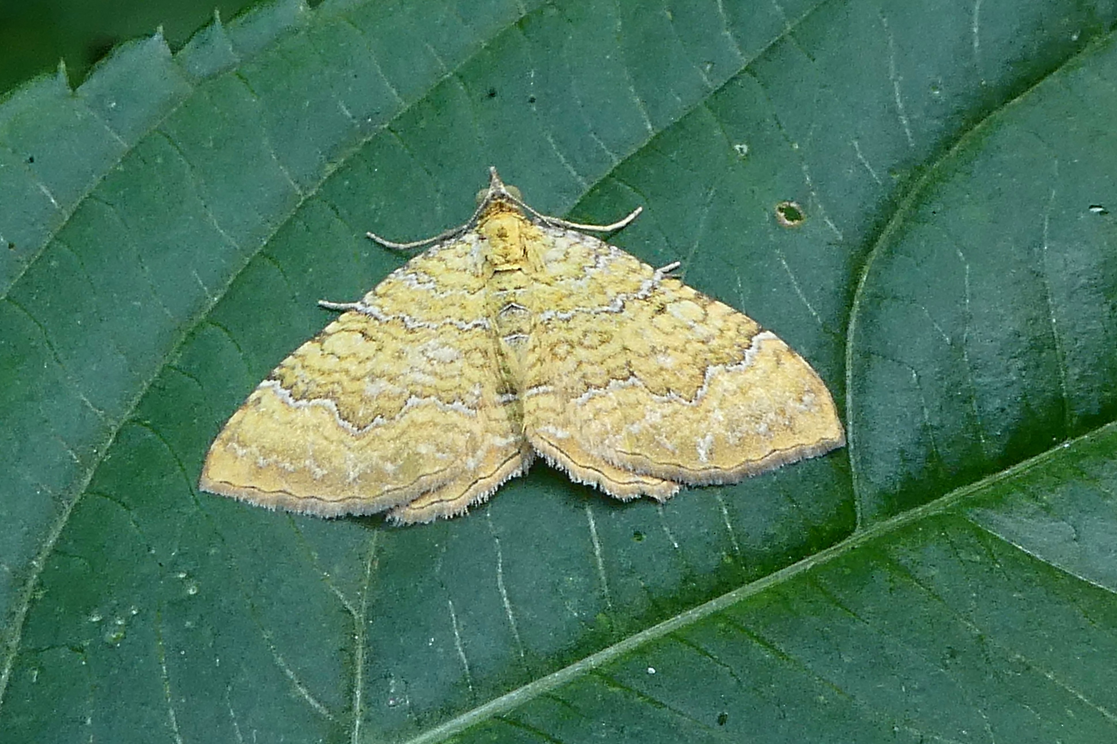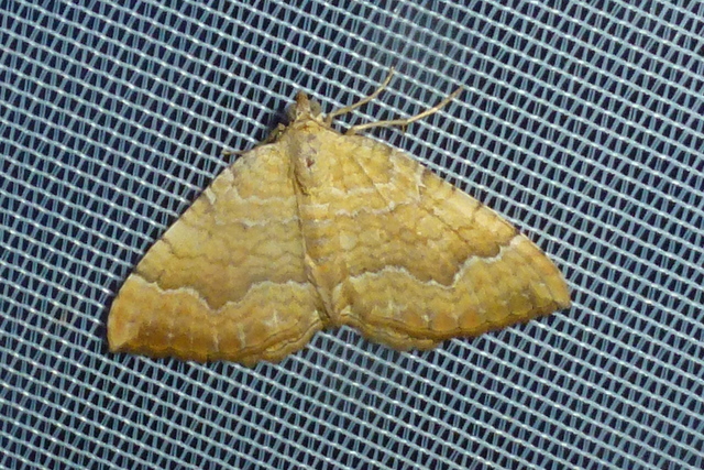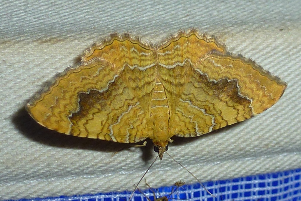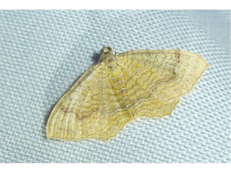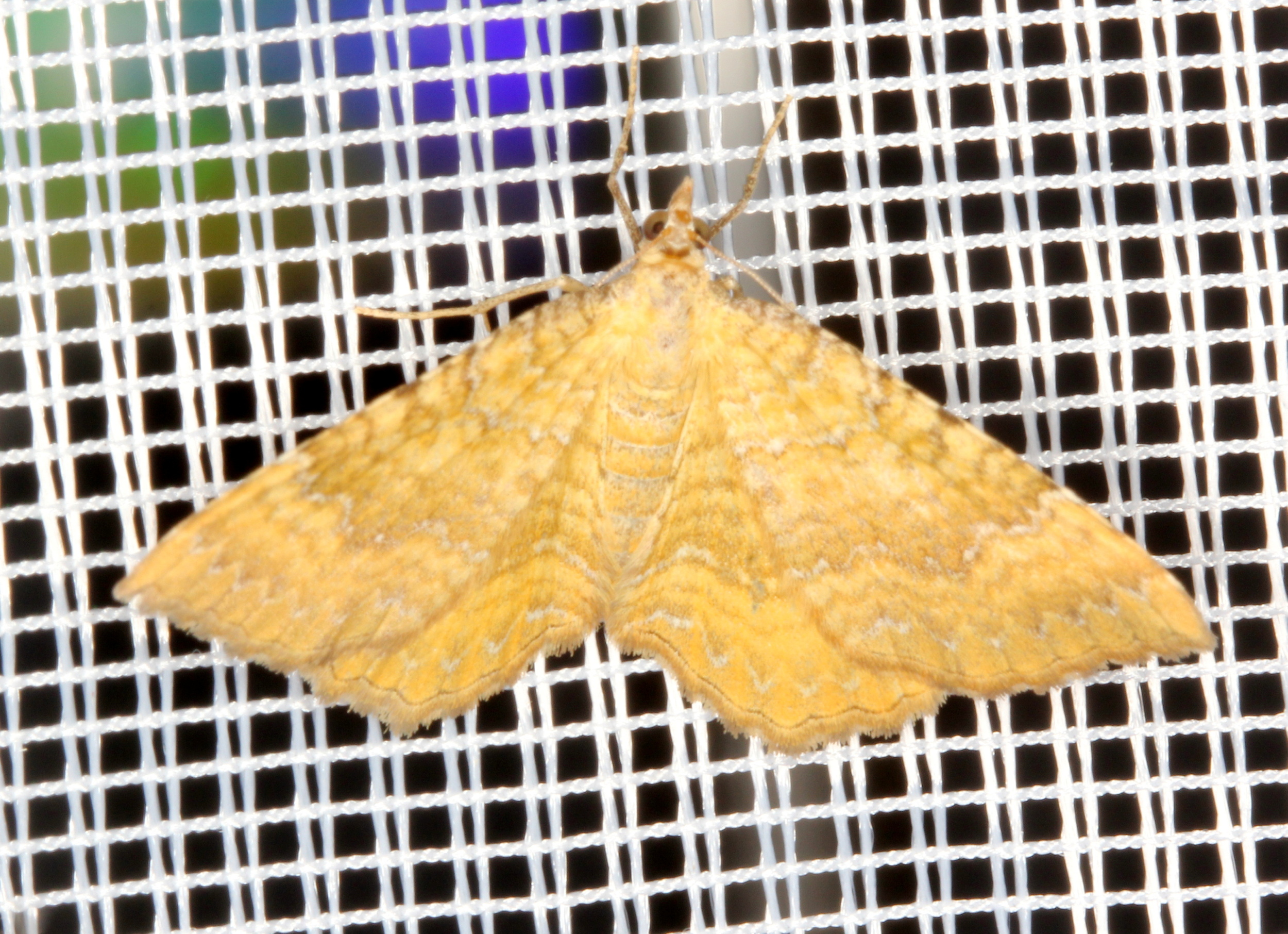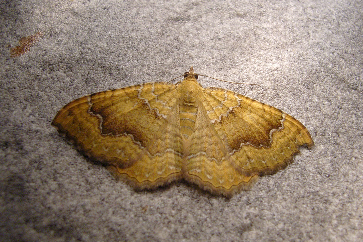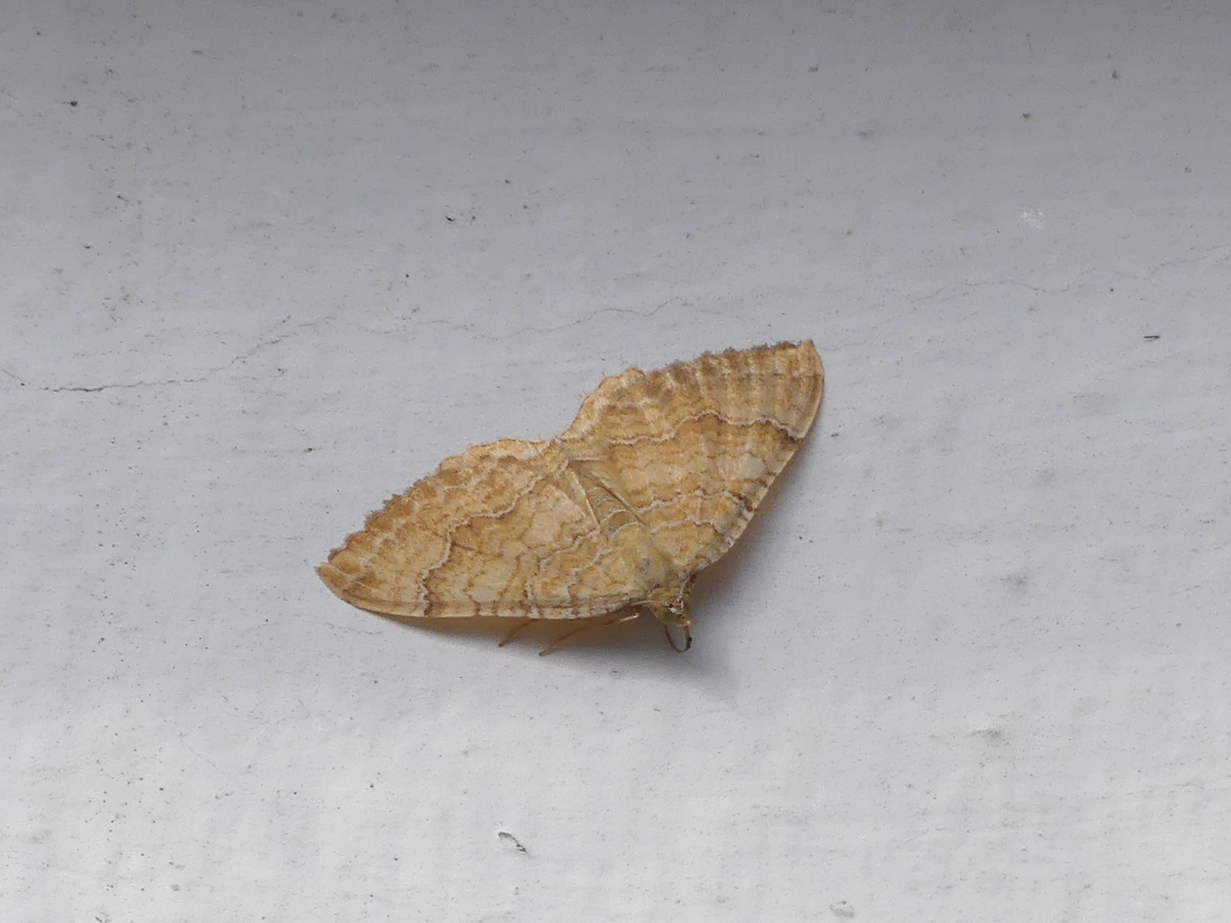 Ockergelbe Blattspanner, oder Löwenzahnspanner oder Brennnesselspanner (Camptogramma bilineata (Linnaeus, 1758)), am Licht, Radeberg, August 2013.