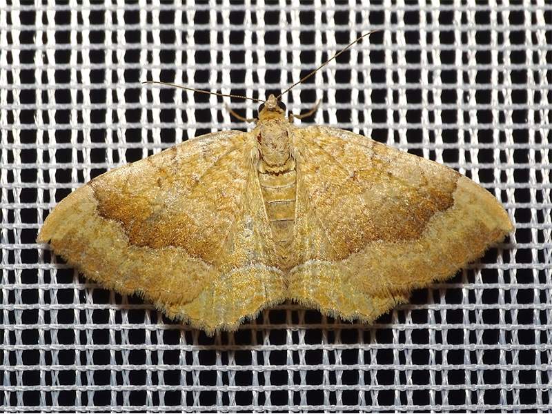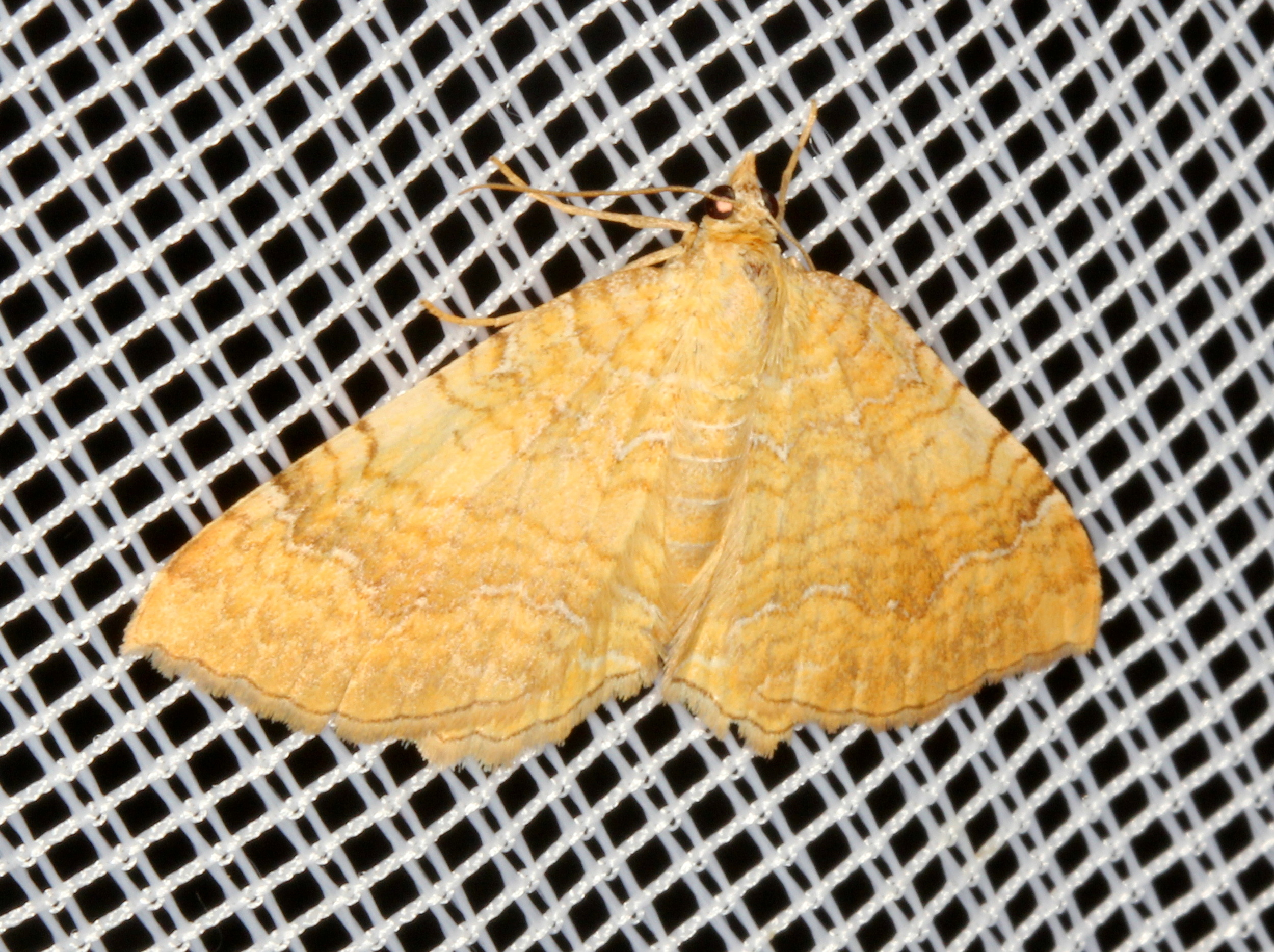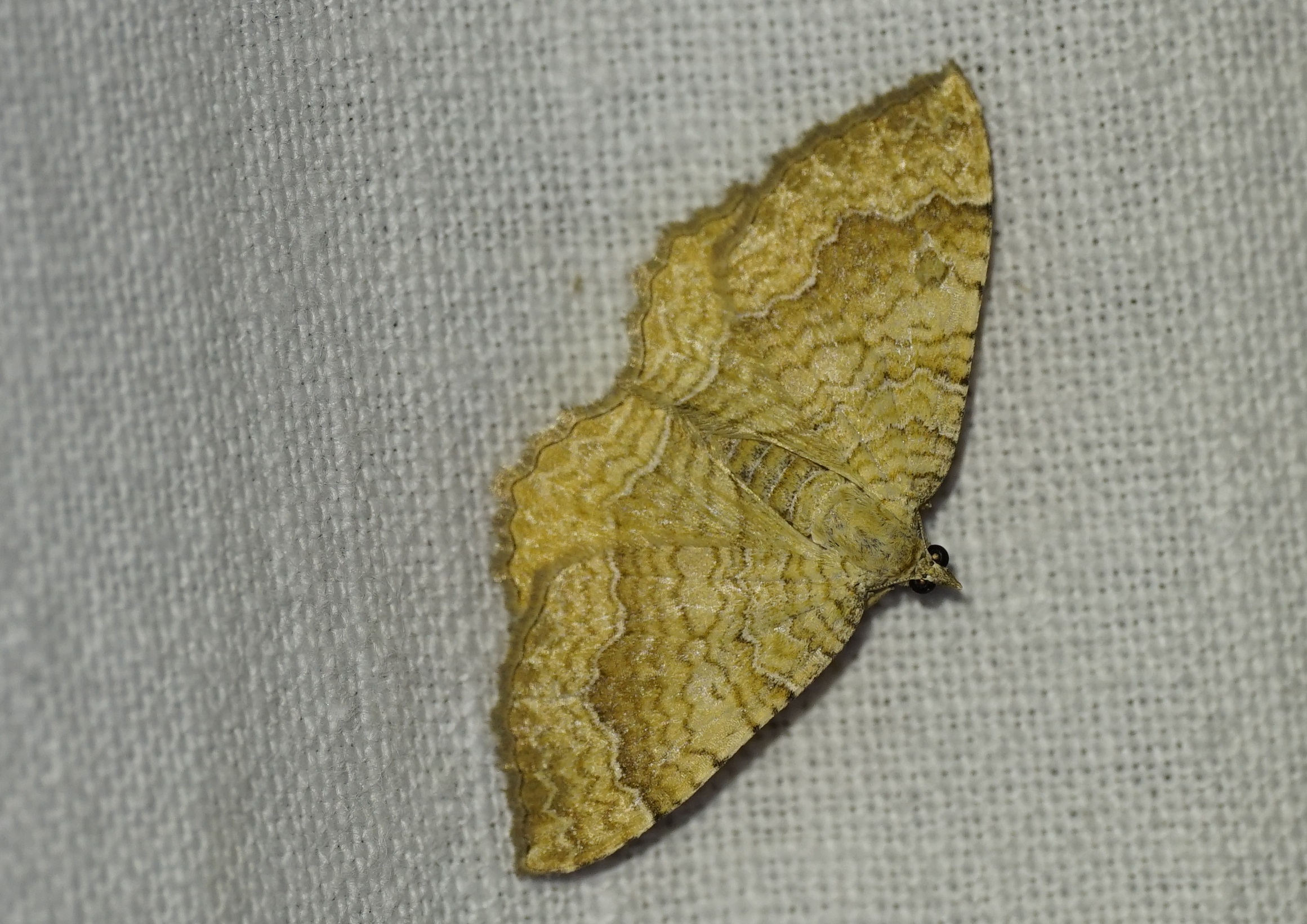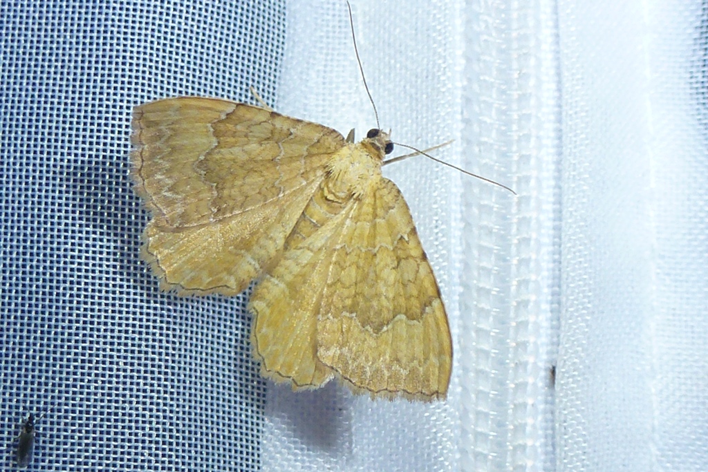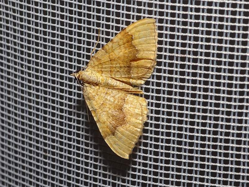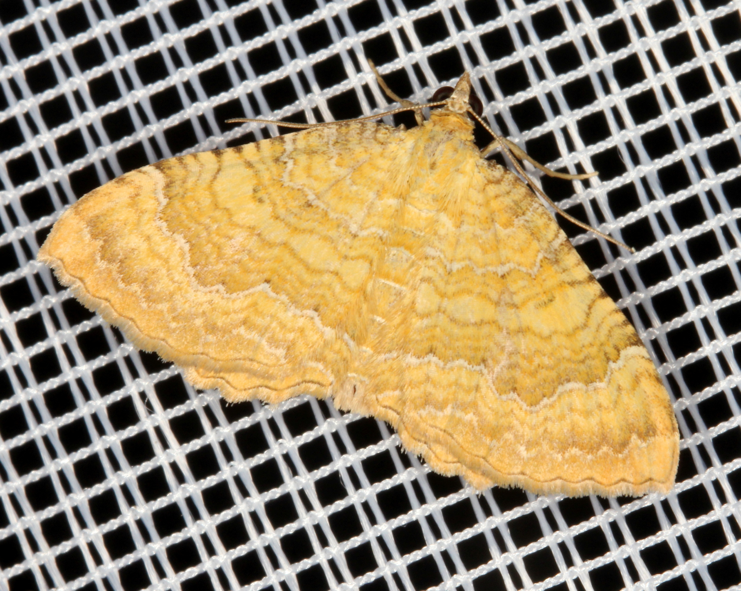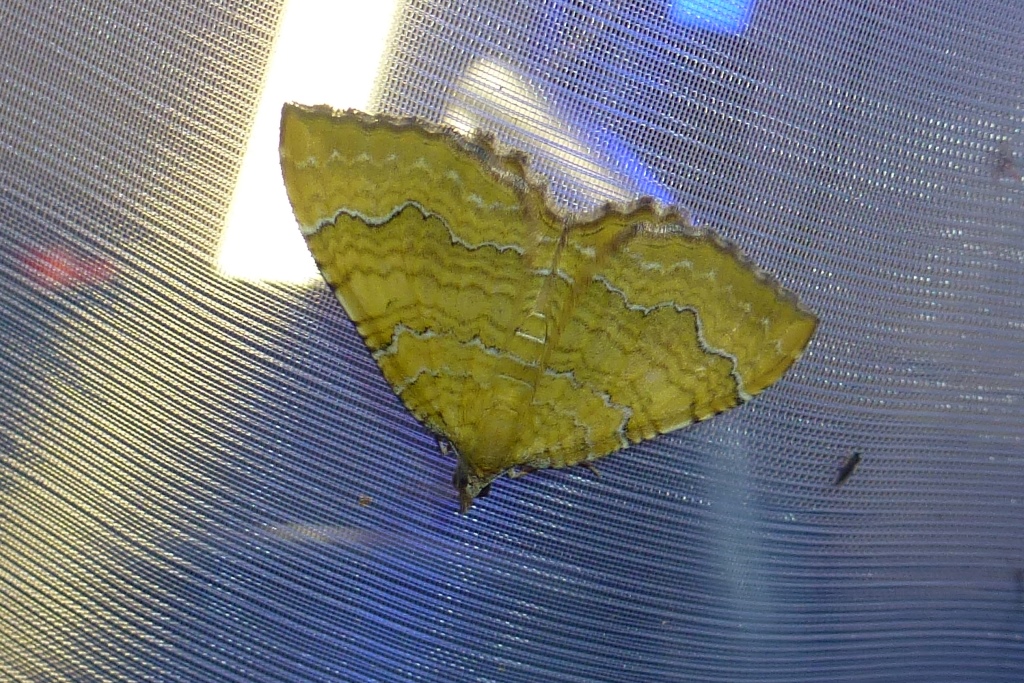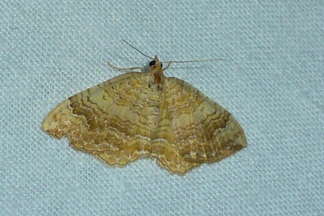 Ockergelbe Blattspanner, oder Löwenzahnspanner oder Brennnesselspanner (Camptogramma bilineata (Linnaeus, 1758)), am Licht, Radeberg, August 2013.