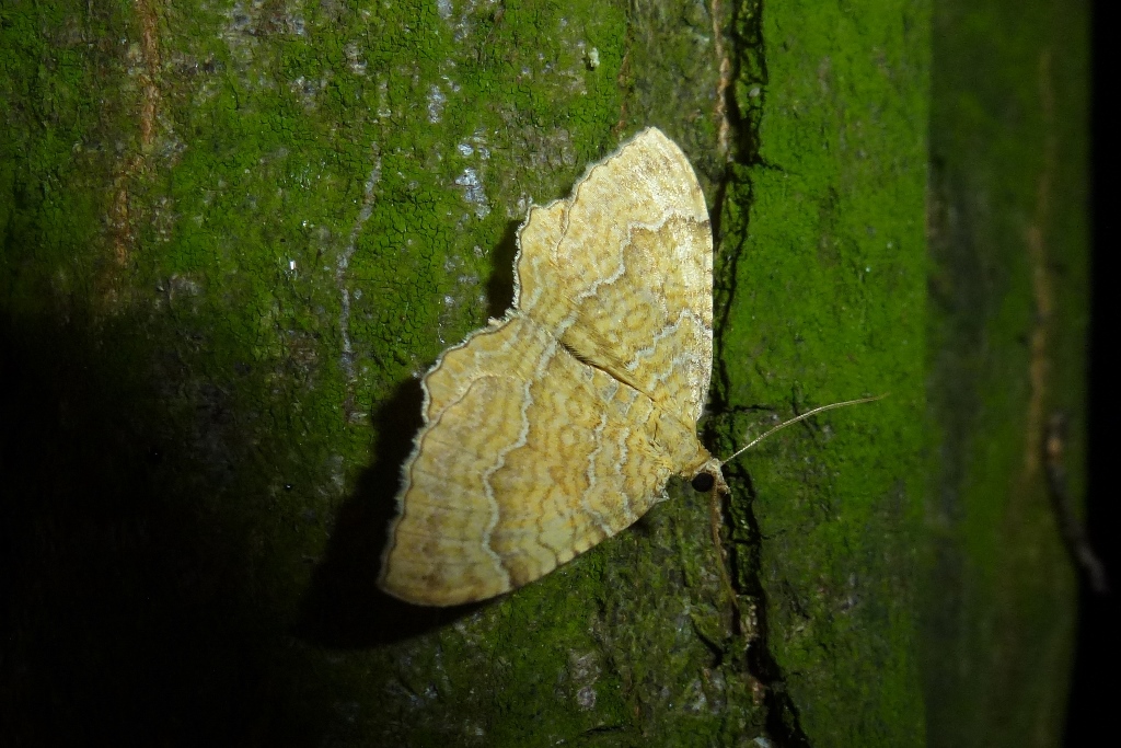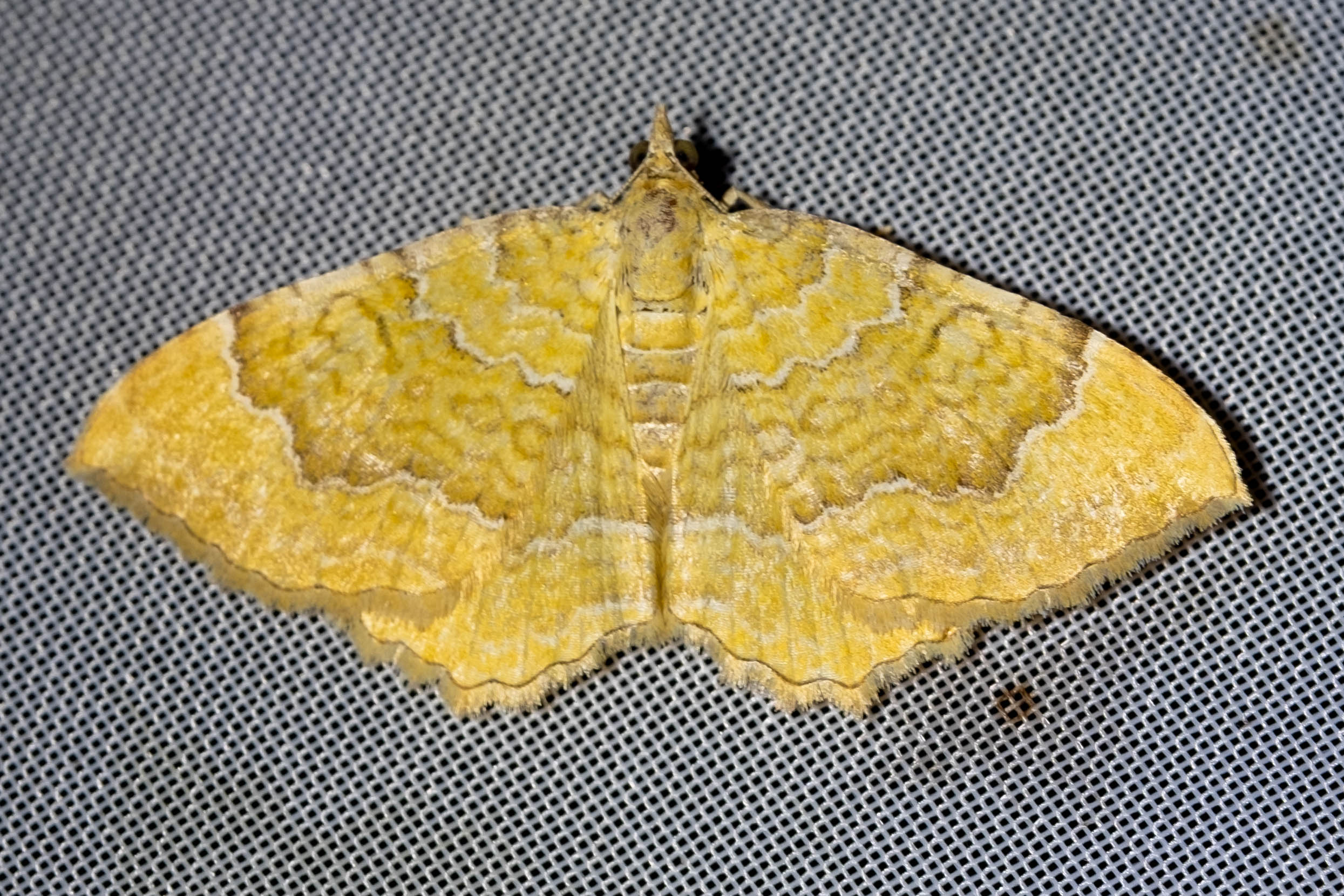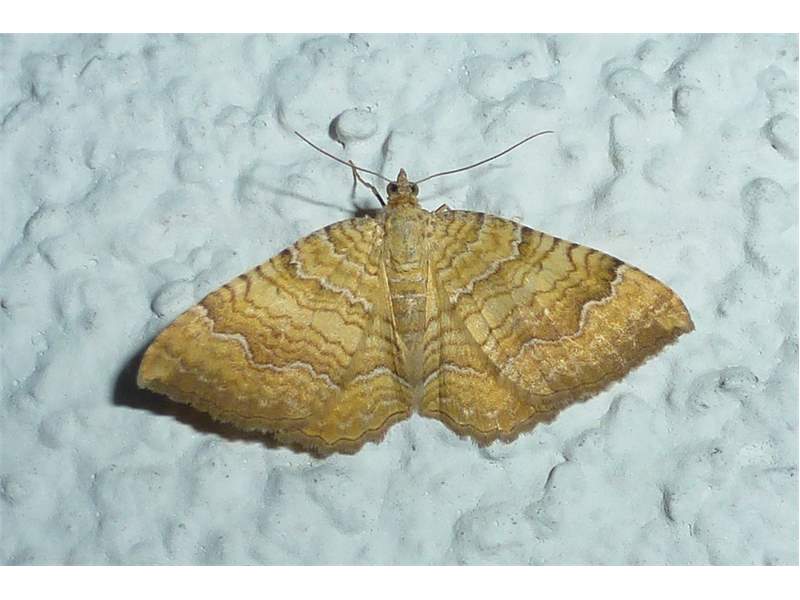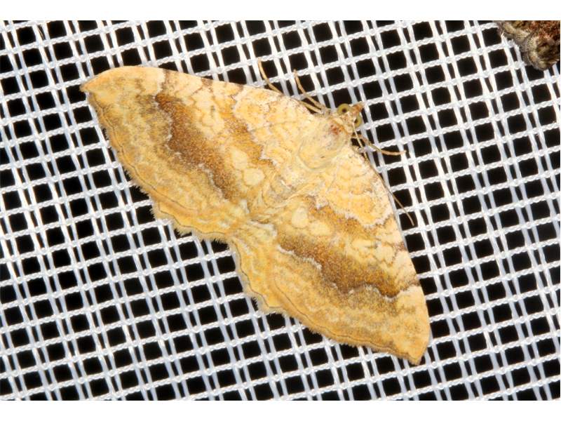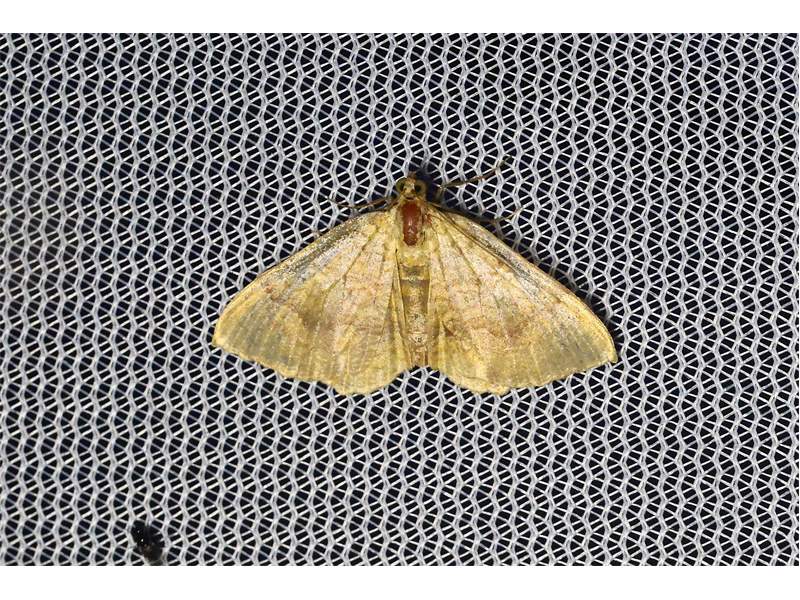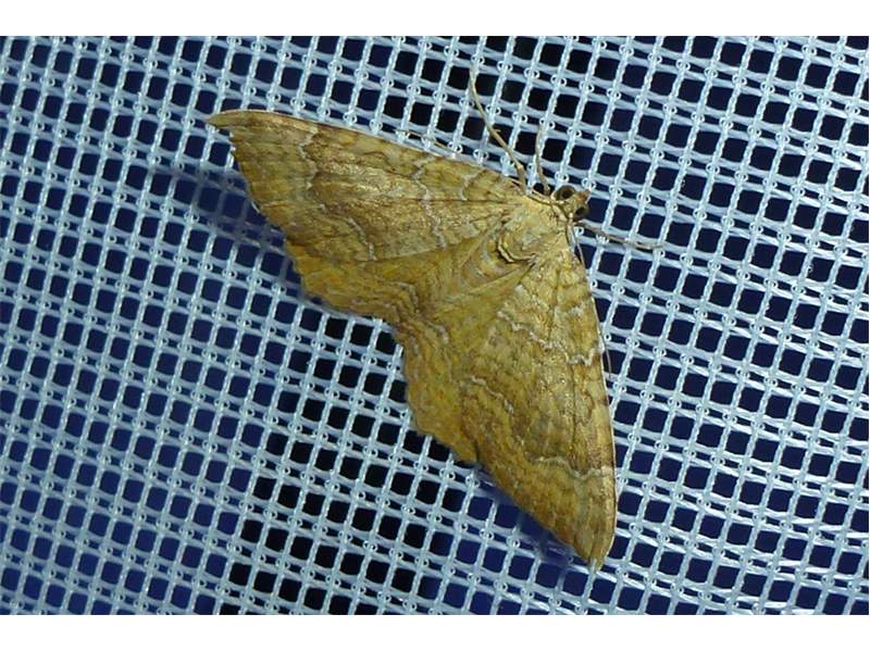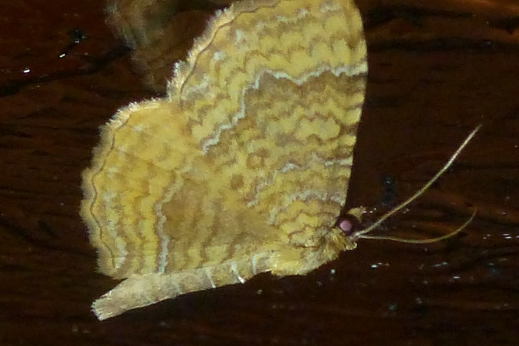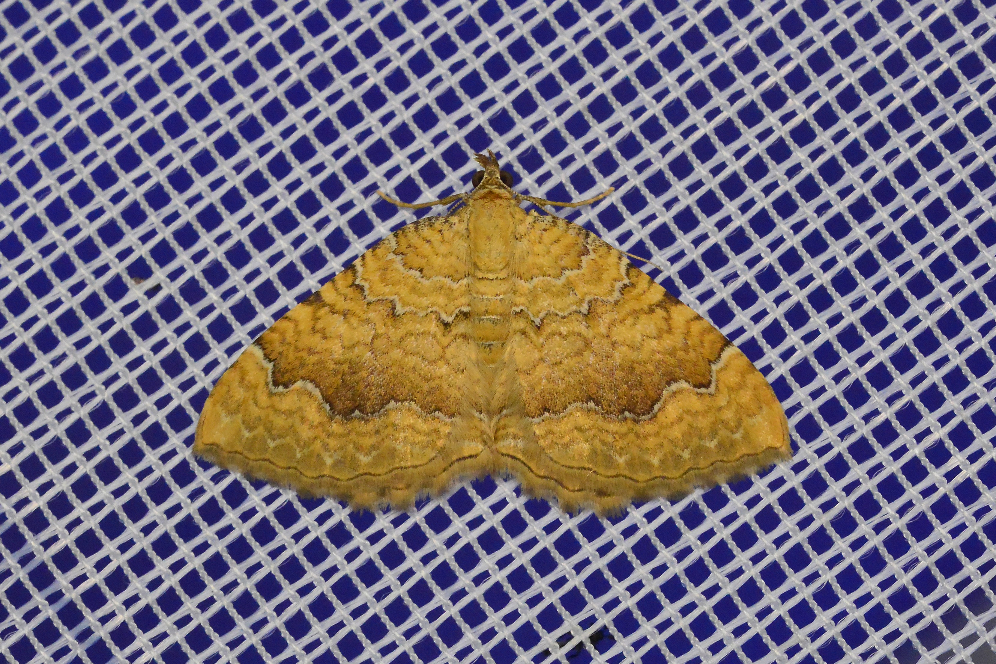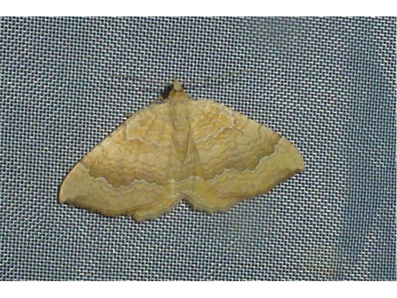 Ockergelbe Blattspanner, oder Löwenzahnspanner oder Brennnesselspanner (Camptogramma bilineata (Linnaeus, 1758)), am Licht, Radeberg, August 2013.
