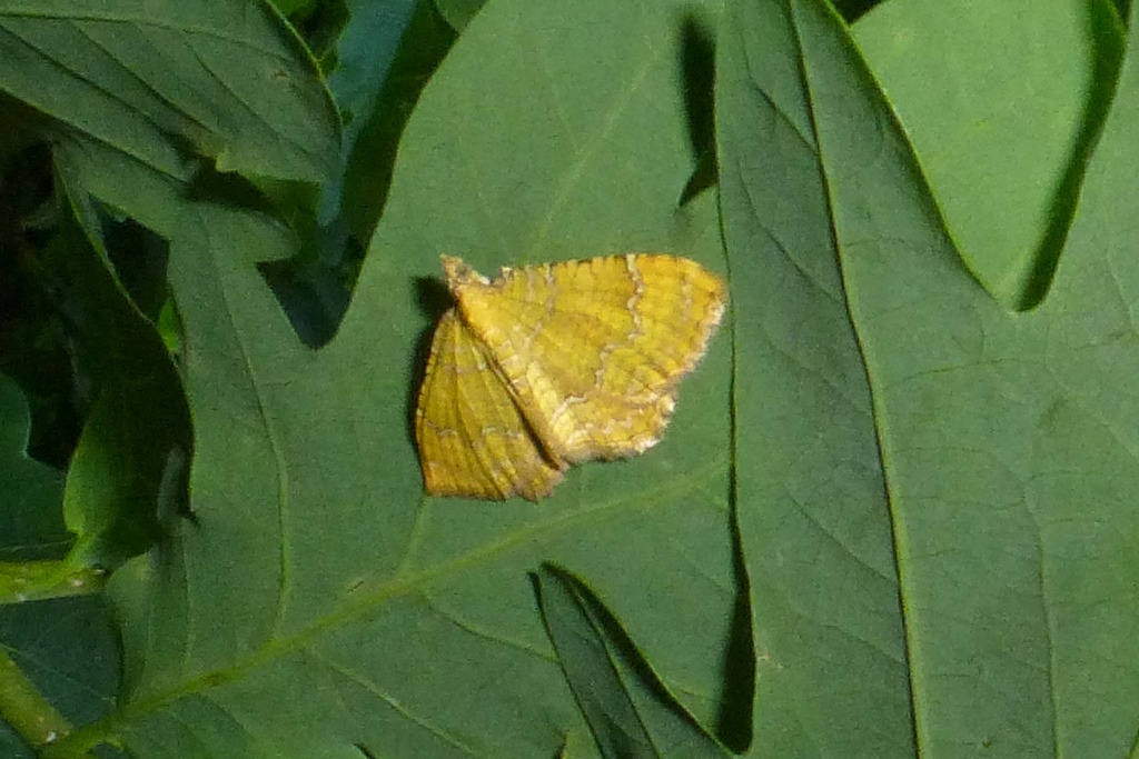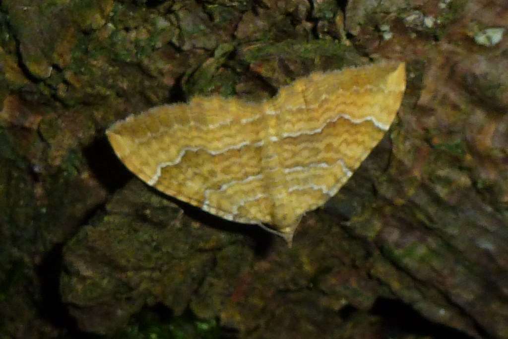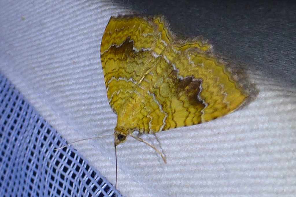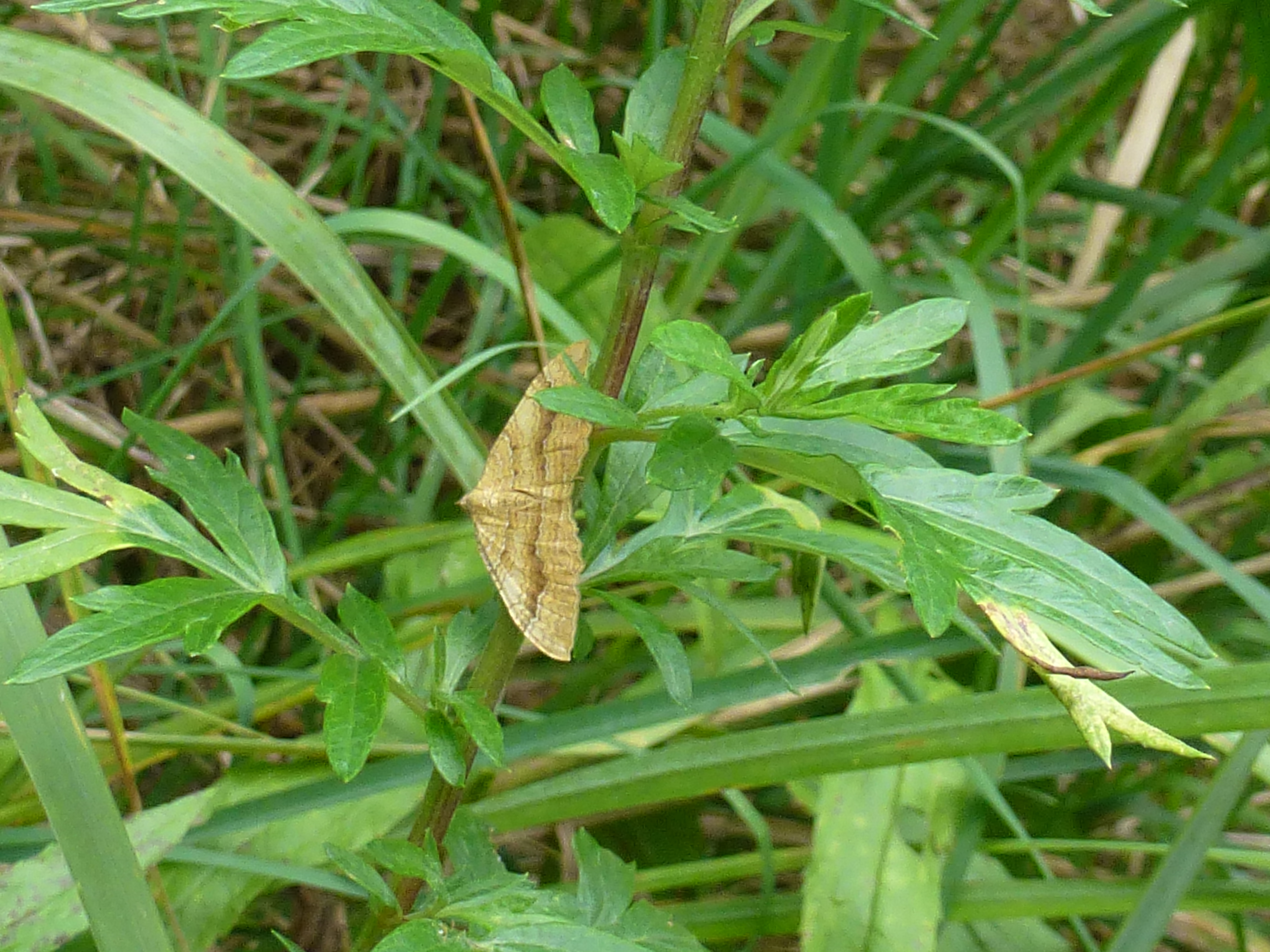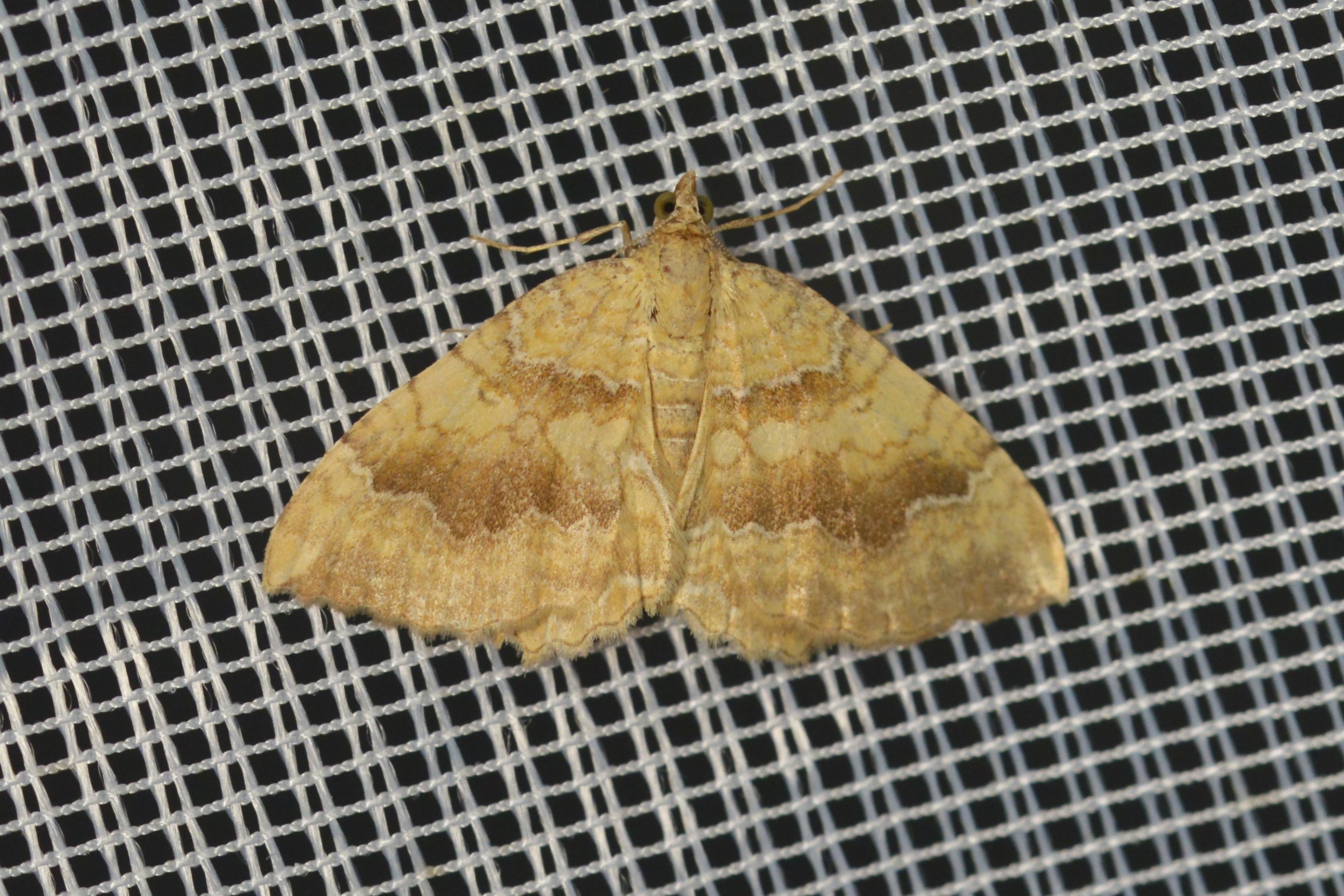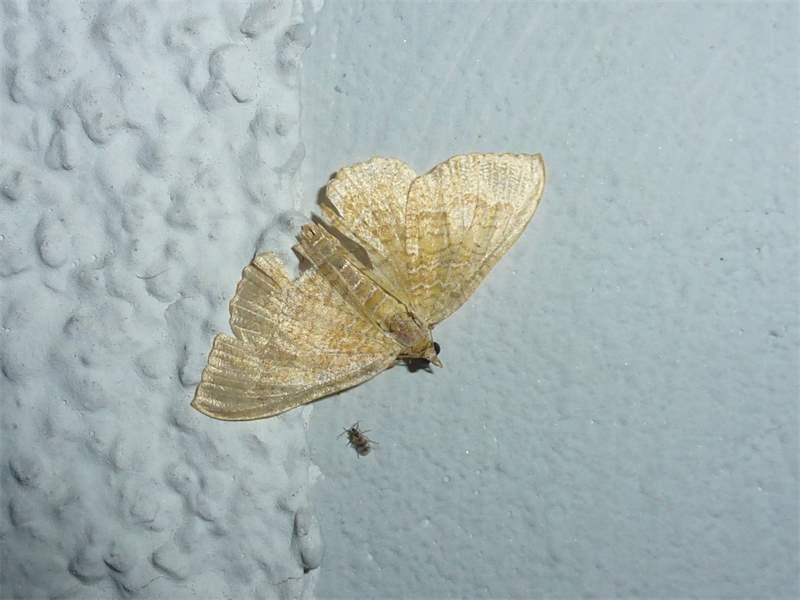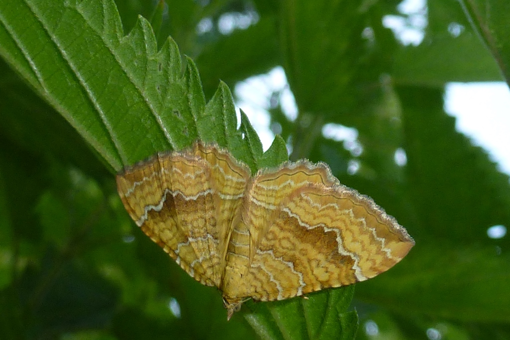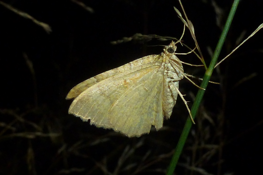 Ockergelbe Blattspanner, oder Löwenzahnspanner oder Brennnesselspanner (Camptogramma bilineata (Linnaeus, 1758)), am Licht, Radeberg, August 2013.