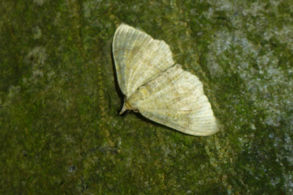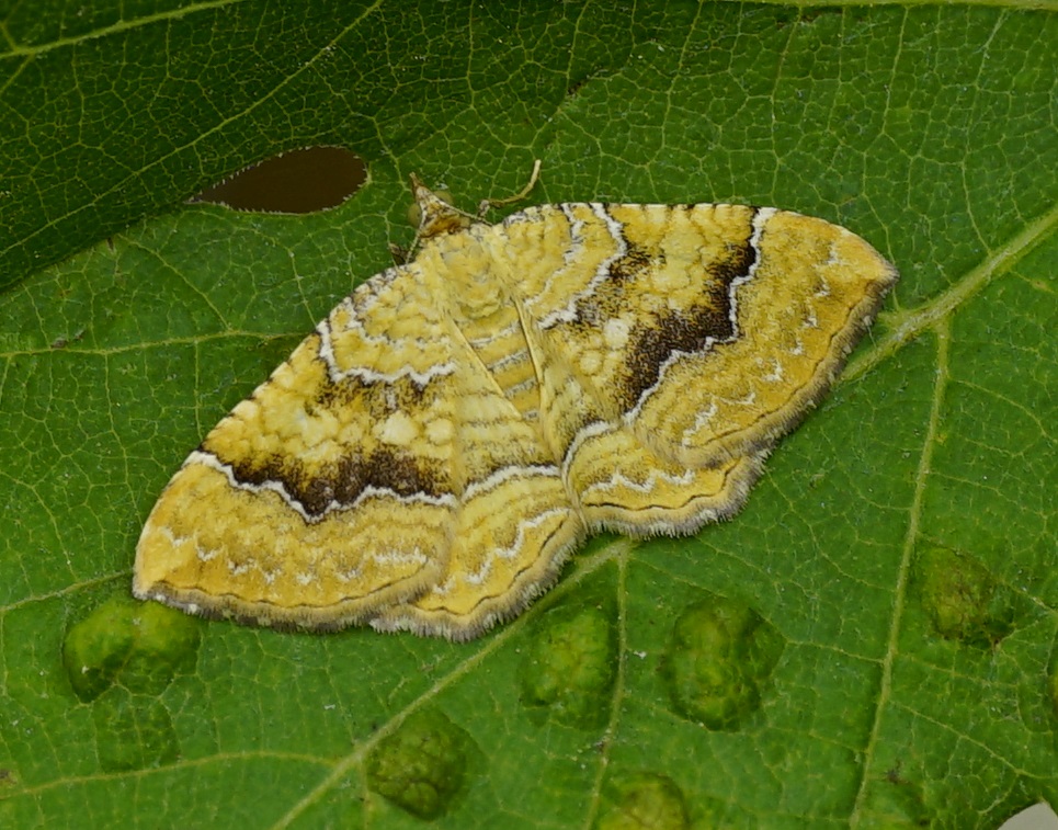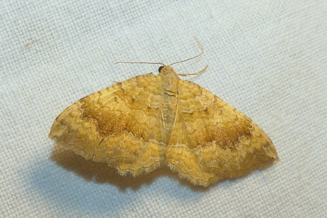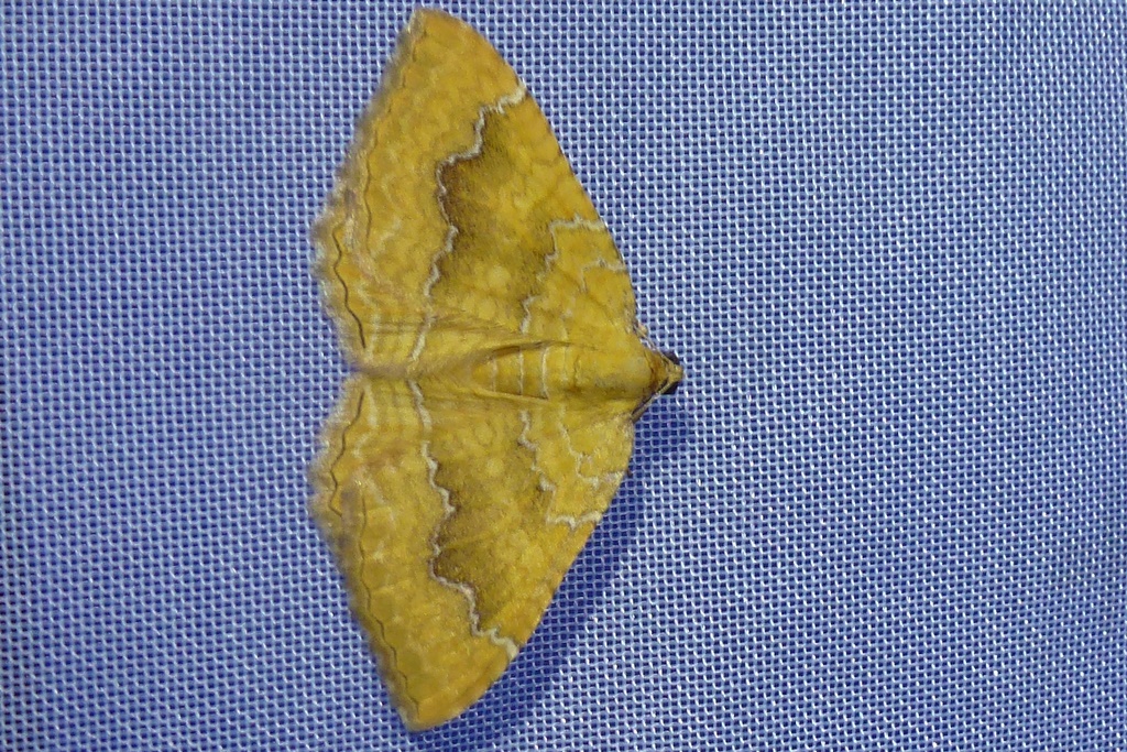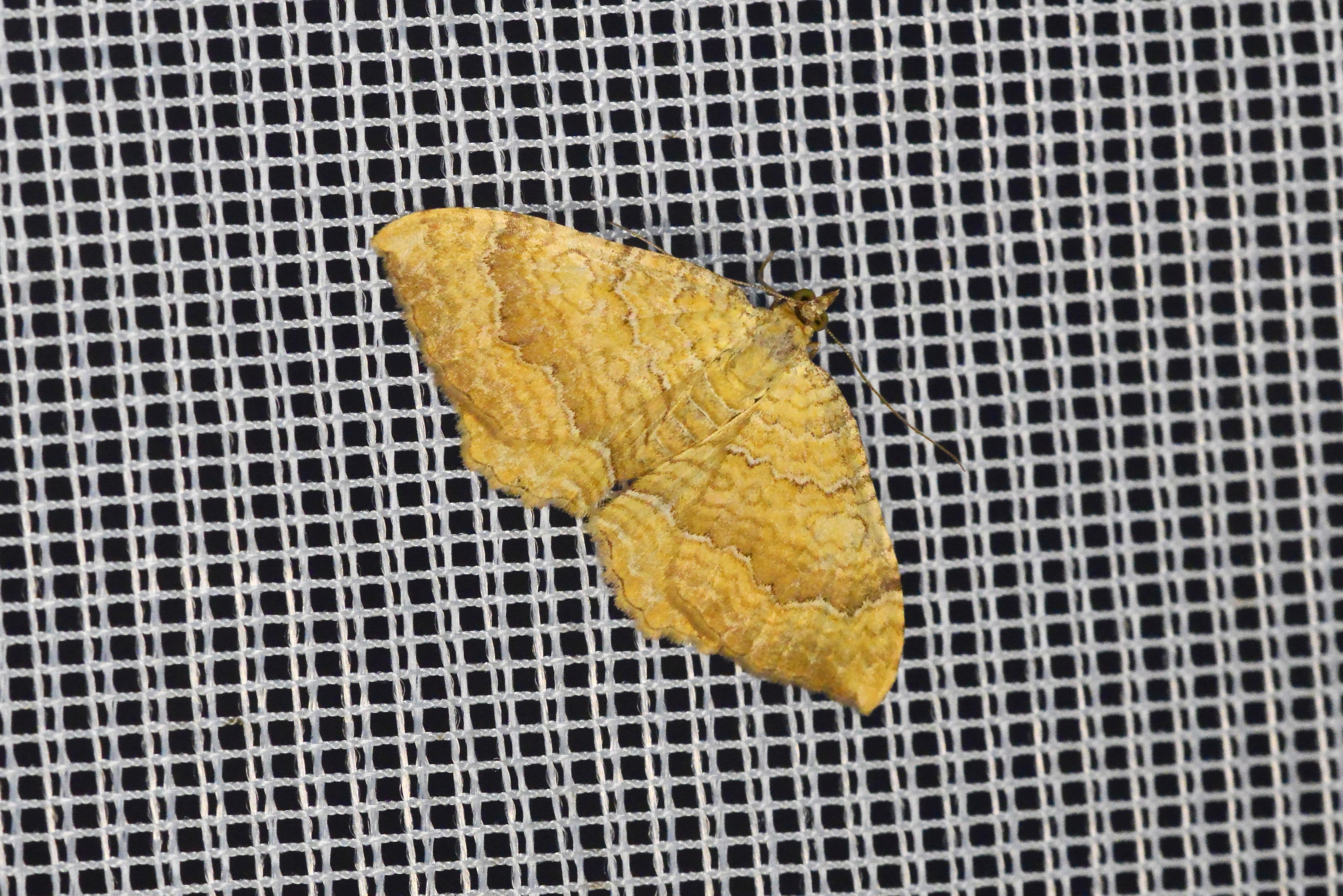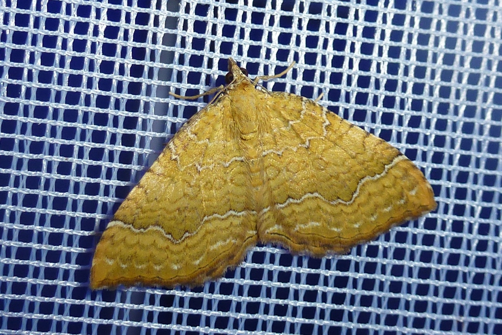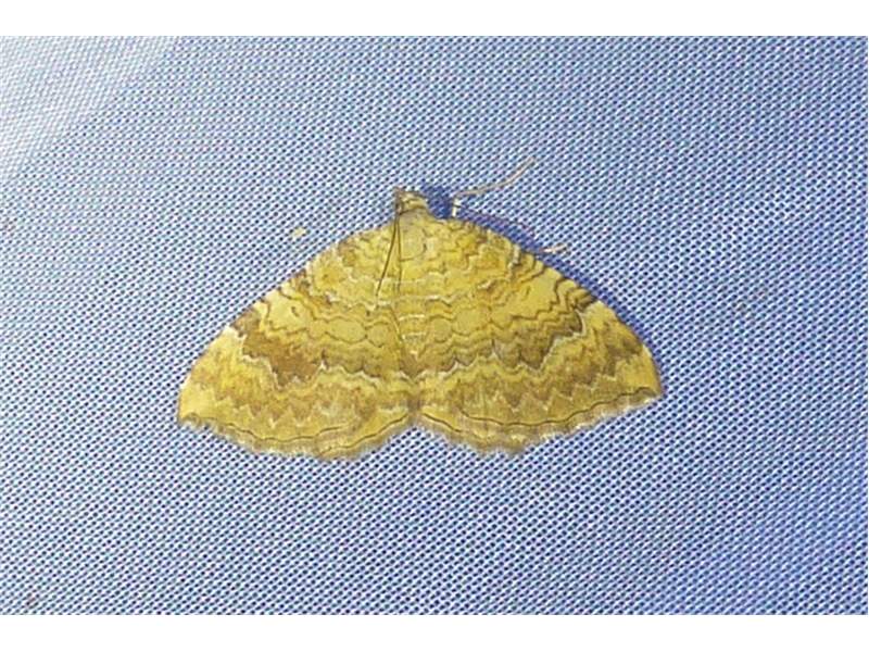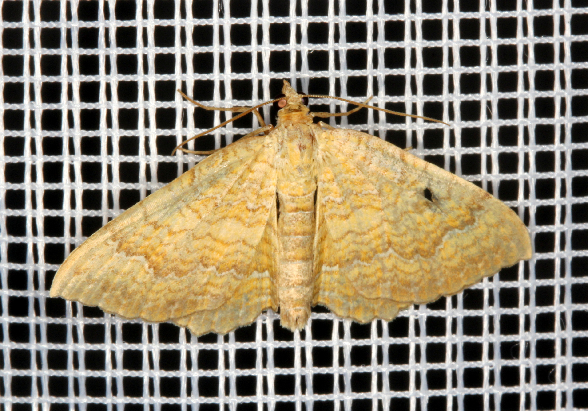 Ockergelbe Blattspanner, oder Löwenzahnspanner oder Brennnesselspanner (Camptogramma bilineata (Linnaeus, 1758)), am Licht, Radeberg, August 2013.