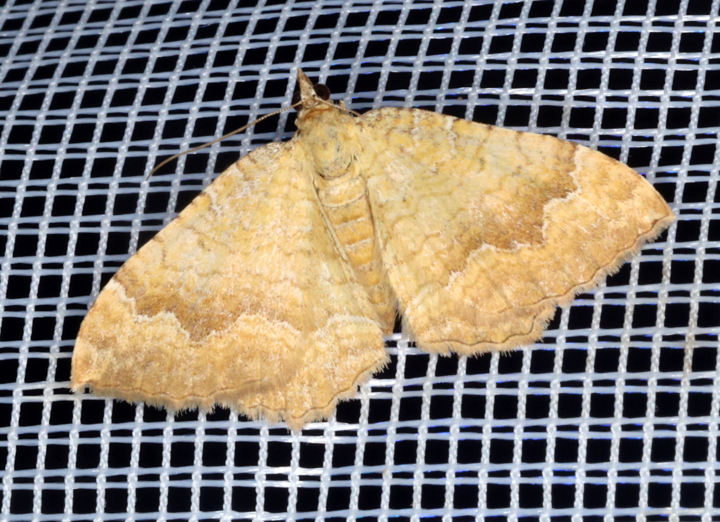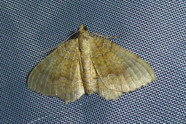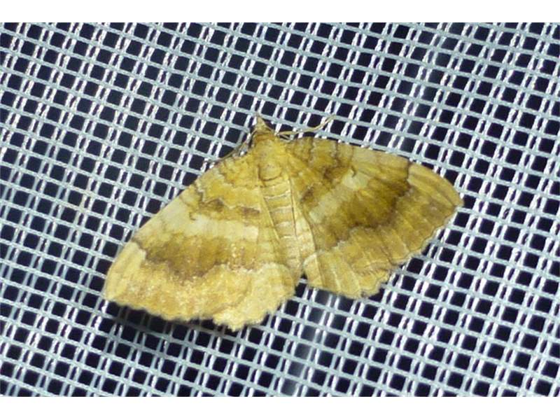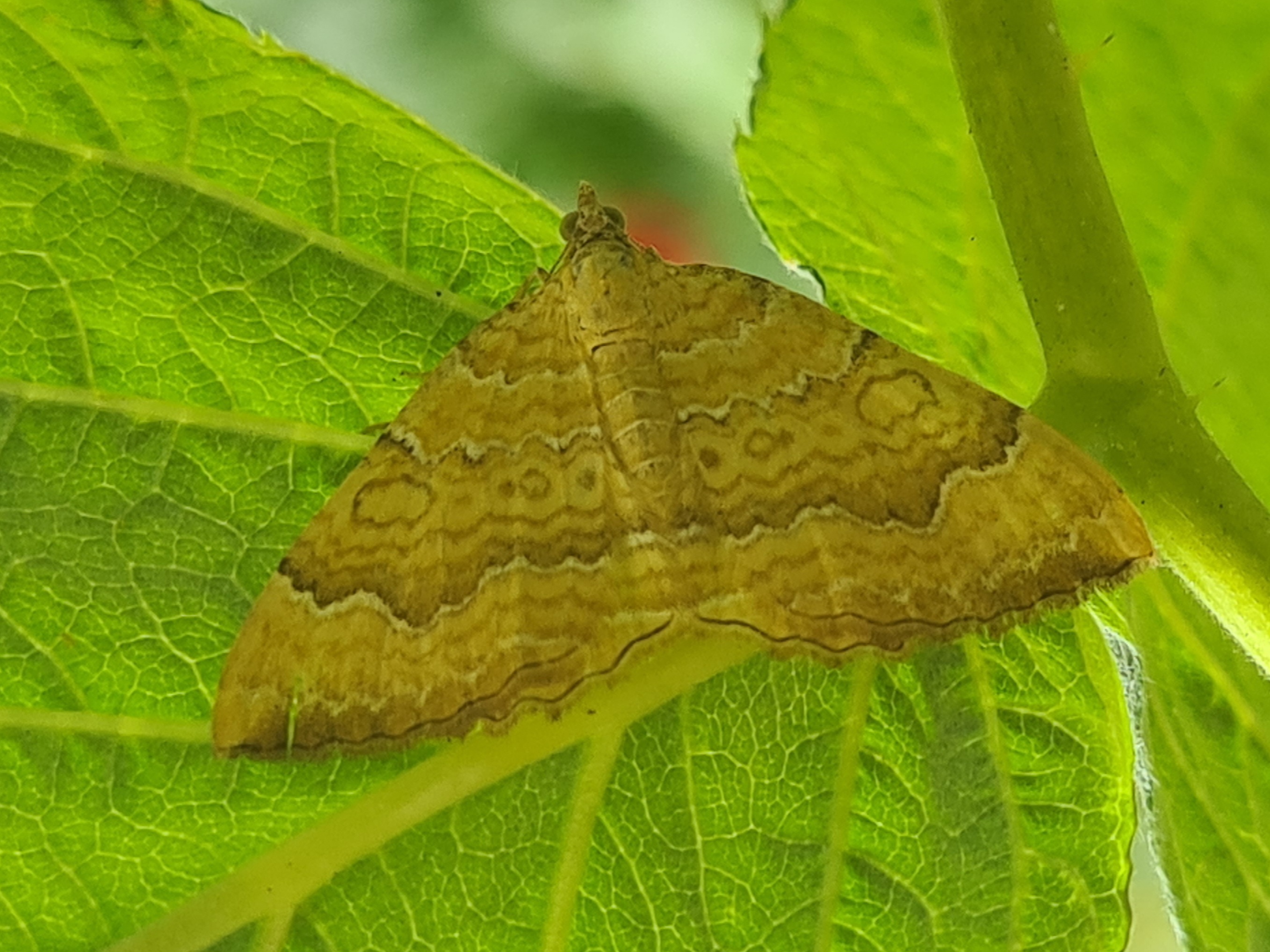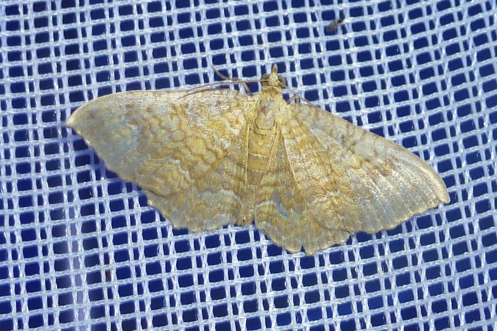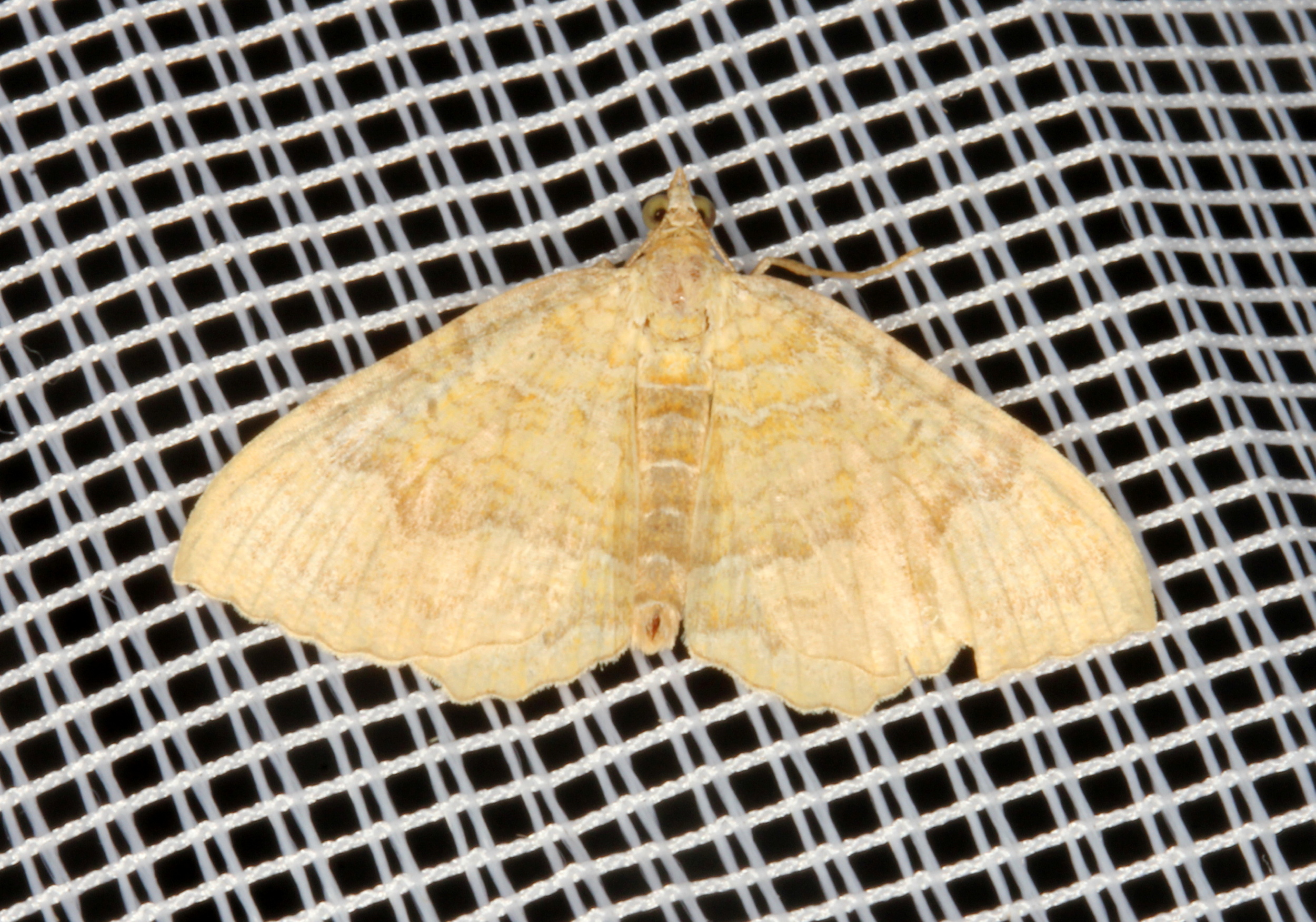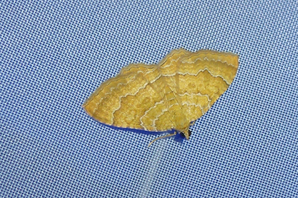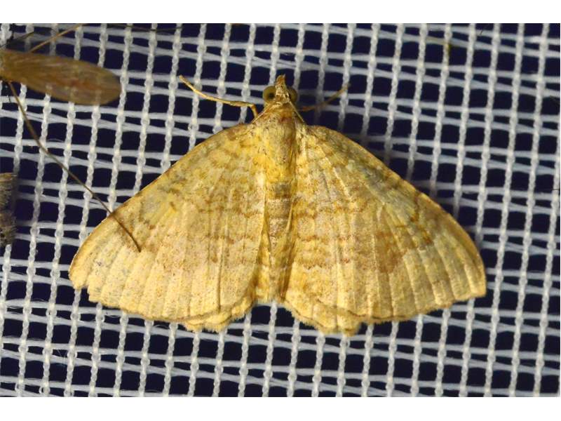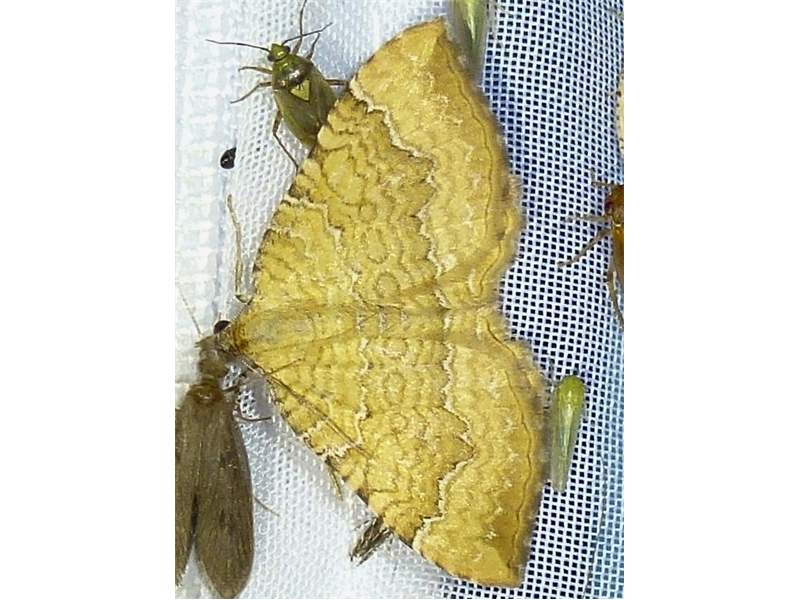 Ockergelbe Blattspanner, oder Löwenzahnspanner oder Brennnesselspanner (Camptogramma bilineata (Linnaeus, 1758)), am Licht, Radeberg, August 2013.