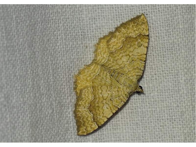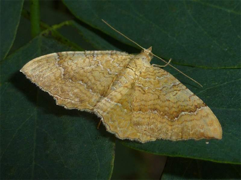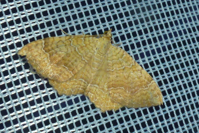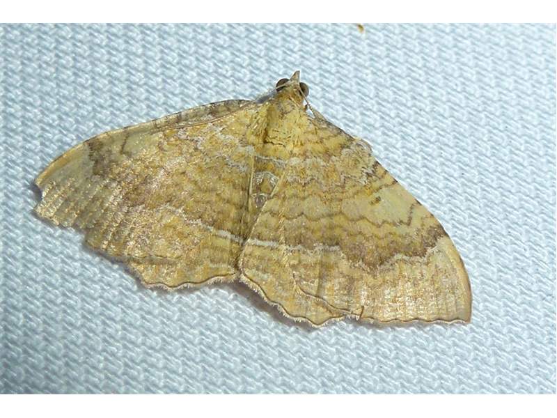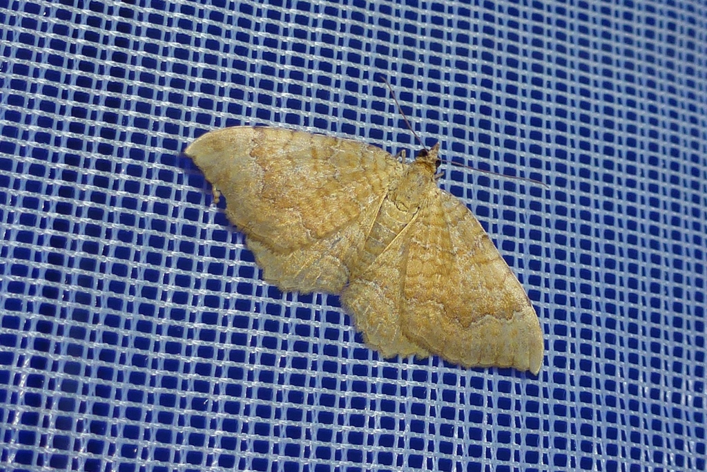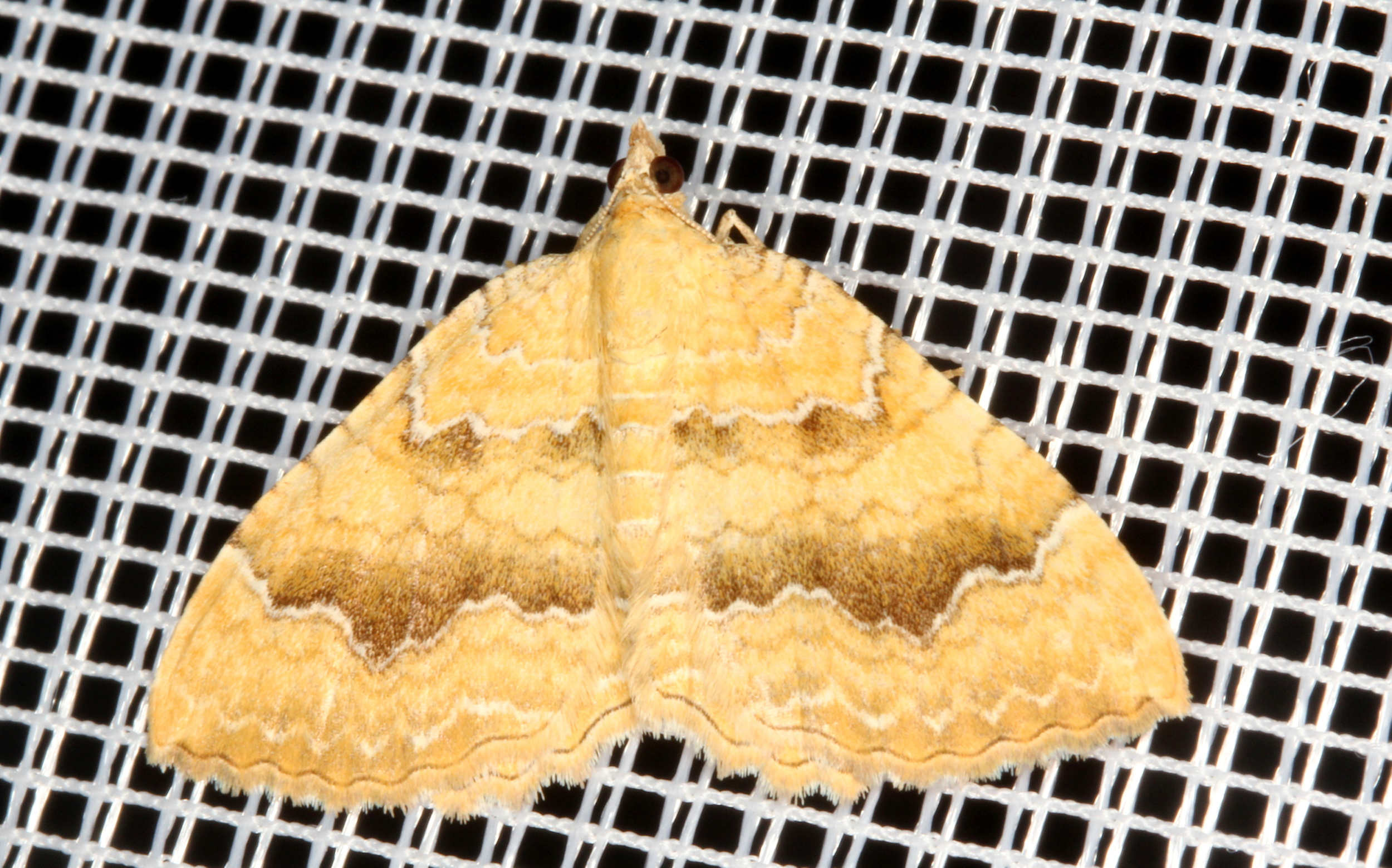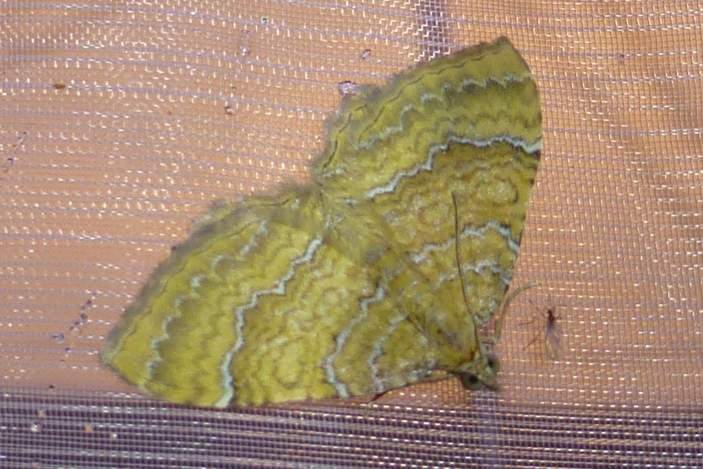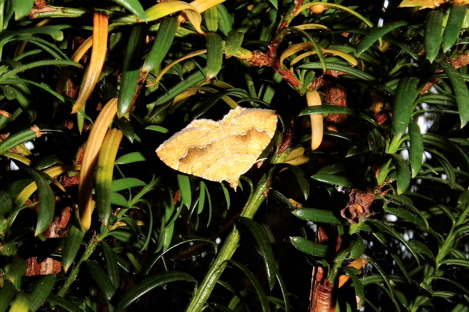 Ockergelbe Blattspanner, oder Löwenzahnspanner oder Brennnesselspanner (Camptogramma bilineata (Linnaeus, 1758)), am Licht, Radeberg, August 2013.