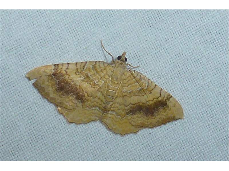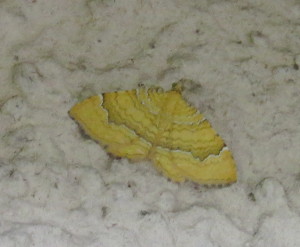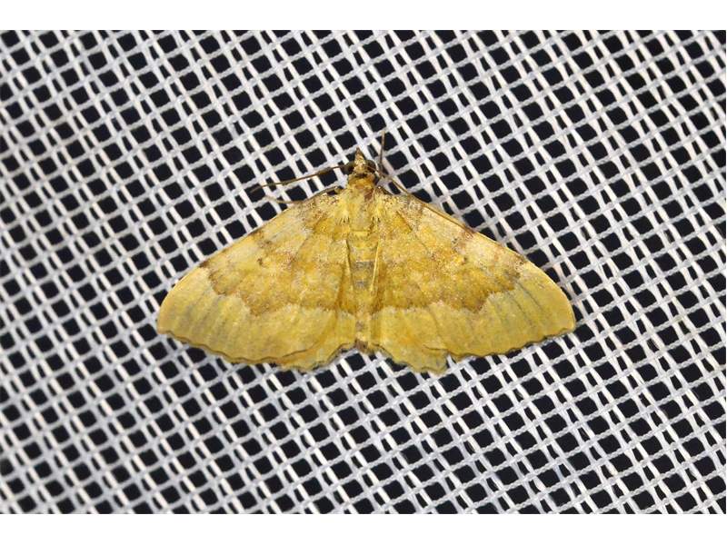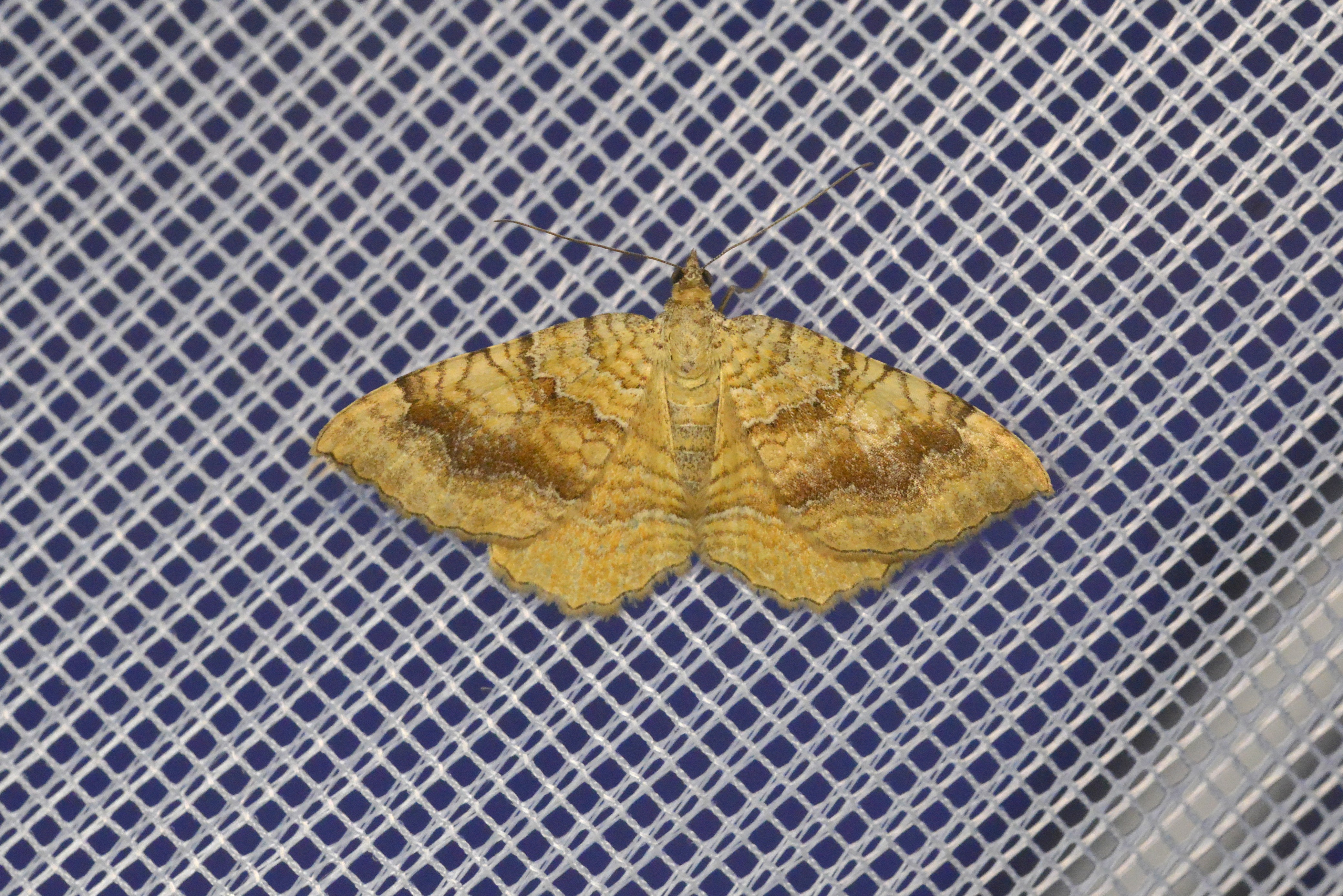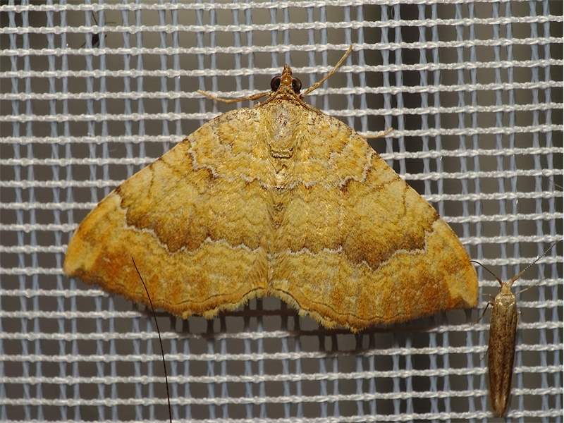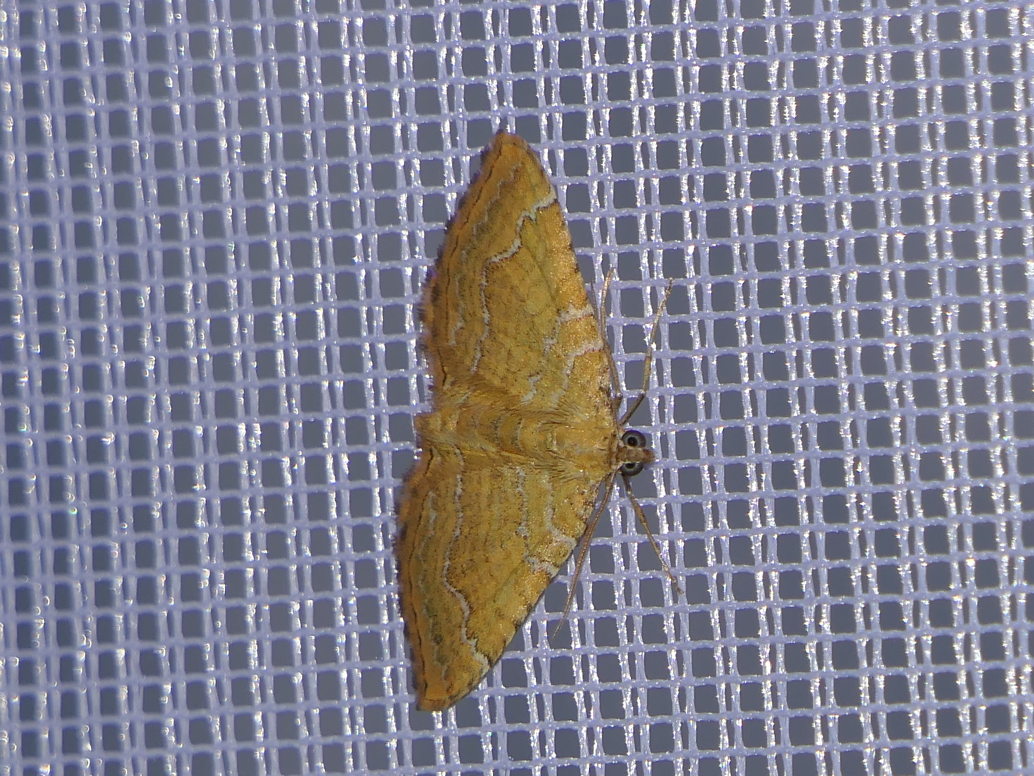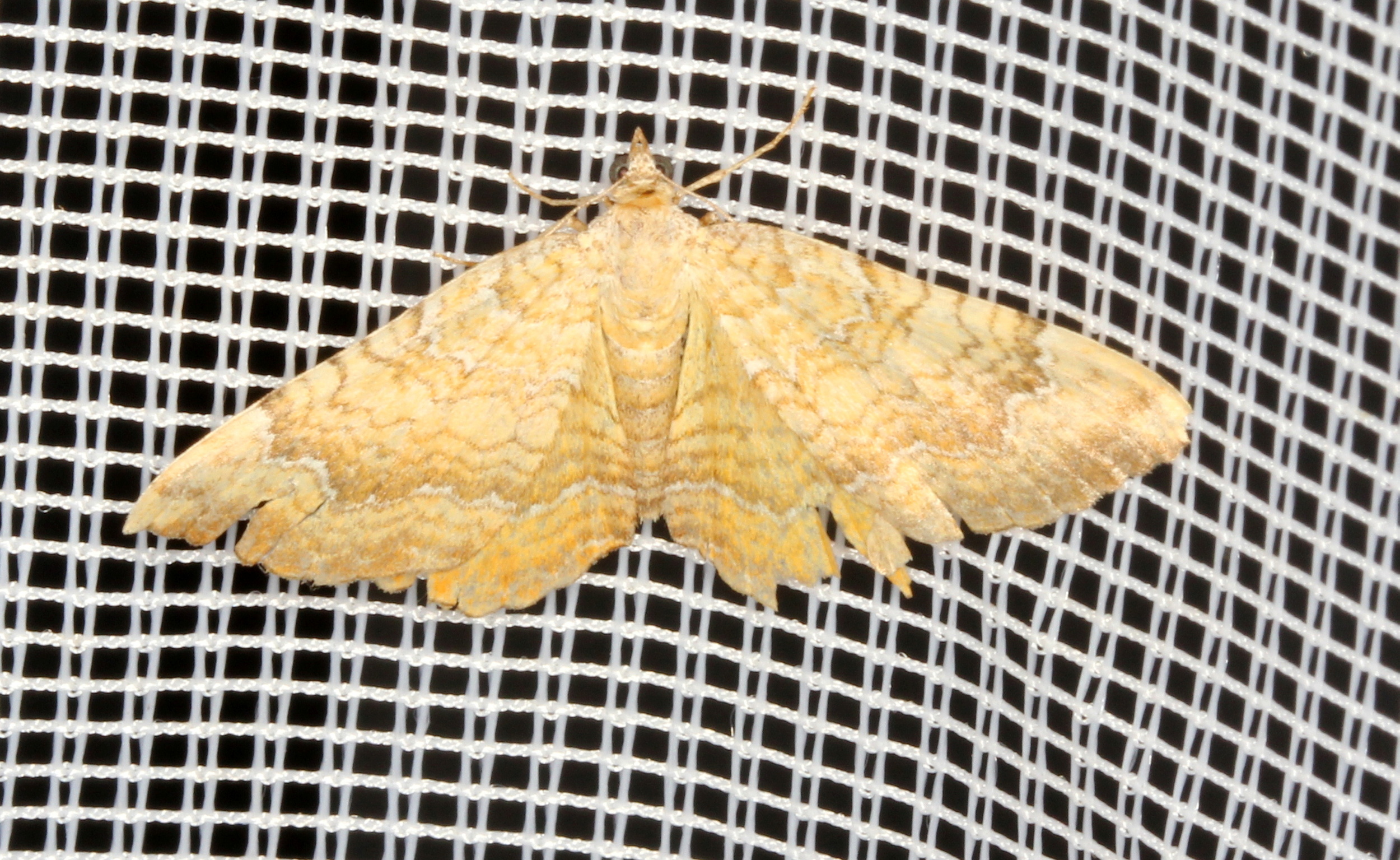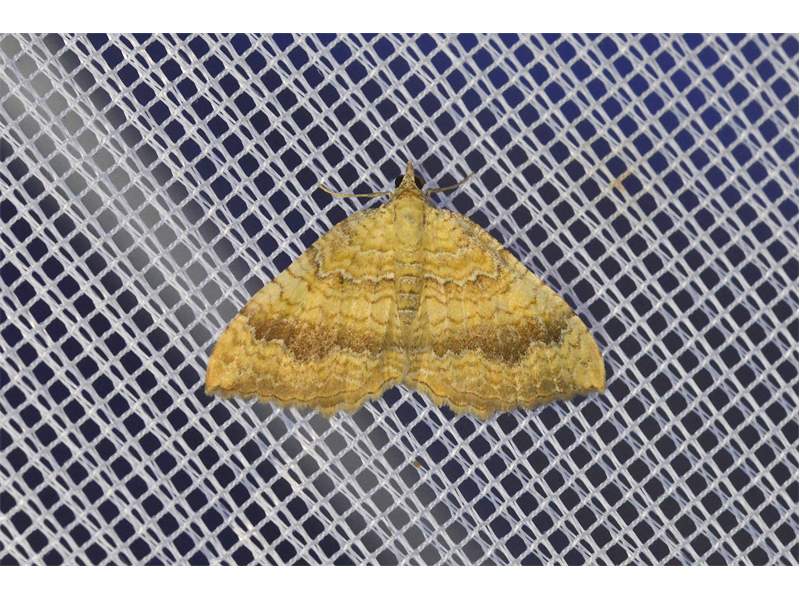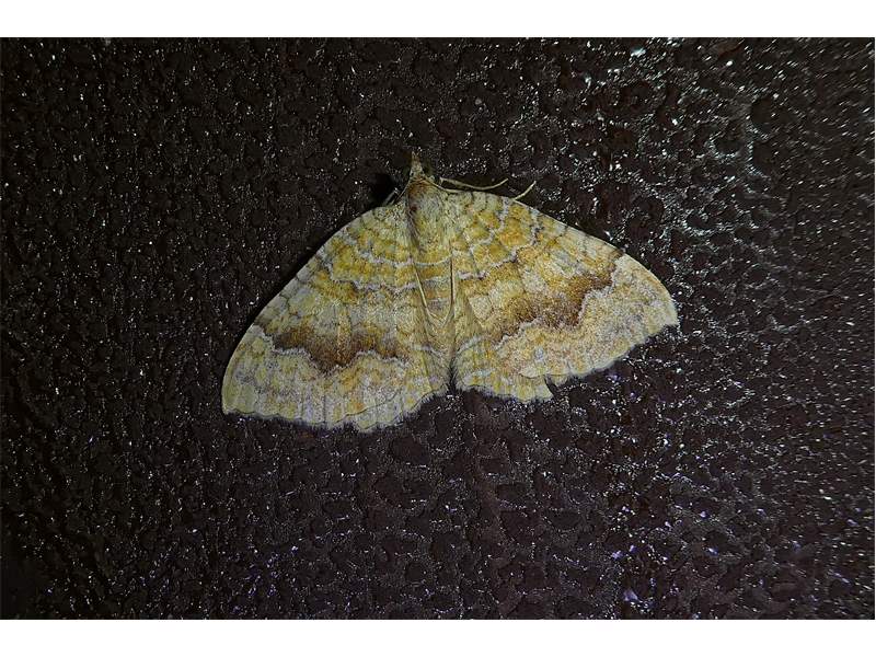 Ockergelbe Blattspanner, oder Löwenzahnspanner oder Brennnesselspanner (Camptogramma bilineata (Linnaeus, 1758)), am Licht, Radeberg, August 2013.