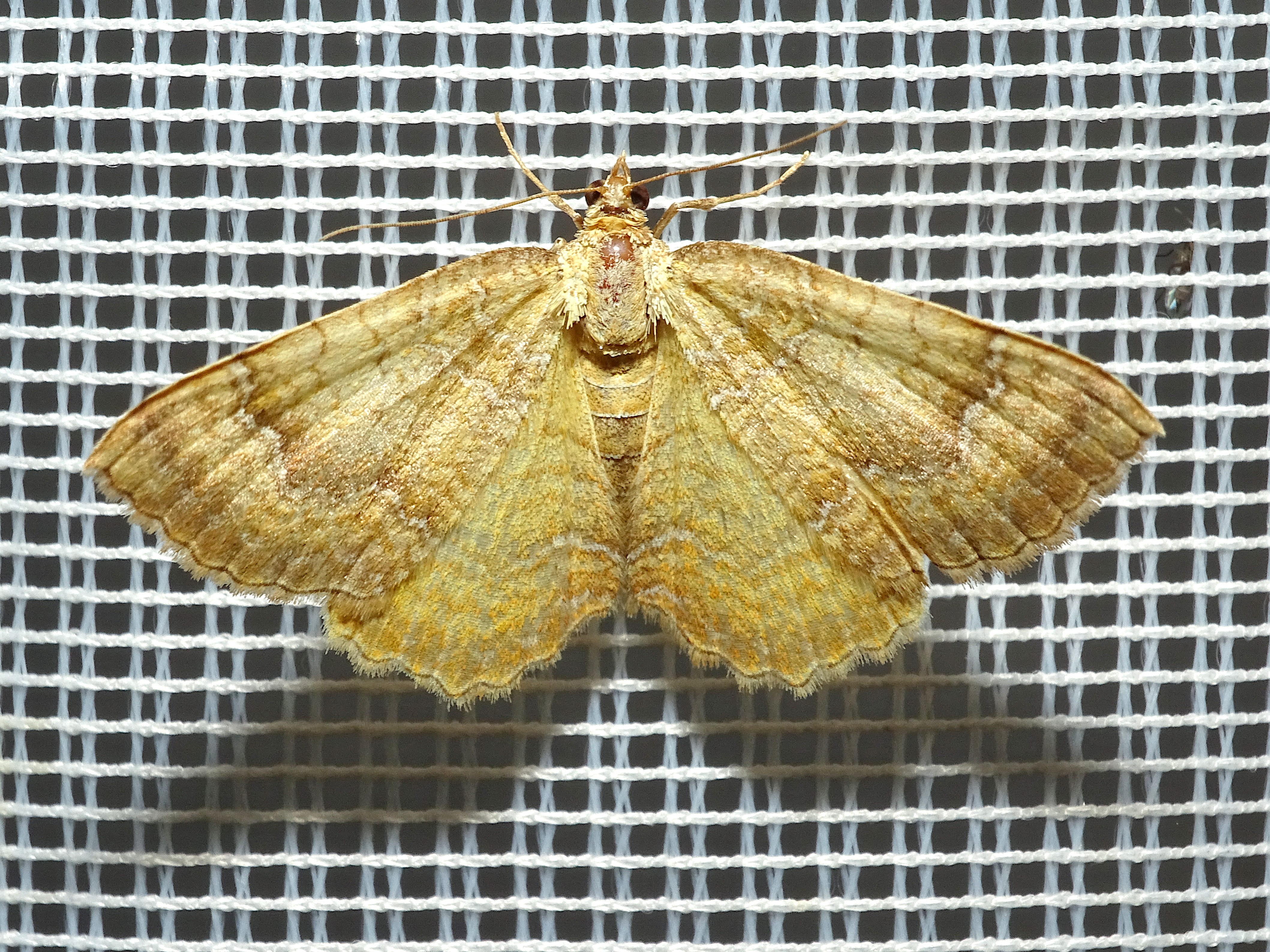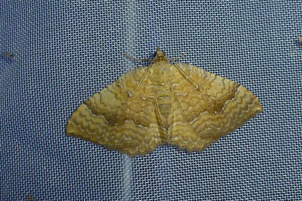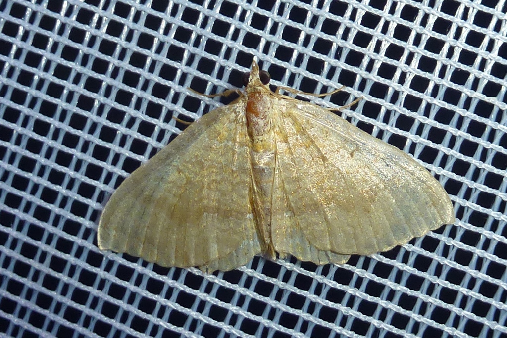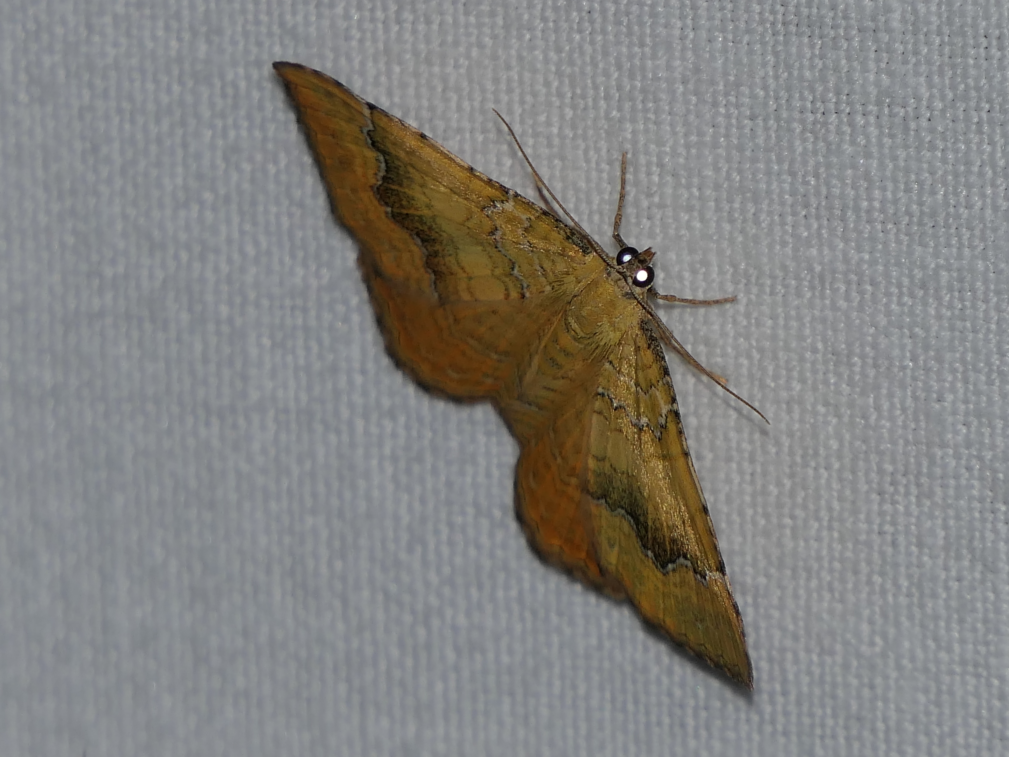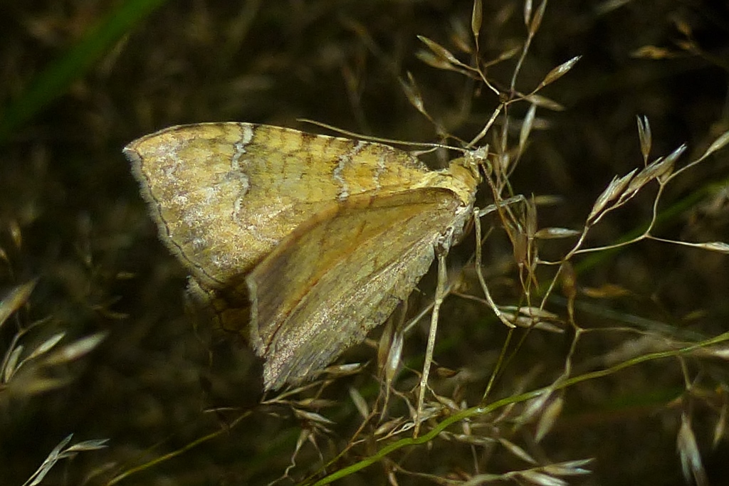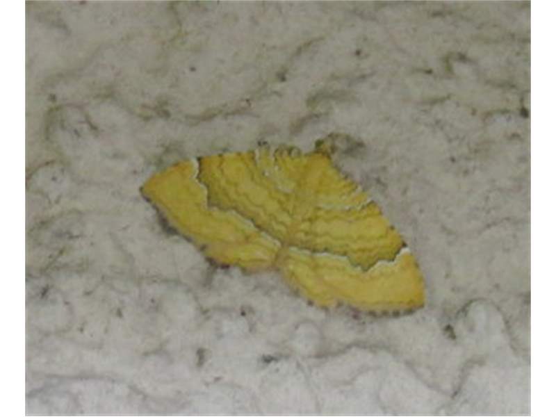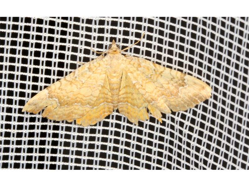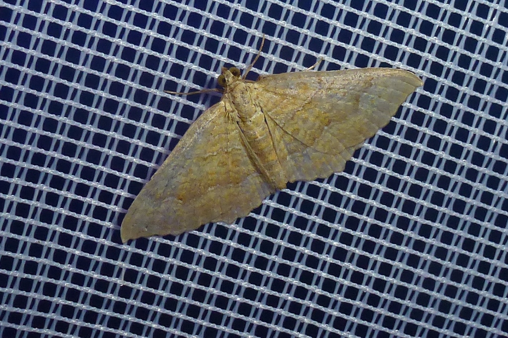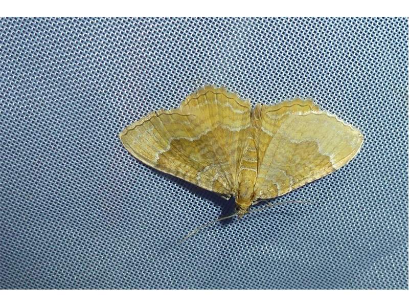 Ockergelbe Blattspanner, oder Löwenzahnspanner oder Brennnesselspanner (Camptogramma bilineata (Linnaeus, 1758)), am Licht, Radeberg, August 2013.