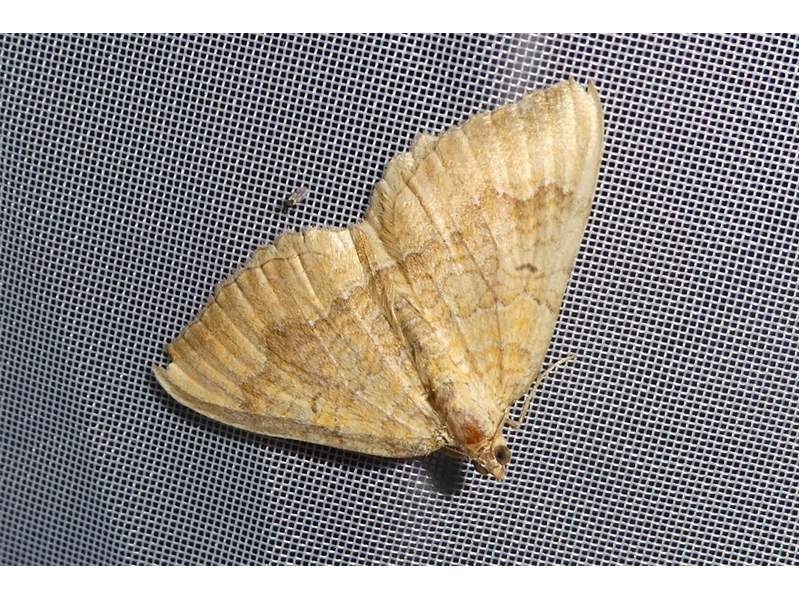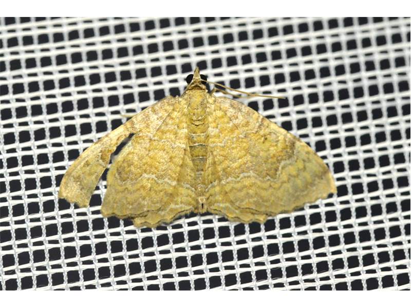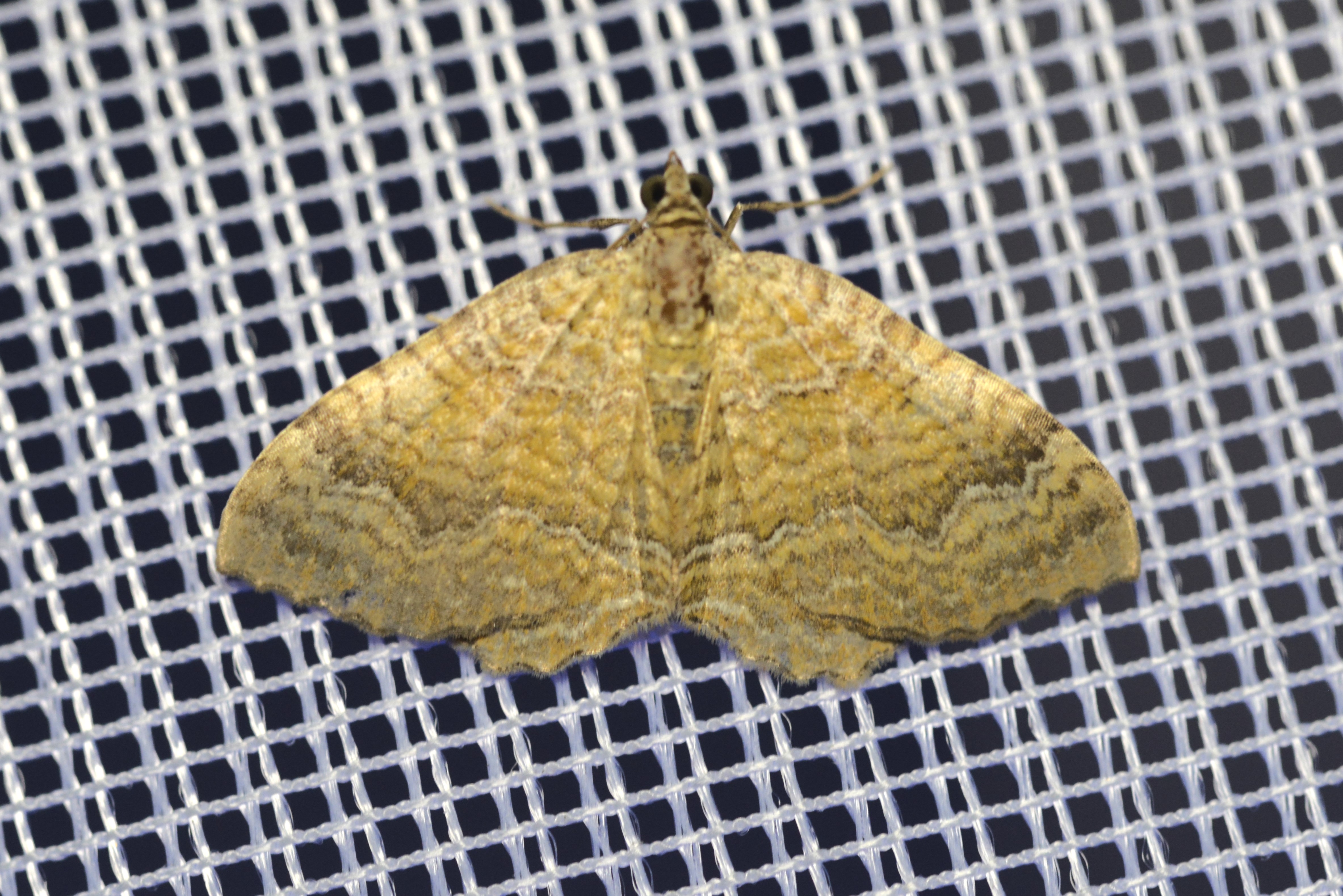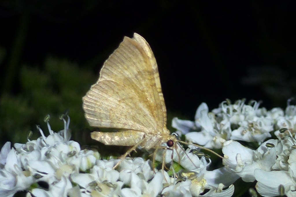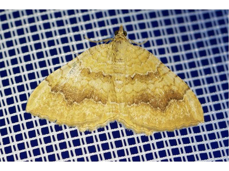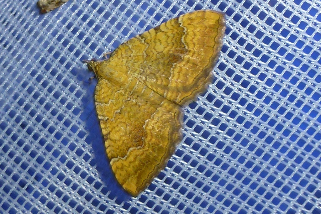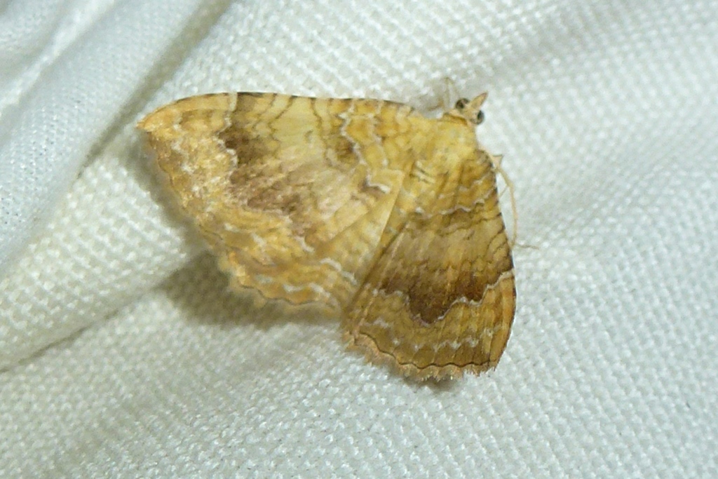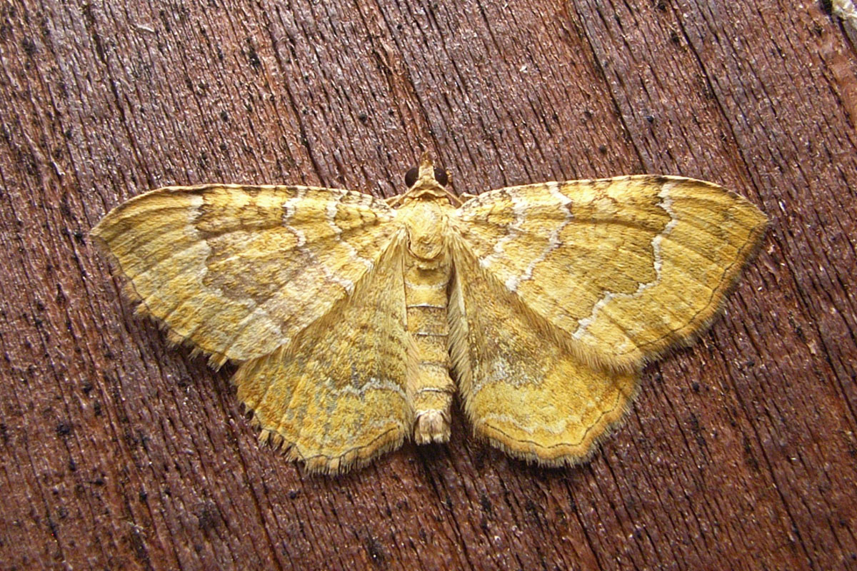 Ockergelbe Blattspanner, oder Löwenzahnspanner oder Brennnesselspanner (Camptogramma bilineata (Linnaeus, 1758)), am Licht, Radeberg, August 2013.