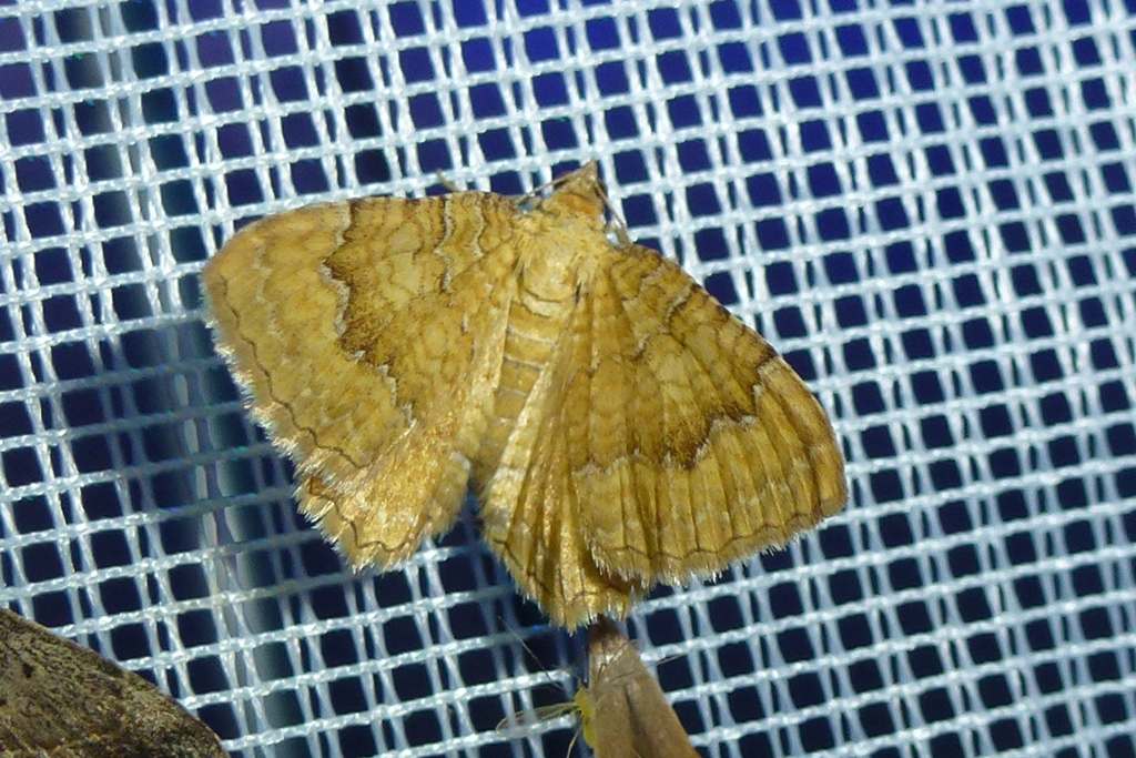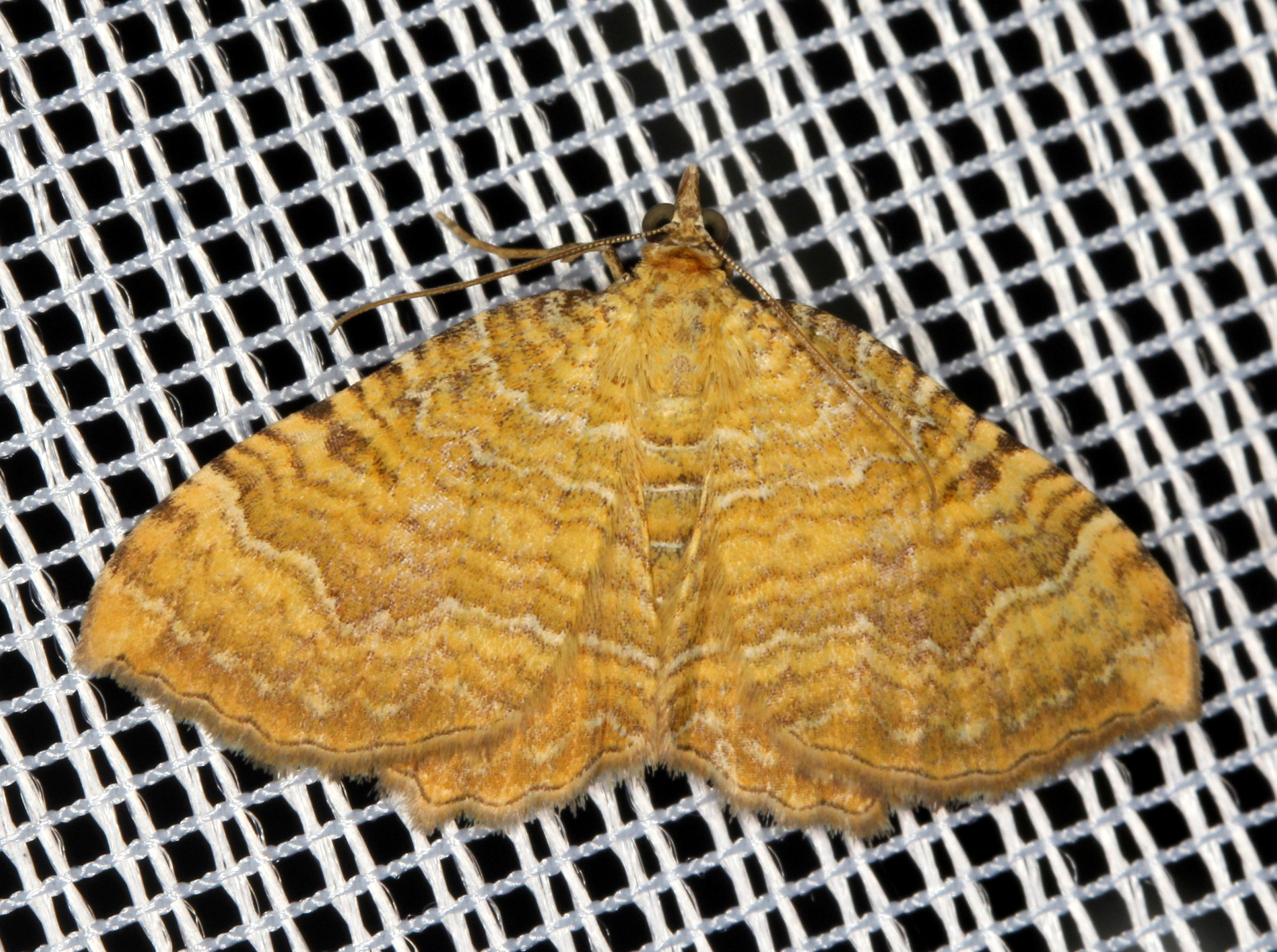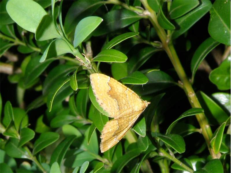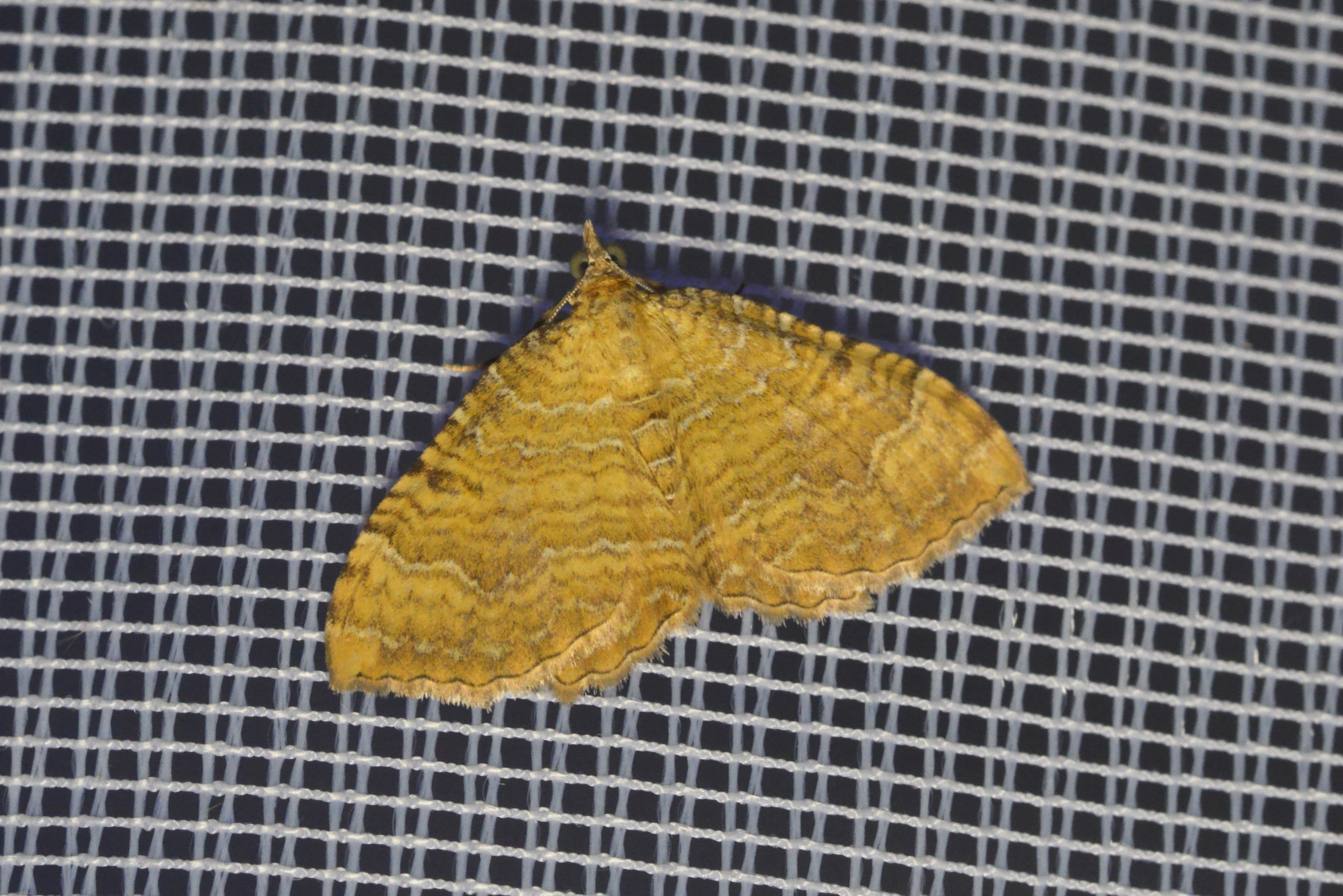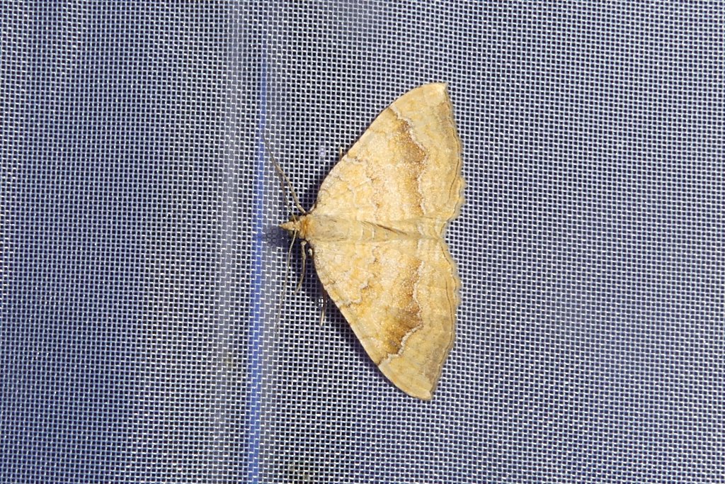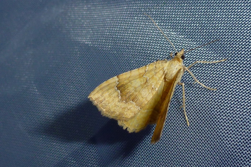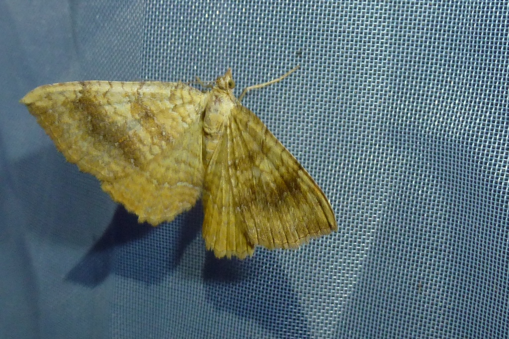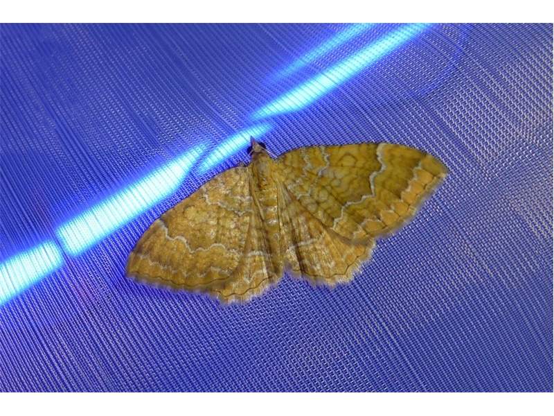 Ockergelbe Blattspanner, oder Löwenzahnspanner oder Brennnesselspanner (Camptogramma bilineata (Linnaeus, 1758)), am Licht, Radeberg, August 2013.