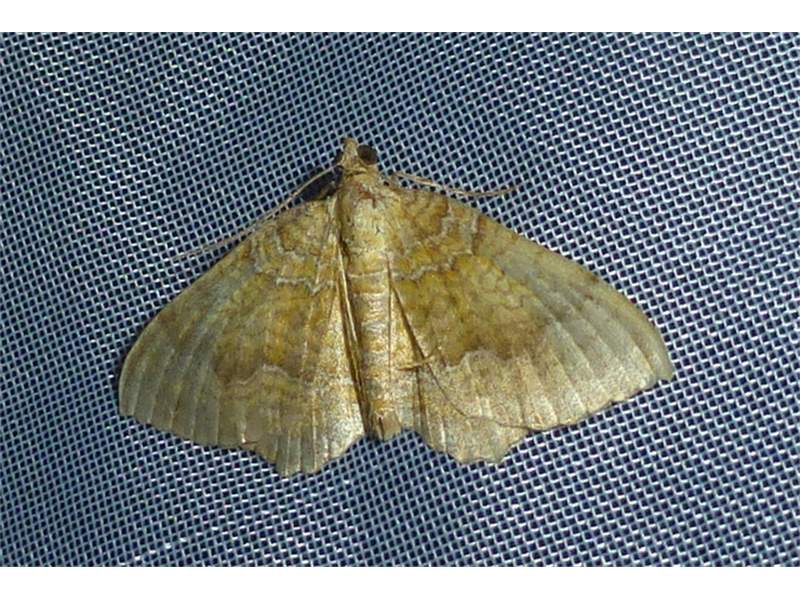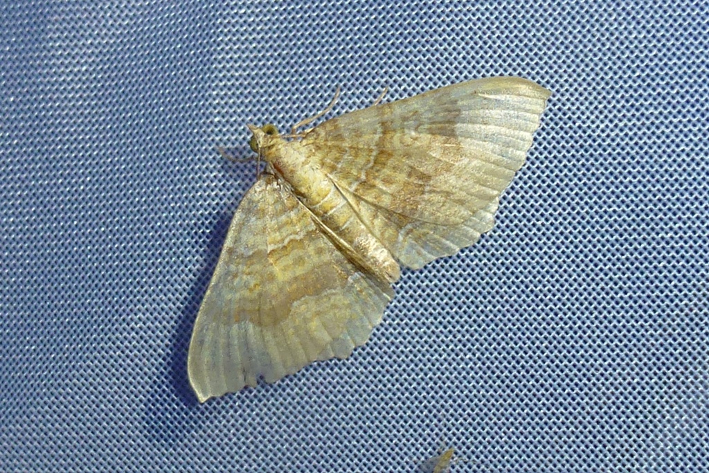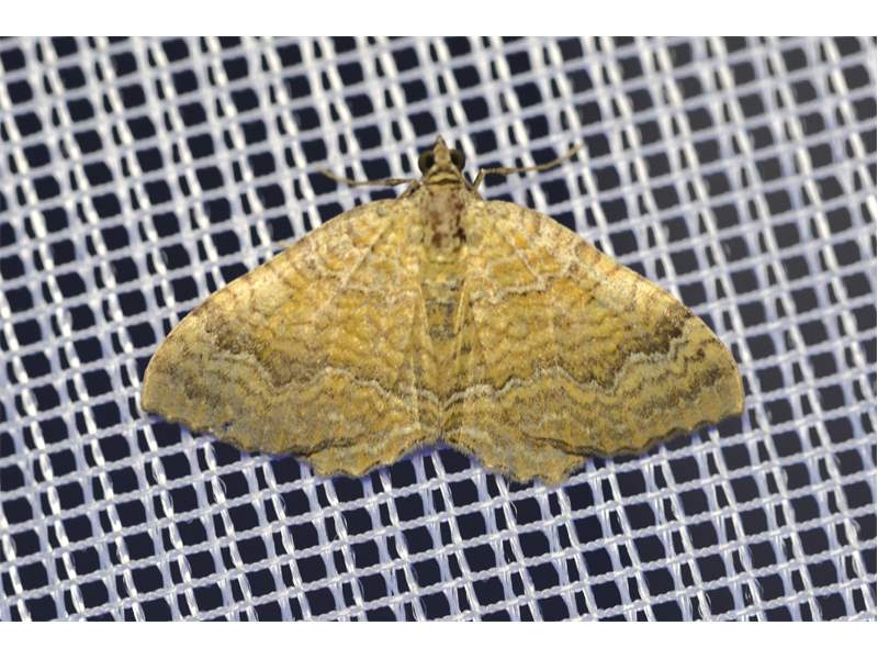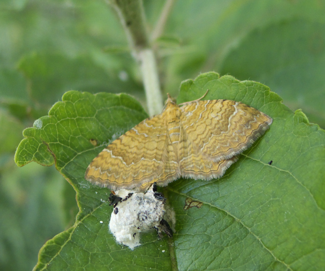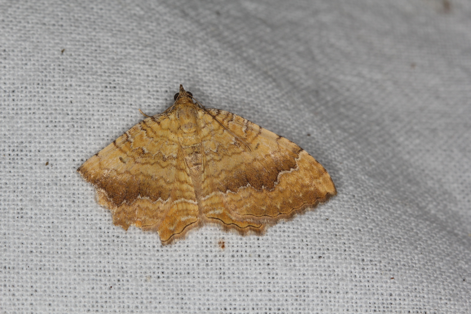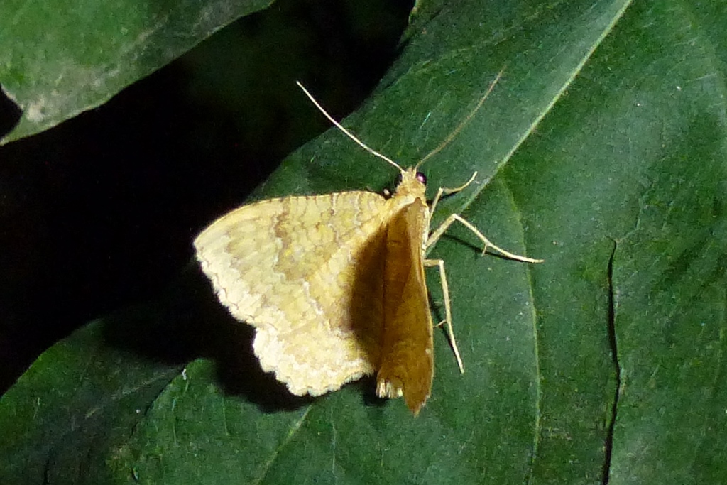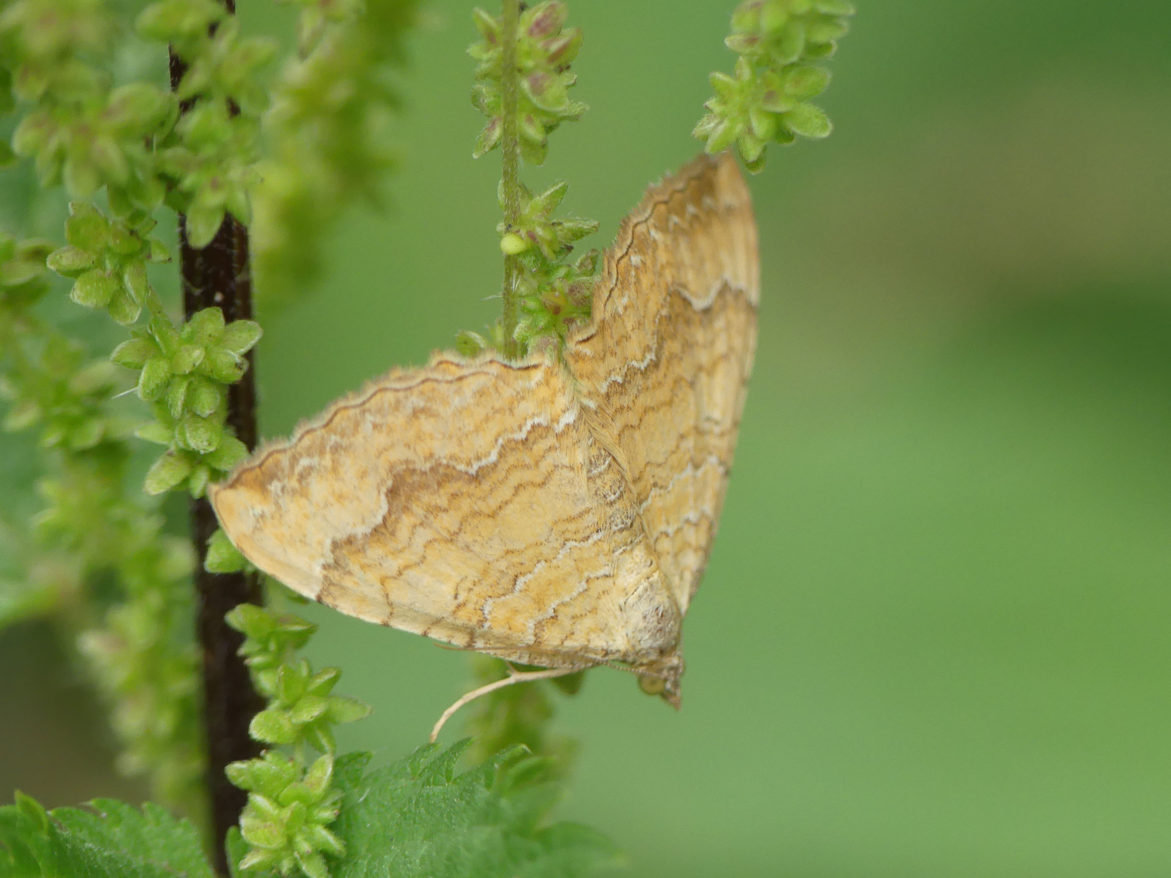 Ockergelbe Blattspanner, oder Löwenzahnspanner oder Brennnesselspanner (Camptogramma bilineata (Linnaeus, 1758)), am Licht, Radeberg, August 2013.