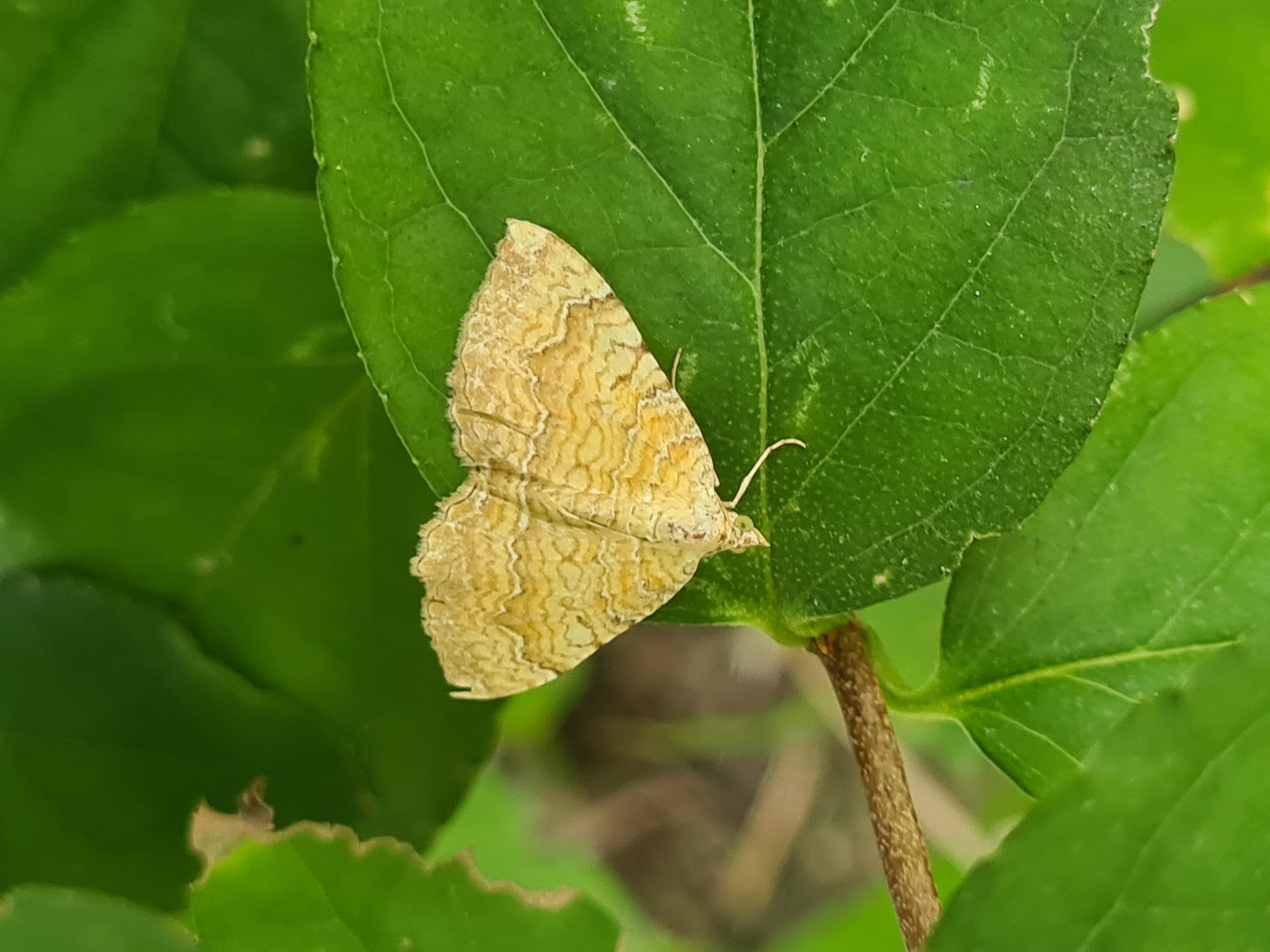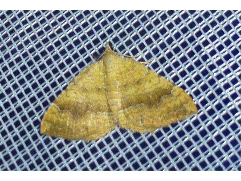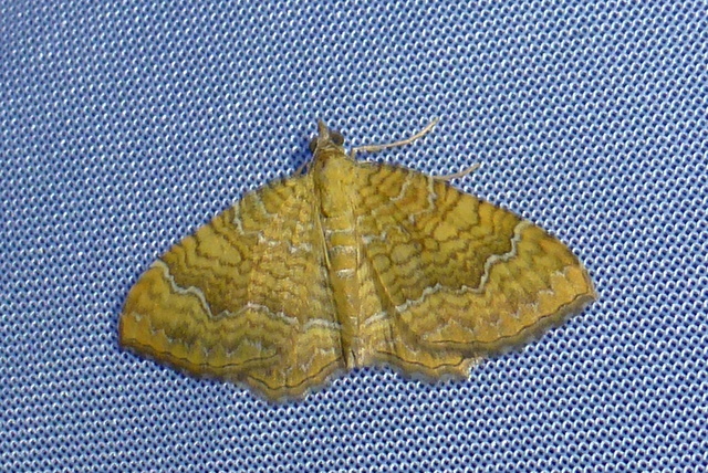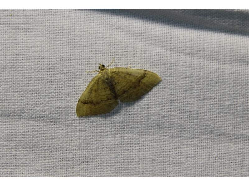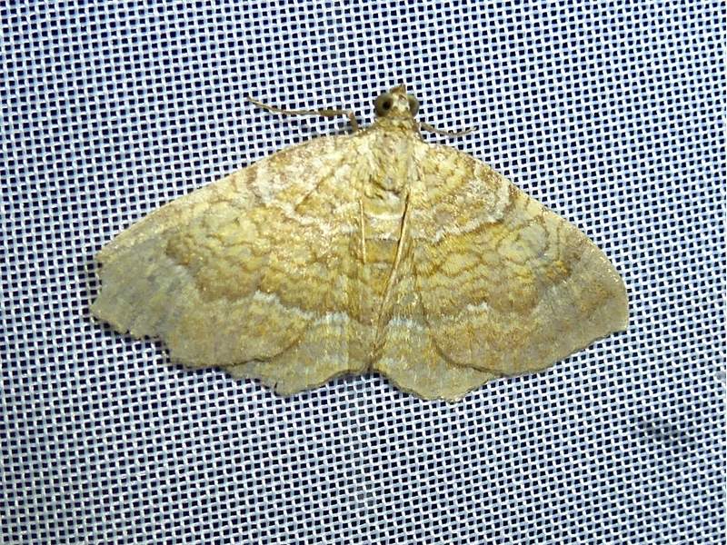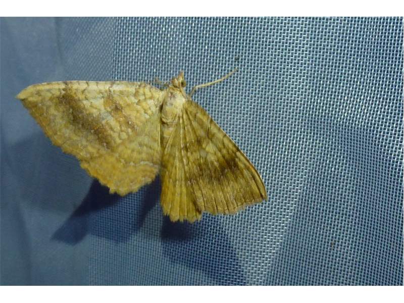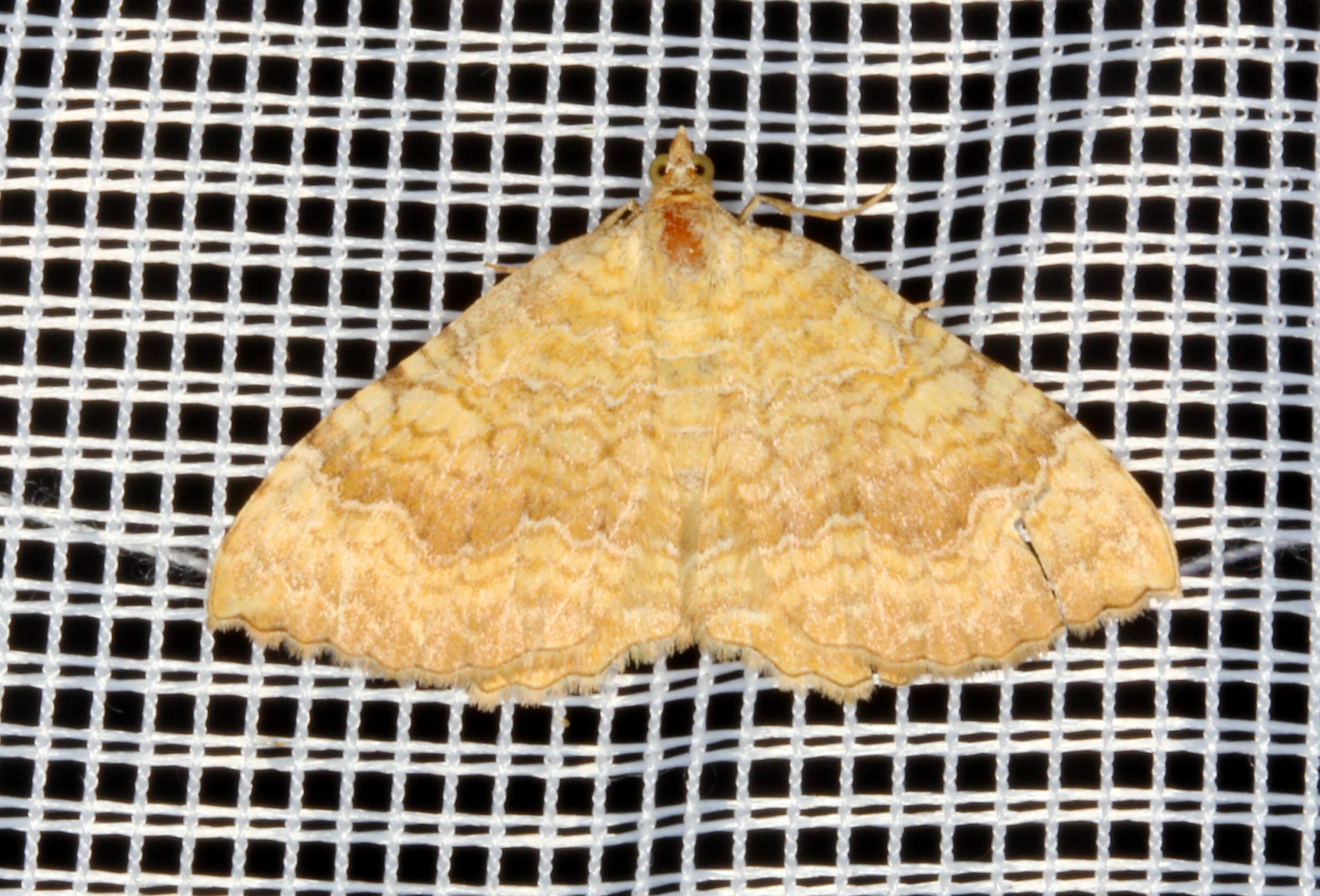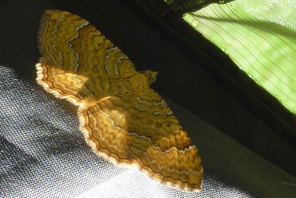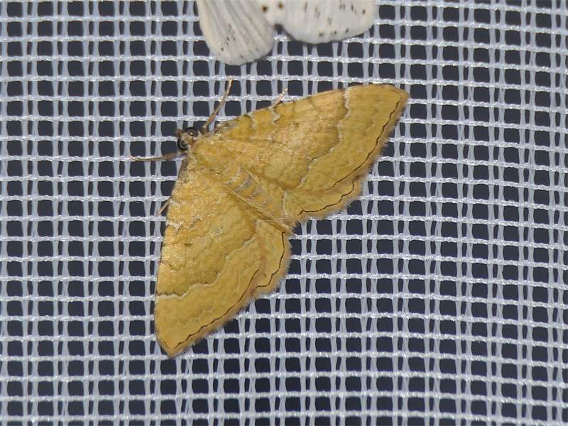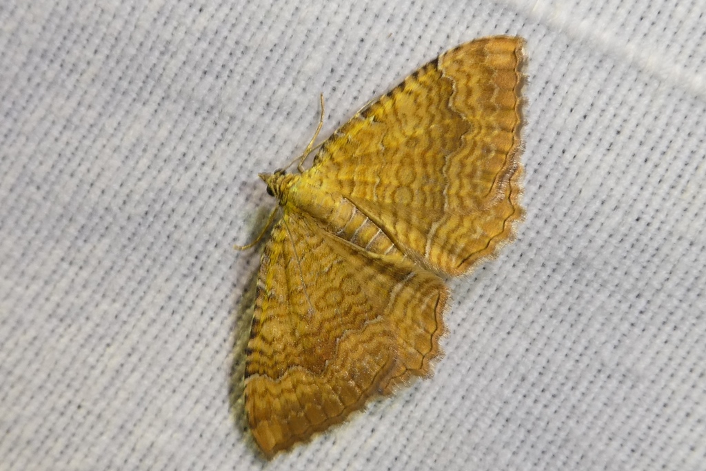 Ockergelbe Blattspanner, oder Löwenzahnspanner oder Brennnesselspanner (Camptogramma bilineata (Linnaeus, 1758)), am Licht, Radeberg, August 2013.