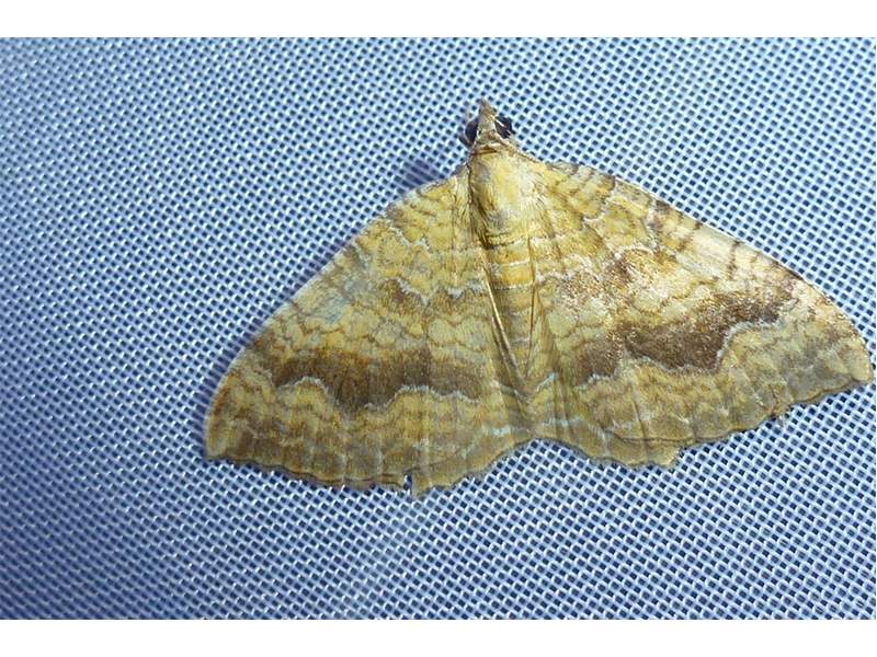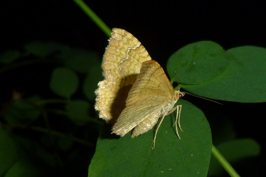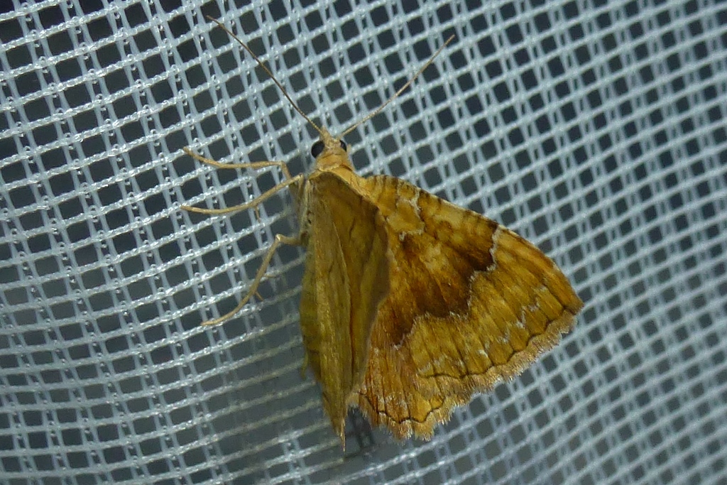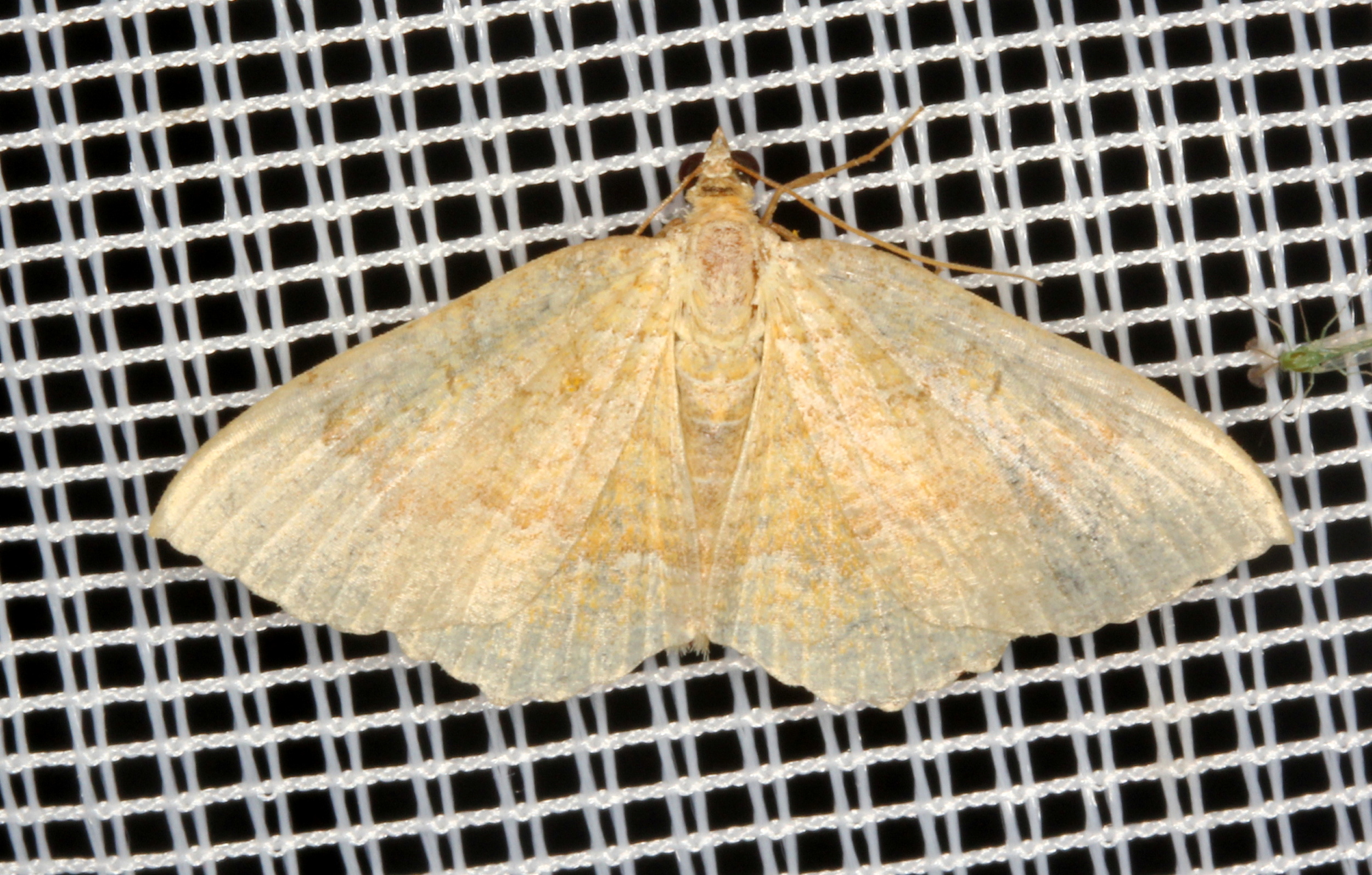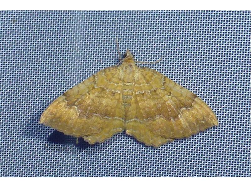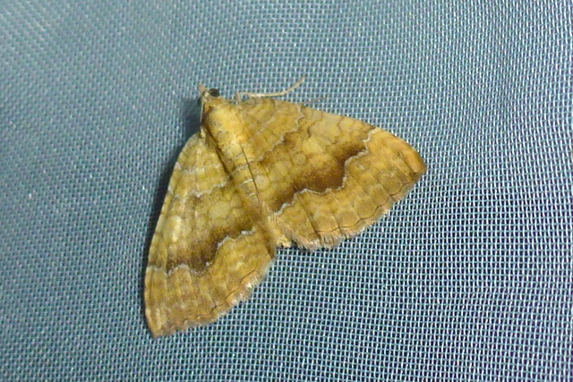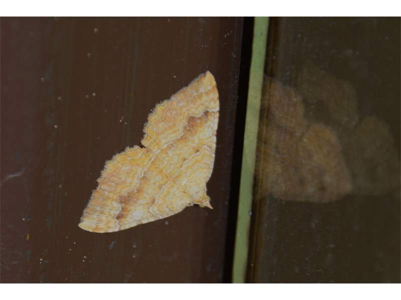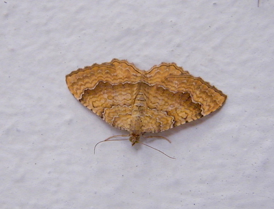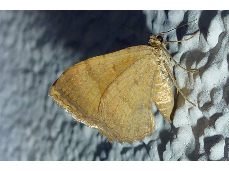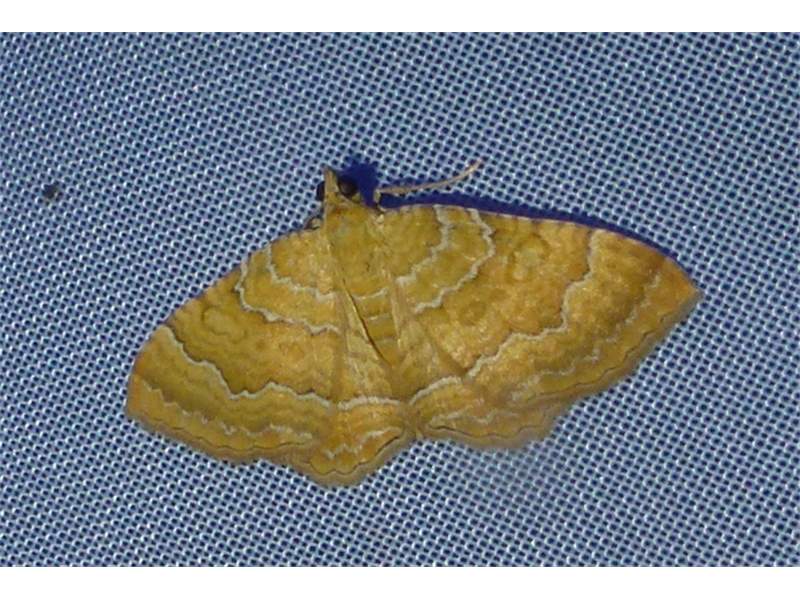 Ockergelbe Blattspanner, oder Löwenzahnspanner oder Brennnesselspanner (Camptogramma bilineata (Linnaeus, 1758)), am Licht, Radeberg, August 2013.