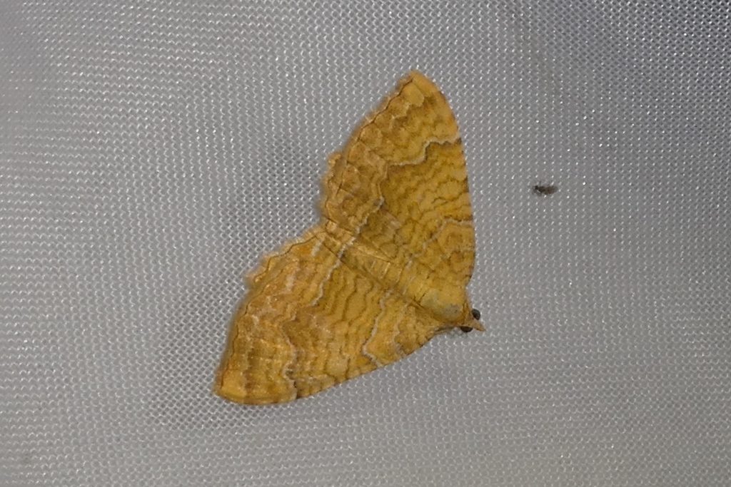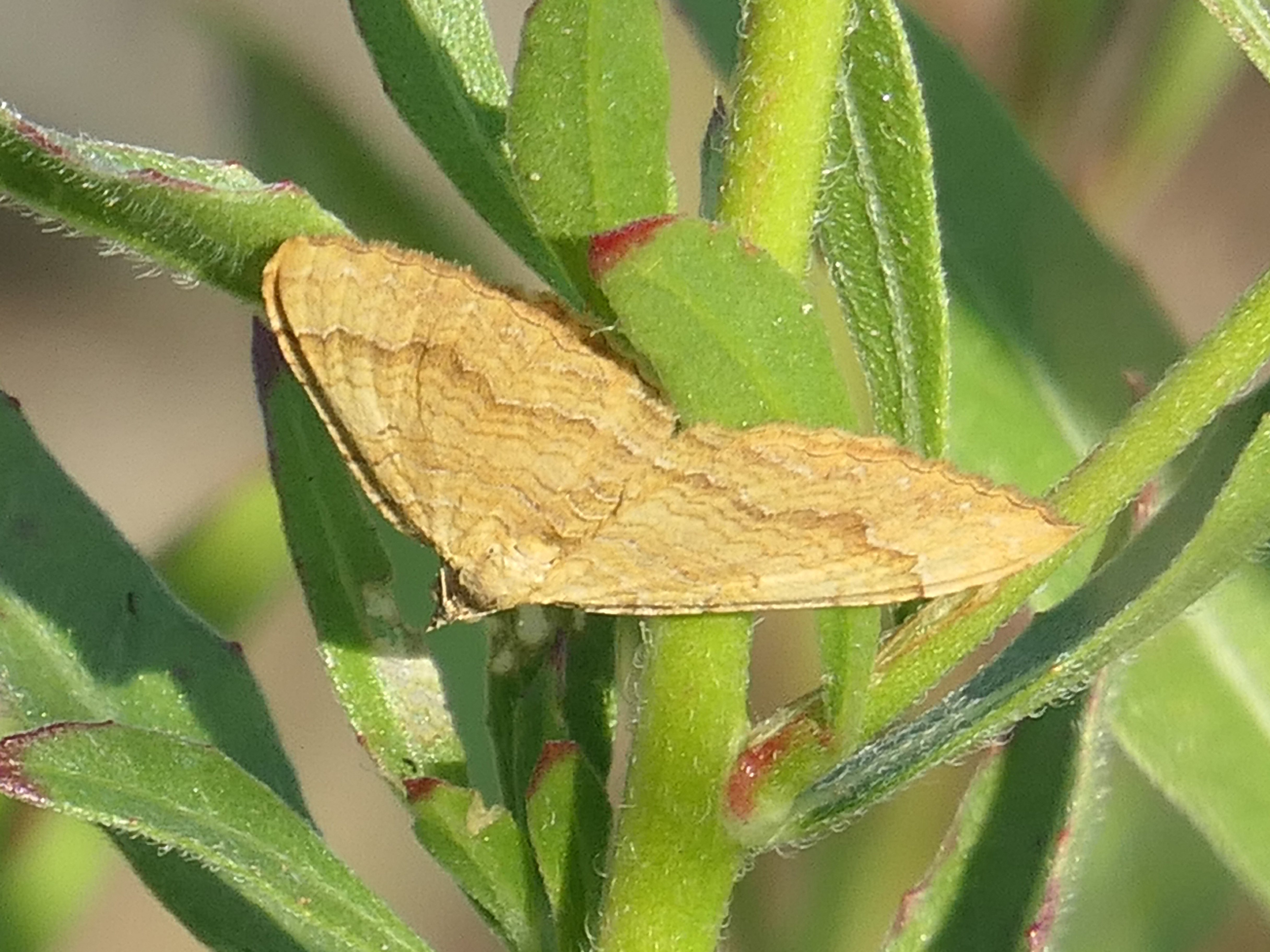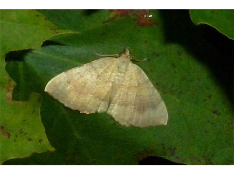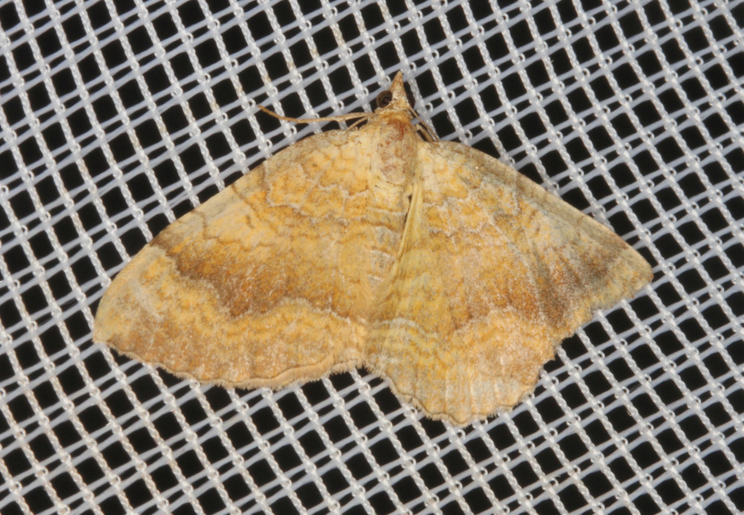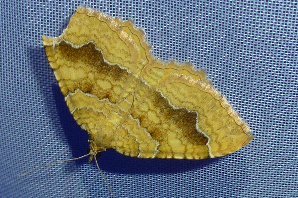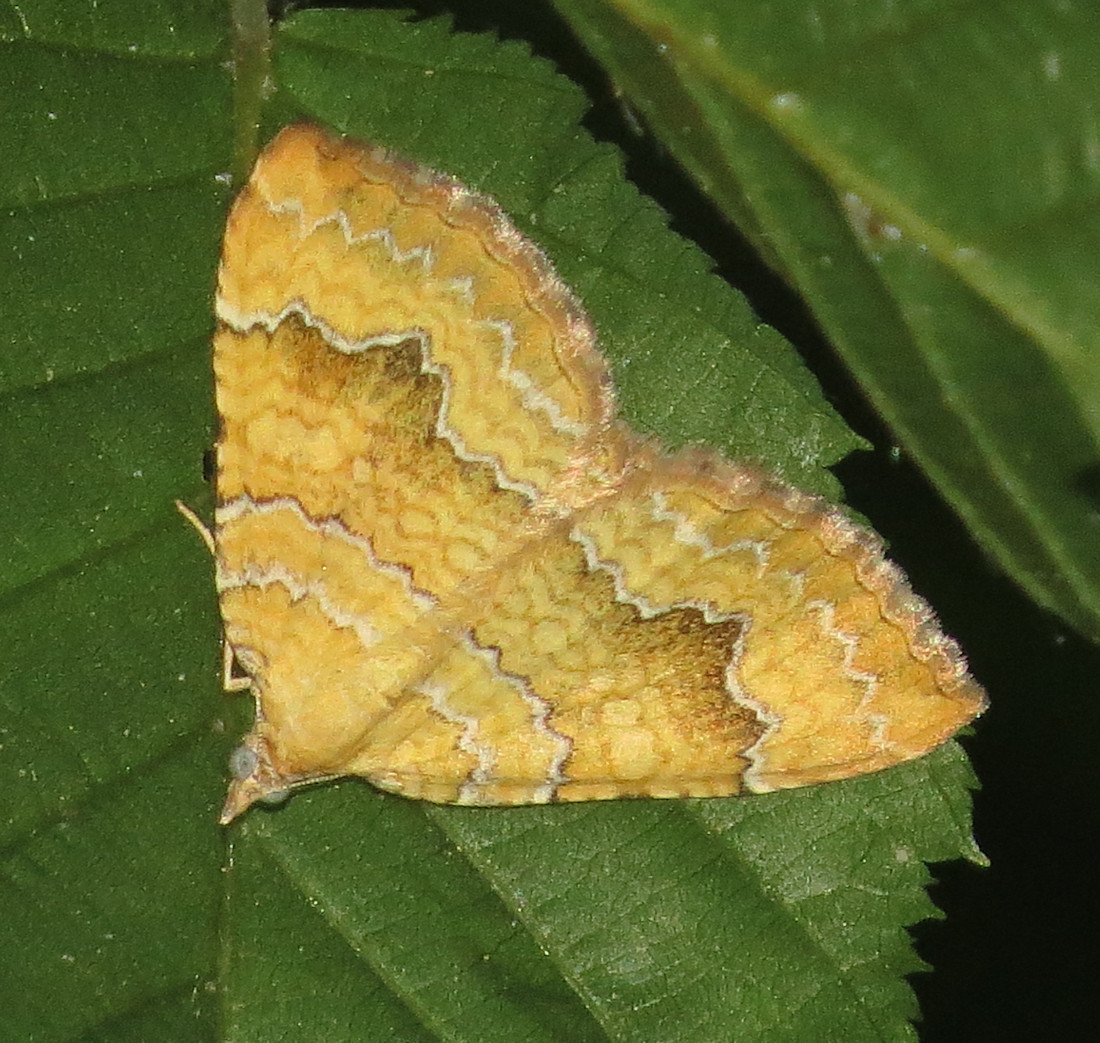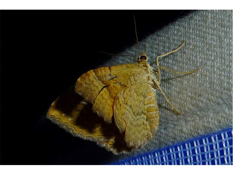 Ockergelbe Blattspanner, oder Löwenzahnspanner oder Brennnesselspanner (Camptogramma bilineata (Linnaeus, 1758)), am Licht, Radeberg, August 2013.
