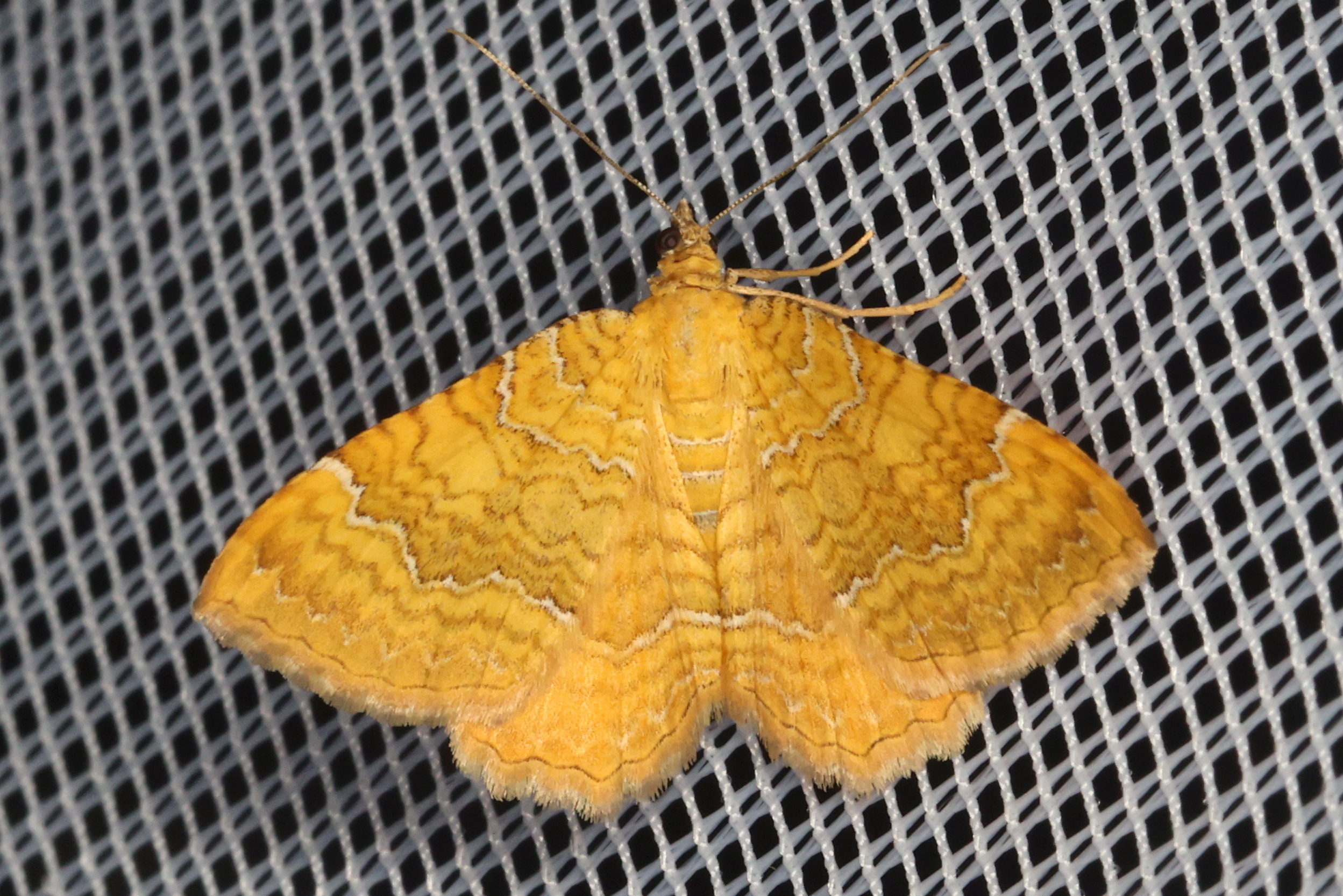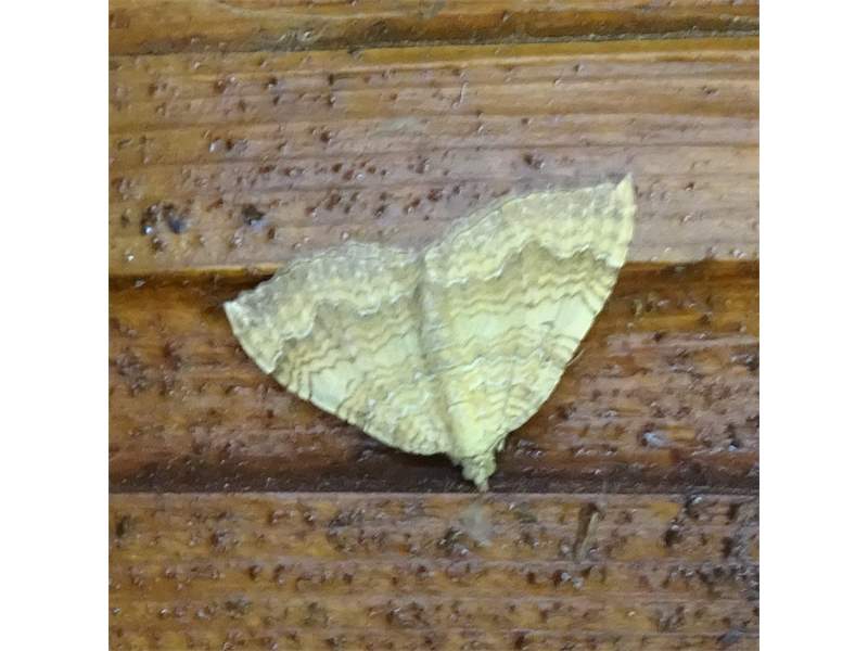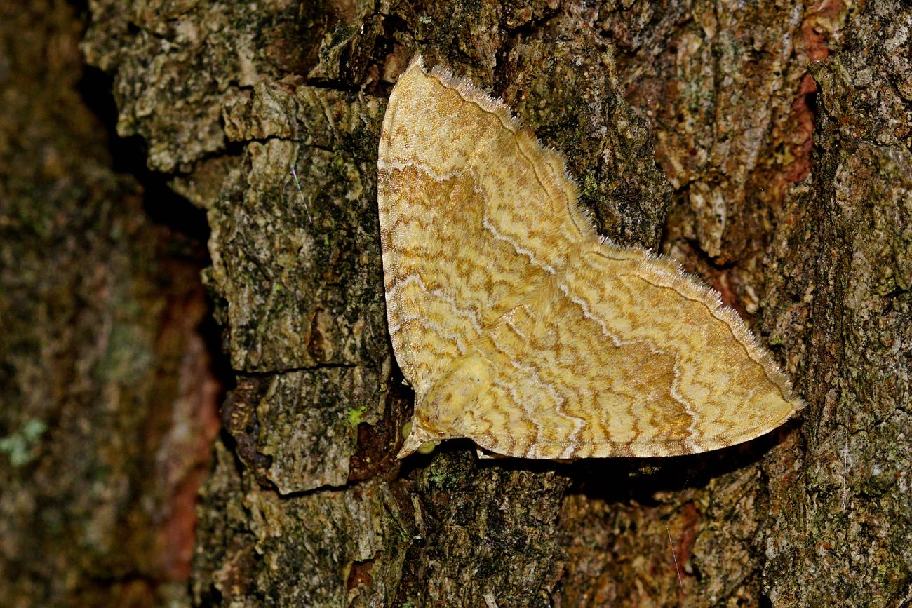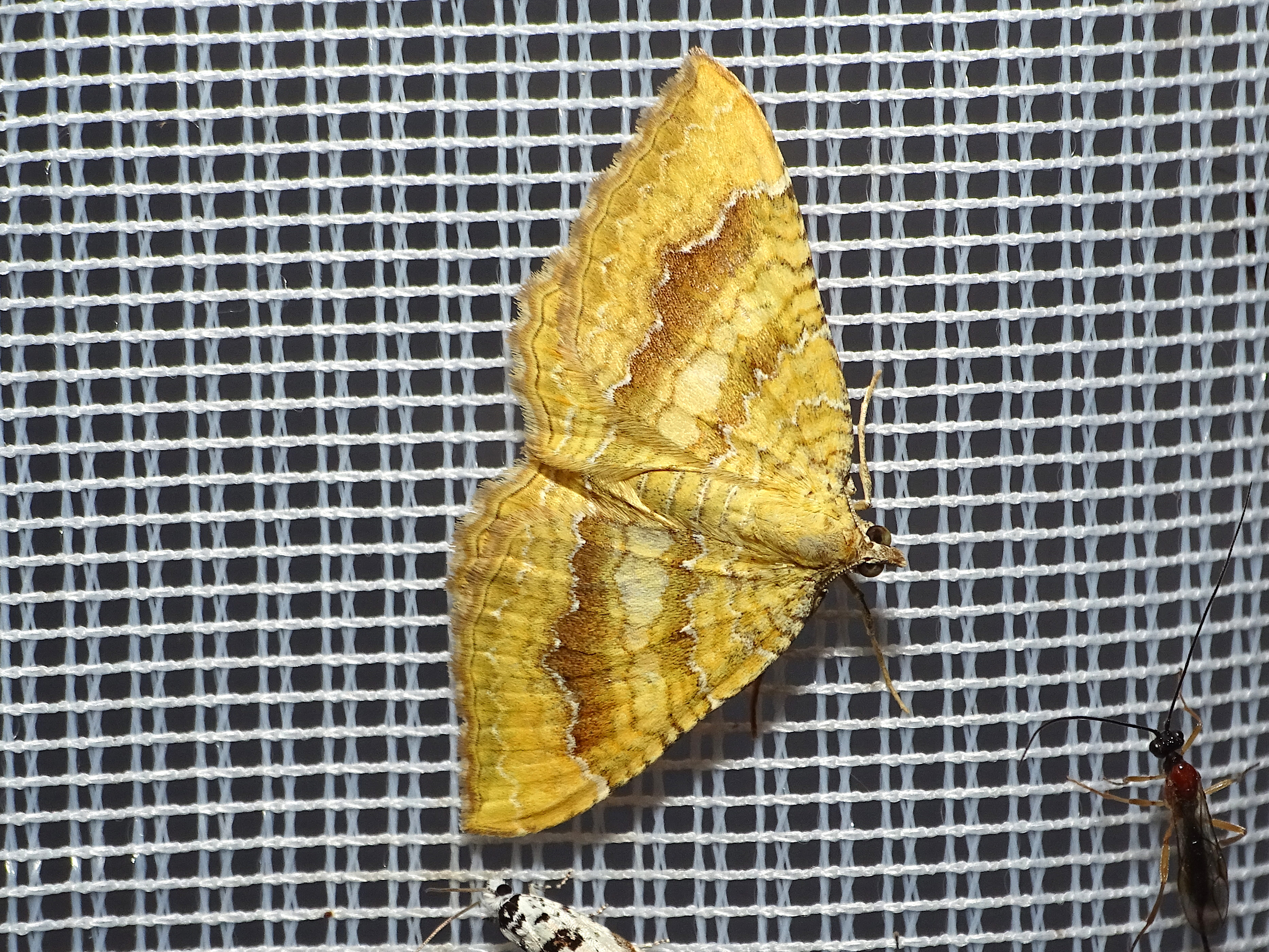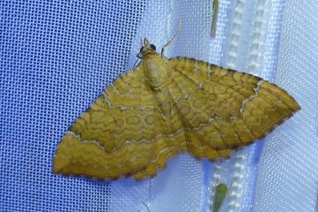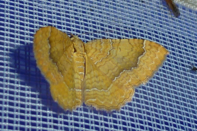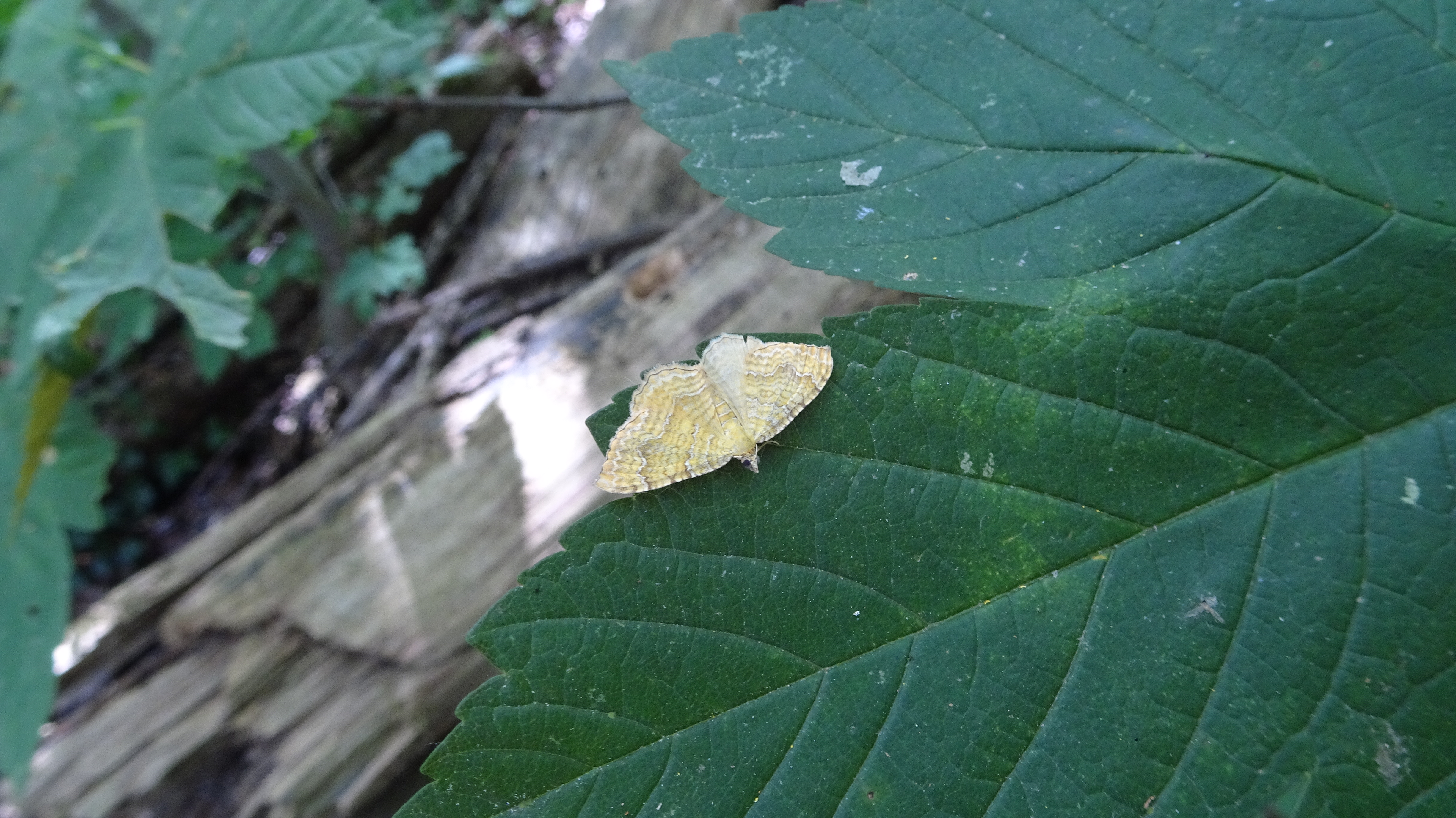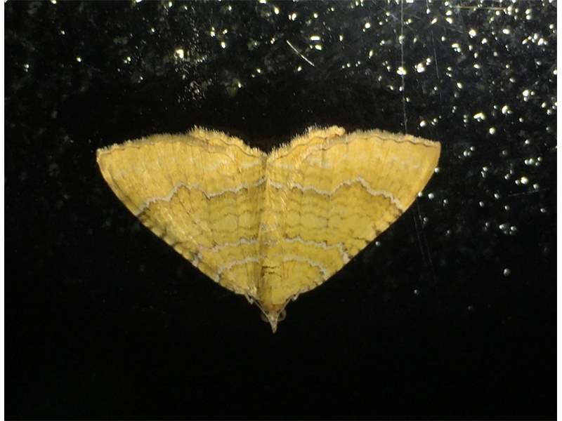Ockergelbe Blattspanner, oder Löwenzahnspanner oder Brennnesselspanner (Camptogramma bilineata (Linnaeus, 1758)), am Licht, Radeberg, August 2013.