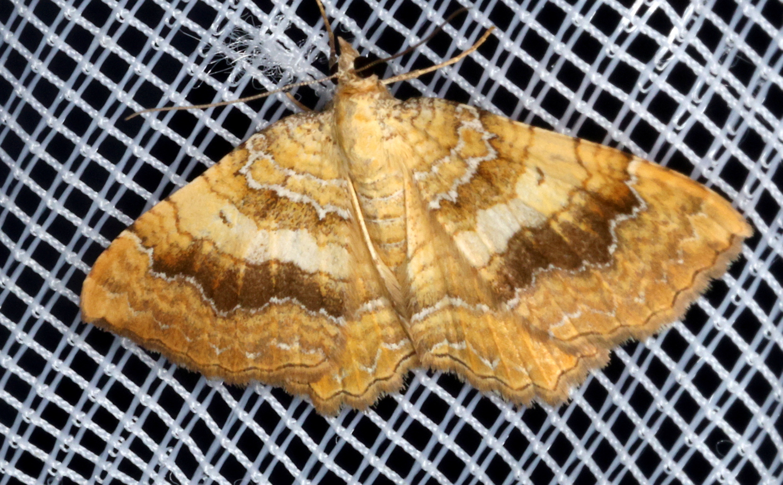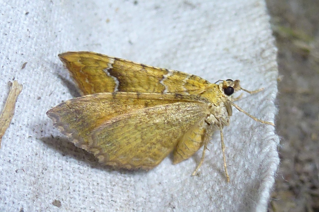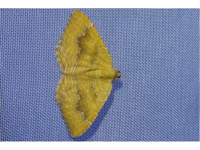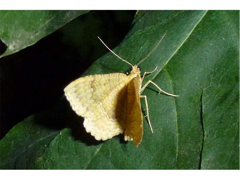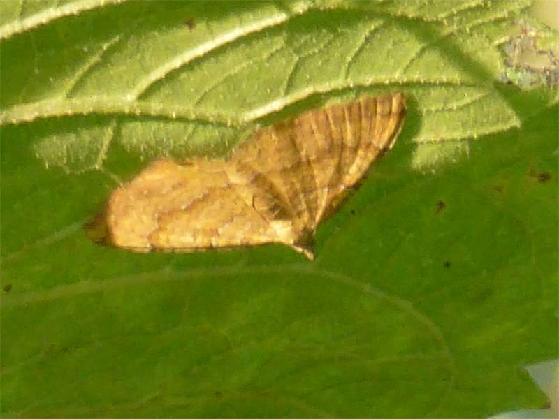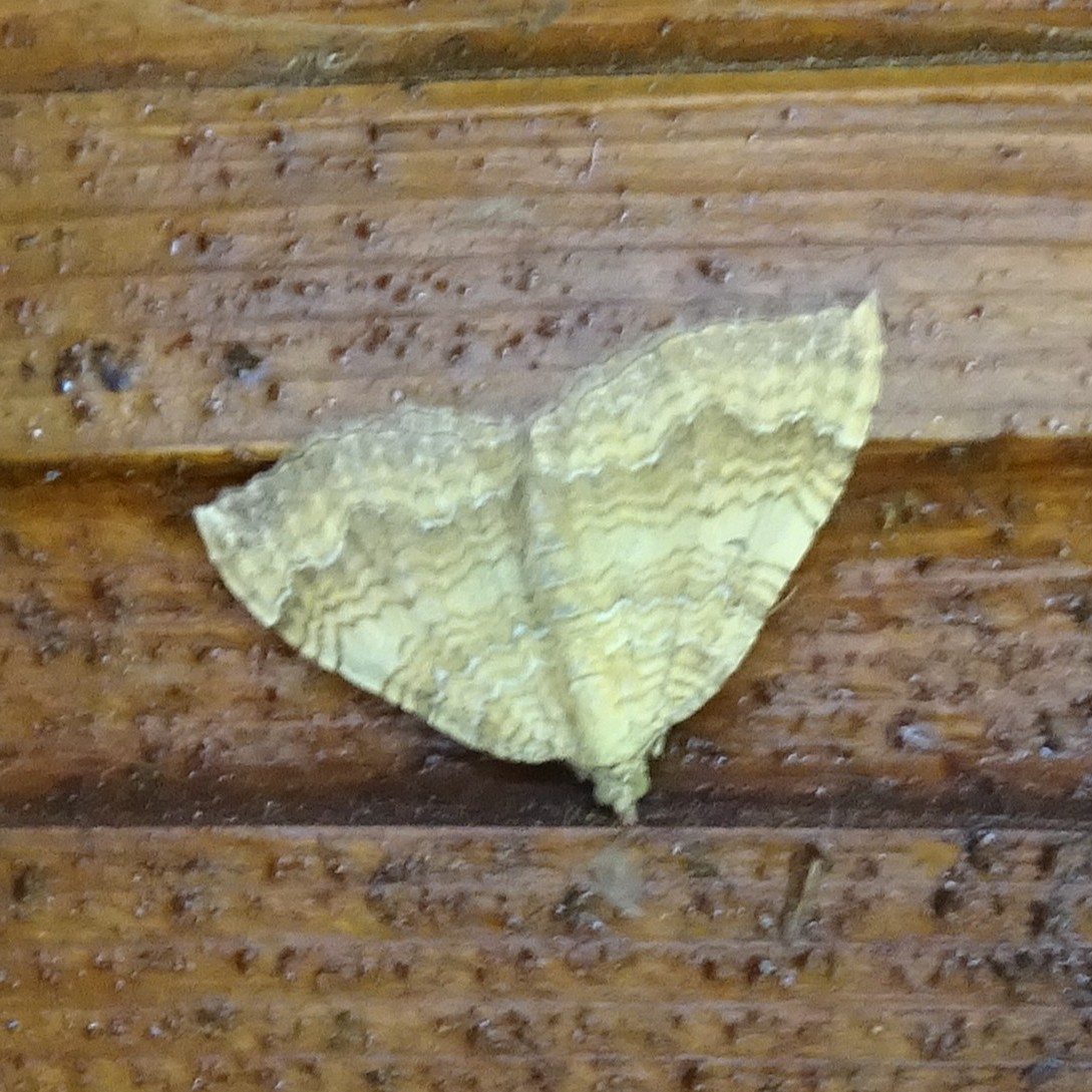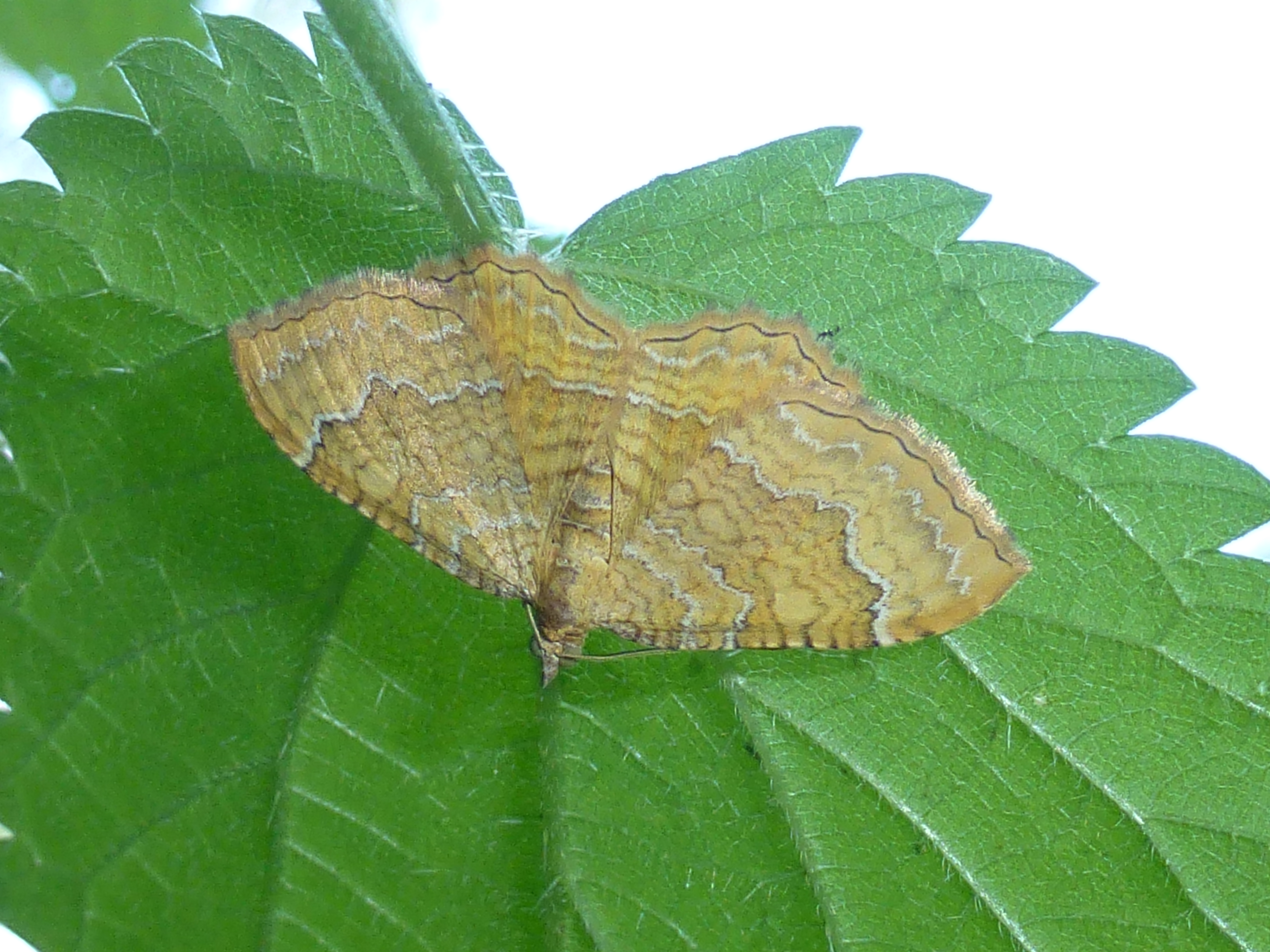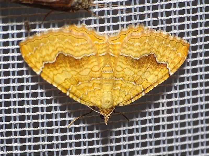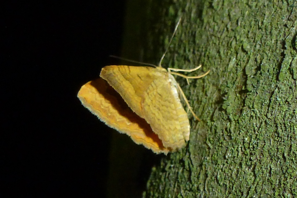 Ockergelbe Blattspanner, oder Löwenzahnspanner oder Brennnesselspanner (Camptogramma bilineata (Linnaeus, 1758)), am Licht, Radeberg, August 2013.