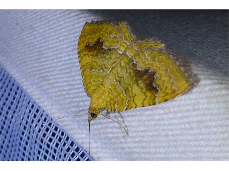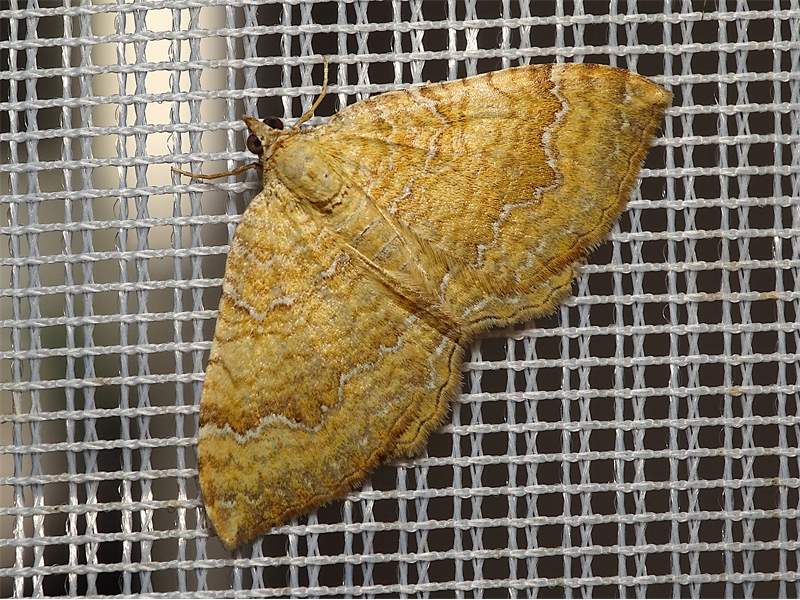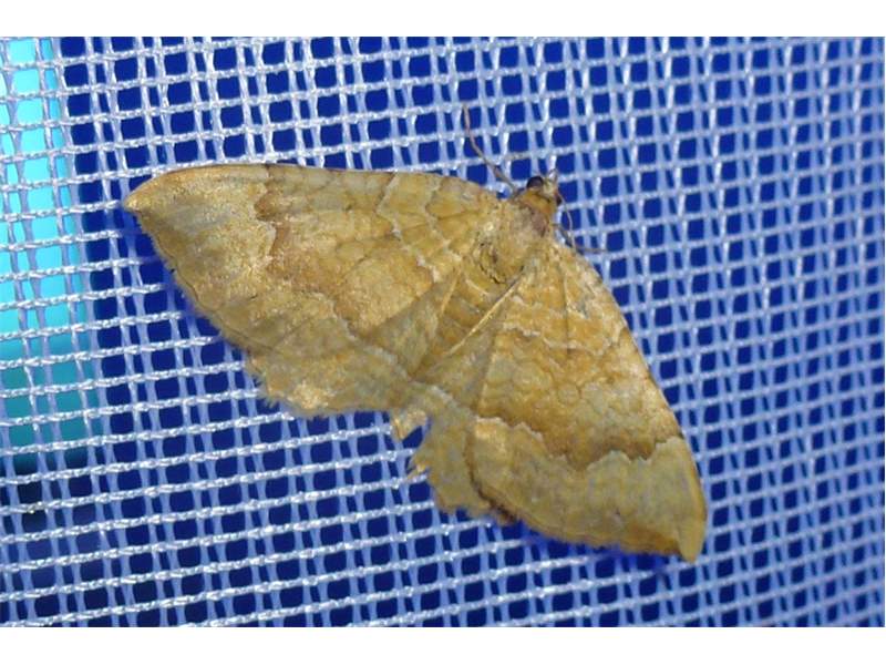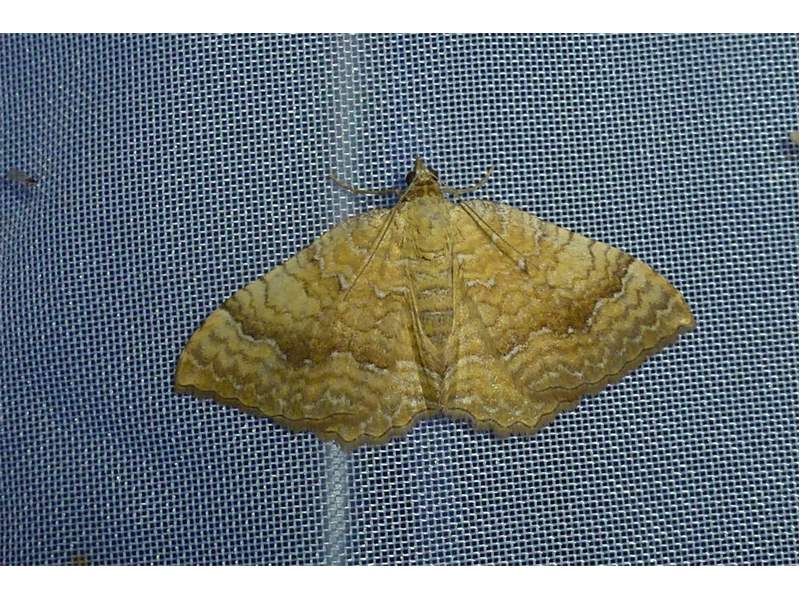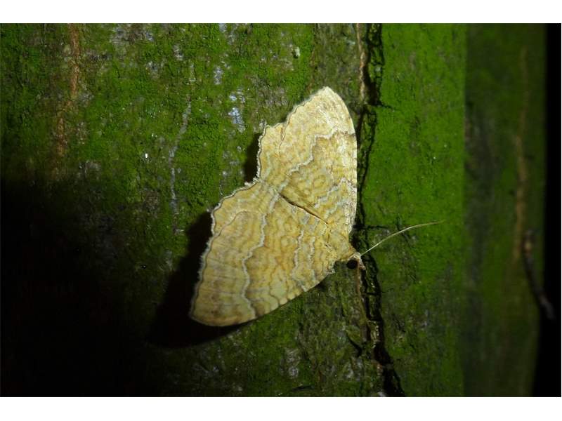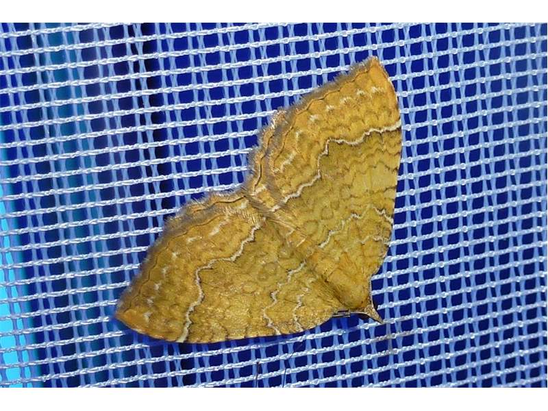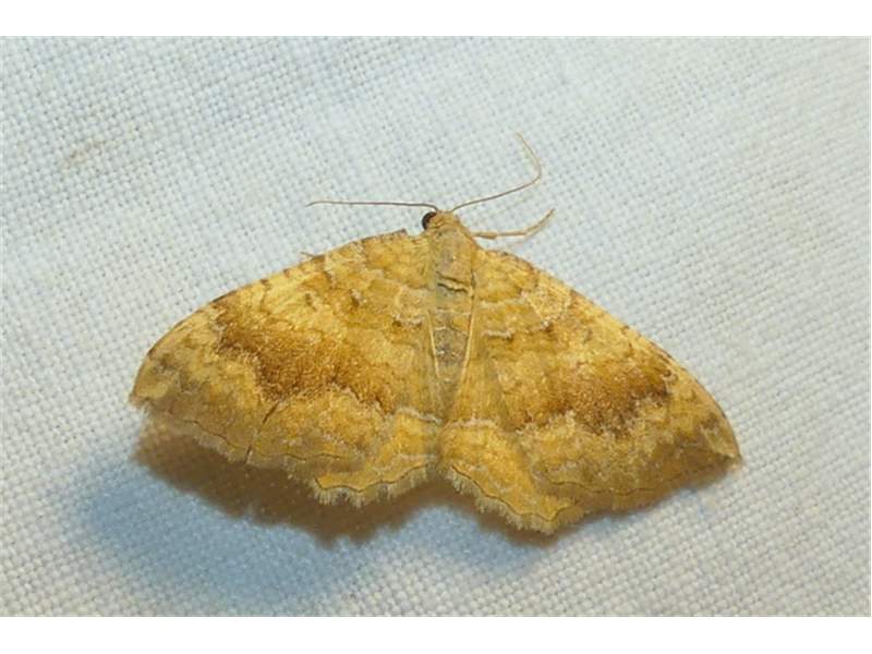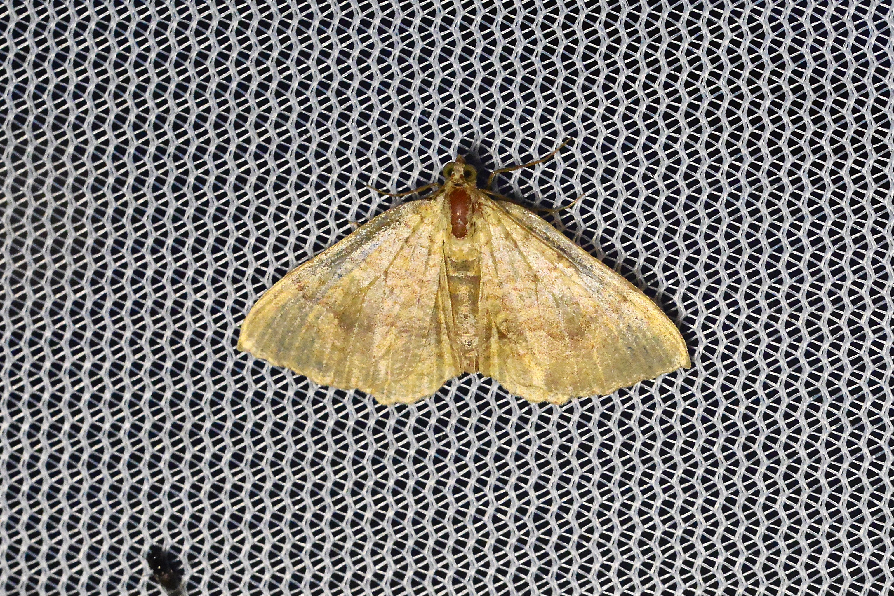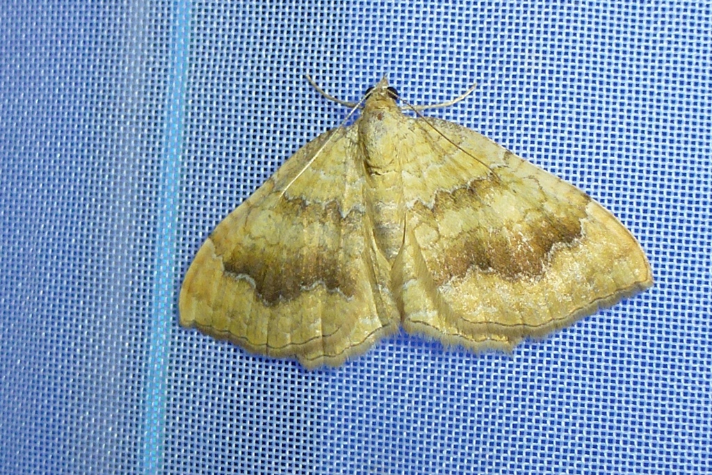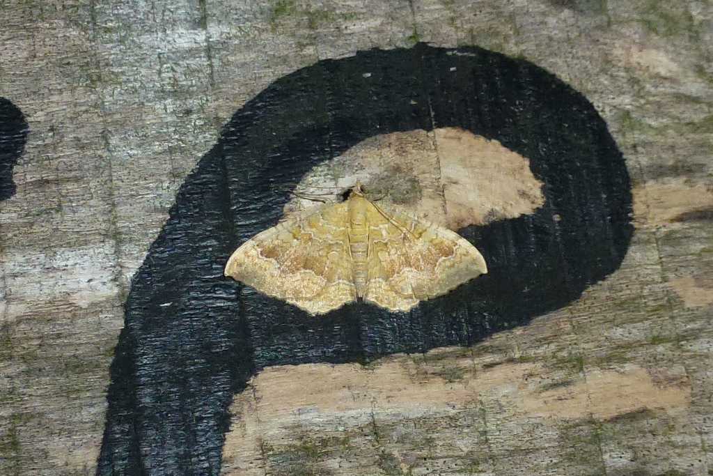Ockergelbe Blattspanner, oder Löwenzahnspanner oder Brennnesselspanner (Camptogramma bilineata (Linnaeus, 1758)), am Licht, Radeberg, August 2013.