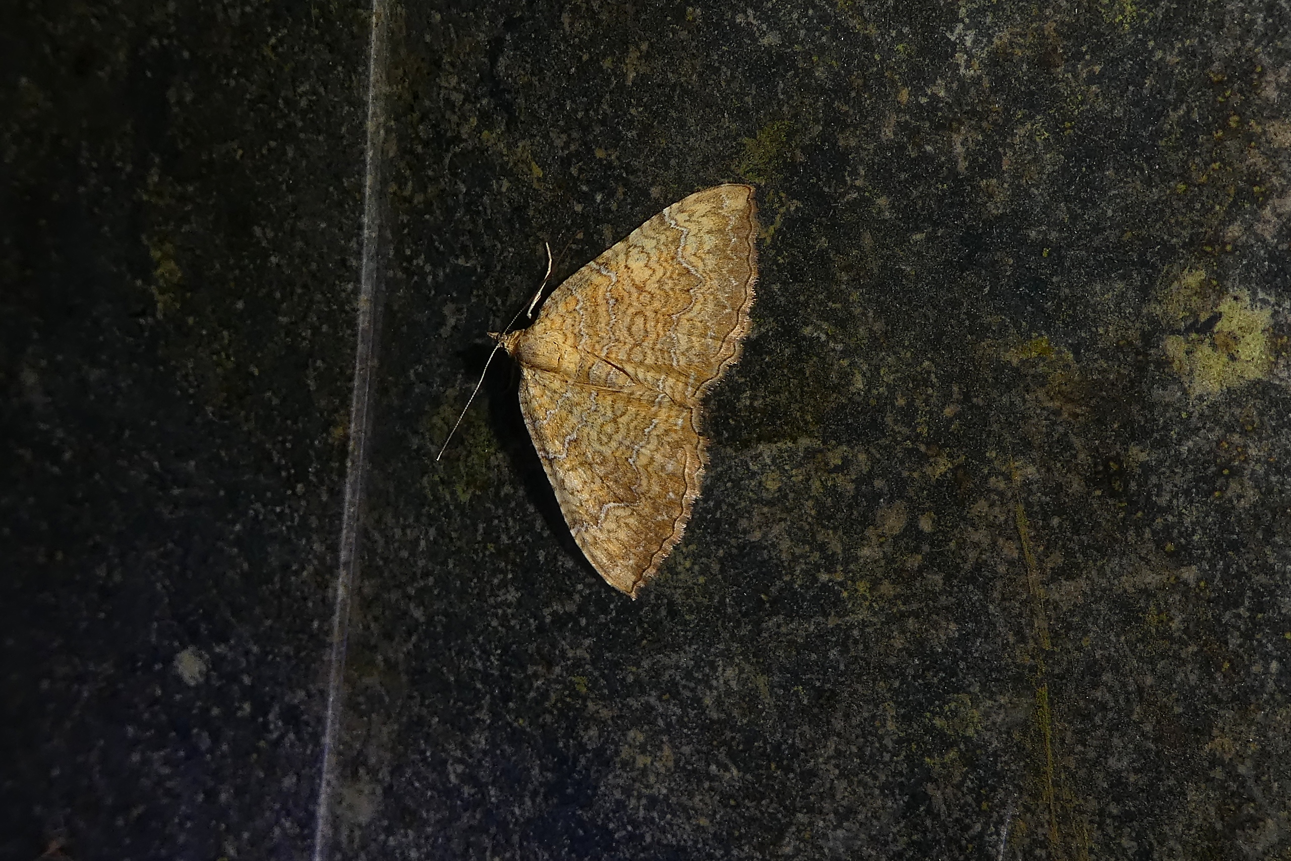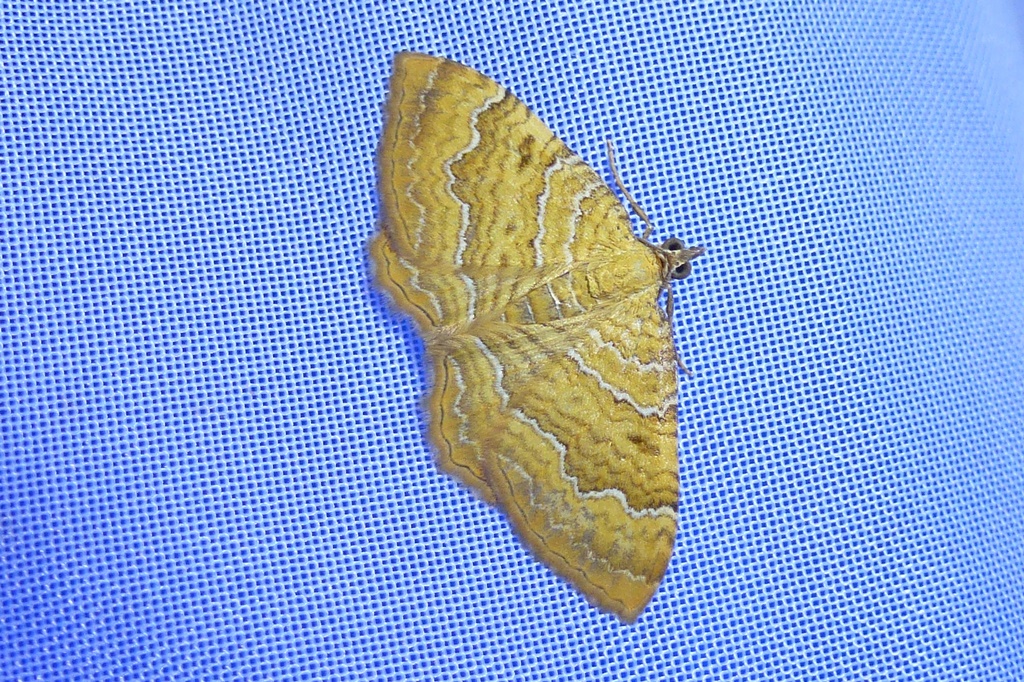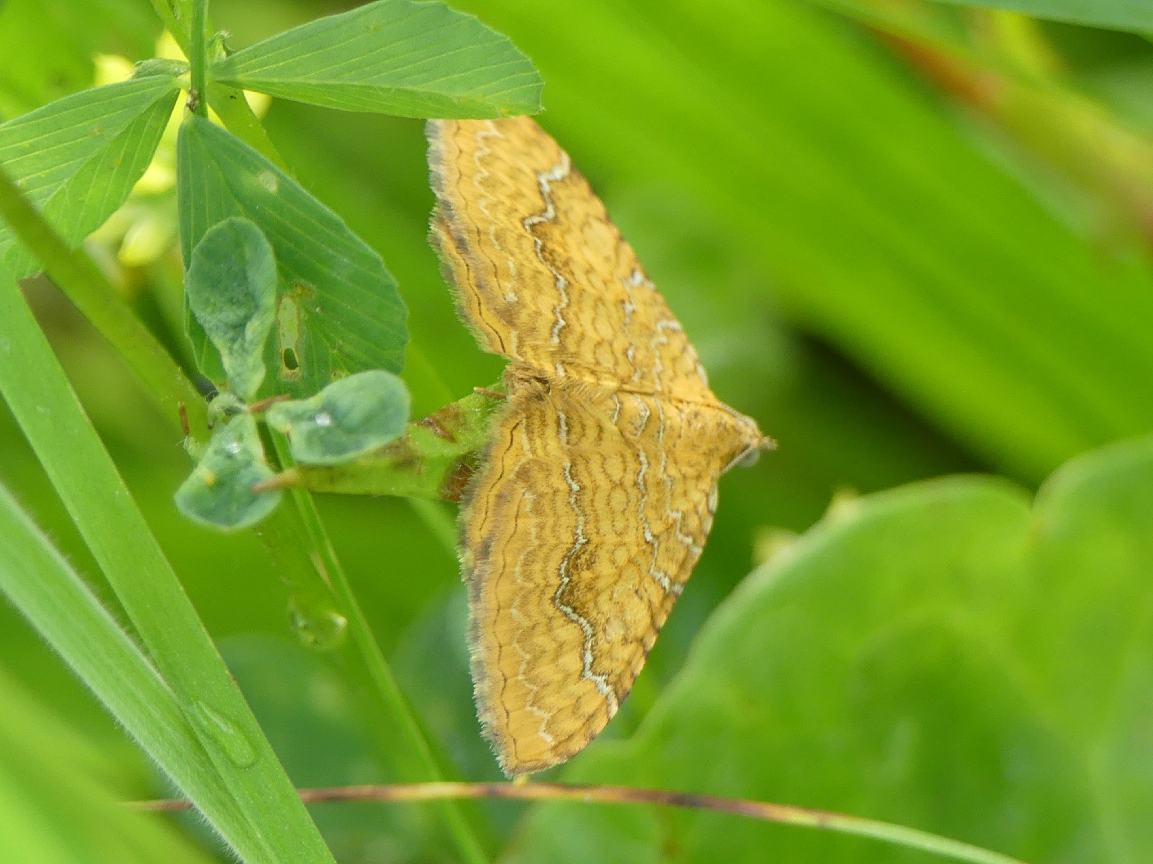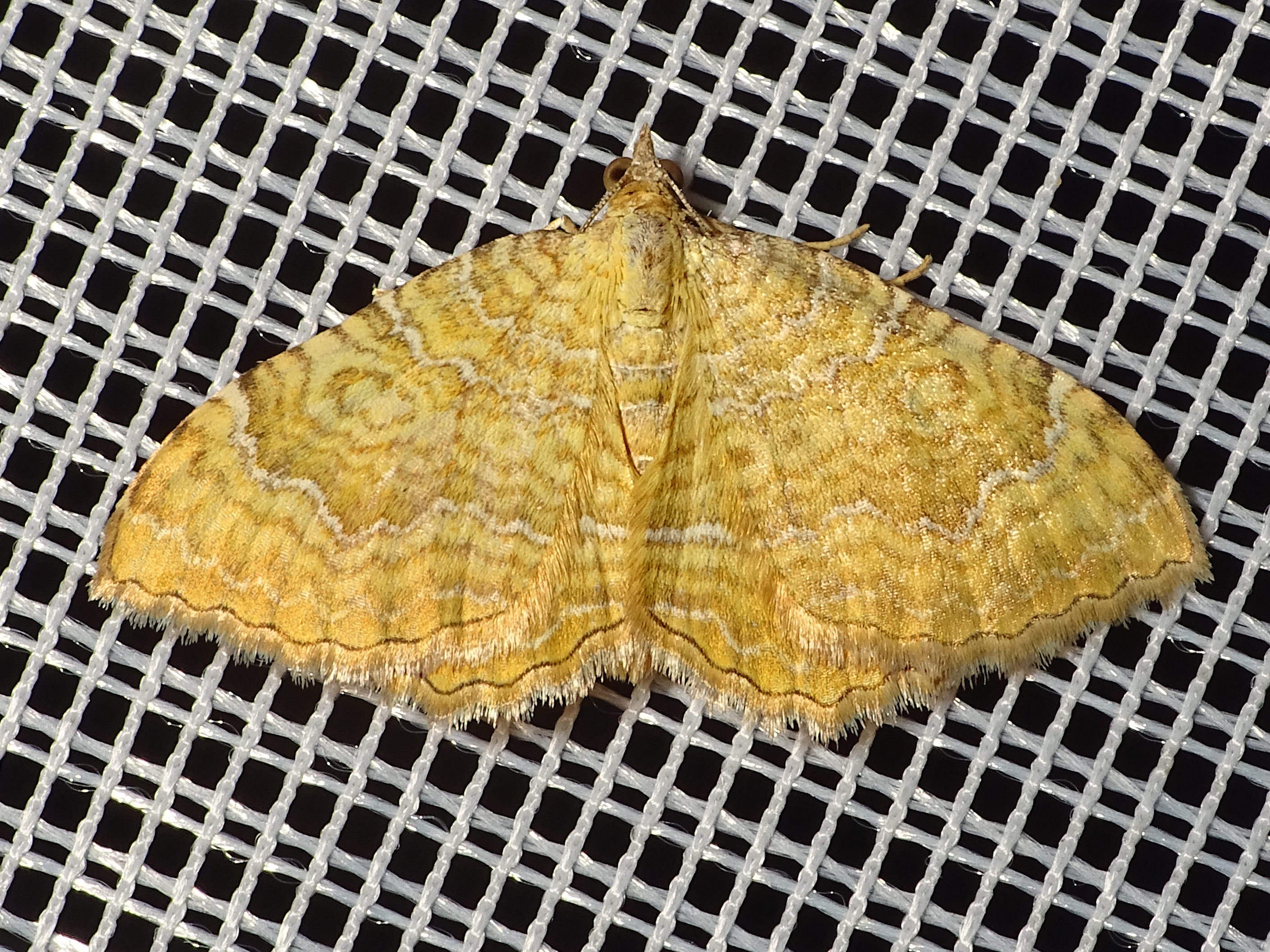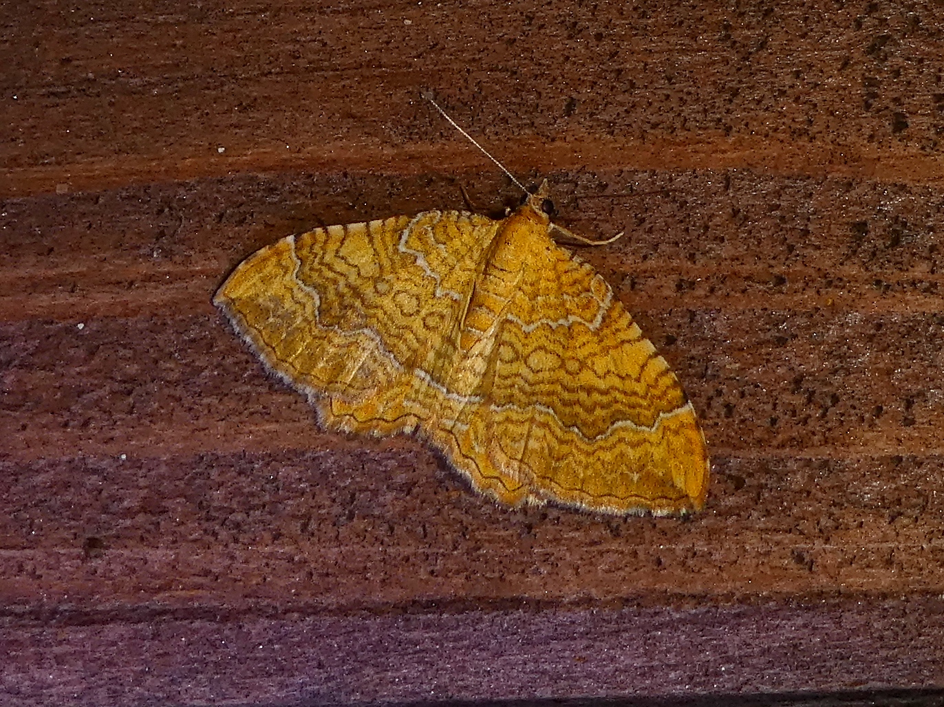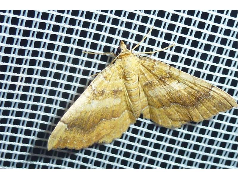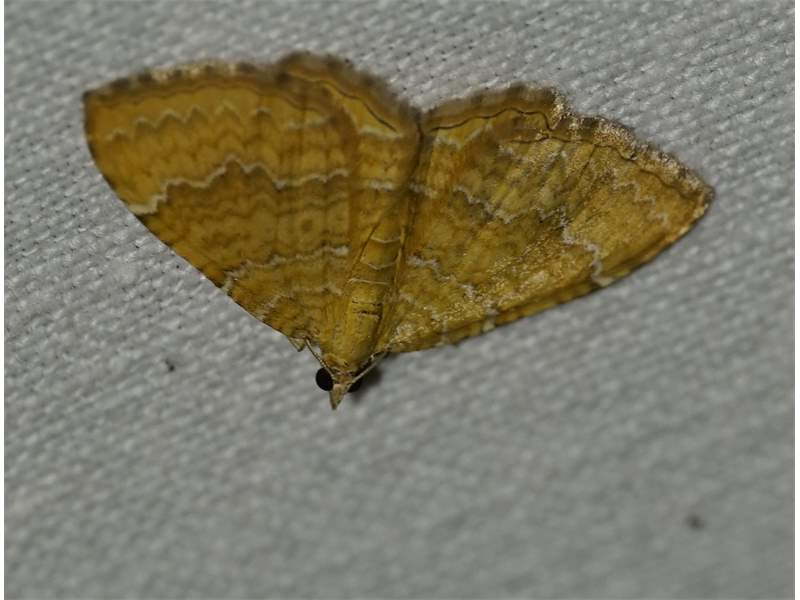 Ockergelbe Blattspanner, oder Löwenzahnspanner oder Brennnesselspanner (Camptogramma bilineata (Linnaeus, 1758)), am Licht, Radeberg, August 2013.