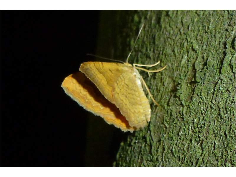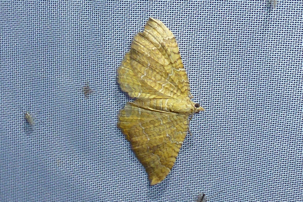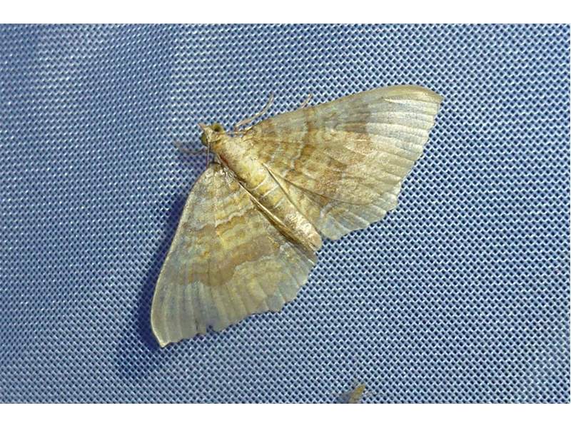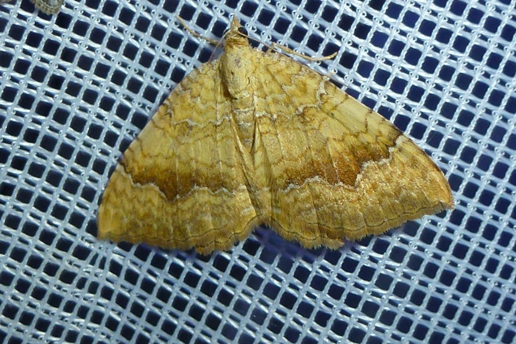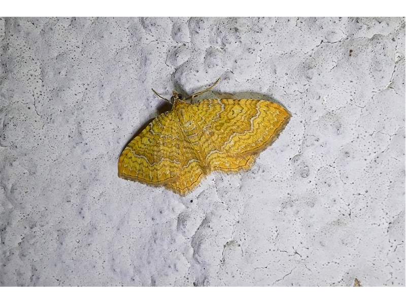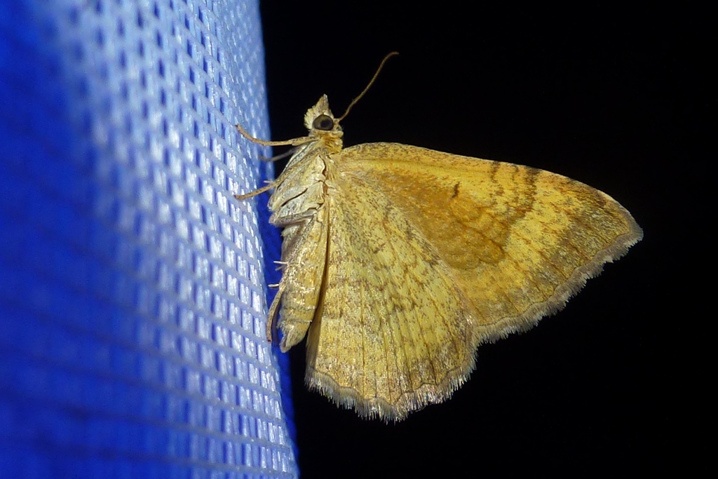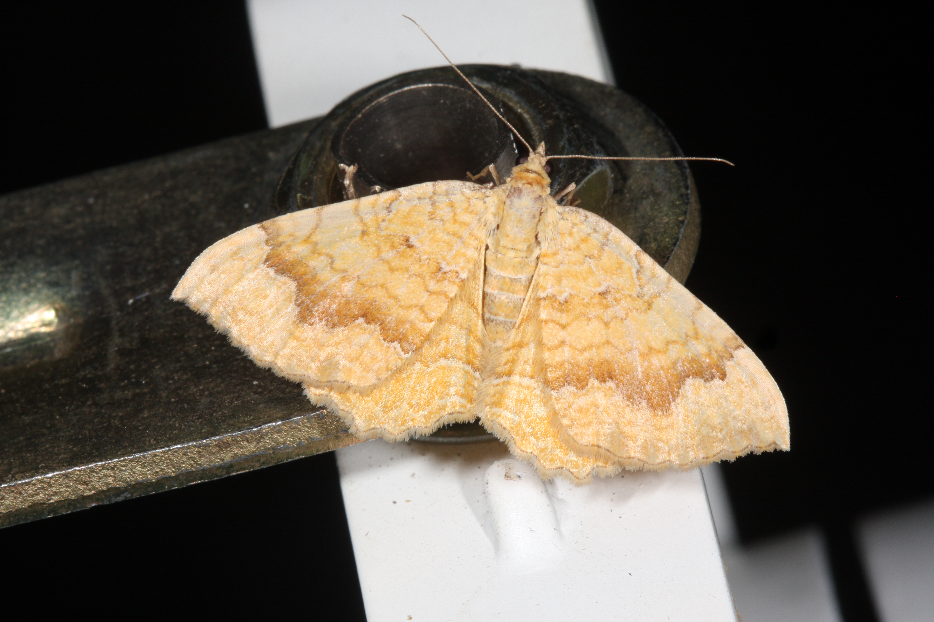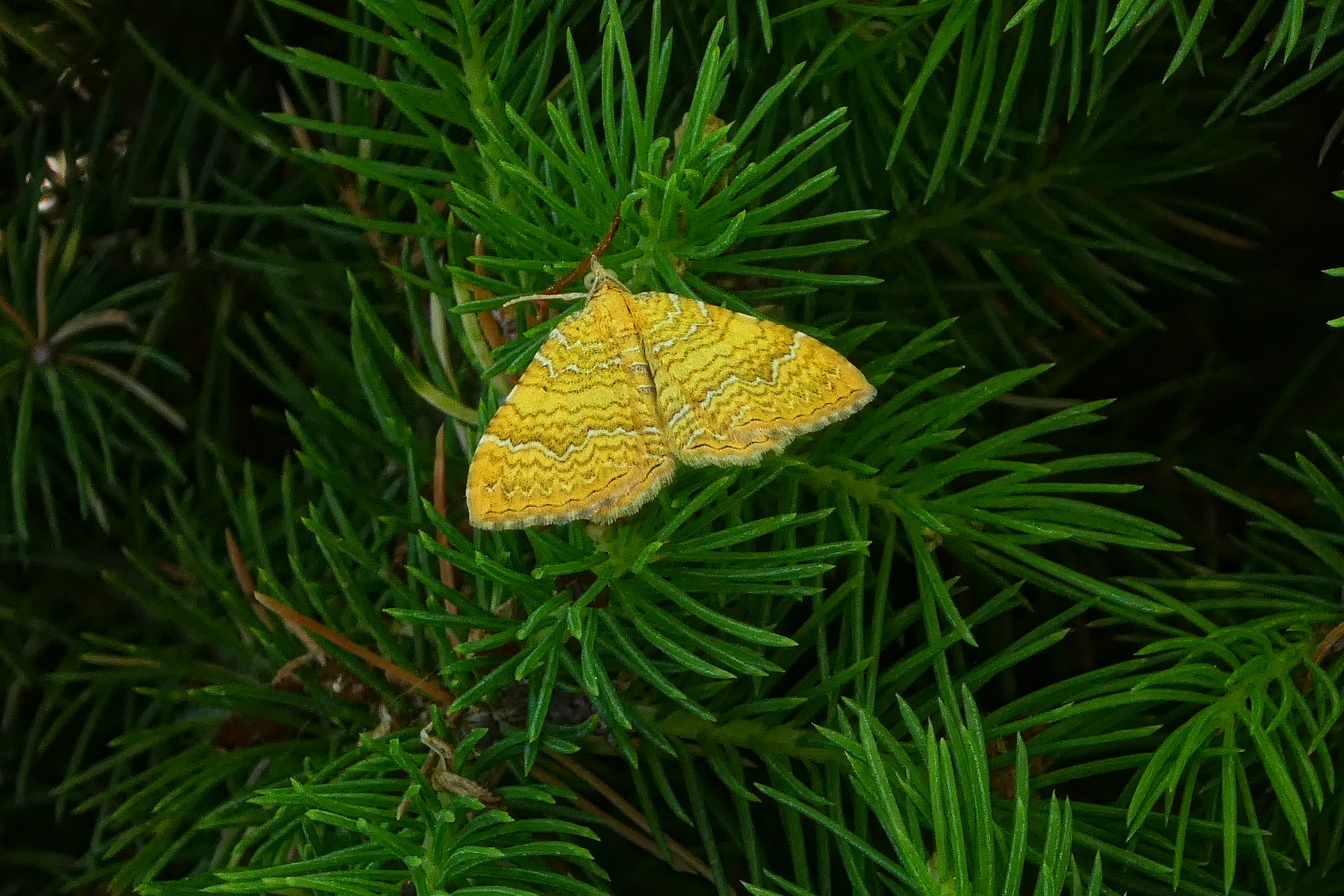 Ockergelbe Blattspanner, oder Löwenzahnspanner oder Brennnesselspanner (Camptogramma bilineata (Linnaeus, 1758)), am Licht, Radeberg, August 2013.