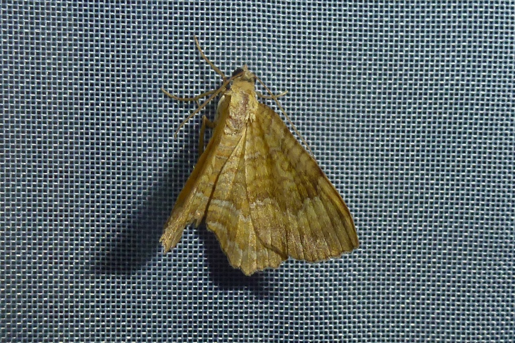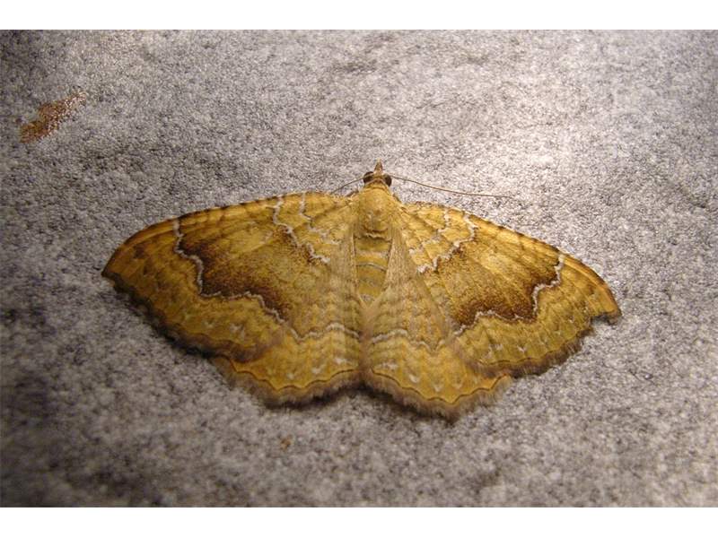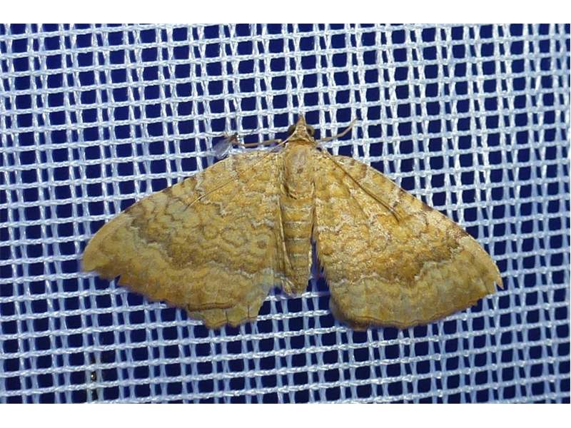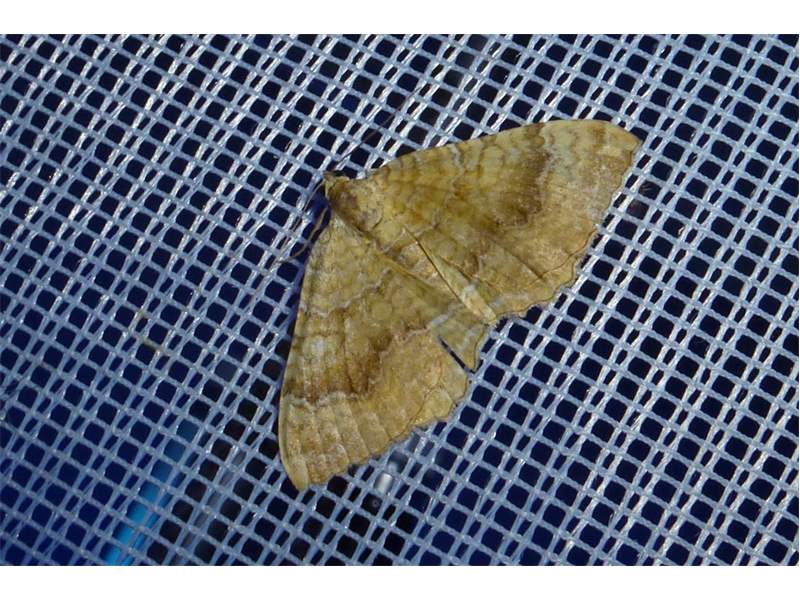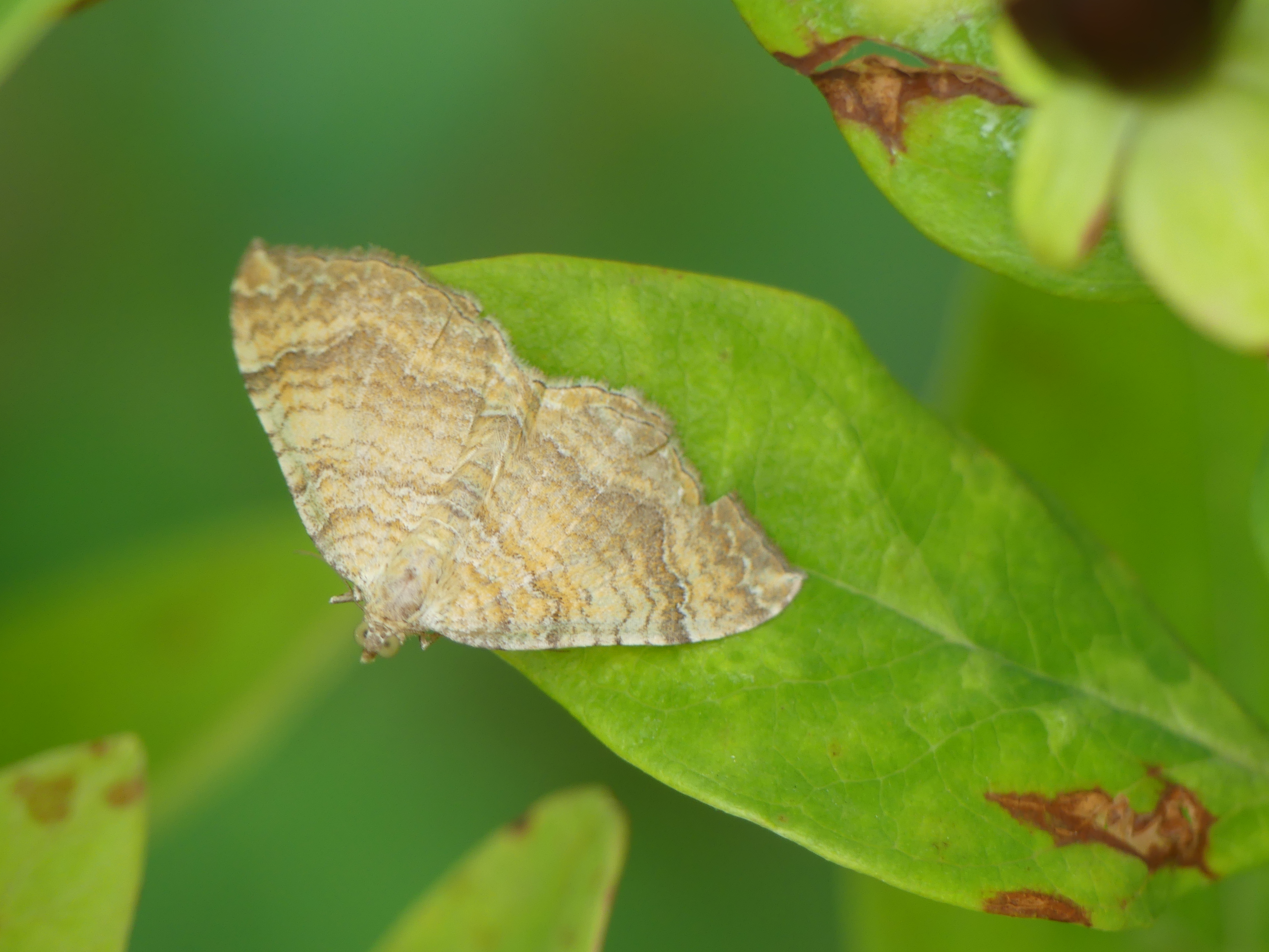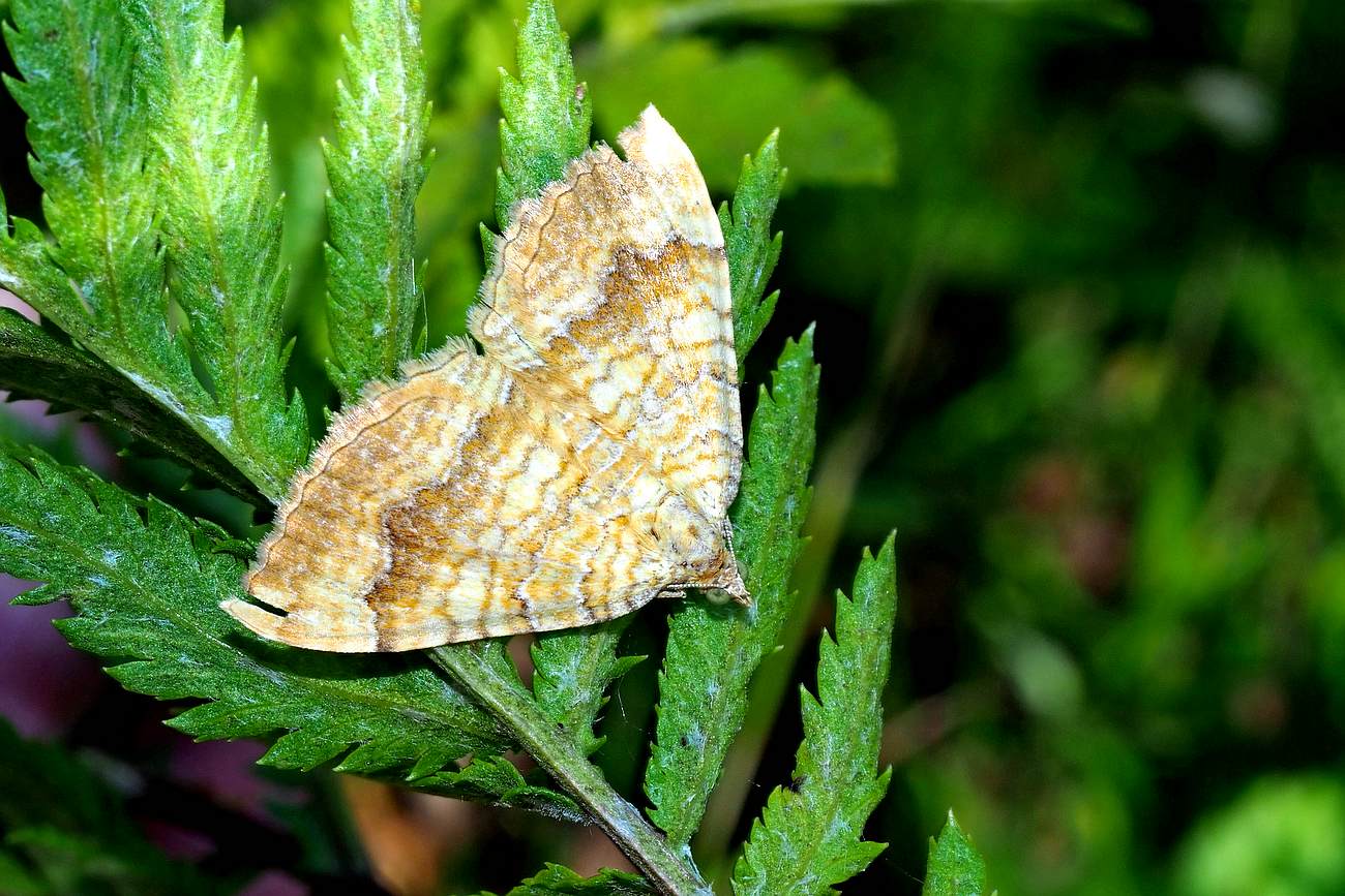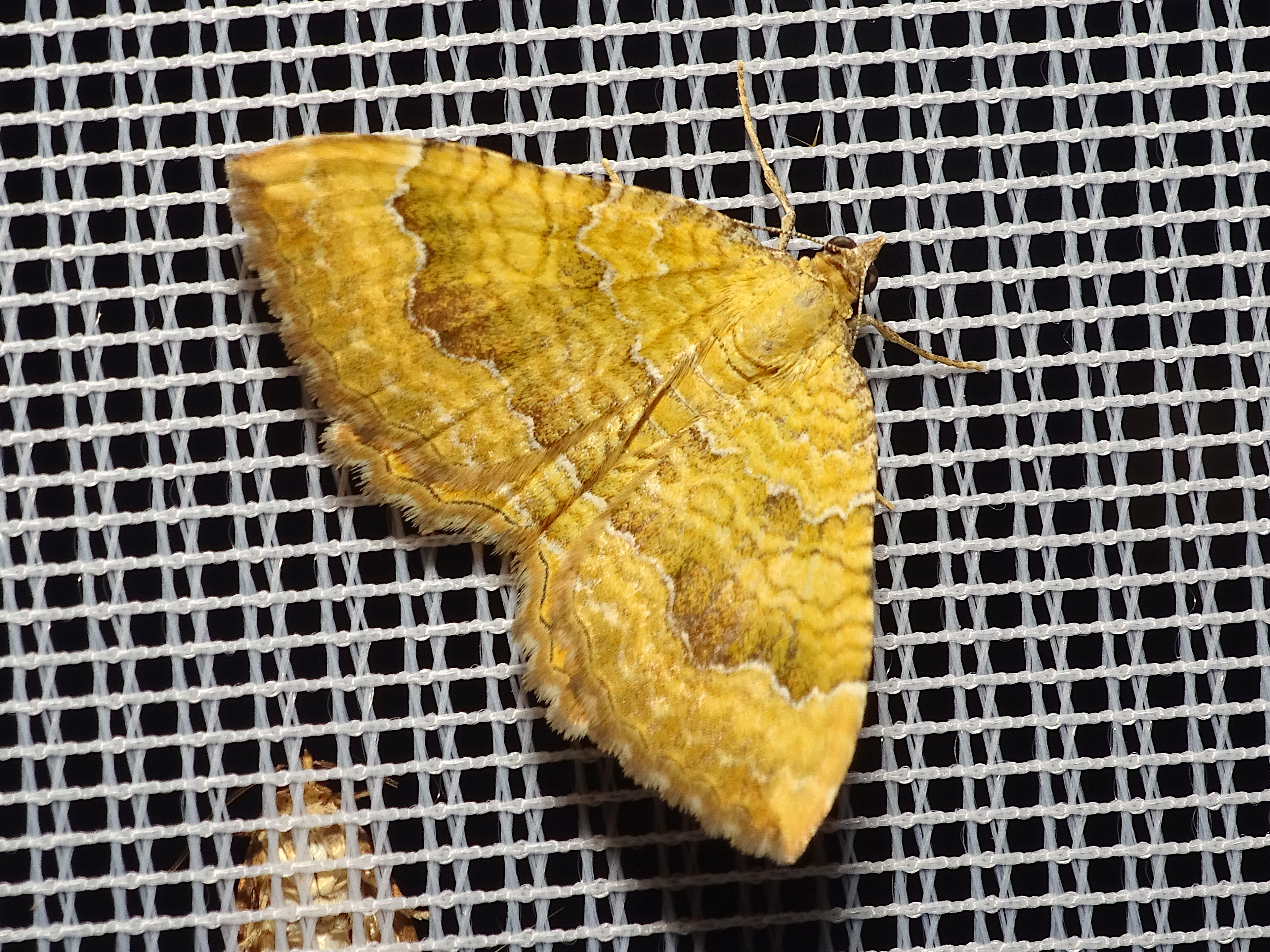 Ockergelbe Blattspanner, oder Löwenzahnspanner oder Brennnesselspanner (Camptogramma bilineata (Linnaeus, 1758)), am Licht, Radeberg, August 2013.