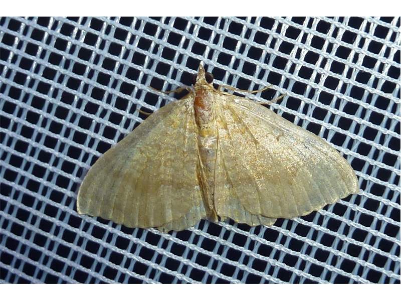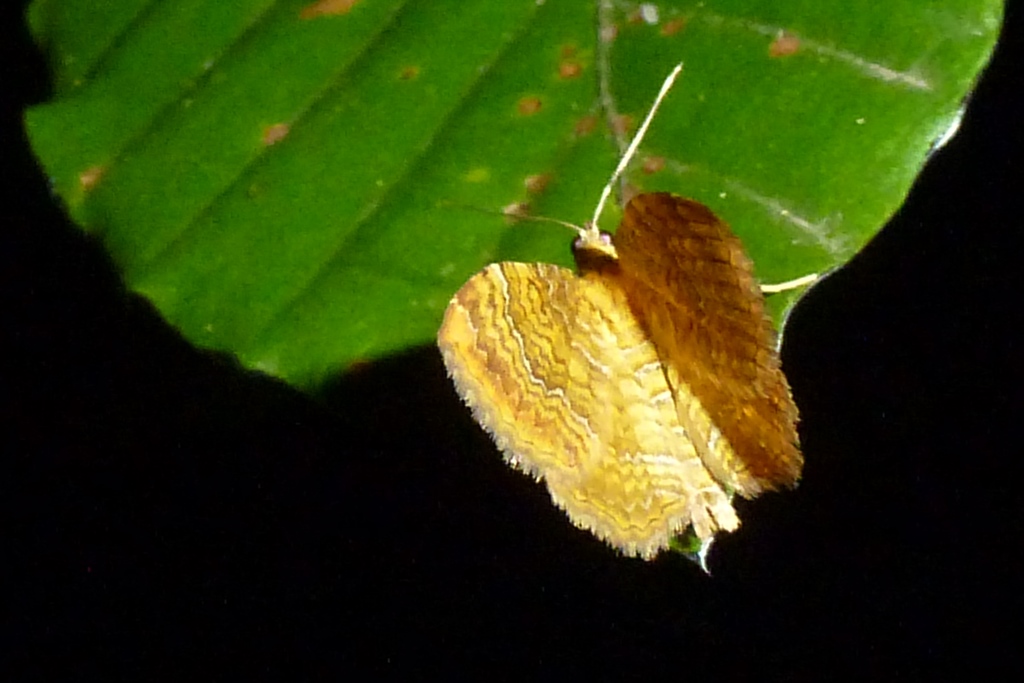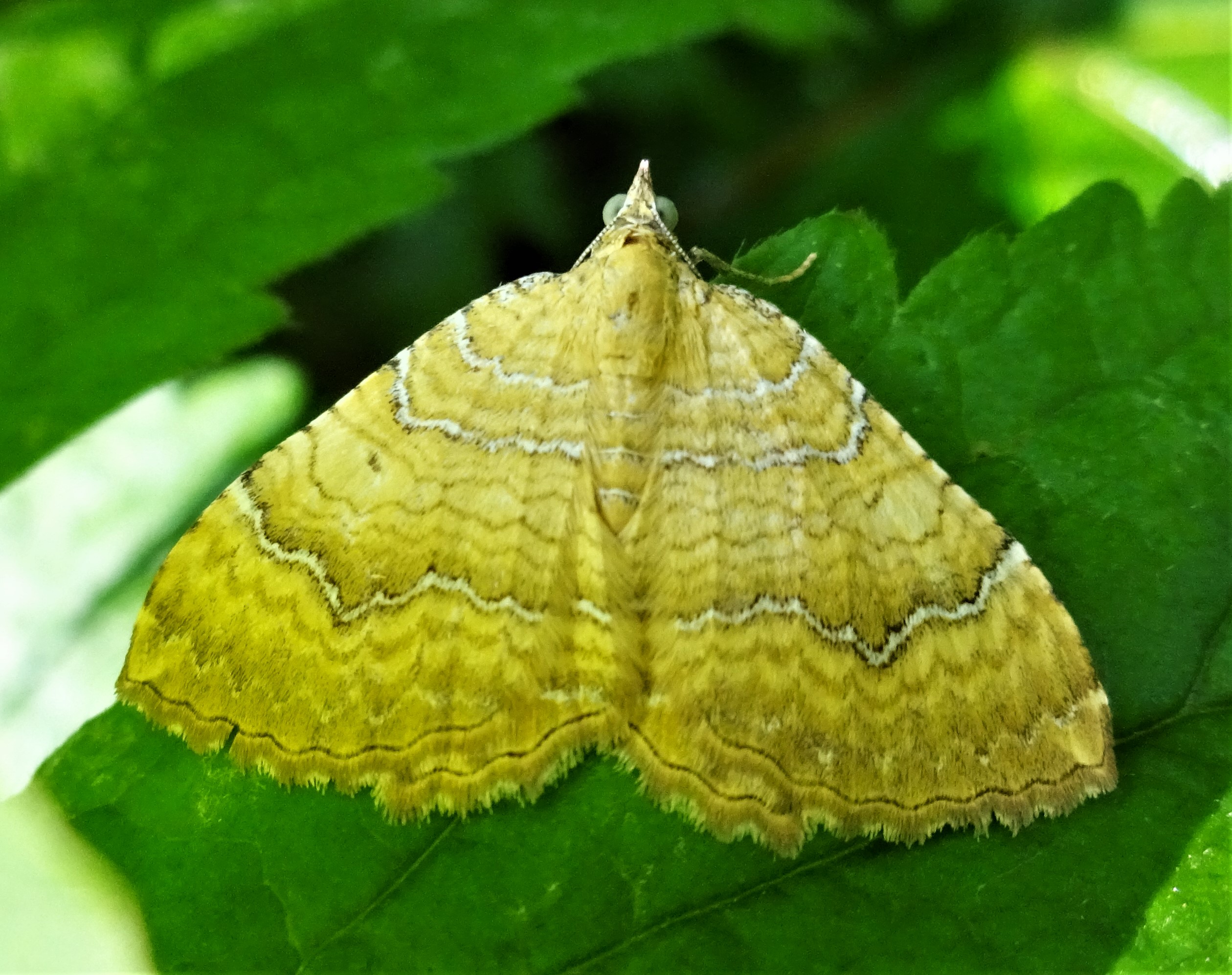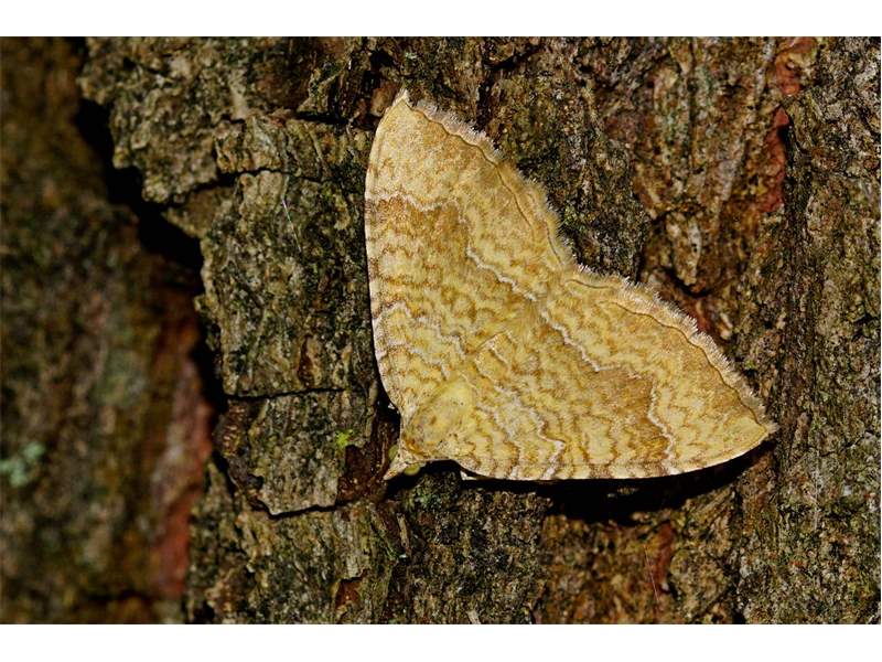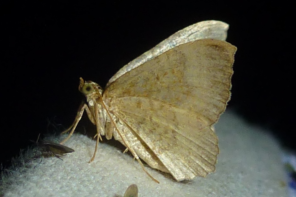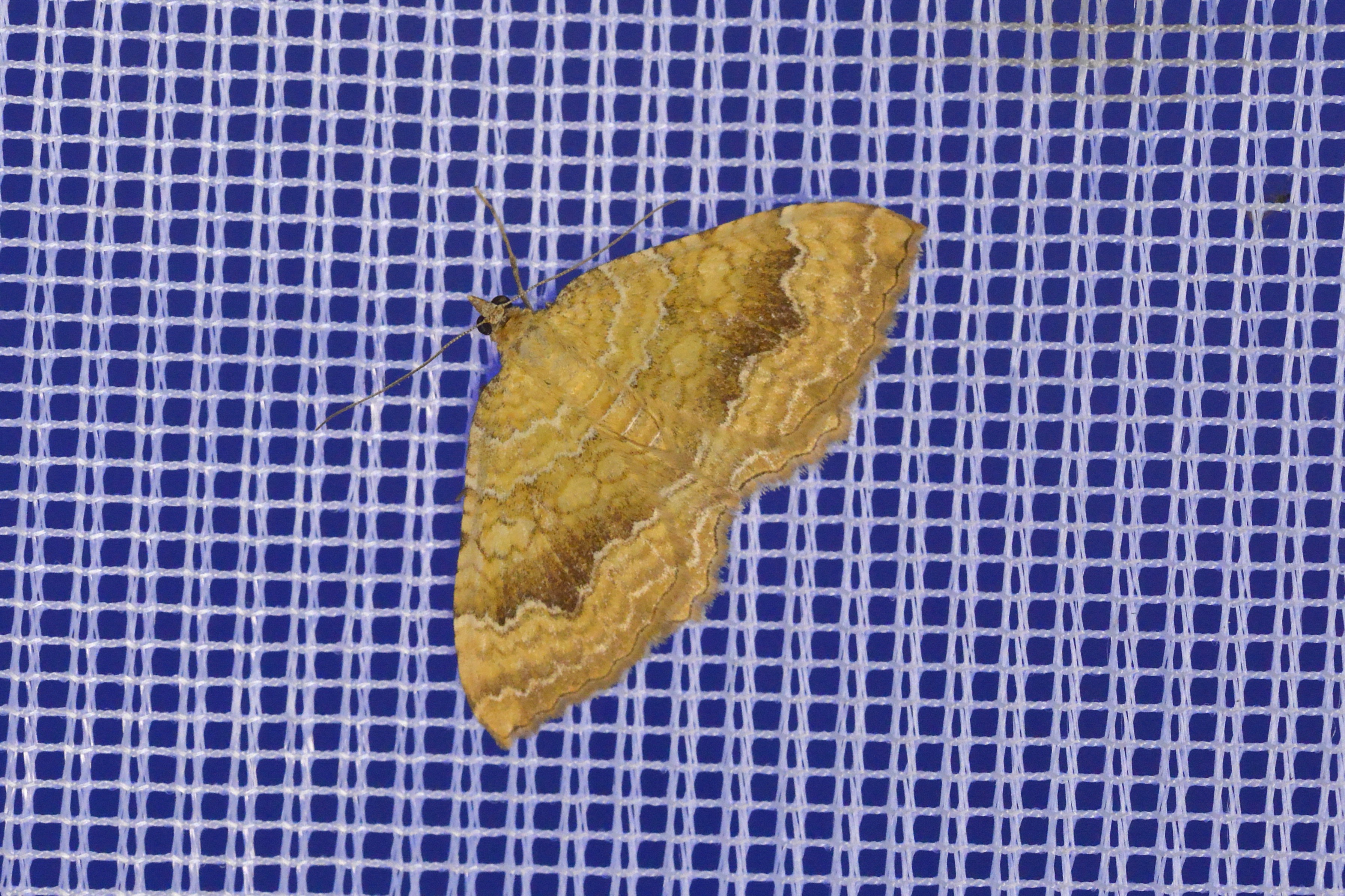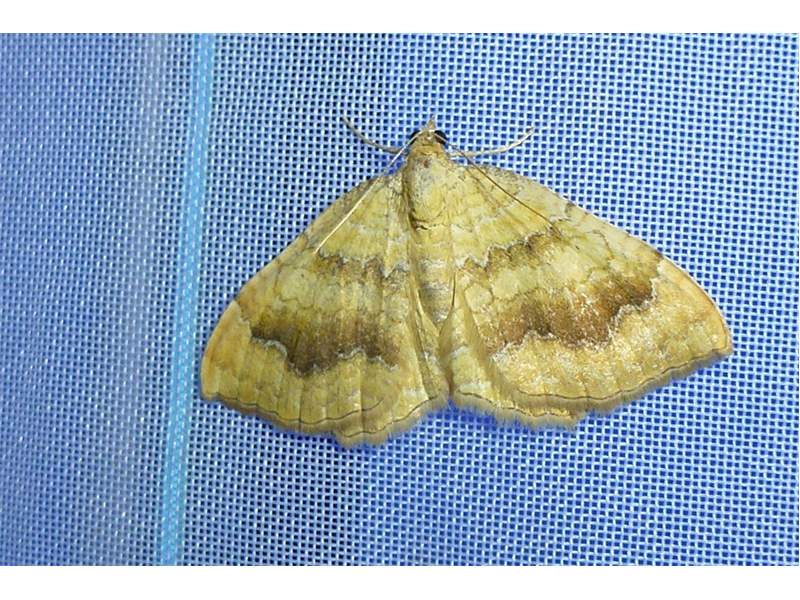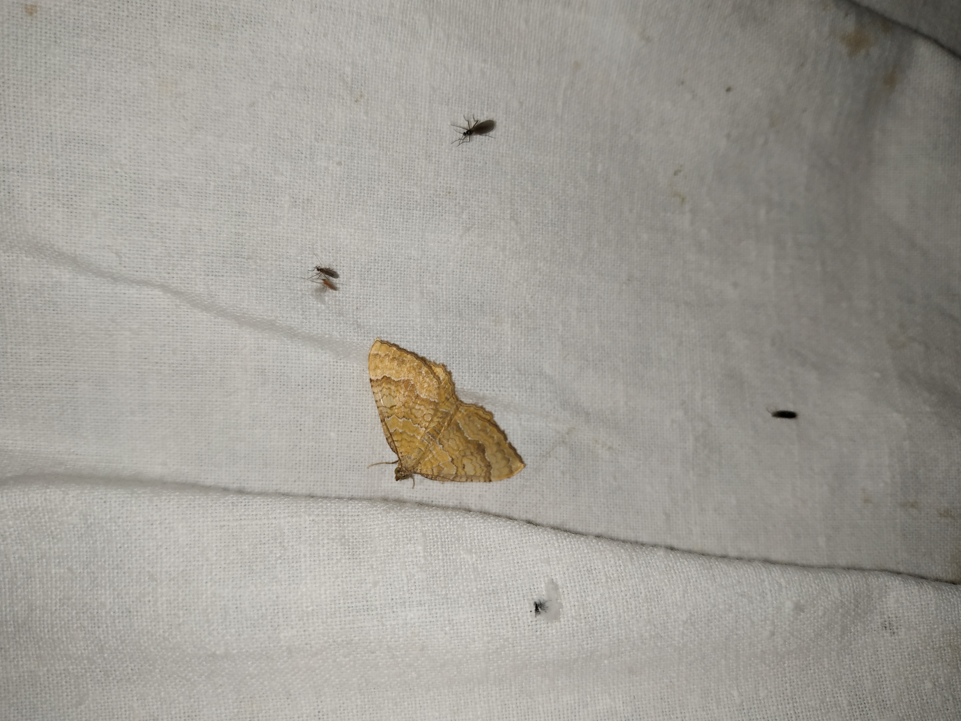 Ockergelbe Blattspanner, oder Löwenzahnspanner oder Brennnesselspanner (Camptogramma bilineata (Linnaeus, 1758)), am Licht, Radeberg, August 2013.
