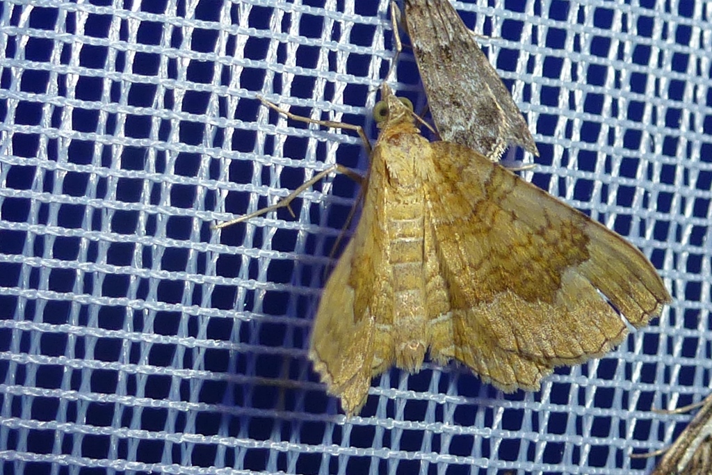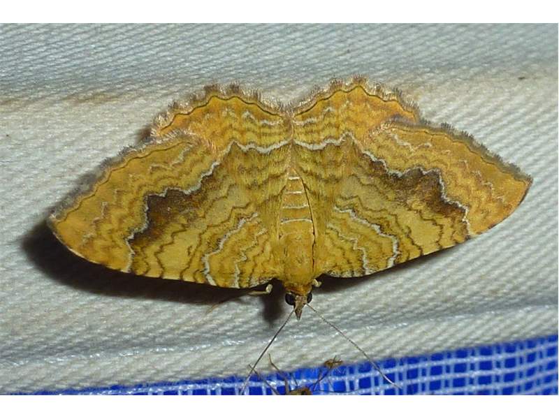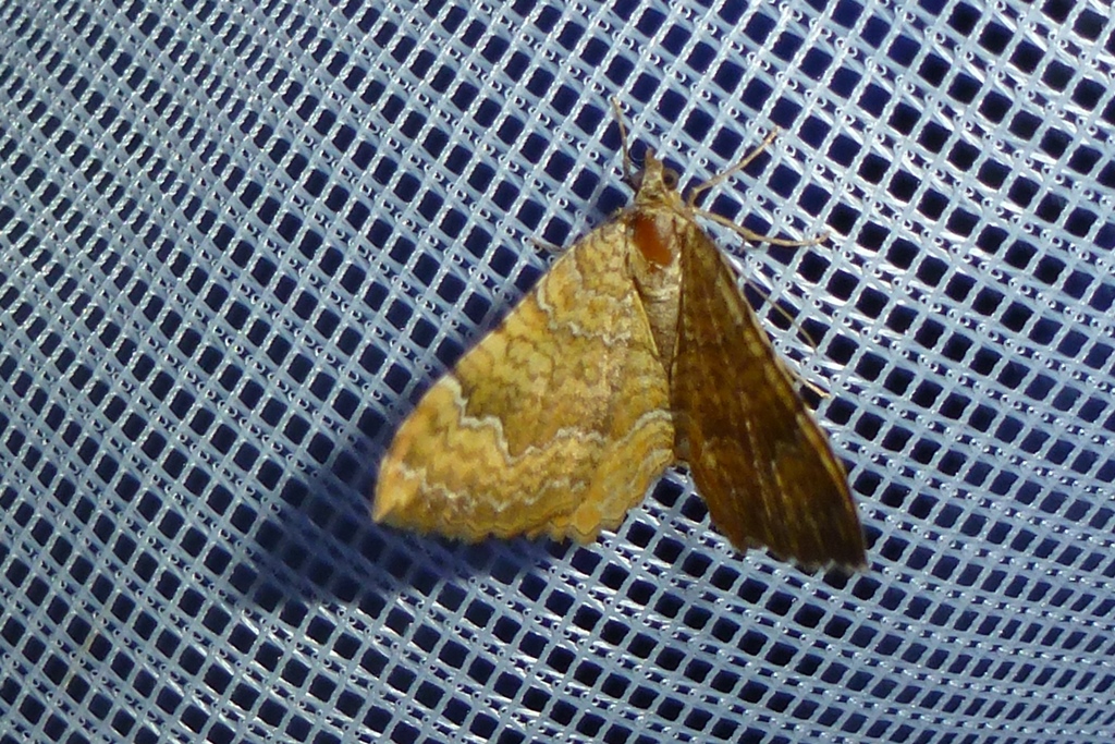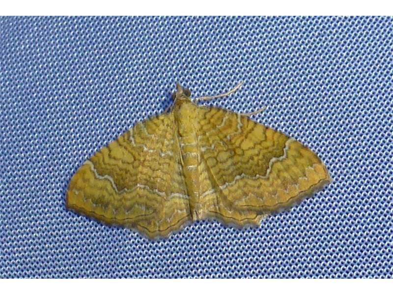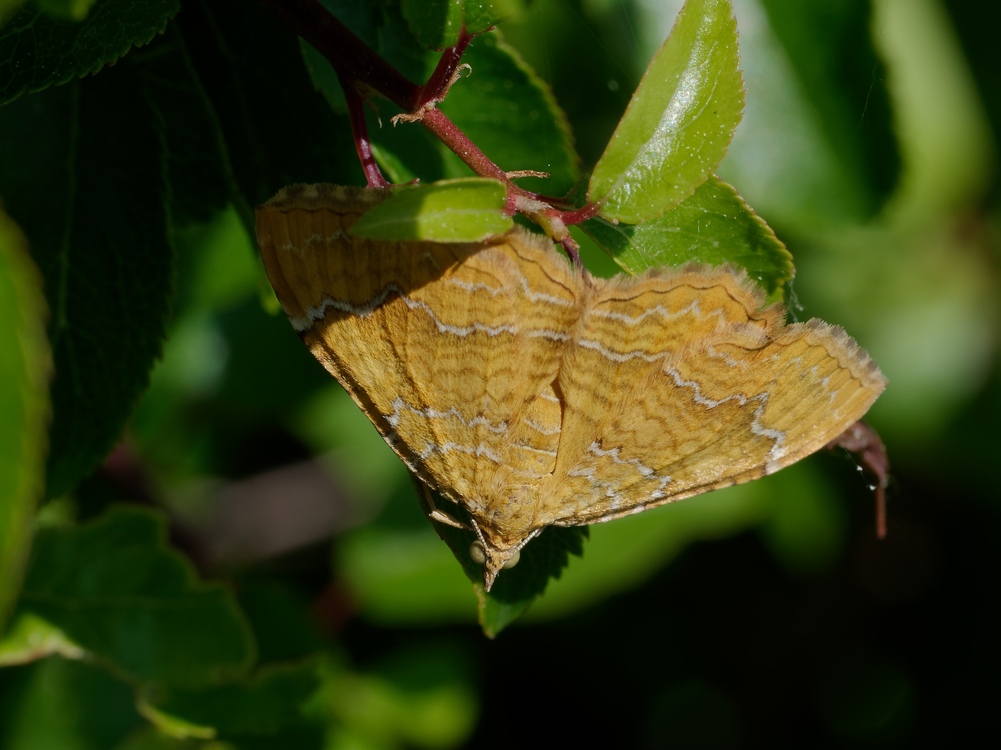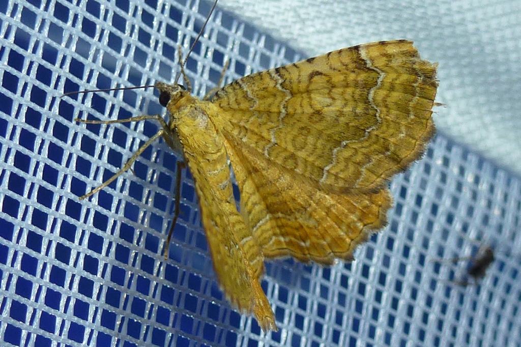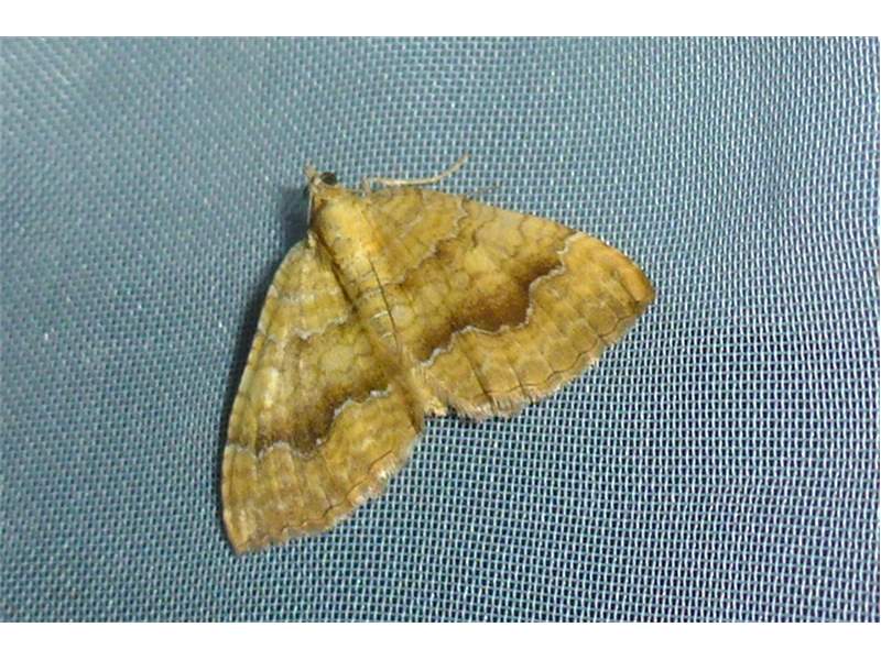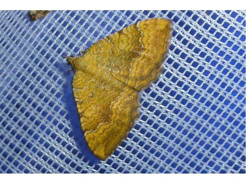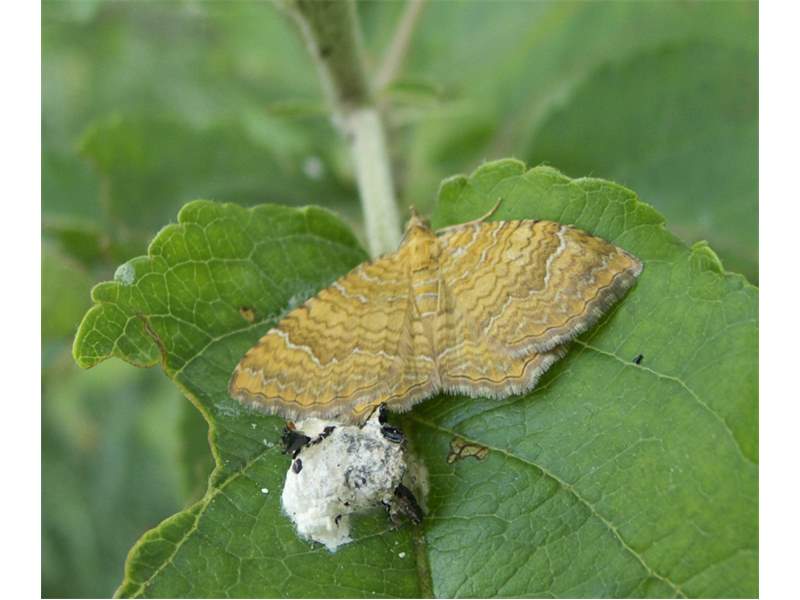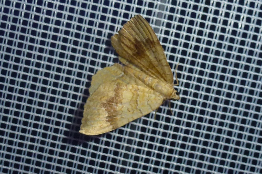 Ockergelbe Blattspanner, oder Löwenzahnspanner oder Brennnesselspanner (Camptogramma bilineata (Linnaeus, 1758)), am Licht, Radeberg, August 2013.