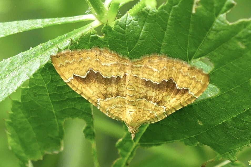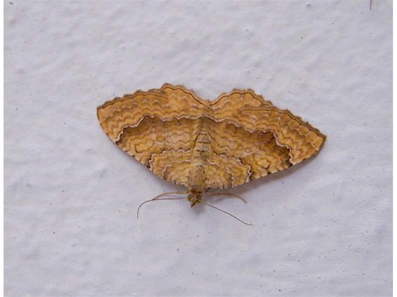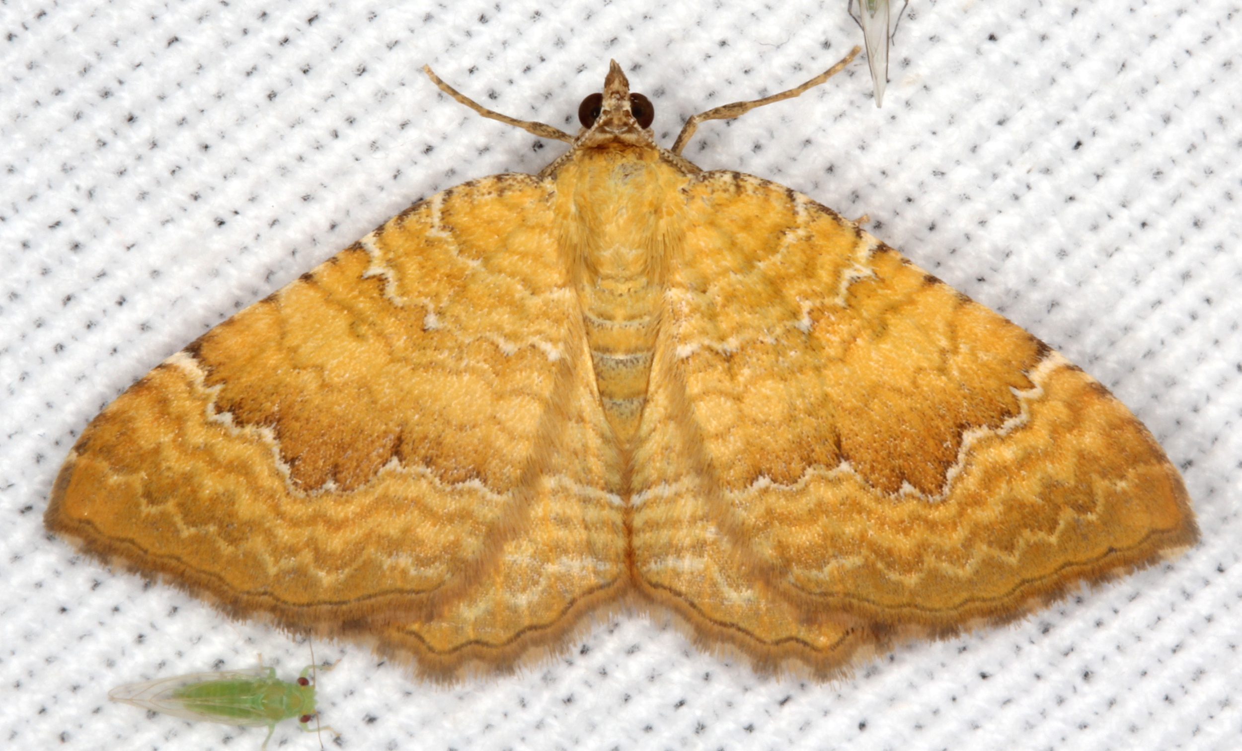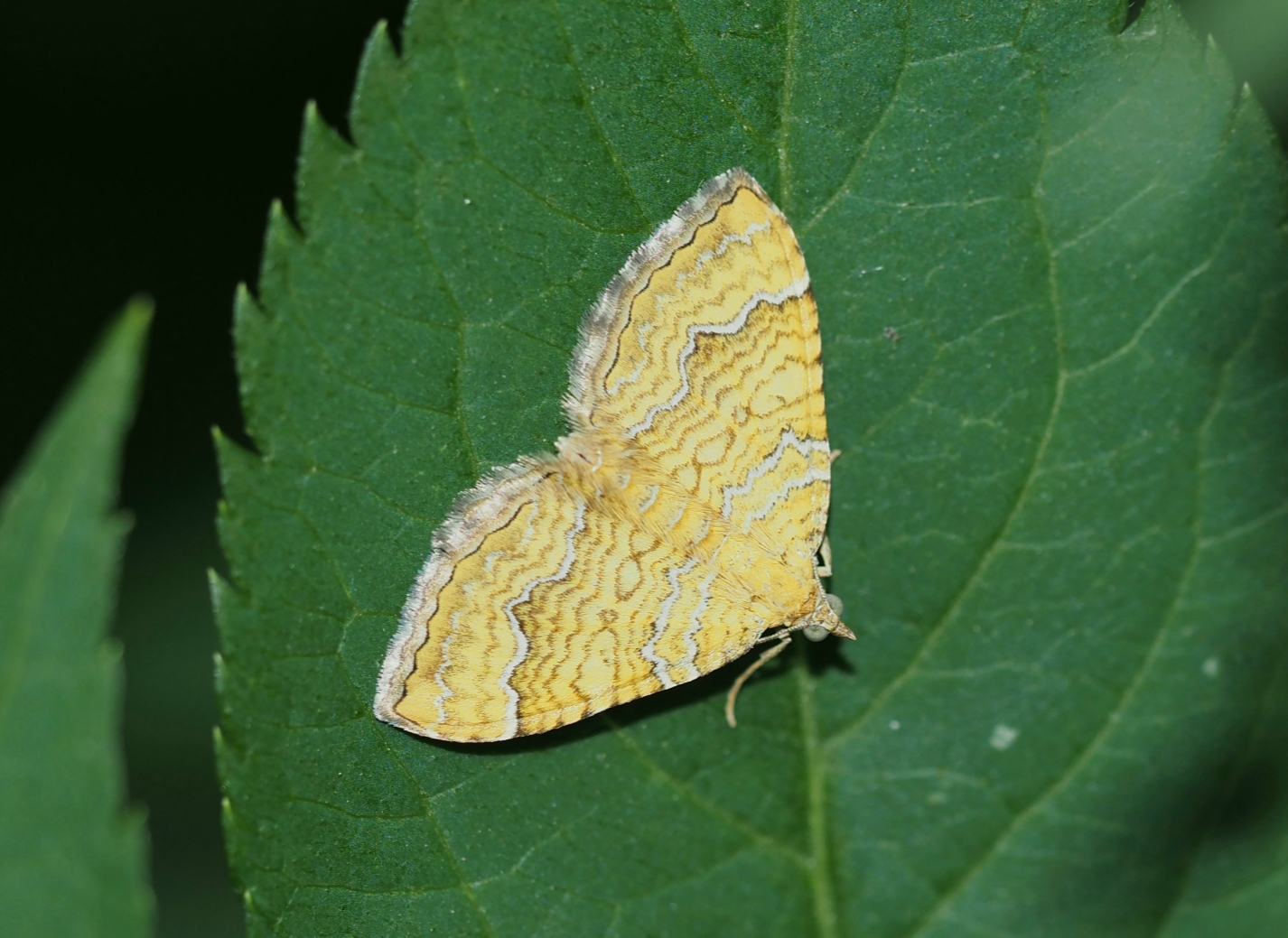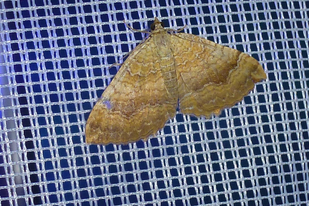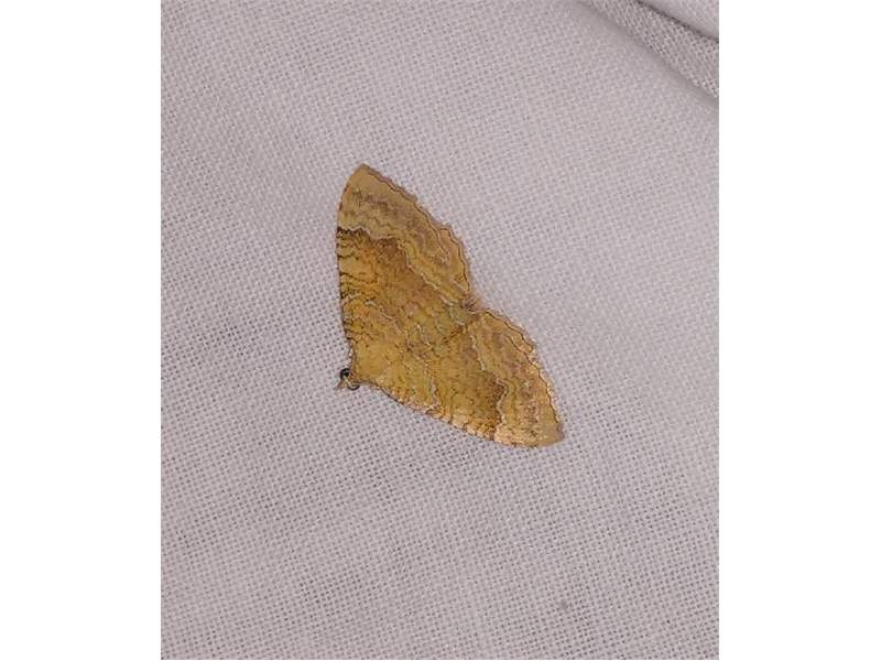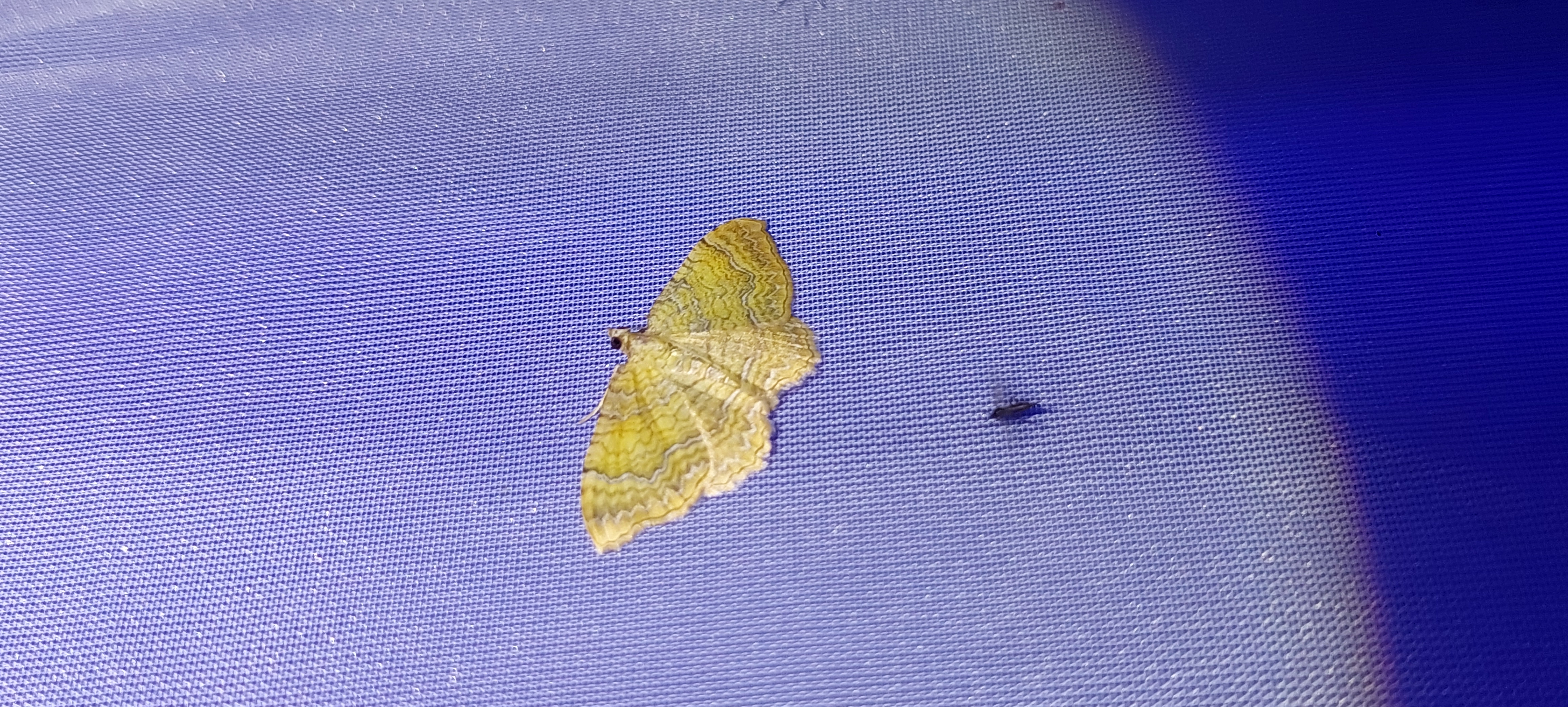 Ockergelbe Blattspanner, oder Löwenzahnspanner oder Brennnesselspanner (Camptogramma bilineata (Linnaeus, 1758)), am Licht, Radeberg, August 2013.